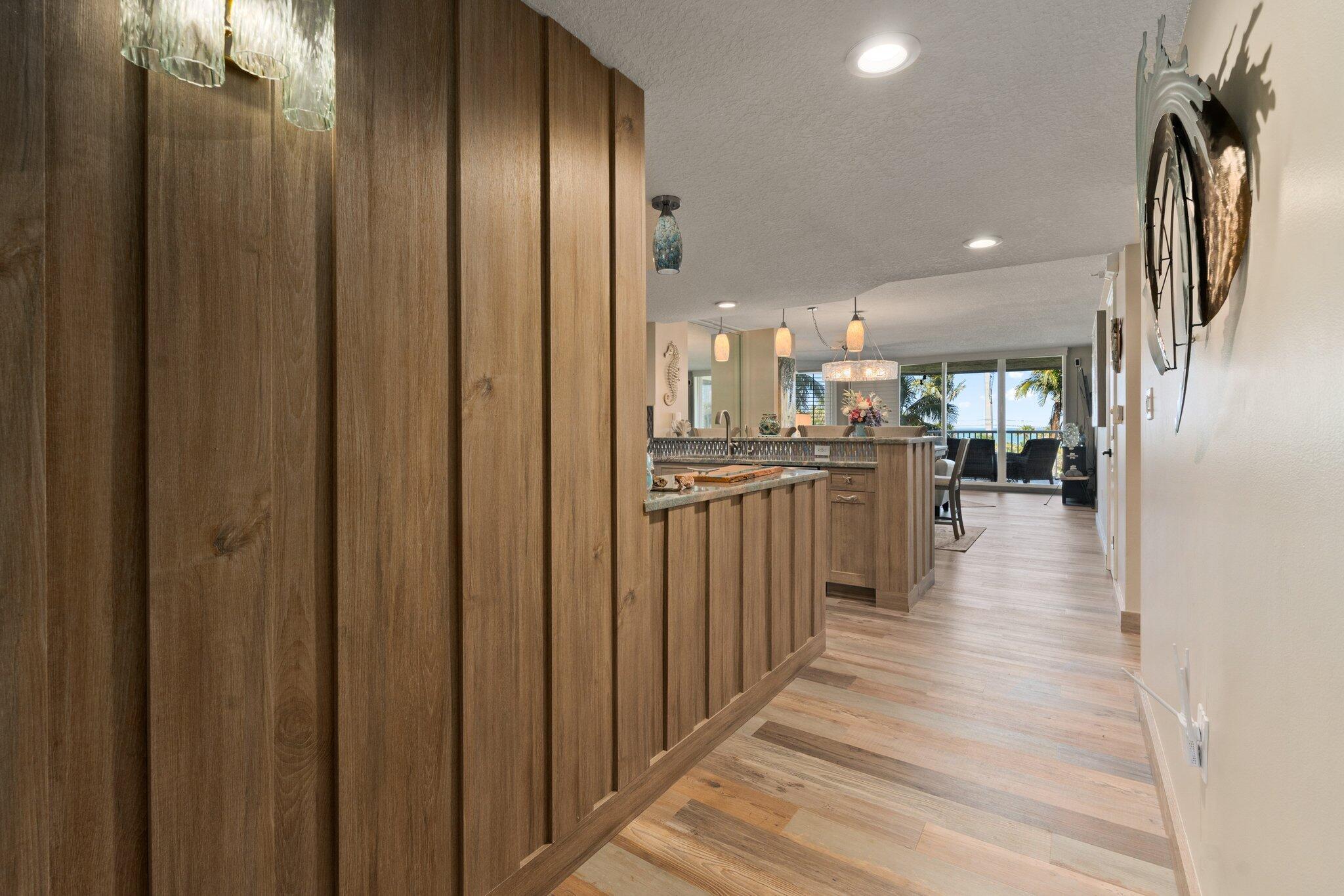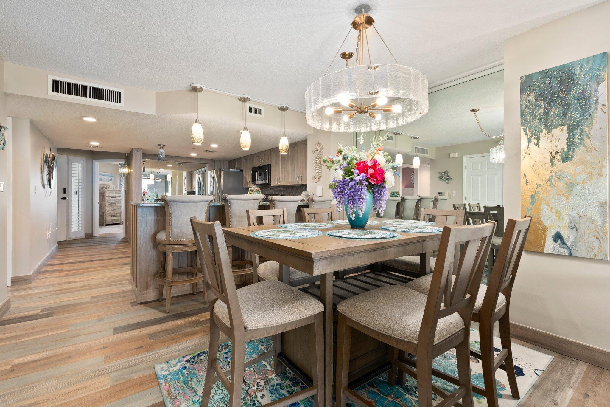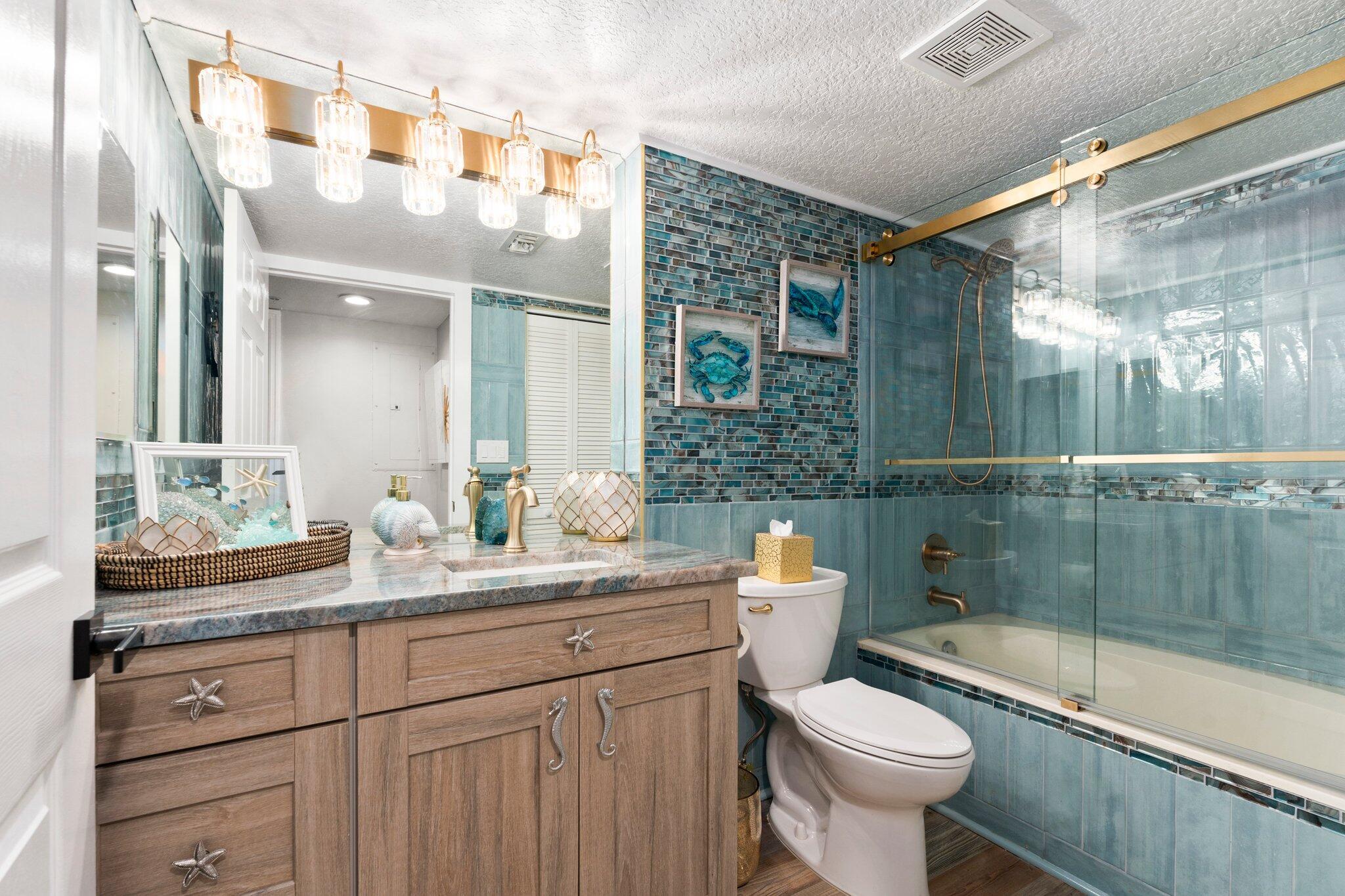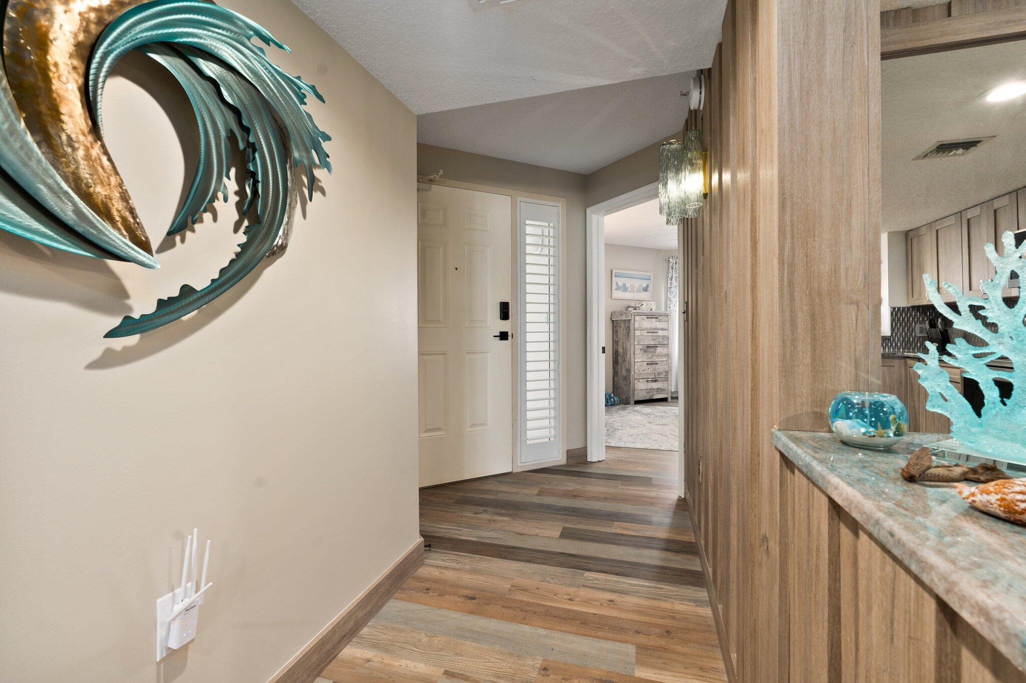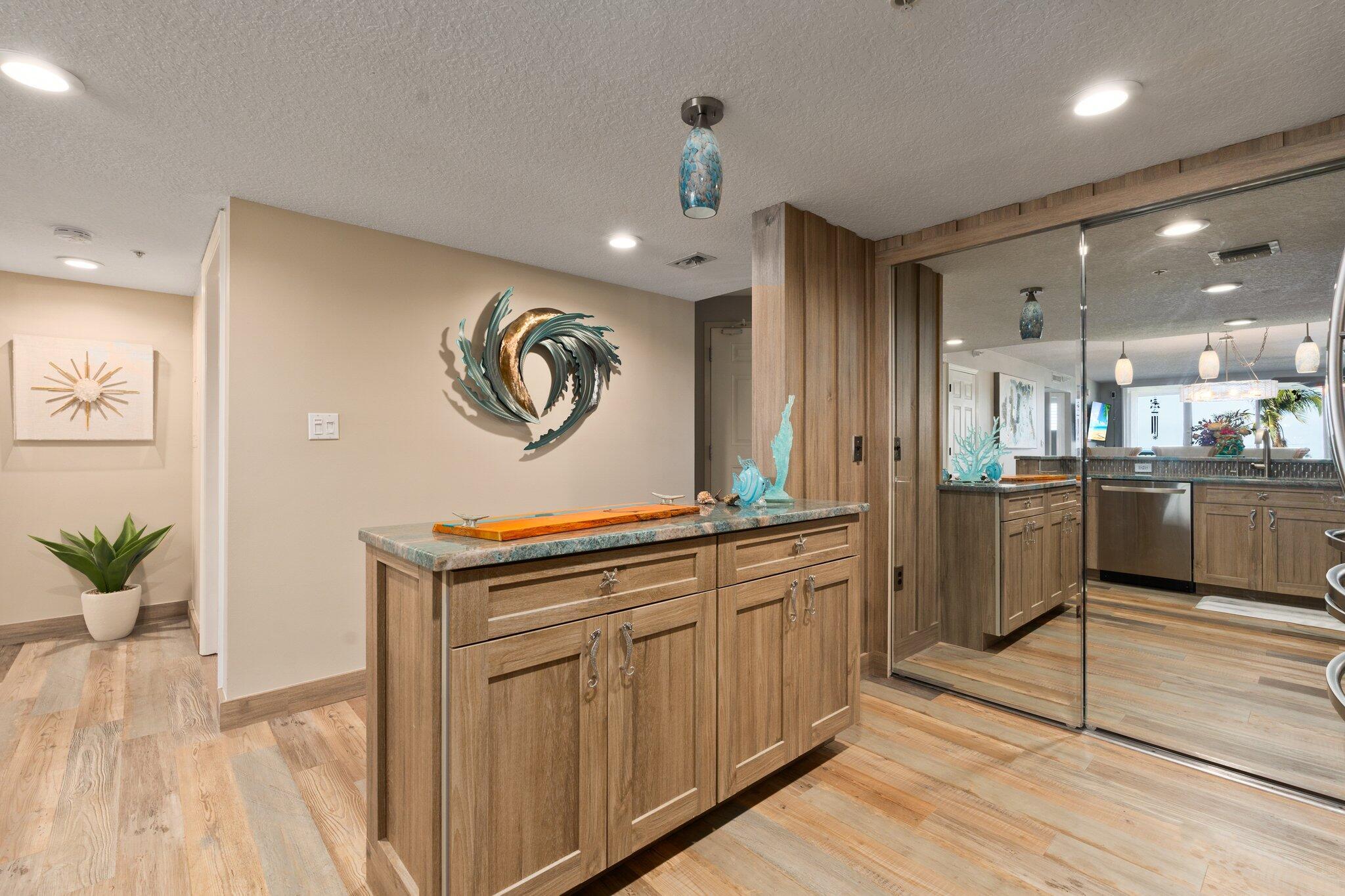 No surface has been left untouched, no detail left undone. Custom woodwork & a remarkable kitchen w/ Kraftmade cabinetry, stunning Brazilian quartzite w/ complimentary glass tile backsplash topped off w/ Seahorse pulls. The appliances are all new. Primary bathroom has breathtaking Aurora blue marble along w/ floor to ceiling porcelain tile adorned w/ marble trim. Floors have been replaced w/ a dry core luxury vinyl. Plantation shutters have been added throughout. Lighting & fans updated w/ high quality fixtures. The furnishings are the icing on the cake, so well appointed there is nothing for you to do but slip into this paradise. Covered carport incl. Seaward offers a clubhouse, resort pool, private beach access, tennis, pickle ball, shuffleboard, gym, sauna, billiards & kayak launch.