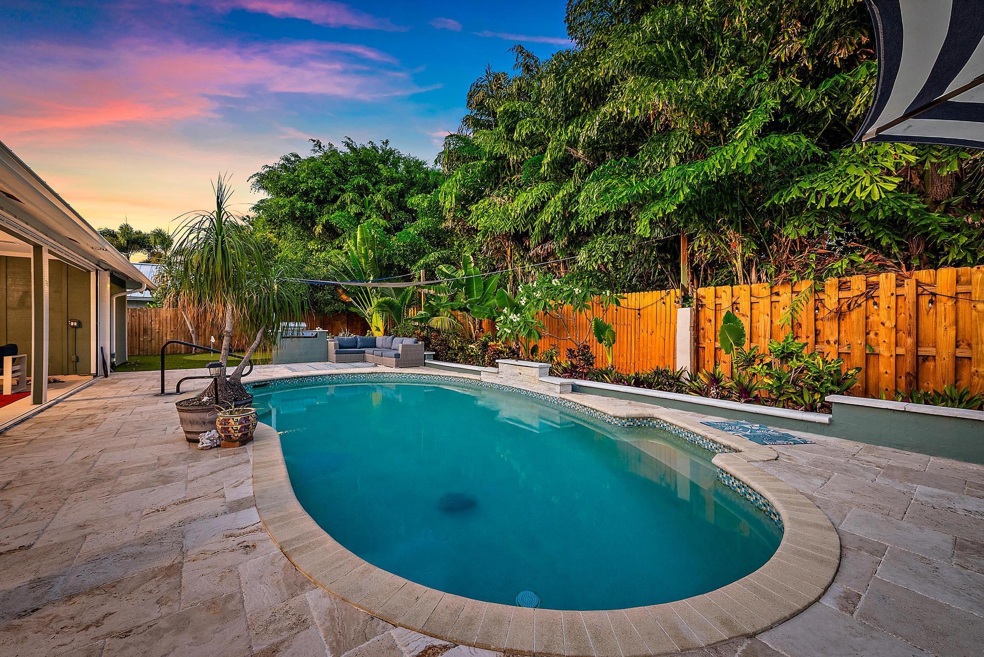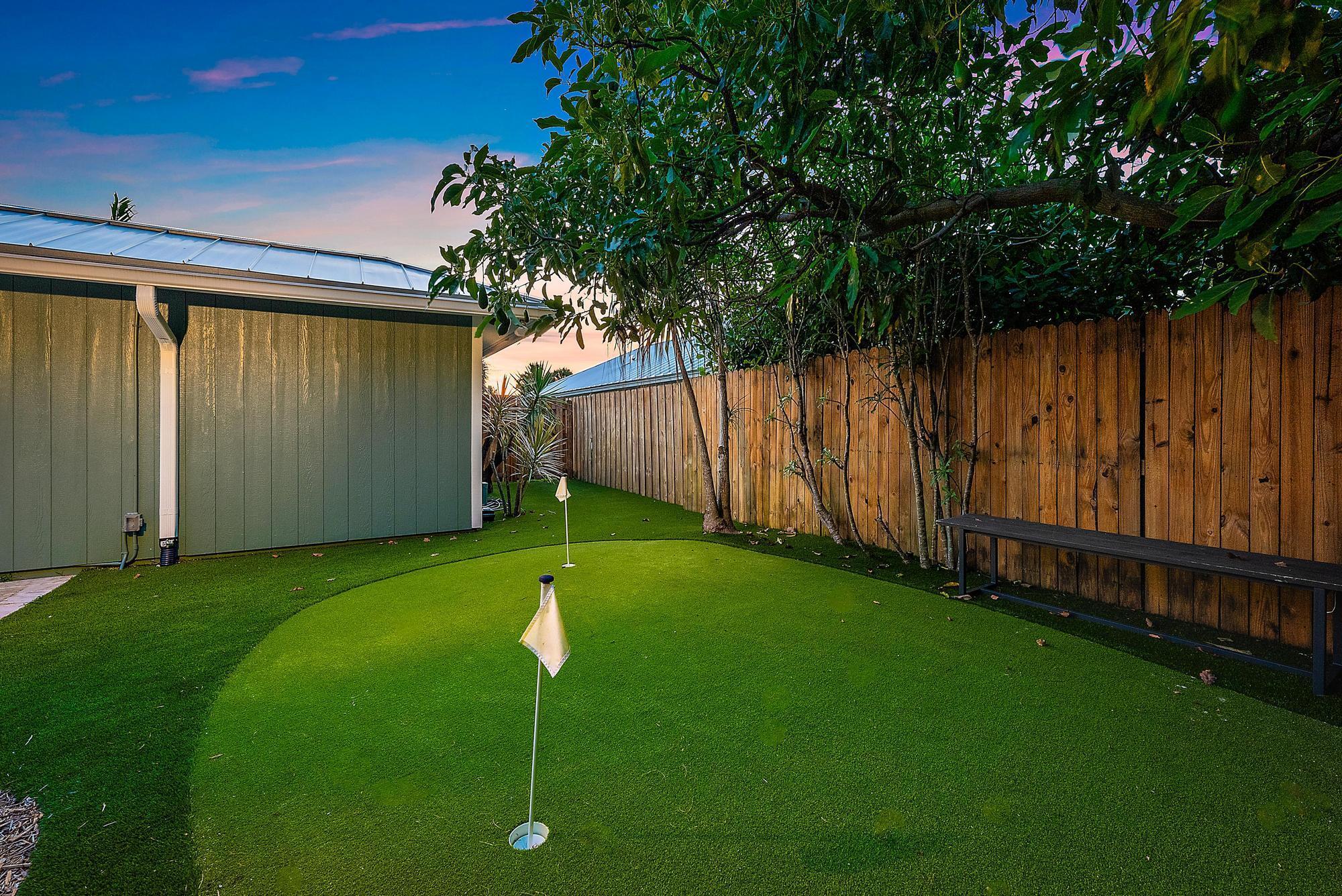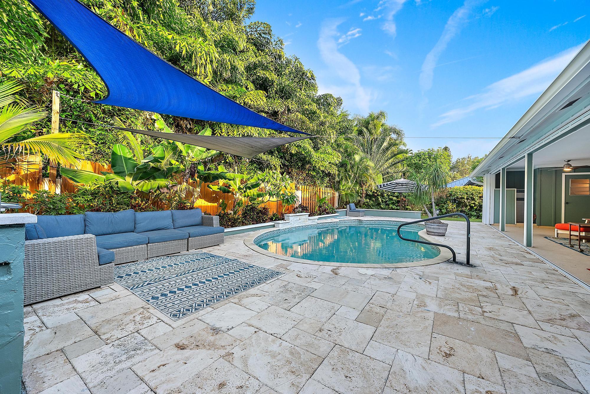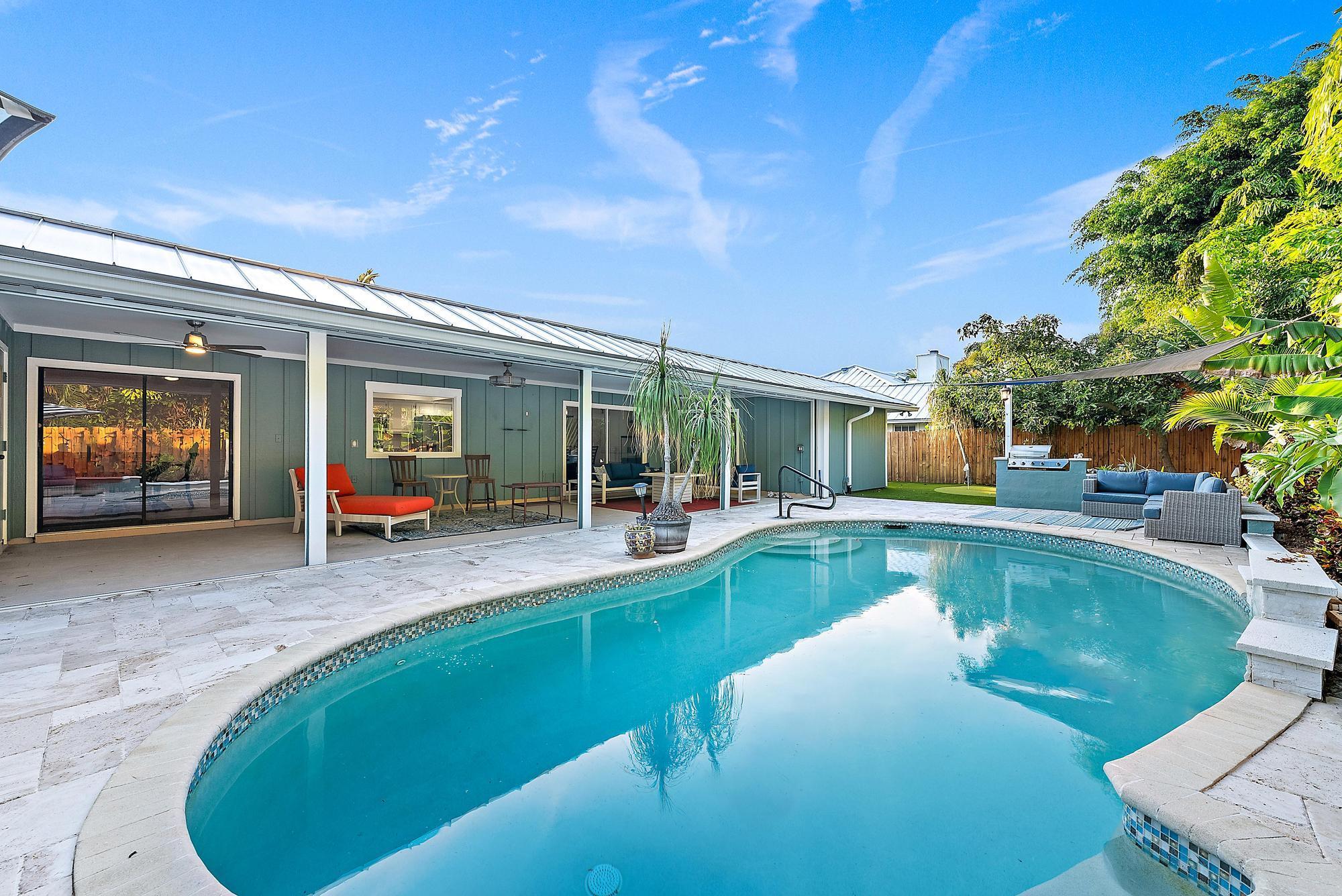 Experience luxury living in this stunning 3-bedroom, 2-bath pool home located in the highly sought-after gated community of Frenchmen's Landing. Thoughtfully designed for entertaining, this spacious home features three sets of sliding doors that open to a private backyard oasis--complete with a large covered patio, built-in grill, renovated cabana powder room, outdoor shower, and even a putting green nestled among mango, avocado, and banana trees.features include, soaring natural wood ceilings, Interior / Exterior freshly painted, a brand-new metal roof (2024), newer central A/C system (2021). Ideally located, Frenchmen's Landing is just 5 minutes to the beach and Gardens Mall, 15 minutes to Palm Beach International Airport, and minutes from shopping, dining from Jupiter to Palm Be