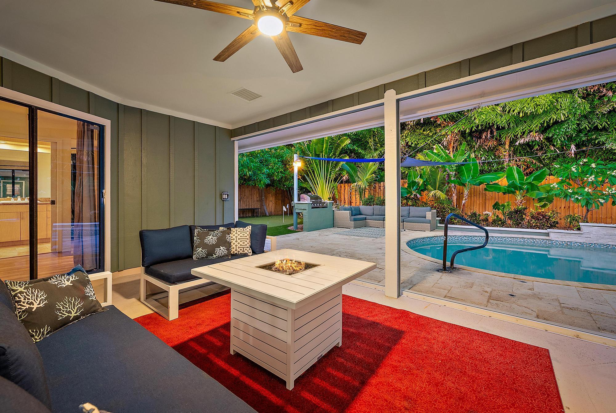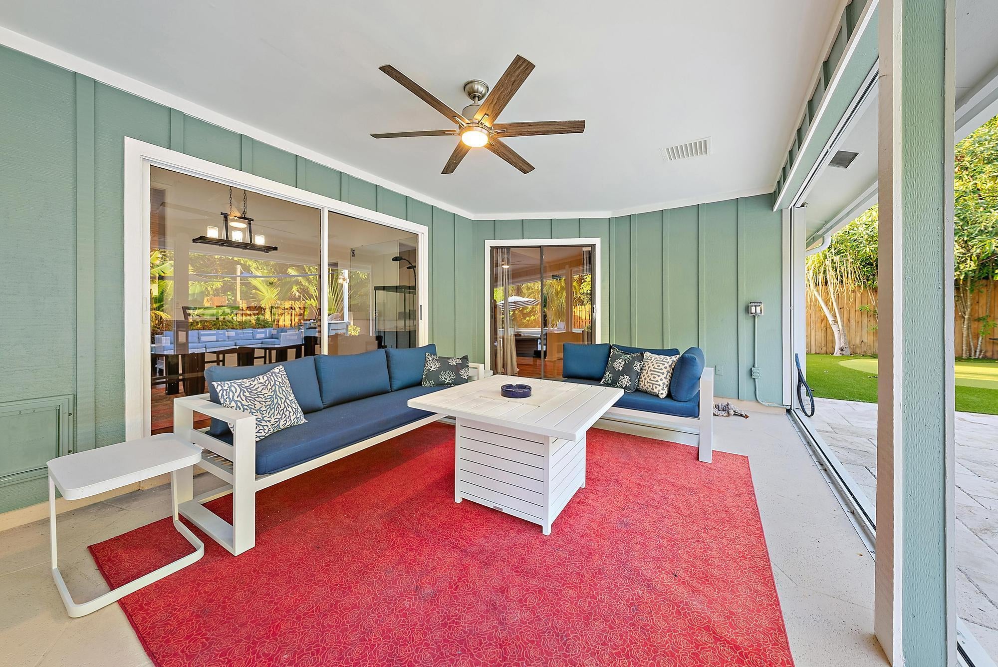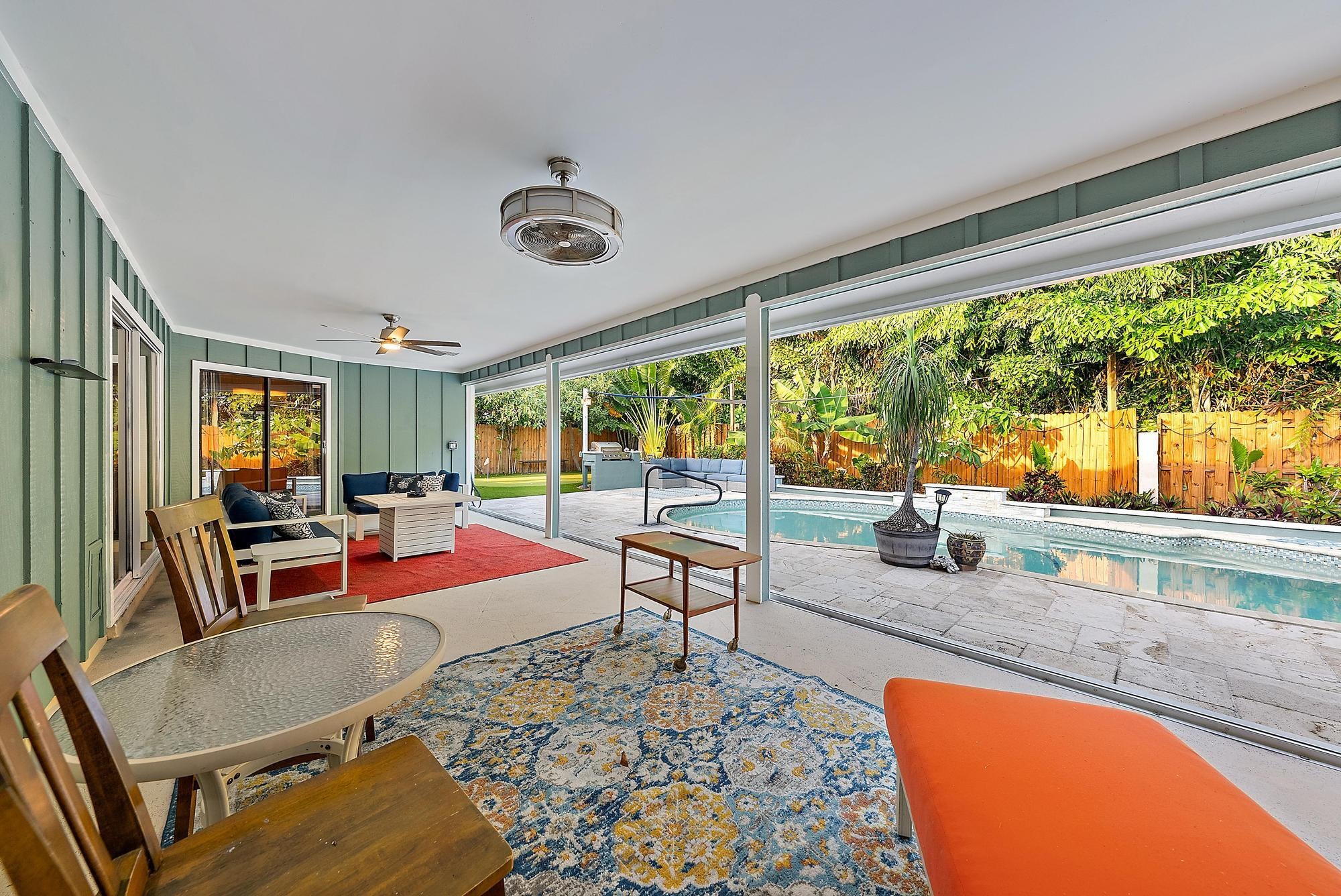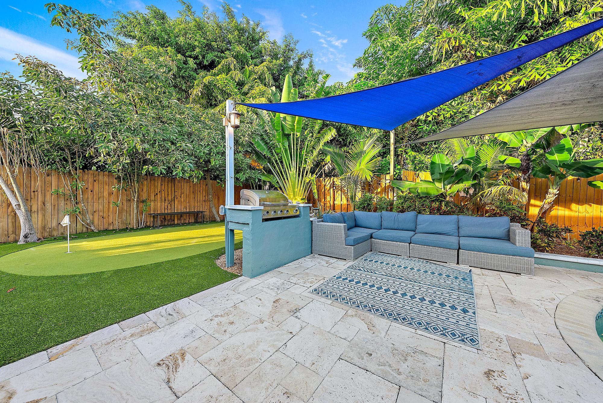 Experience luxury living in this stunning 3-bedroom, 2-bath pool home located in the highly sought-after gated community of Frenchmen's Landing. Thoughtfully designed for entertaining, this spacious home features three sets of sliding doors that open to a private backyard oasis--complete with a large covered patio, built-in grill, renovated cabana powder room, outdoor shower, and even a putting green nestled among mango, avocado, and banana trees.features include, soaring natural wood ceilings, Interior / Exterior freshly painted, a brand-new metal roof (2024), newer central A/C system (2021). Ideally located, Frenchmen's Landing is just 5 minutes to the beach and Gardens Mall, 15 minutes to Palm Beach International Airport, and minutes from shopping, dining from Jupiter to Palm Be
