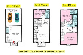 Welcome to Montclair, one of Miramar's premier gated townhome communities, where luxury meets convenience in this beautifully maintained and upgraded 3-bedroom, 3.5-bathroom Energy star qualified home. The 1st floor offers a great room with a half bathroom (perfect for guests), a home office/den, a play room or a multigenerational living space as well as access to the 2-car garage and a private driveway. On the 2nd level, you'll find a bright and open family room, a dedicated dining are, and a gourmet kitchen complete with granite countertops, stainless steel energy-efficient appliances, and ample cabinet space. Step out onto your private balcony with tranquil views--ideal for enjoying your morning coffee or relaxing in the evening. A junior bedroom located at theoffers an abundance of natural light and acess to a shared full bath. The 3rd level boasts an oversized primary en suite and an additional junior en suite bedroom. The primary suite includes a spacious walk-in custom closet, a secondary custom closet, and a spa-inspired en suite bathroom featuring dual vanities and a frameless glass-enclosed shower with modern finishes. A laundry closet is conveniently located on this level for added ease. Additional features include hurricane-impact windows and doors, a 2013 roof, 2013 AC, 2013 hot water heater, custom blinds throughout, and smart home technology, including a smart thermostat, Philips Hue lighting controls, MyQ remote garage access, and a Ring video doorbell. Montclair is known for its low HOA (includes high speed internet, basic cable & roof replacement plus more), well-manicured pet friendly grounds and resort-style amenities, including: a sparkling swimming pool, clubhouse for private events and gatherings, state-of-the-art fitness center, walking trails and green spaces, children's playground and tot lots, guests parking and 24-hour gated security. Perfectly situated in West Miramar, just minutes from: Major highways, shopping & dining, hospitals, fire stations, top-rated schools & charter academies, parks & sports complexes. Whether you're a first-time homebuyer, a busy professional, an investor, or someone looking to enjoy a turn-key townhome in a thriving community, this home offers the space, style, and location you've been looking for.