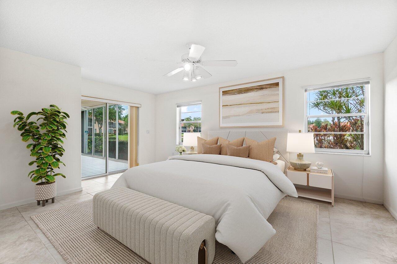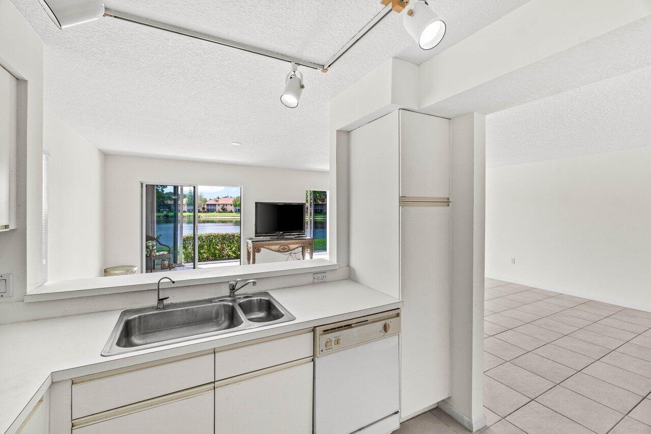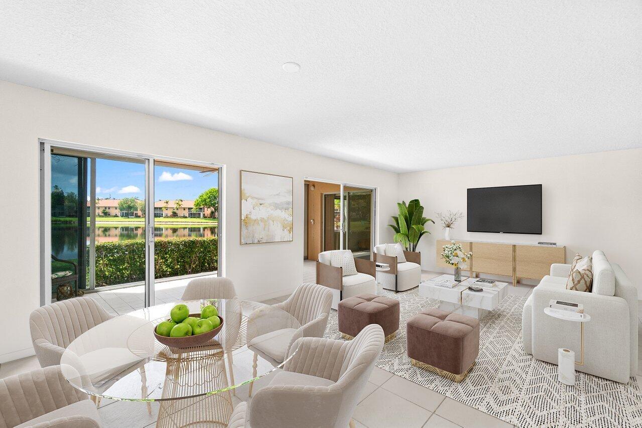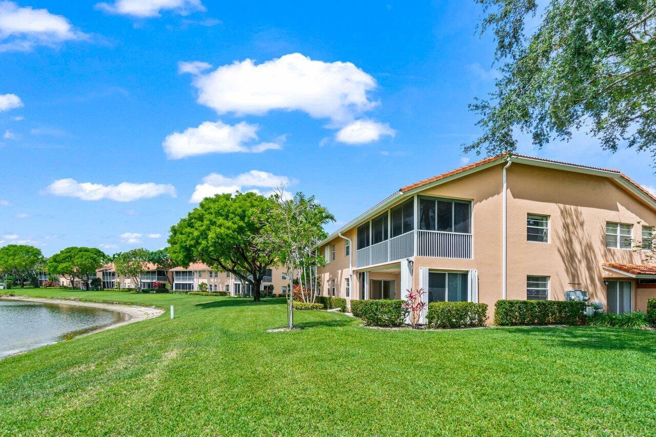 A must-see first floor, single level, three bedrooms, two bath end unit with spectacular water views from nearly every room! This private, peaceful residence has ample space for living and entertaining and two separate patios allow you to enjoy the indoor/outdoor Florida lifestyle and beautiful lake views. Tasteful interior upgrades include a new stainless-steel refrigerator, stove, and microwave in the kitchen, a newly remodeled guest bathroom, newly tiled master bedroom and shower, all the popcorn has been removed from the ceiling and the unit is freshly painted throughout! The complex will be repainted in soft hues of gray and all the assessments have been paid. Please see more.Palm Isles offers resort style amenities including a Large Active Clubhouse currently being remodeled, Indoor/Outdoor Pools, Tennis, Pickleball, Theatre, Card Rooms, Billiards, Ceramics, Men's and Women's Exercise Facilities and a Cafe for breakfast and lunch!