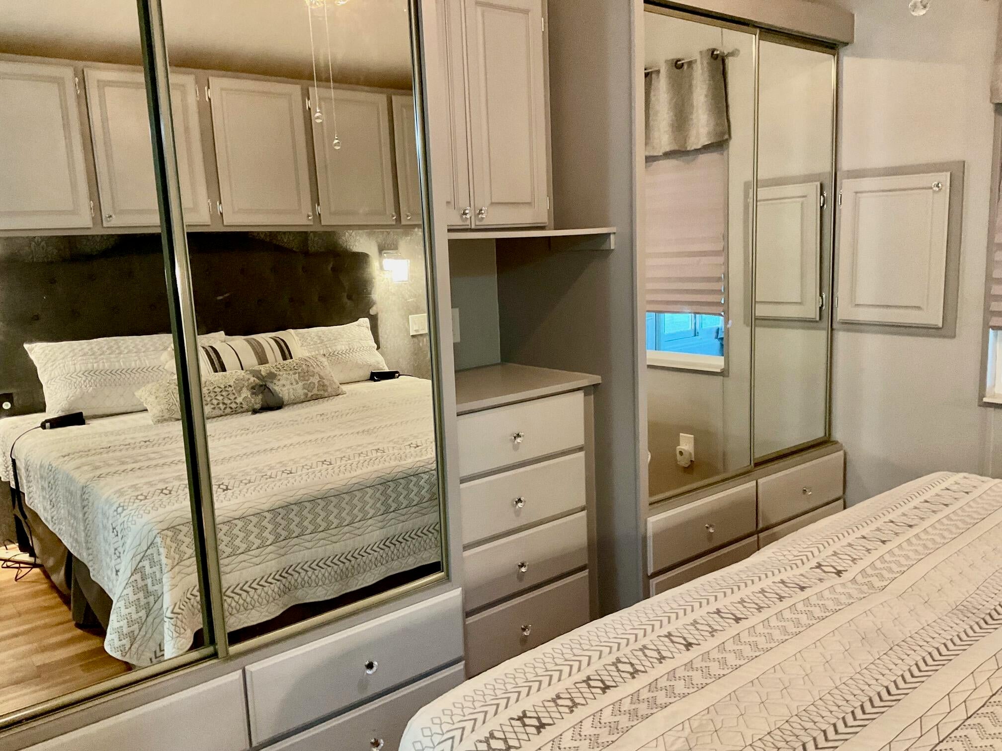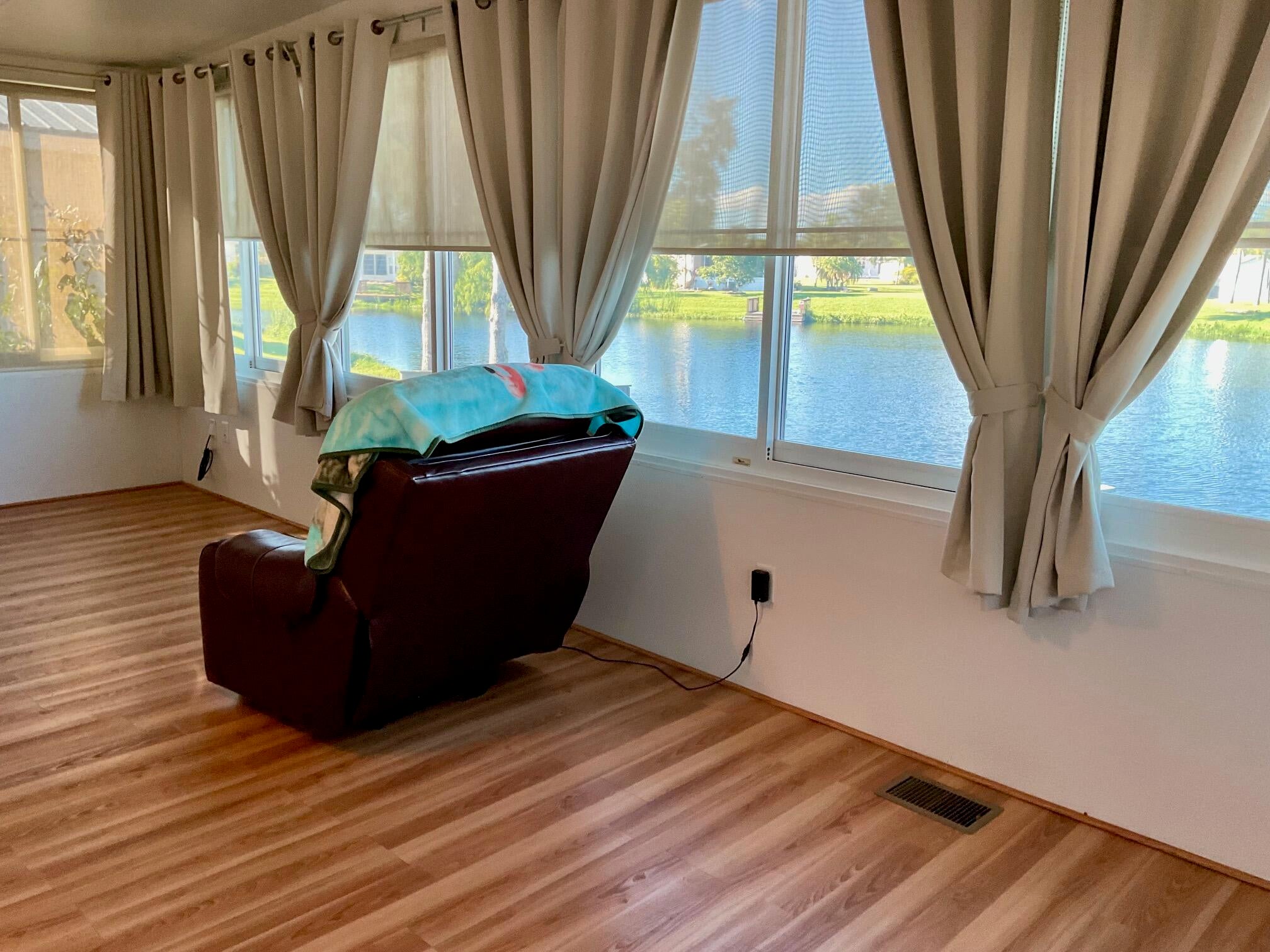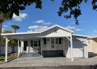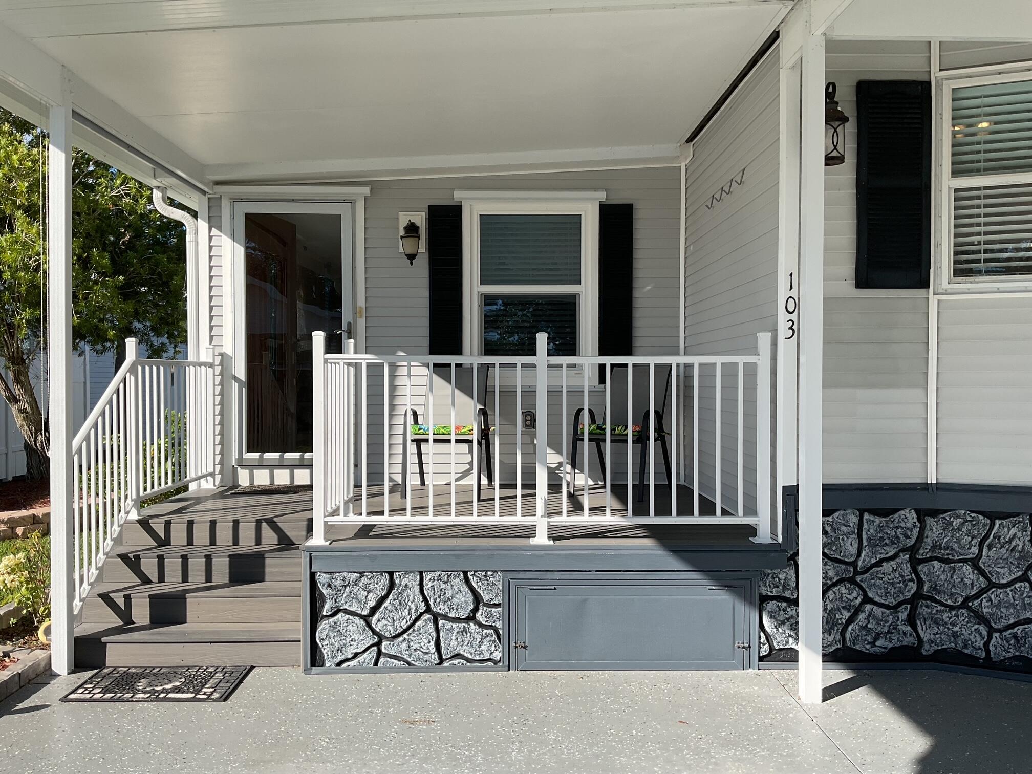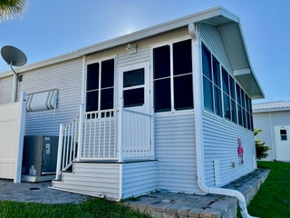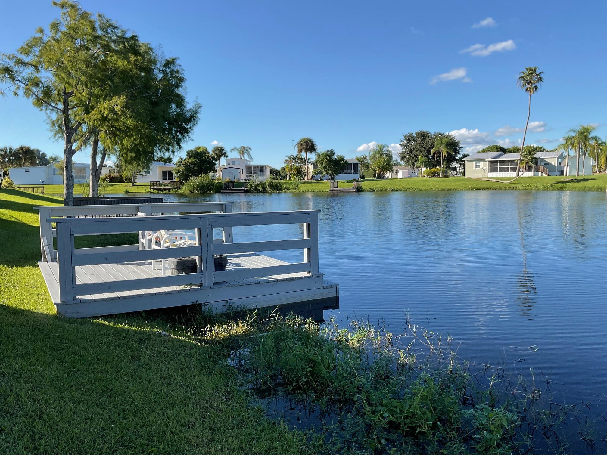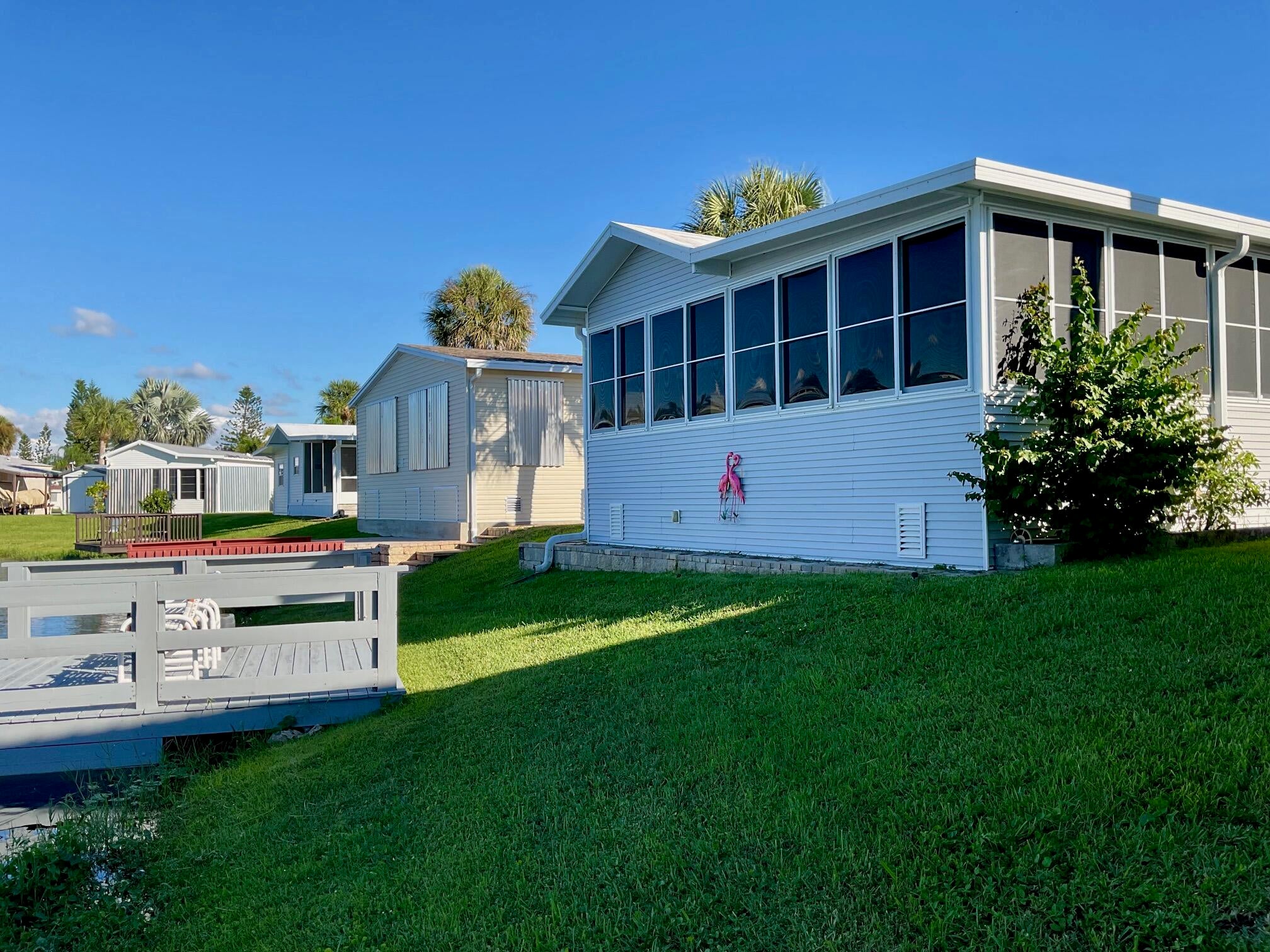 Beautiful 1 bedroom 1 bathroom park model in Blue cypress golf and rv park. Could easily be turned into a 2 bedroom, this unit is also partially furnished. Fishing right out your back door on the newly refurbished dock. This 55+ community offers a 9 hole golf course, pickle ball courts and a pool. Clubhouse and lots of activities. The home features many upgrades such as new kitchen cabinets, quartz countertops and backsplash. New AC, new laminate flooring and new washer and dryer. Large Florida room overlooking the waterfront and a screened patio on the side for afternoon relaxing. Golf cart and generator are included in the sale.