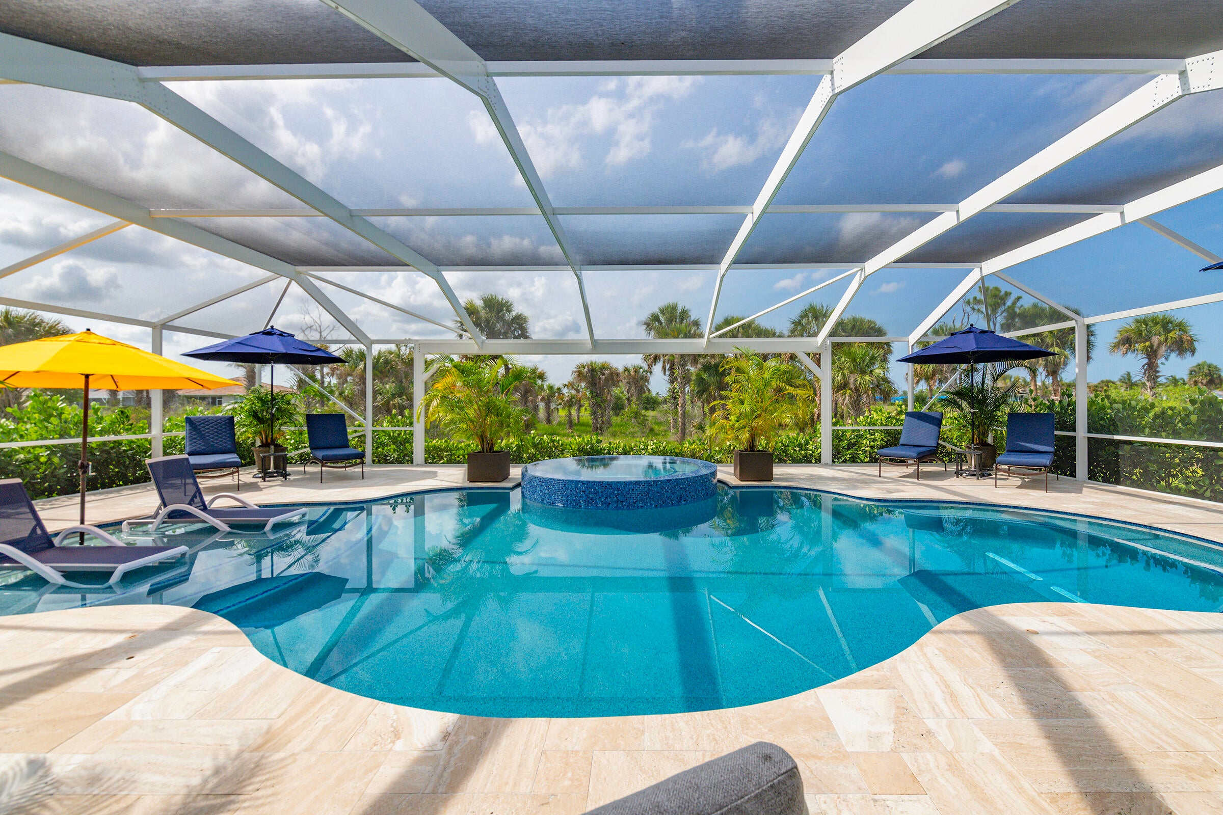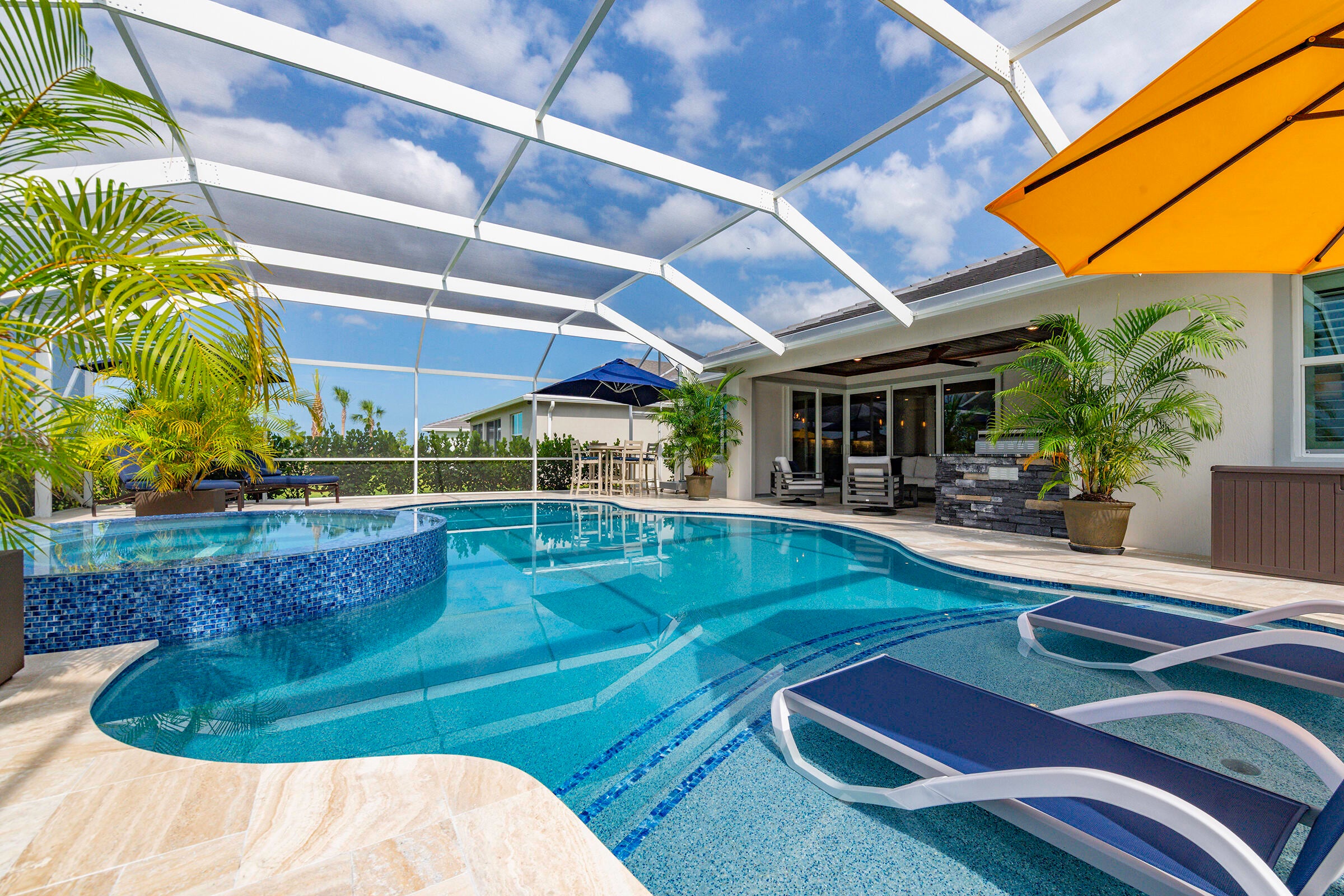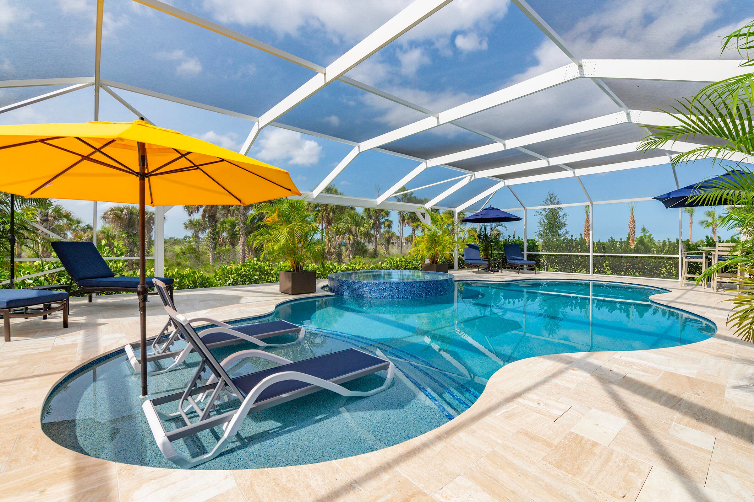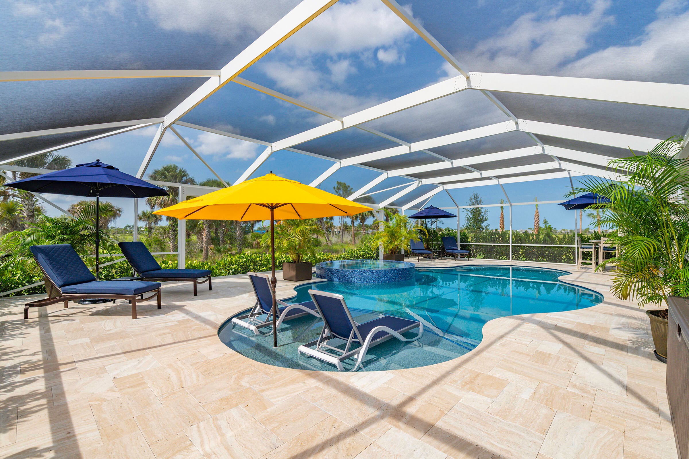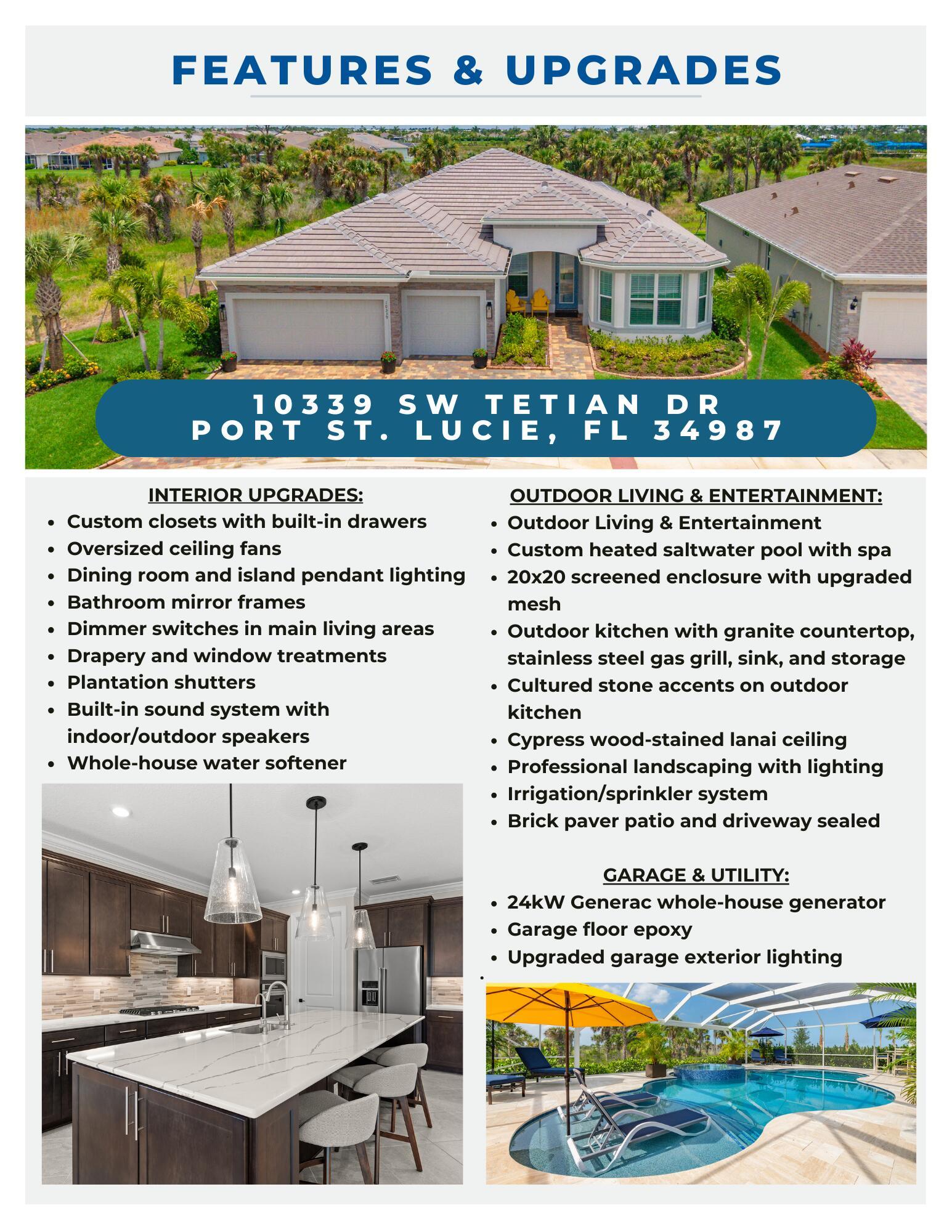 Experience unmatched privacy in this stunning 3 bed, 3 bath + flex room, 3-car garage home built in 2024 in Del Webb at Tradition. Perfectly situated at the end of a cul-de-sac with no neighbors to the left or behind and expansive preserve views, this is the only lot of its kind in the community. Enjoy your private outdoor oasis protected by an upgraded mesh screen enclosure with a heated pool, spa, sundeck, and full summer kitchen. Inside, this upgraded home offers an open layout, high ceilings, and designer finishes throughout. The gourmet kitchen features quartz counters, soft-close cabinetry, and stainless steel appliances. Relax in the luxurious primary suite with spa-style shower, or entertain in the expansive living area! Conveniently location close to all major amenities!Whether you're relaxing by the pool, entertaining guests, or enjoying the serene view of the lush preserve, this home delivers the ultimate Florida lifestyle with no through traffic and no compromise on luxury. A truly rare gem in one of Tradition's most sought-after resort style communities.