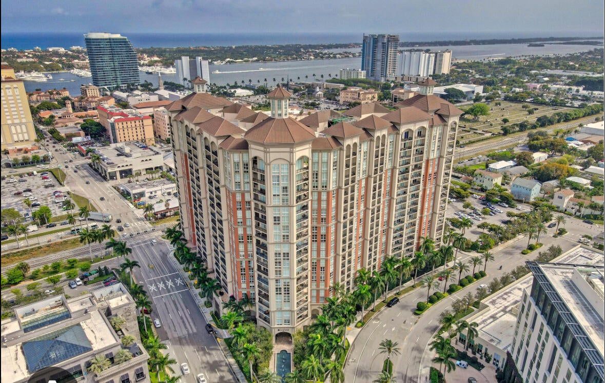 Investment property- Rented until October 2026. Largest 1 bedroom in prestigious Cityplace South Tower. Full-service luxury building w/24-hour doormen, valet, resort pool, jacuzzi, gym & club room. Minutes from PBI. Steps from Cityplace with shops, restaurants and the Kravis Center. Stainless steel appliances, granite countertops, custom closets, electric blinds, new washer/dryer, marble vanities, a spa tub and frameless glass shower on penthouse floor of the villas; parking & elevator outside your door. Features Hurricane Impact Windows and Doors throughout.