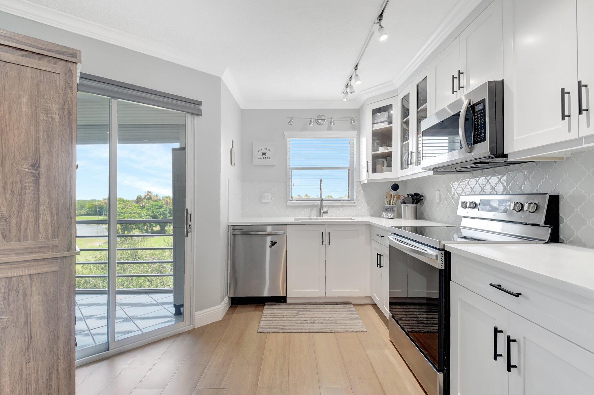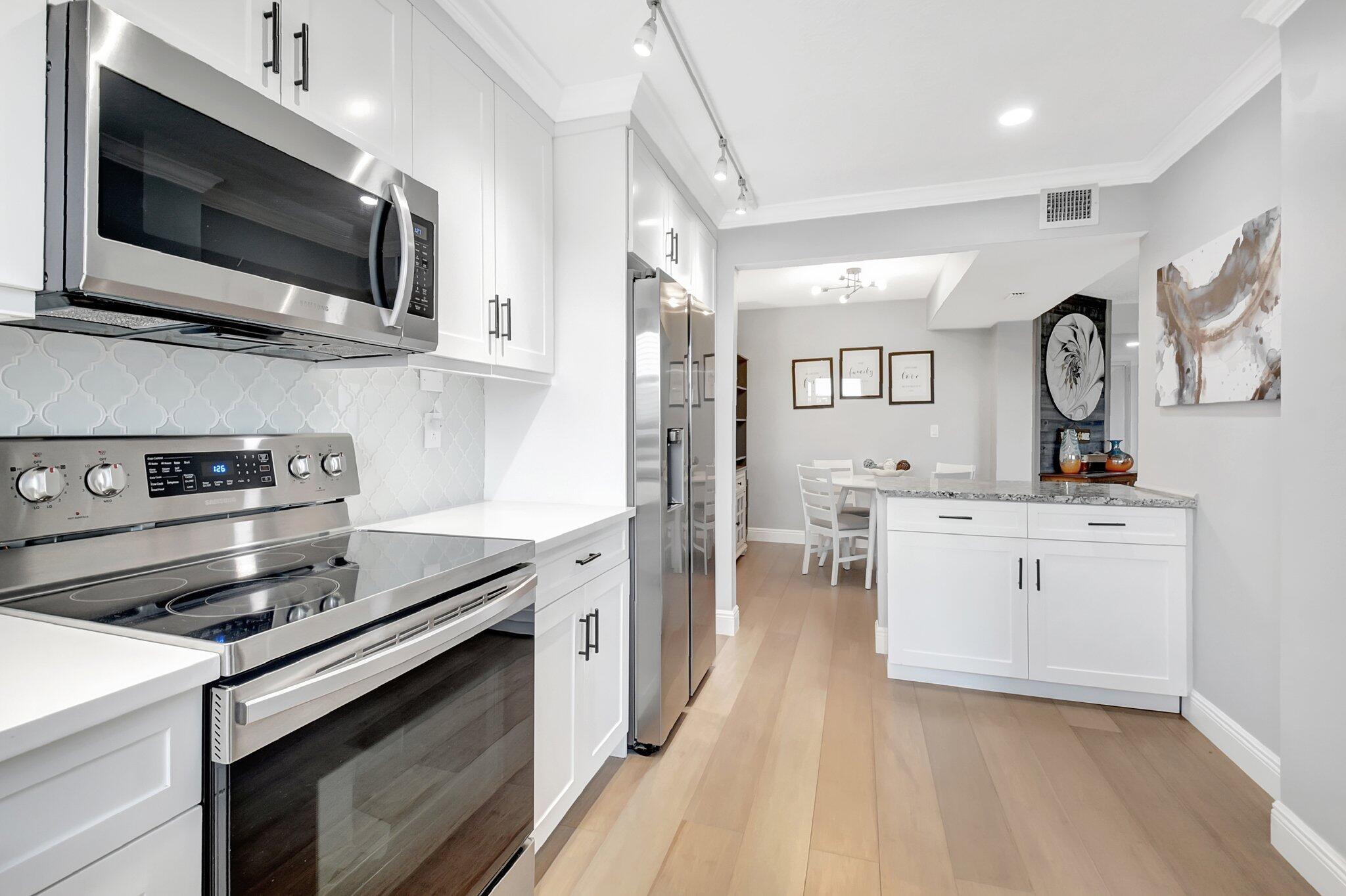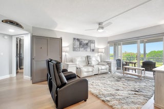 Golf course views with this lovely unit! Newer A/C, hot water heater, washer, dryer and disposal. New Bamboo floors, baths are tiled. New vanities and plumbing fixtures. New lighting, ceiling fans and wall mirrors. new doors, kitchen cabinets, countertops and backsplash. New peninsula between kitchen and dining. New window treatments throughout, Upgraded closet units in MBR.