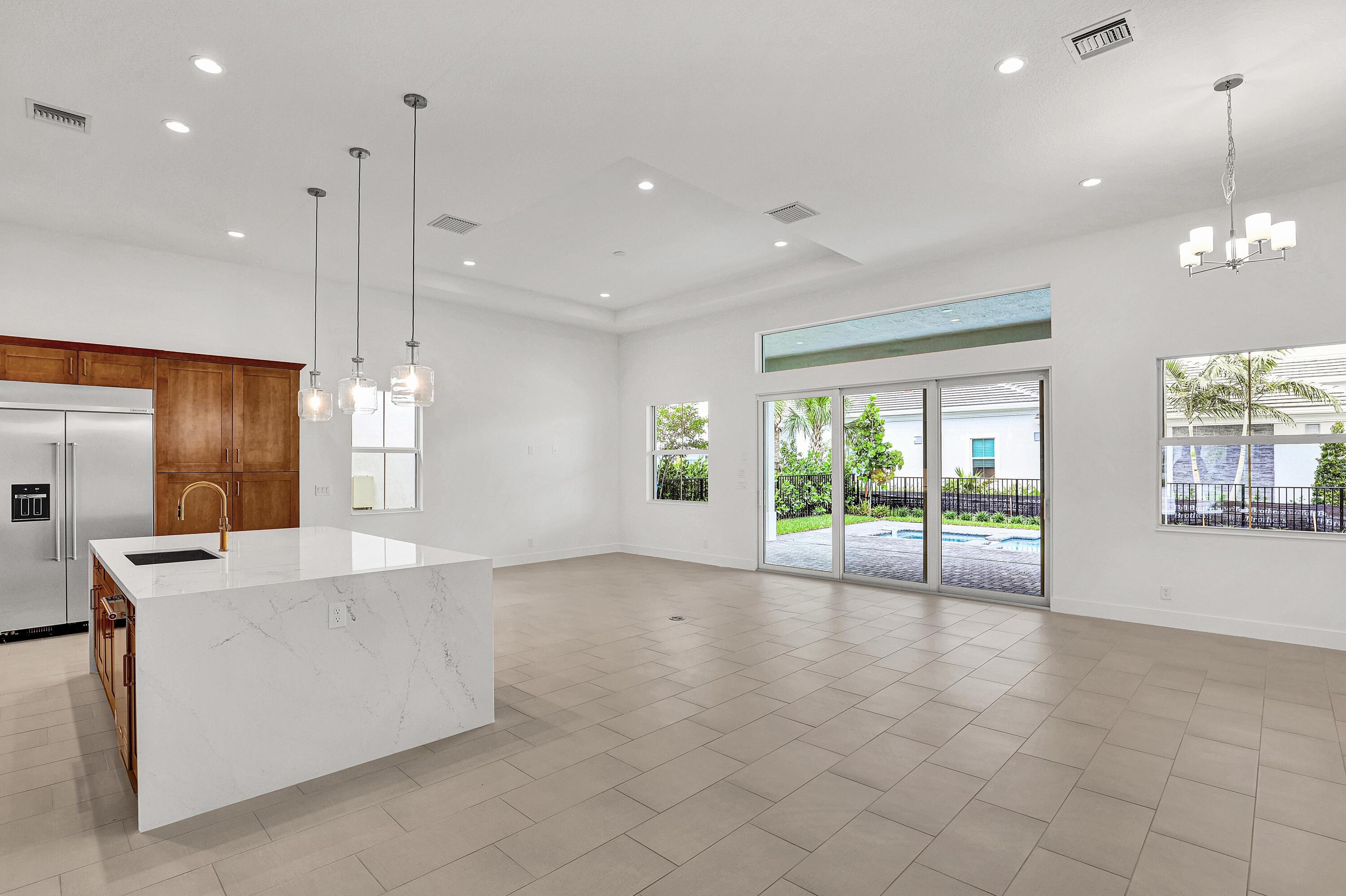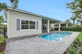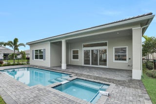 The stunning LEWISTON CONTEMPORARY home offers an expansive, open-concept floorplan perfect for modern living. A spacious, covered lanai extends your living space outdoors, creating an ideal setting for relaxation or entertaining by the private swimming pool and spa. The chef-inspired kitchen boasts a large center island with a breakfast bar, abundant counter space, and ample cabinetry. The luxurious primary suite features dual walk-in closets and a spa-like bathroom with a dual-sink vanity, providing the perfect retreat. Located within the prestigious Regency, a manned-gate, active adult (55+) community with exclusive 21,000 s.f. clubhouse. - The Pearl.