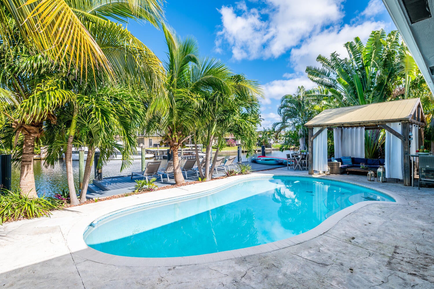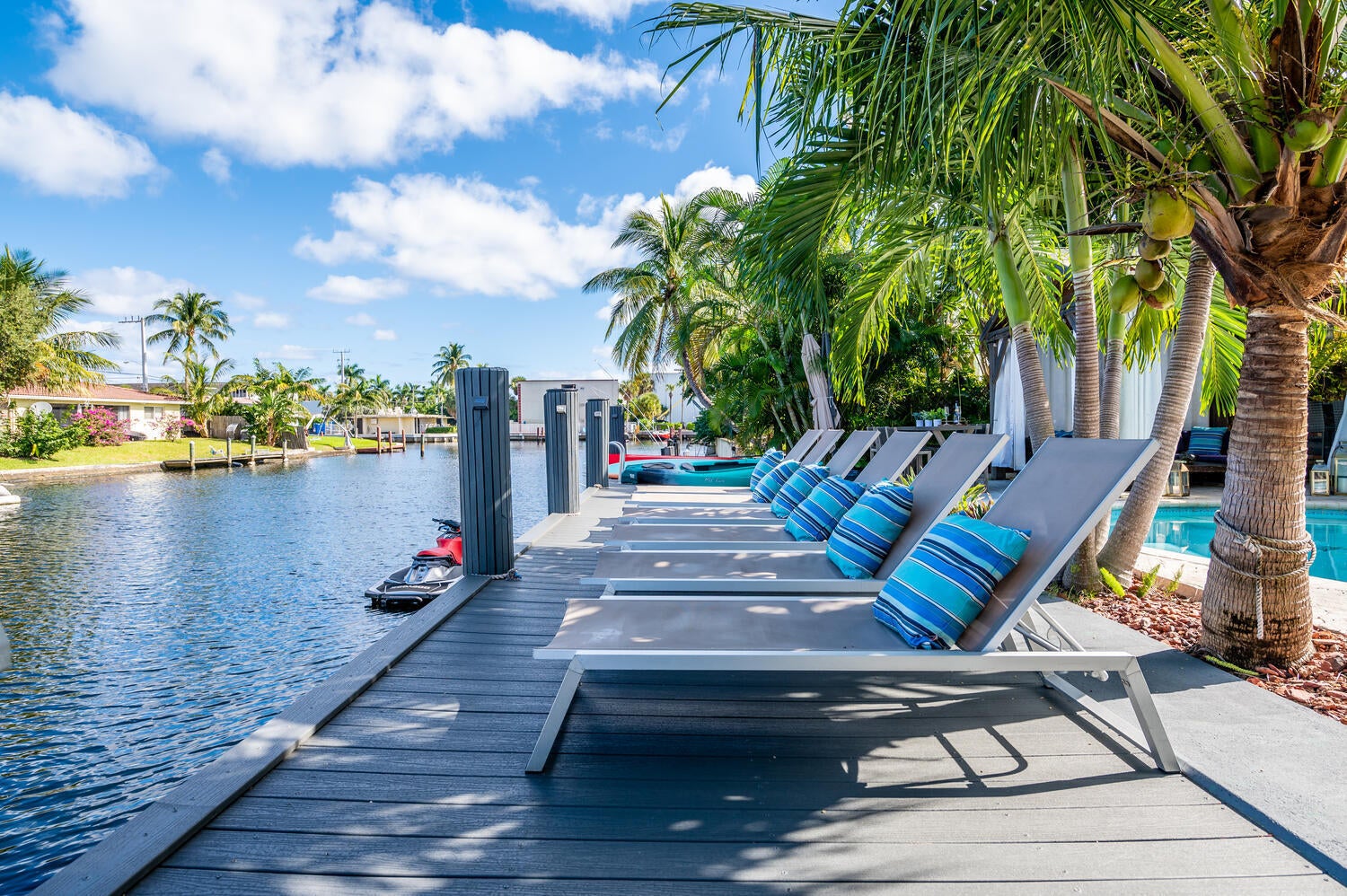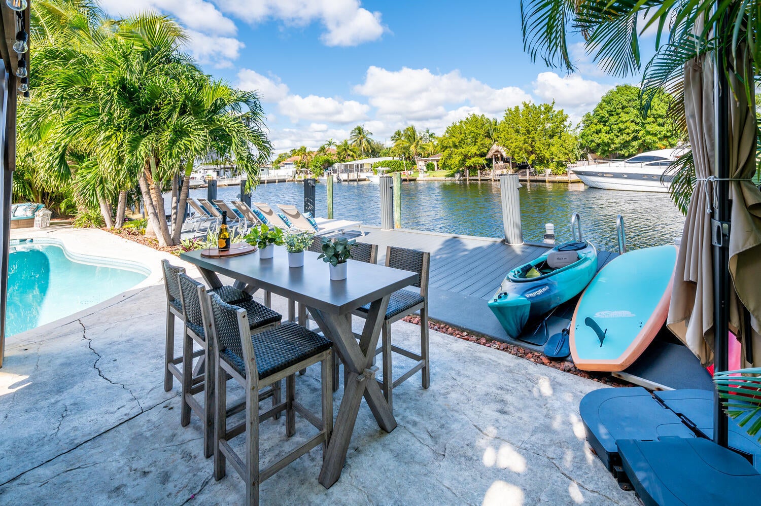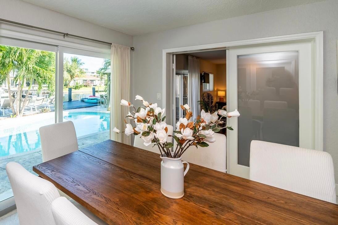 This waterfront home is the family-resort you have been looking for. Fully furnished 4 beds 3 baths, open-conceptgourmet kitchen with new appliances, bar countertop and spacious living/media room area. Relax in the private,heated pool while enjoying water views and spectacular sunsets. There's a spa in a cozy corner surrounded by lushlandscaping for privacy. The outside bar with gas grill invites for BBQ cookouts. A brand new private dock issuitable for boats up to 35 ft. Throw your lines in the water and catch your dinner. This home is off Federal Hwy (US1) and just minutes from I-95. Quick 5 min drive to beach on East Atlantic Blvd, Beach access, grocery stores, Watersport rentals, several gorgeous beach bars and waterfront restaurants nearby. SEASONAL | FURNISHED!
