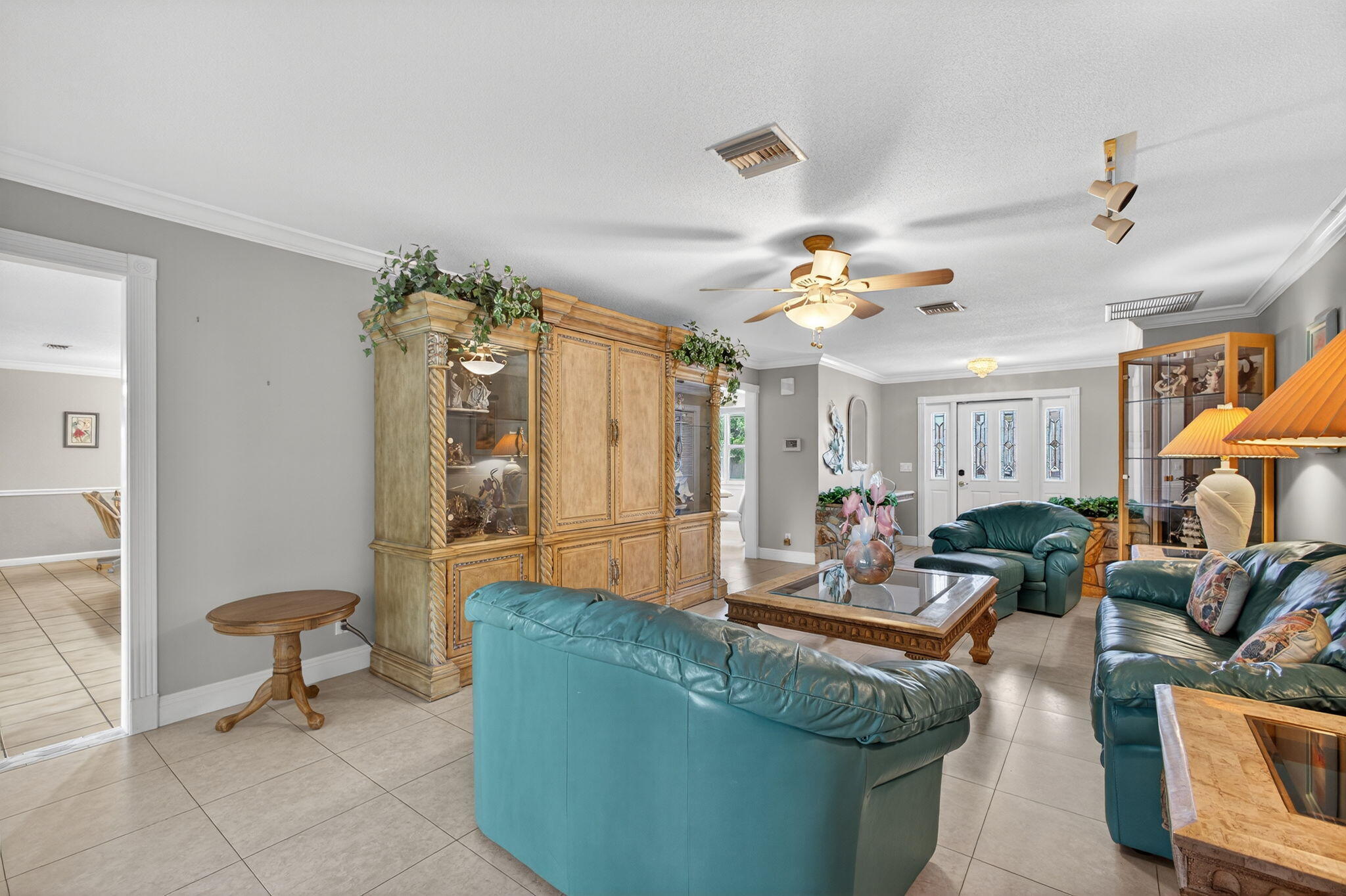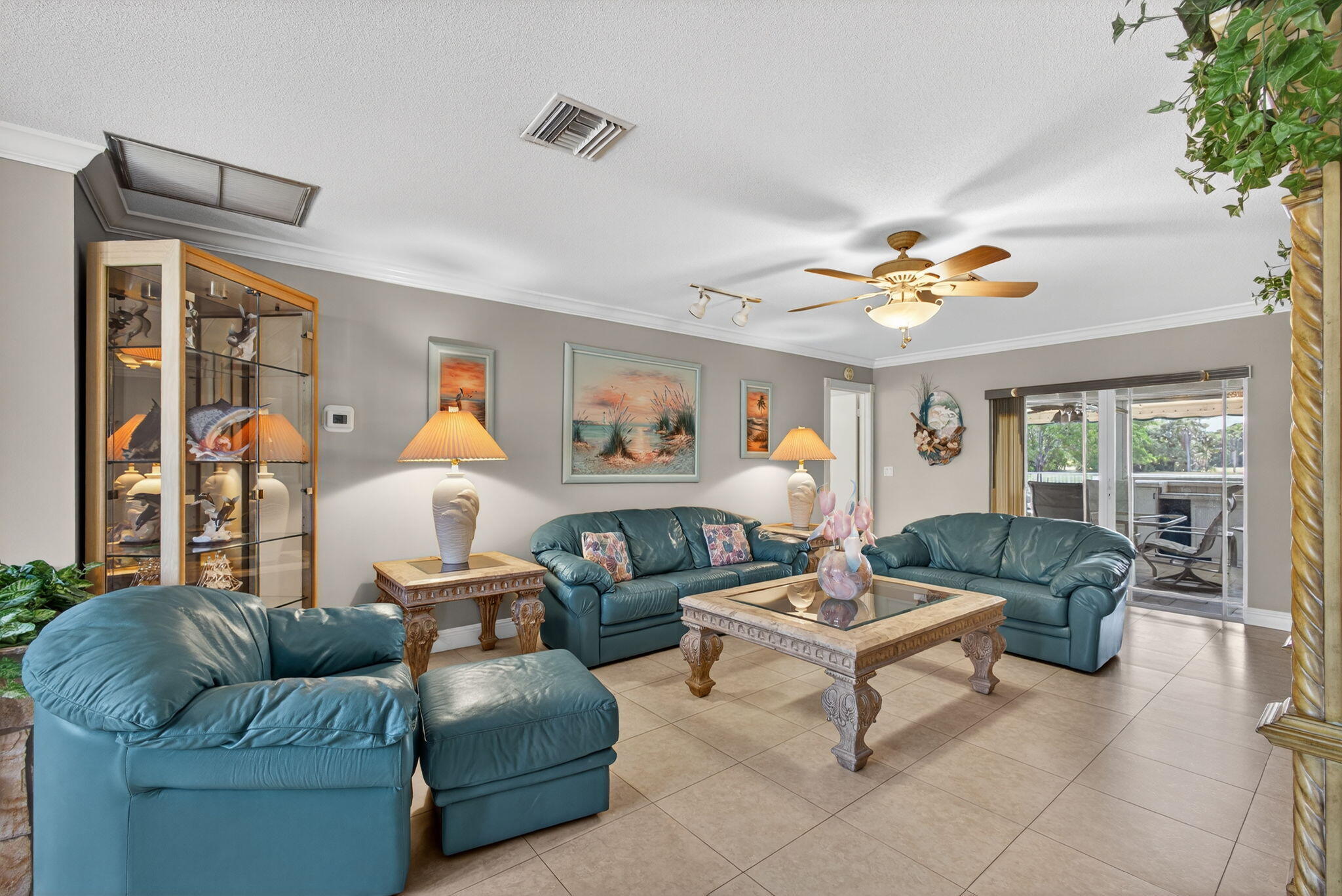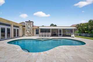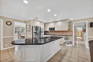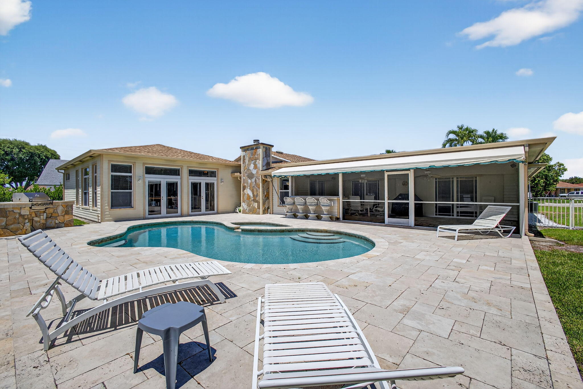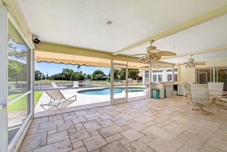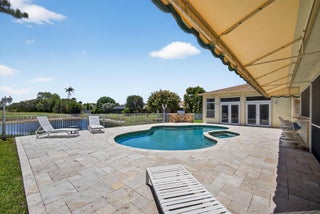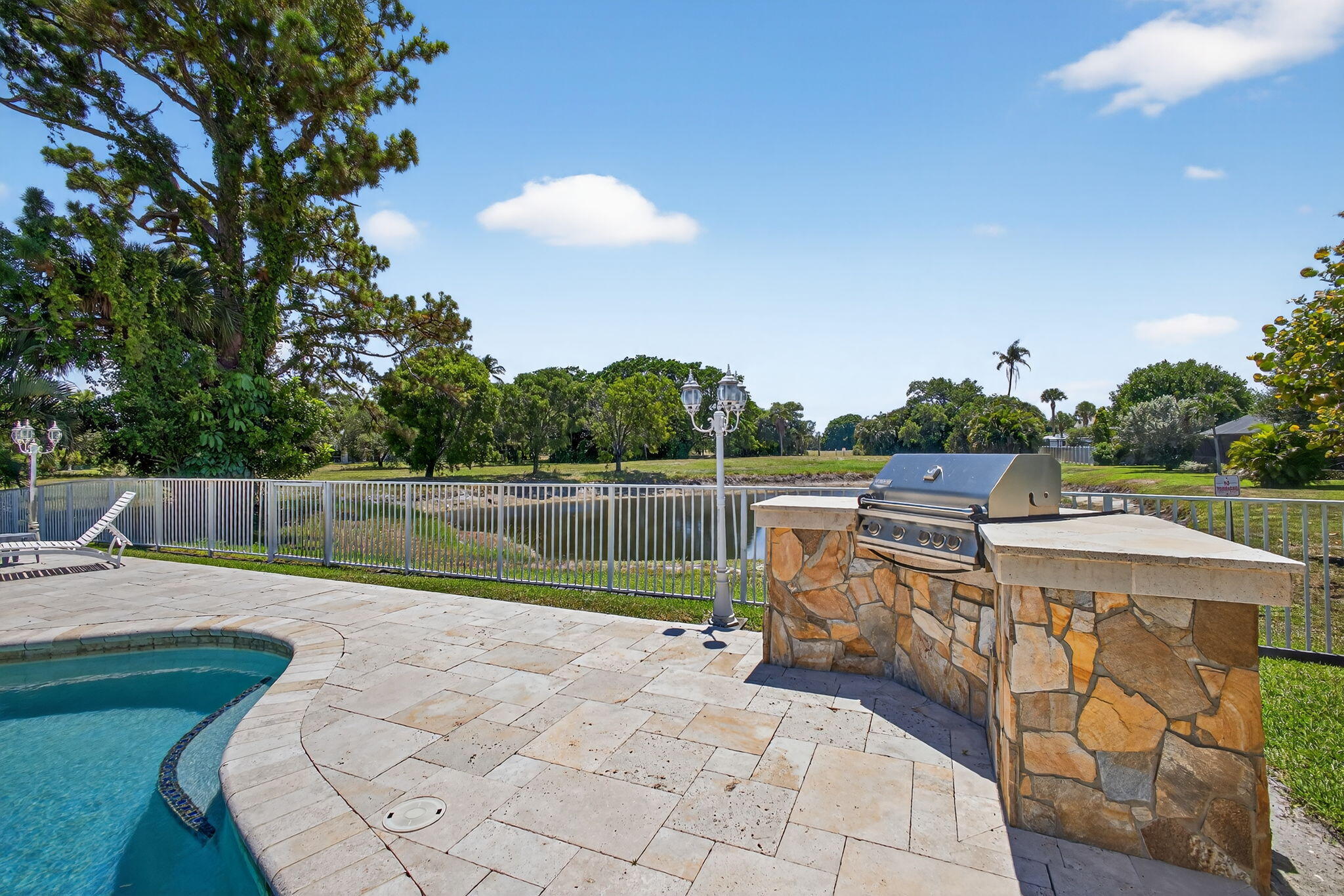 Spacious lakefront ranch home in a gated community with large, oversized rooms filled with abundant natural light The gourmet kitchen boasts granite counters and opens to a family room with a cozy fireplace. Conveniently located off the family room is a massive bonus/great room--perfect for entertaining. Enjoy serene water views, a sparkling pool, and a custom outdoor bar perfect for gatherings. Additional features include tons of large closets throughout and a circular driveway for added curb appeal. The ROOF was re-done in 2022 and the home is secure with impact windows and doors. This home has it all--comfort with space to live and entertain plus the low HOA dues make this home a rare find! CHECK OUT THE 3D WALK THRU.