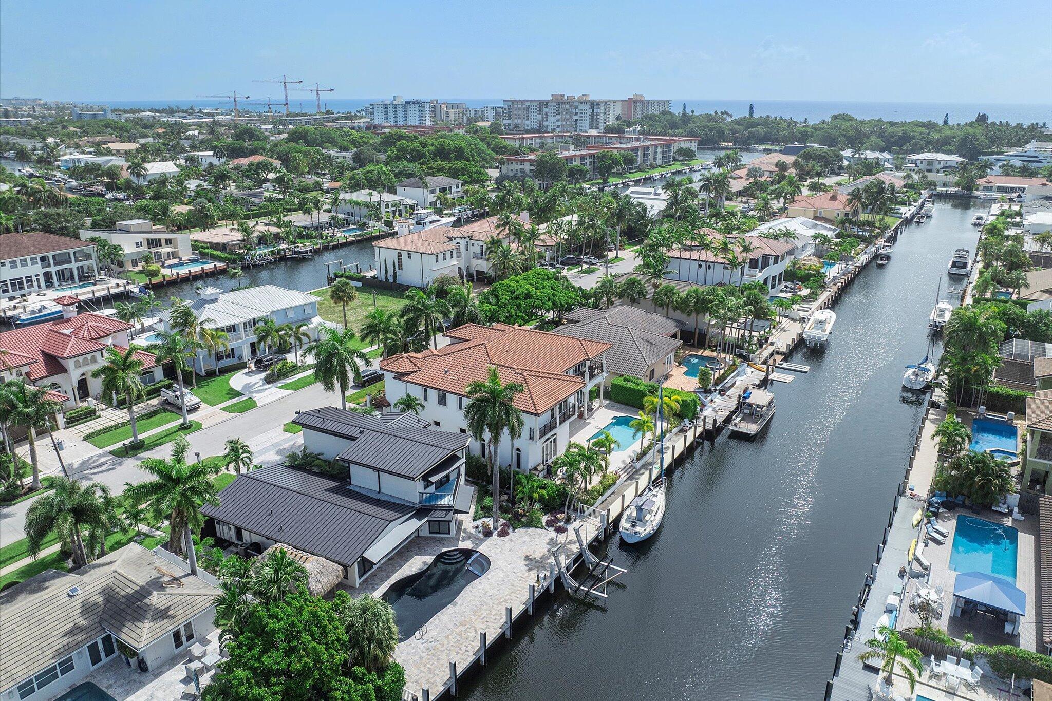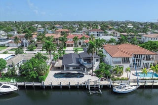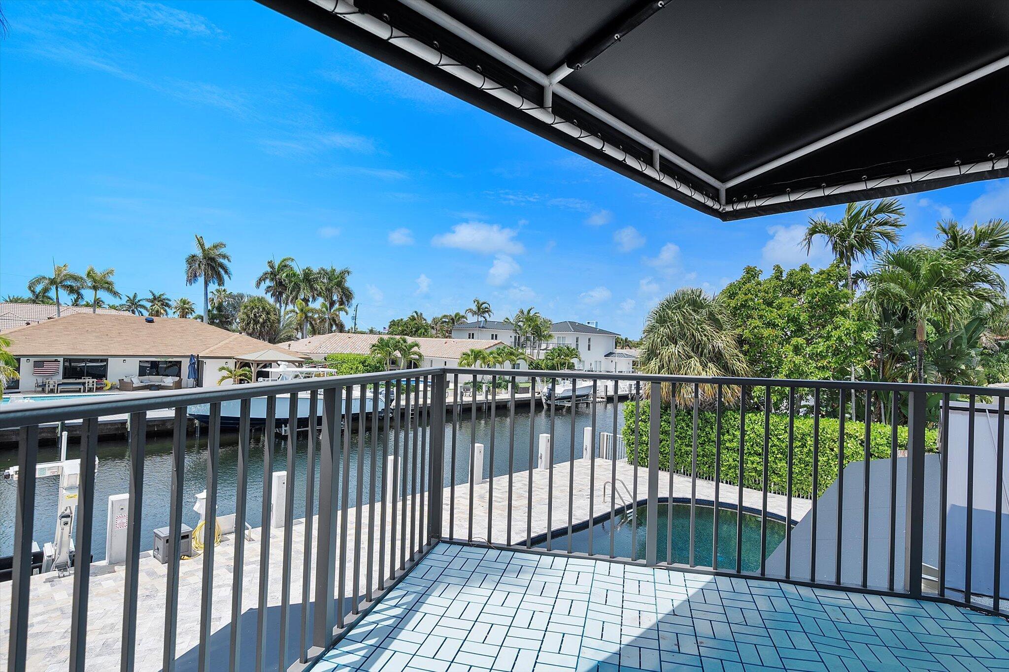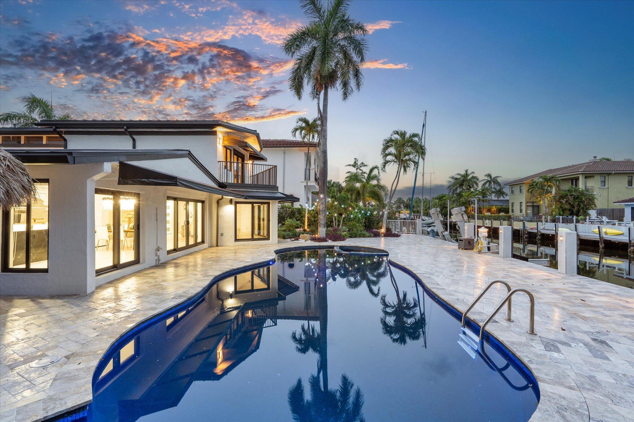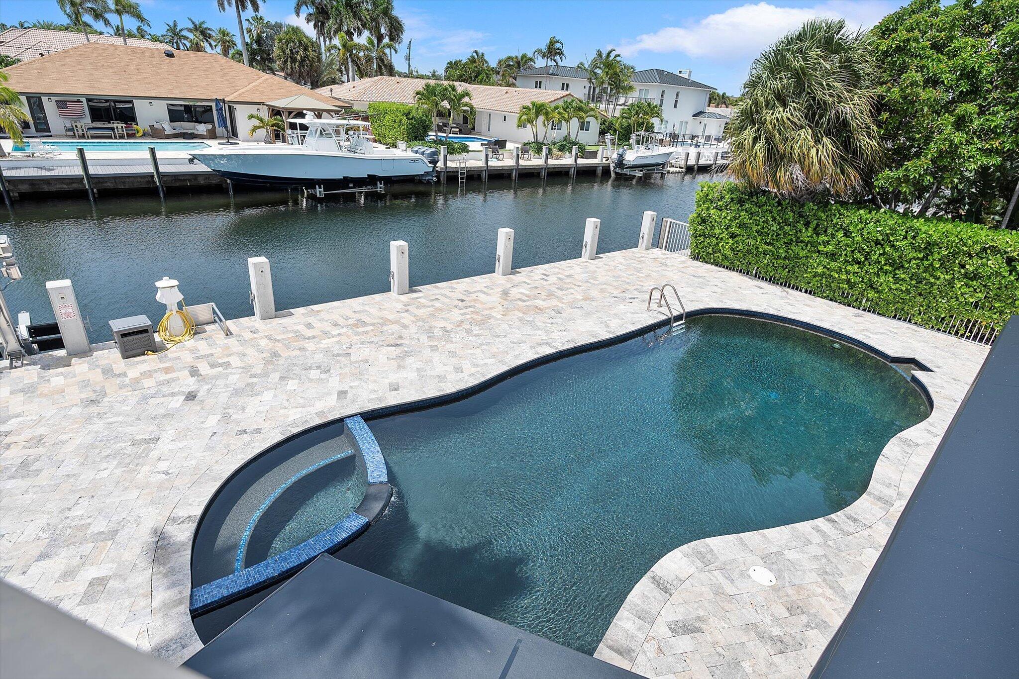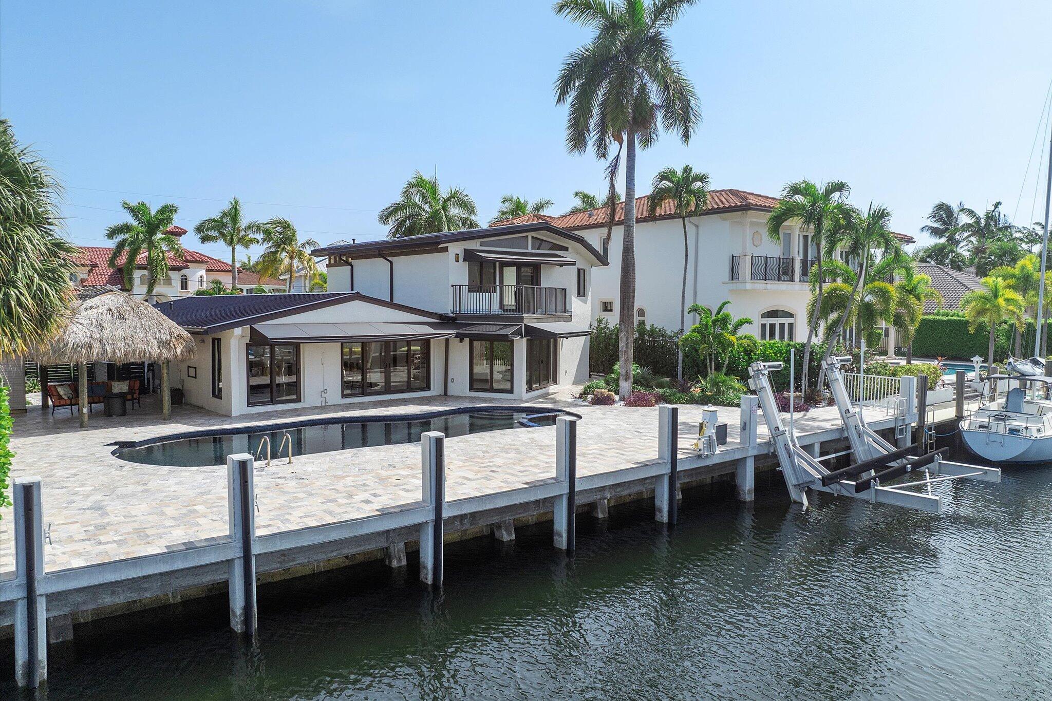 Boater's dream home located on a deepwater canal with no fixed bridges in Lighthouse Point offers the best of South Florida living--whether you're an avid boater, outdoor entertainer, or simply looking for a move-in-ready waterfront property. The home includes an 80-foot dock, fully rebuilt in 2024 with raised concrete (to 5.0 elevation), along with a 24,000 lb boat lift. A new aluminum roof was installed in 2024, along with an upgraded electrical system and two new A/C units with all-new ductwork. The home has a split floor plan, with the primary suite located upstairs for added privacy and the additional bedrooms downstairs on the opposite side of the house.The primary bathroom was fully remodeled in 2024. The second floor features new flooring. The patio, pool, and deck area have all been remodeled, creating a clean, functional outdoor space ideal for relaxing or entertaining. The saltwater pool and spa are both heated and feature updated equipment, including a new shared heater added in 2024. The entire system is controlled by Aqualink, allowing you to manage settings remotely from your smartphone. Additional improvements include two new garage doors with belt-driven openers, an epoxy-coated garage floor, and new electric blinds in the primary bedroom. A new tiki hut (2024), new awnings (2025), and extensive landscaping complete the outdoor transformation. The landscaping is enhanced with Hughes smart lighting, which can be controlled via smartphone to create the perfect outdoor ambiance. The home also features impact windows and doors. With major updates already completed, this home offers low-maintenance, turnkey waterfront living in one of Lighthouse Point's most desirable neighborhoods.