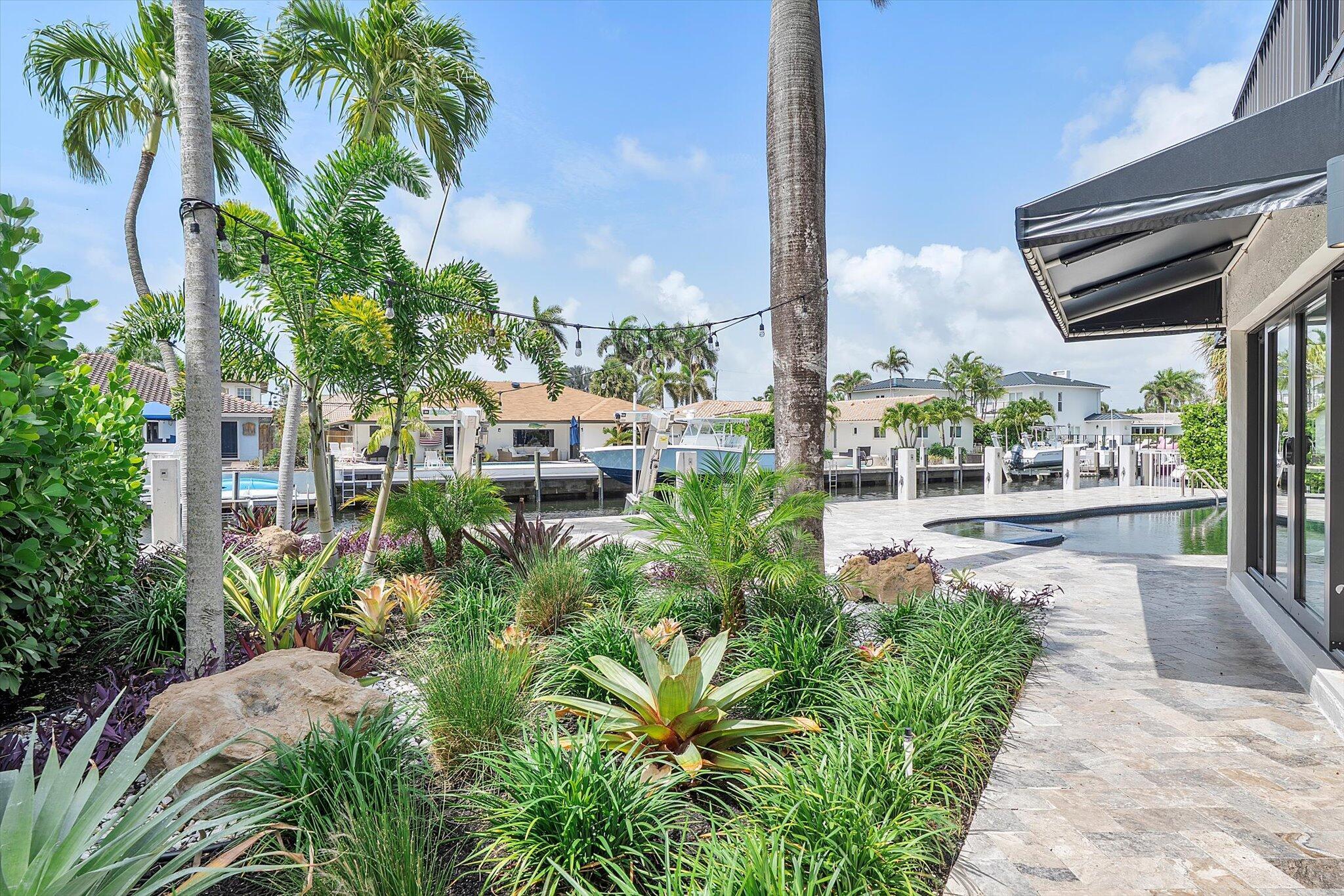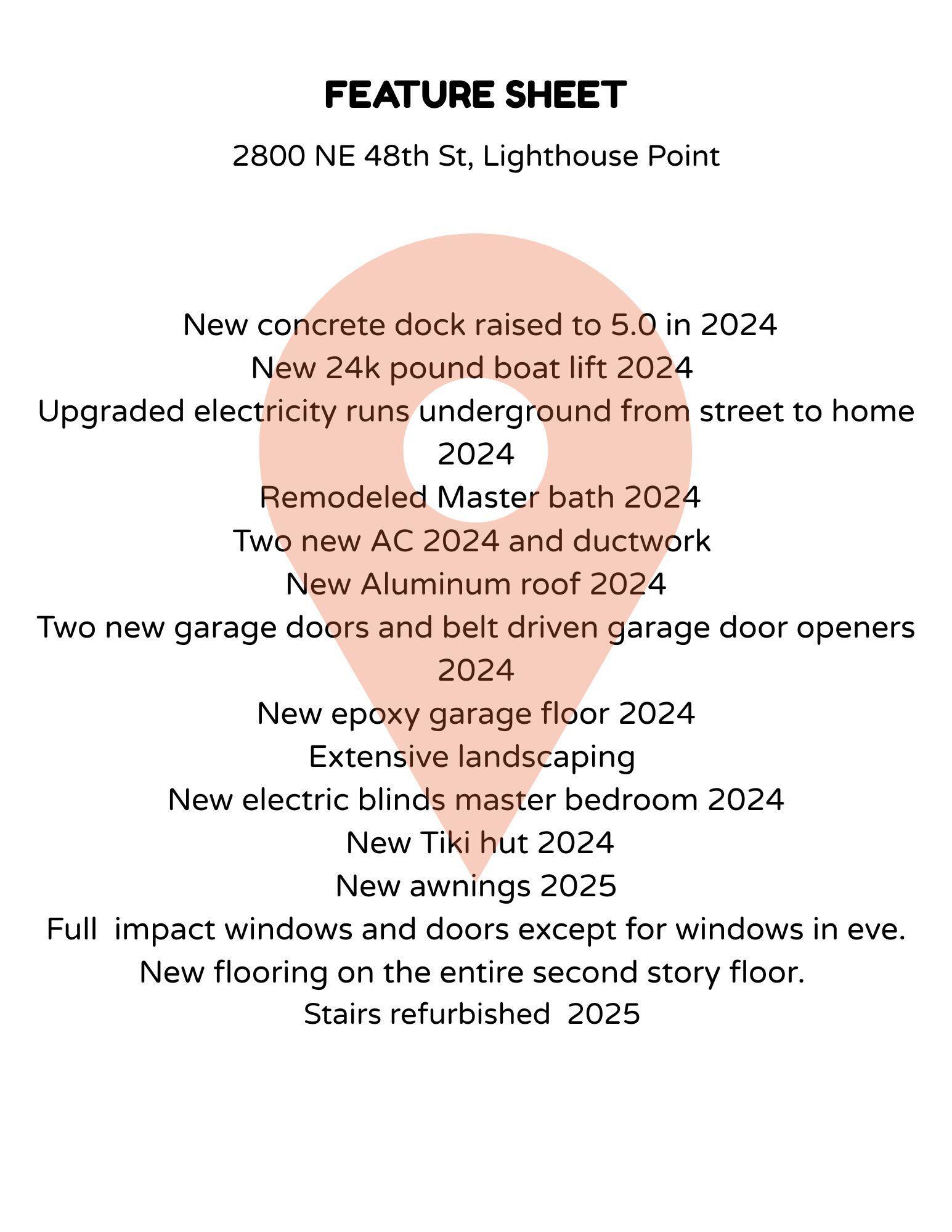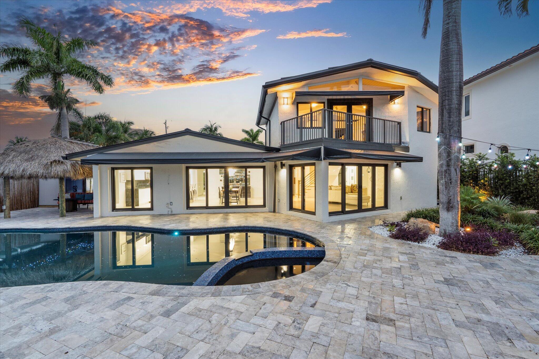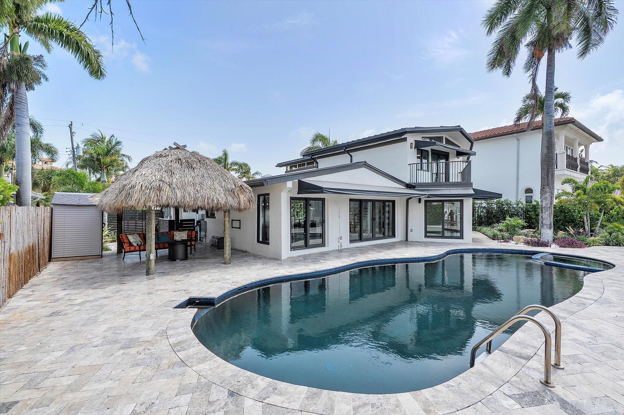 Boater's dream home located on a deepwater canal with no fixed bridges in Lighthouse Point offers the best of South Florida living--whether you're an avid boater, outdoor entertainer, or simply looking for a move-in-ready waterfront property. The home includes an 80-foot dock, fully rebuilt in 2024 with raised concrete (to 5.0 elevation), along with a 24,000 lb boat lift. A new aluminum roof was installed in 2024, along with an upgraded electrical system and two new A/C units with all-new ductwork. The home has a split floor plan, with the primary suite located upstairs for added privacy and the additional bedrooms downstairs on the opposite side of the house.The primary bathroom was fully remodeled in 2024. The second floor features new flooring. The patio, pool, and deck area have all been remodeled, creating a clean, functional outdoor space ideal for relaxing or entertaining. The saltwater pool and spa are both heated and feature updated equipment, including a new shared heater added in 2024. The entire system is controlled by Aqualink, allowing you to manage settings remotely from your smartphone. Additional improvements include two new garage doors with belt-driven openers, an epoxy-coated garage floor, and new electric blinds in the primary bedroom. A new tiki hut (2024), new awnings (2025), and extensive landscaping complete the outdoor transformation. The landscaping is enhanced with Hughes smart lighting, which can be controlled via smartphone to create the perfect outdoor ambiance. The home also features impact windows and doors. With major updates already completed, this home offers low-maintenance, turnkey waterfront living in one of Lighthouse Point's most desirable neighborhoods.