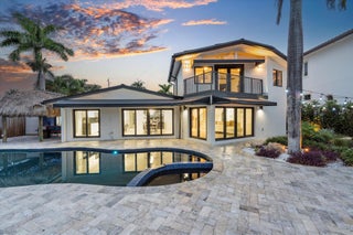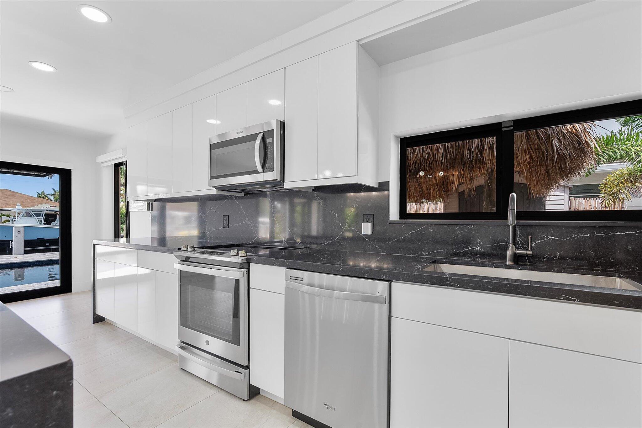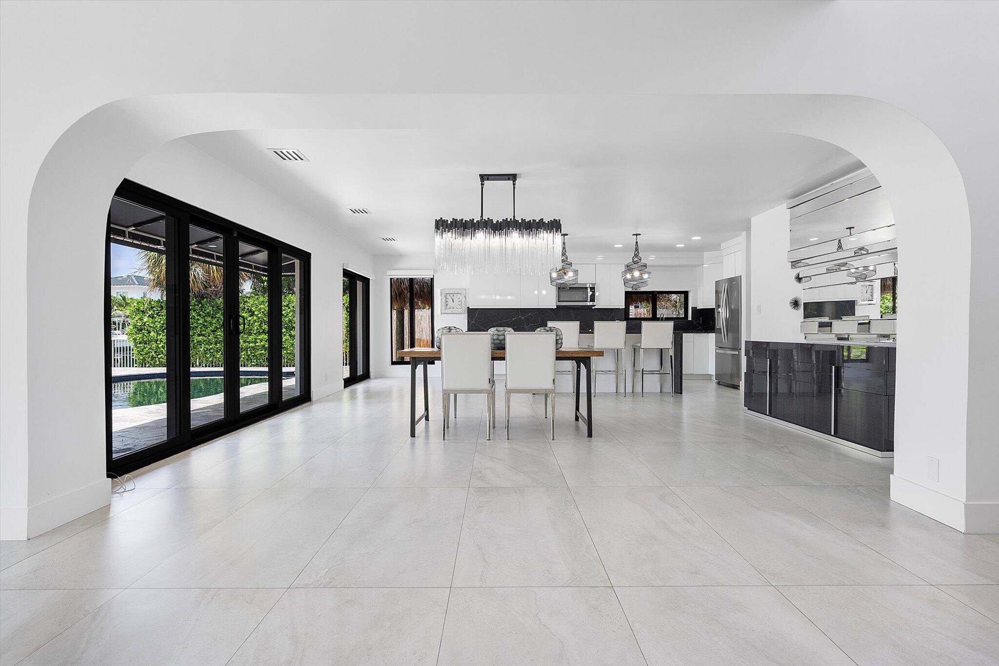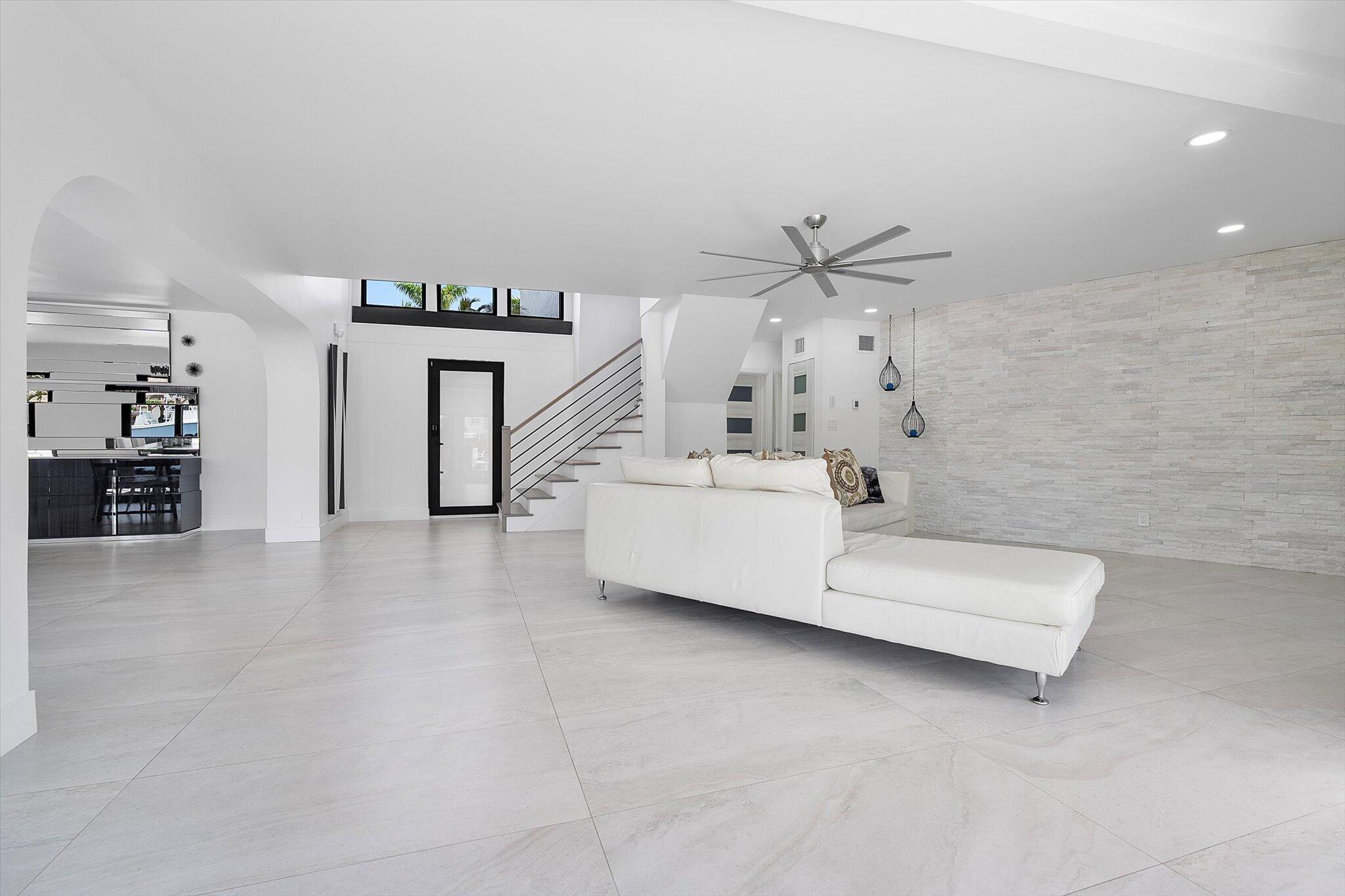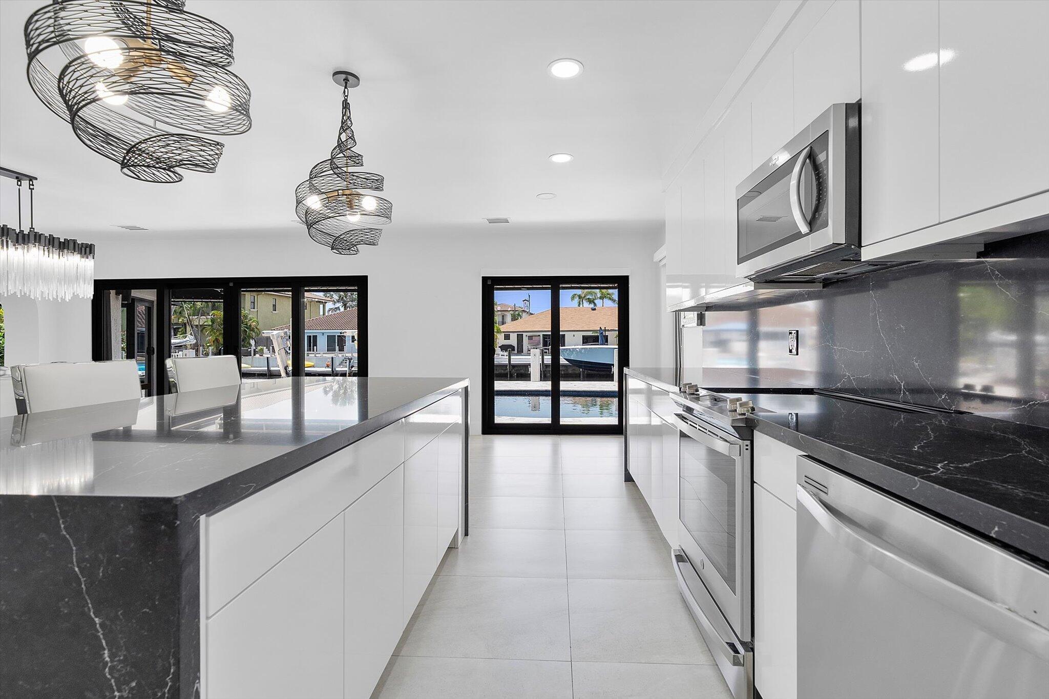 Boater's dream home located on a deepwater canal with no fixed bridges in Lighthouse Point offers the best of South Florida living--whether you're an avid boater, outdoor entertainer, or simply looking for a move-in-ready waterfront property. The home includes an 80-foot dock, fully rebuilt in 2024 with raised concrete (to 5.0 elevation), along with a 24,000 lb boat lift. A new aluminum roof was installed in 2024, along with an upgraded electrical system and two new A/C units with all-new ductwork. The home has a split floor plan, with the primary suite located upstairs for added privacy and the additional bedrooms downstairs on the opposite side of the house.The primary bathroom was fully remodeled in 2024. The second floor features new flooring. The patio, pool, and deck area have all been remodeled, creating a clean, functional outdoor space ideal for relaxing or entertaining. The saltwater pool and spa are both heated and feature updated equipment, including a new shared heater added in 2024. The entire system is controlled by Aqualink, allowing you to manage settings remotely from your smartphone. Additional improvements include two new garage doors with belt-driven openers, an epoxy-coated garage floor, and new electric blinds in the primary bedroom. A new tiki hut (2024), new awnings (2025), and extensive landscaping complete the outdoor transformation. The landscaping is enhanced with Hughes smart lighting, which can be controlled via smartphone to create the perfect outdoor ambiance. The home also features impact windows and doors. With major updates already completed, this home offers low-maintenance, turnkey waterfront living in one of Lighthouse Point's most desirable neighborhoods.