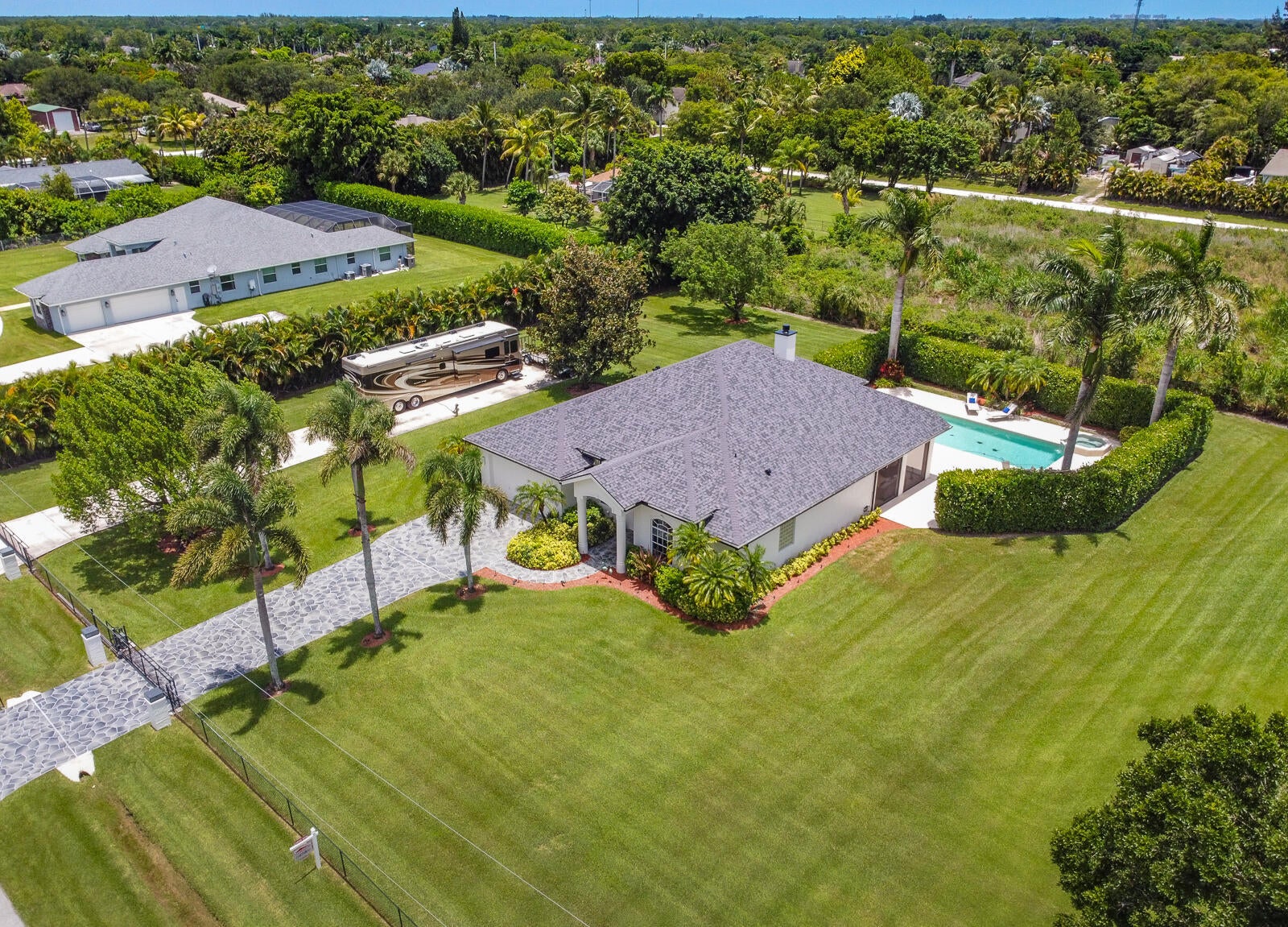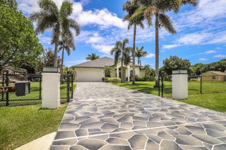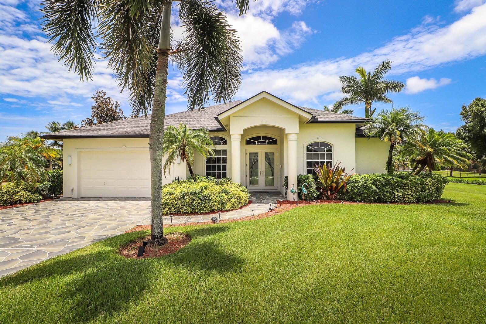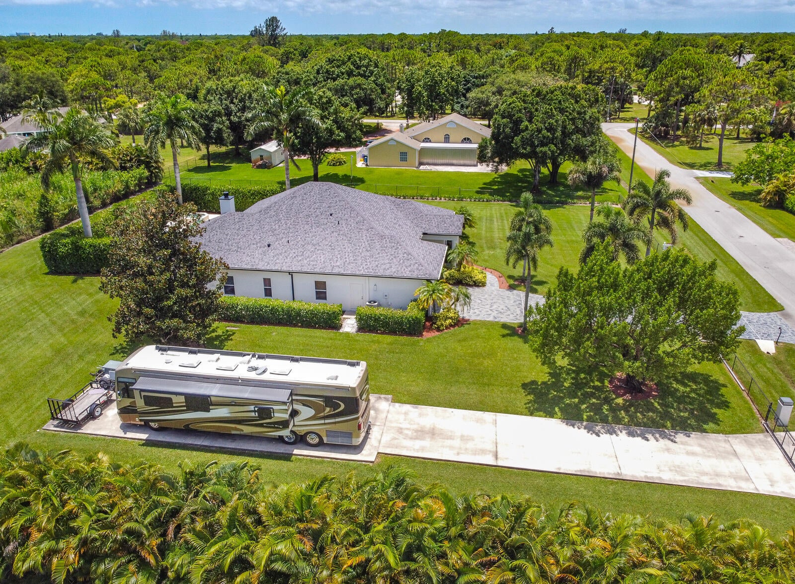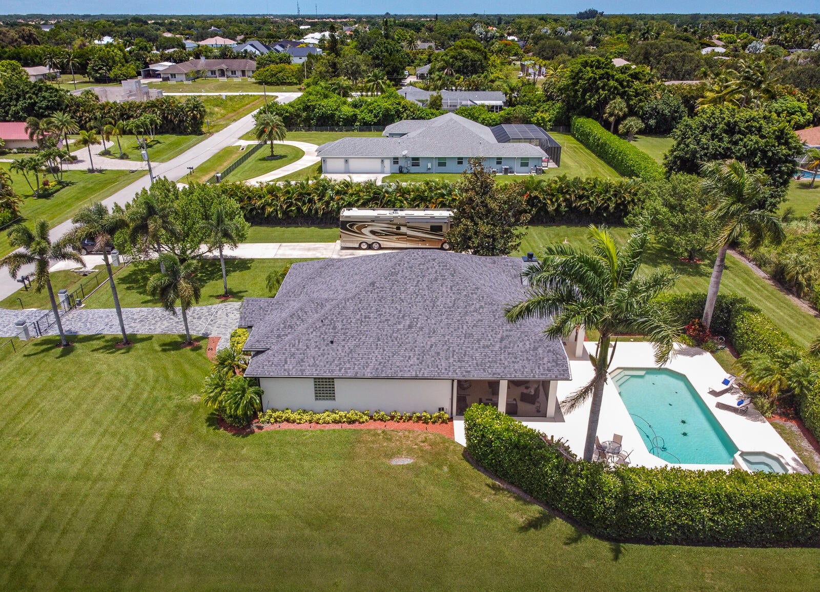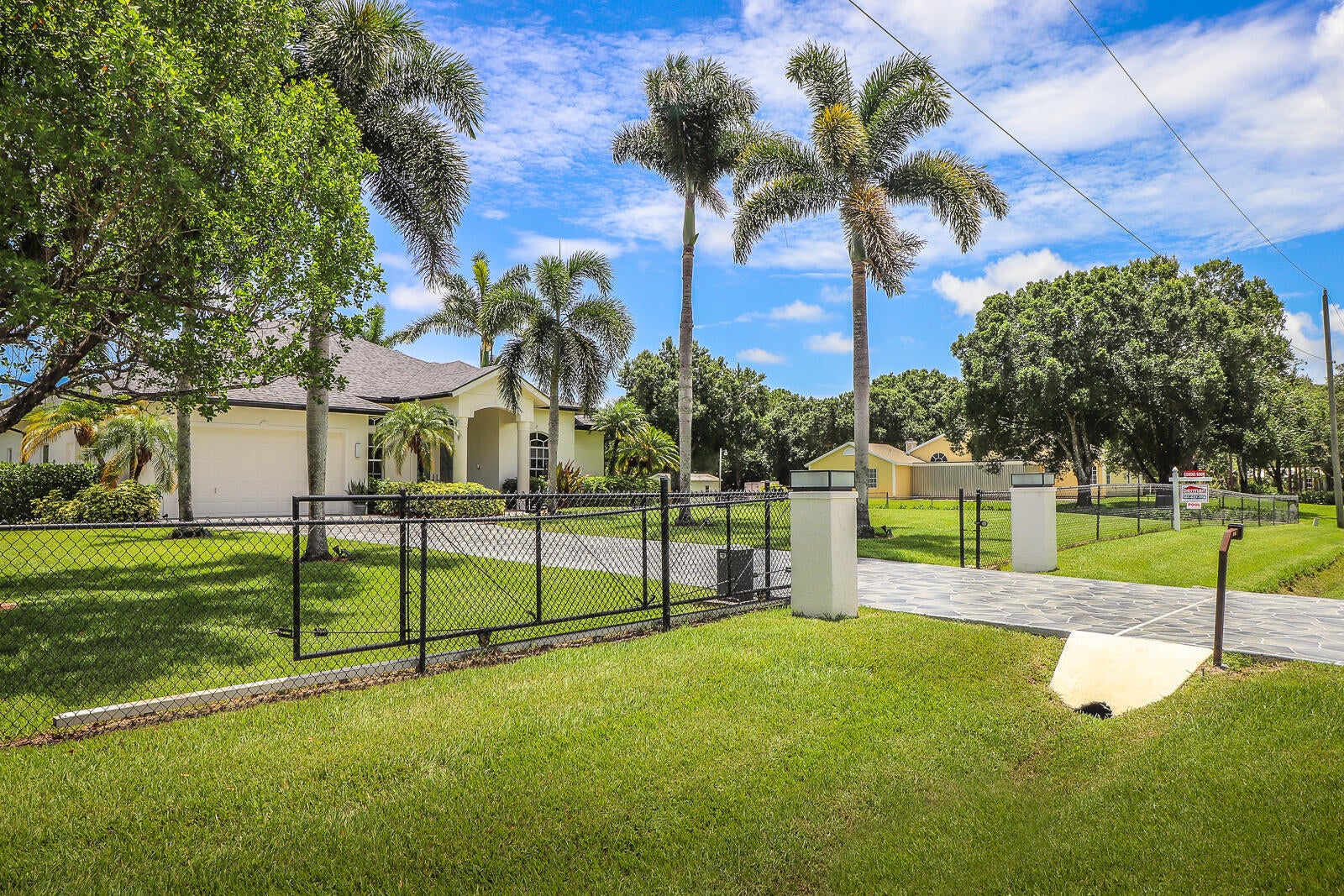 Fantastic 4 BR+den/3 BA/2-car garage CBS home with 40 ft. pool w/new salt system on an immaculately maintained 1.15-AC lot on a paved road in Palm Beach Country Estates. New roof 2025. Fully-fenced property with an automatic electric entry gate with keypad on the main driveway in addition to a separate manual gate leading into a large second driveway/RV parking area. The oversized pool with hot tub spa is situated on a spacious 2,400sf patio with hot/cold outdoor shower, cabana bathroom, and privacy landscaping. Huge screened porch. The house features high ceilings, crown molding, split bedrooms, and wood-burning fireplace. Large kitchen with center island, walk-in pantry, dual wall ovens, granite countertops, breakfast nook and bar, and modern stainless-steel appliances.Formal dining room. Master bathroom with Roman tub, separate shower, and large walk-in closet. The concrete RV parking pad with 50-amp electric hookup is ready for an optional steel building. Other features include: central vacuum, commercial water heater, and low-voltage hardwired landscape lighting. This home is hooked-up to high-speed AT&T Fiber. Surrounded by upscale homes. Palm Beach Country Estates features quiet country living with no HOA, city water, and close proximity to area amenities such as Alton Town Center and Abacoa.