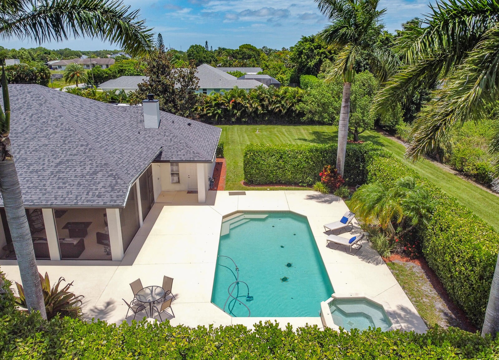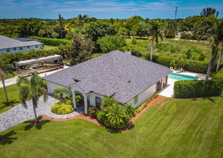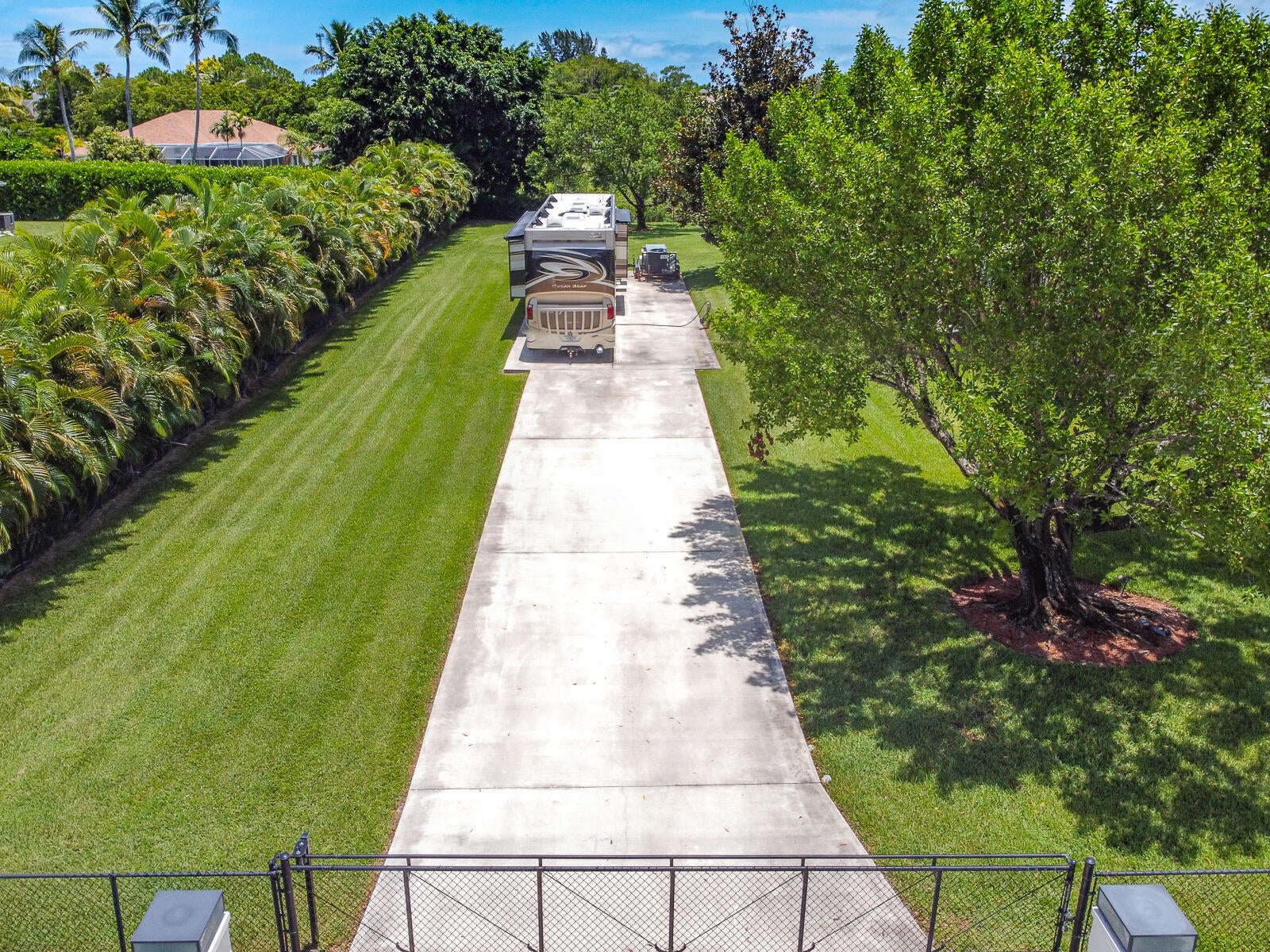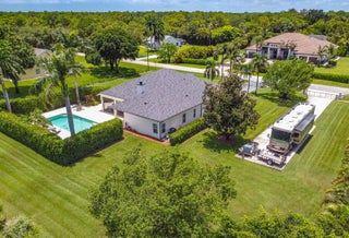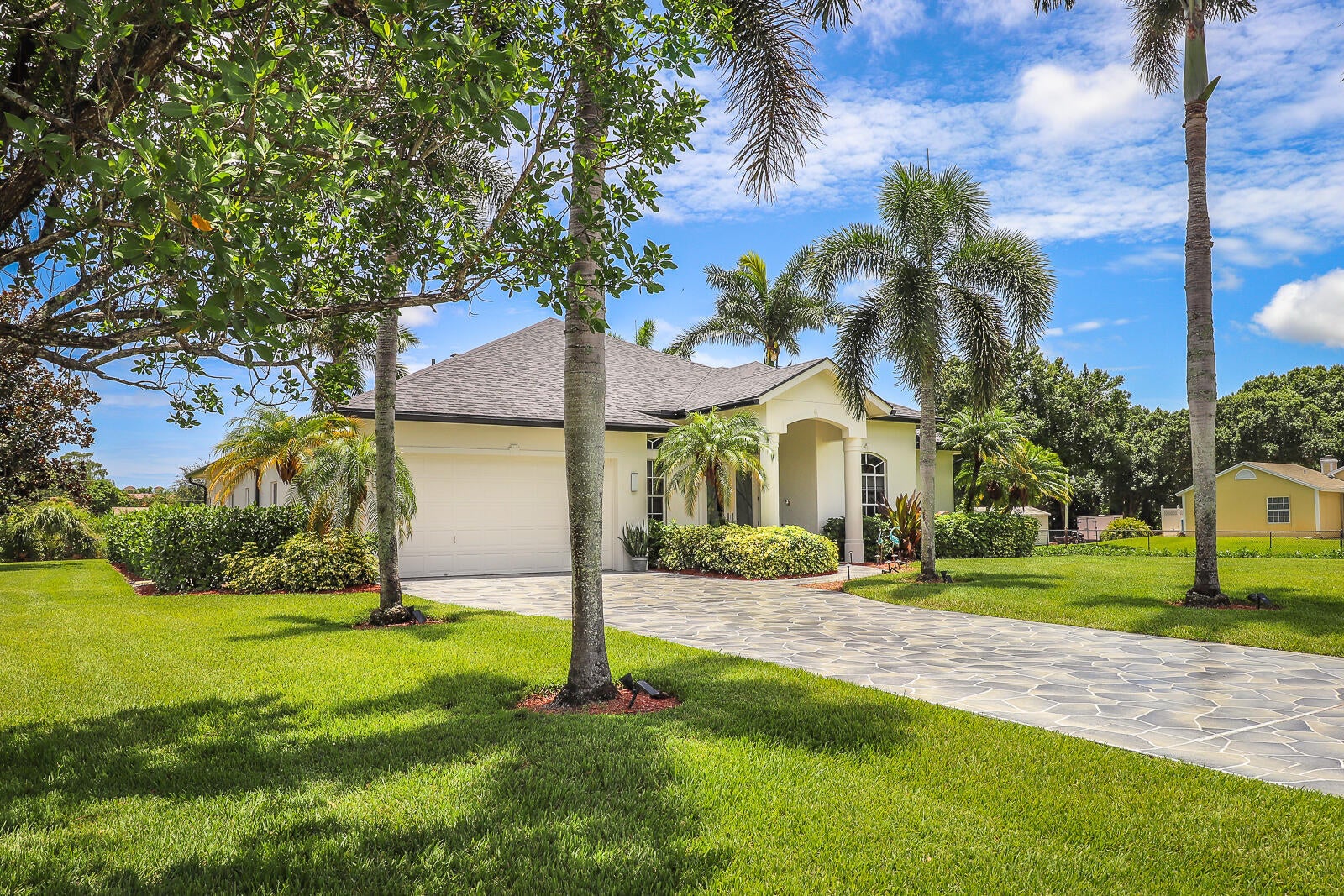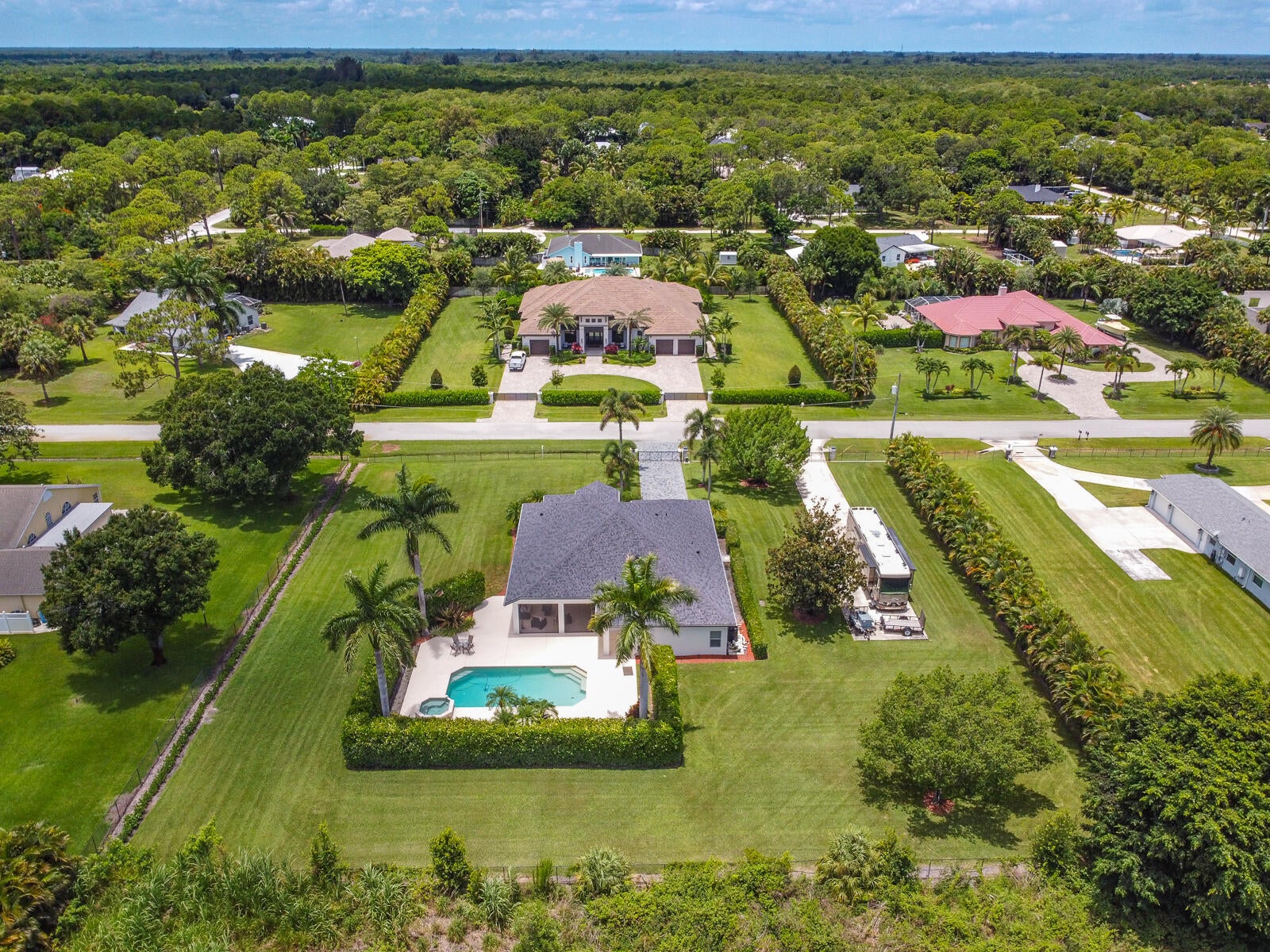 Fantastic 4 BR+den/3 BA/2-car garage CBS home with 40 ft. pool w/new salt system on an immaculately maintained 1.15-AC lot on a paved road in Palm Beach Country Estates. New roof 2025. Fully-fenced property with an automatic electric entry gate with keypad on the main driveway in addition to a separate manual gate leading into a large second driveway/RV parking area. The oversized pool with hot tub spa is situated on a spacious 2,400sf patio with hot/cold outdoor shower, cabana bathroom, and privacy landscaping. Huge screened porch. The house features high ceilings, crown molding, split bedrooms, and wood-burning fireplace. Large kitchen with center island, walk-in pantry, dual wall ovens, granite countertops, breakfast nook and bar, and modern stainless-steel appliances.Formal dining room. Master bathroom with Roman tub, separate shower, and large walk-in closet. The concrete RV parking pad with 50-amp electric hookup is ready for an optional steel building. Other features include: central vacuum, commercial water heater, and low-voltage hardwired landscape lighting. This home is hooked-up to high-speed AT&T Fiber. Surrounded by upscale homes. Palm Beach Country Estates features quiet country living with no HOA, city water, and close proximity to area amenities such as Alton Town Center and Abacoa.