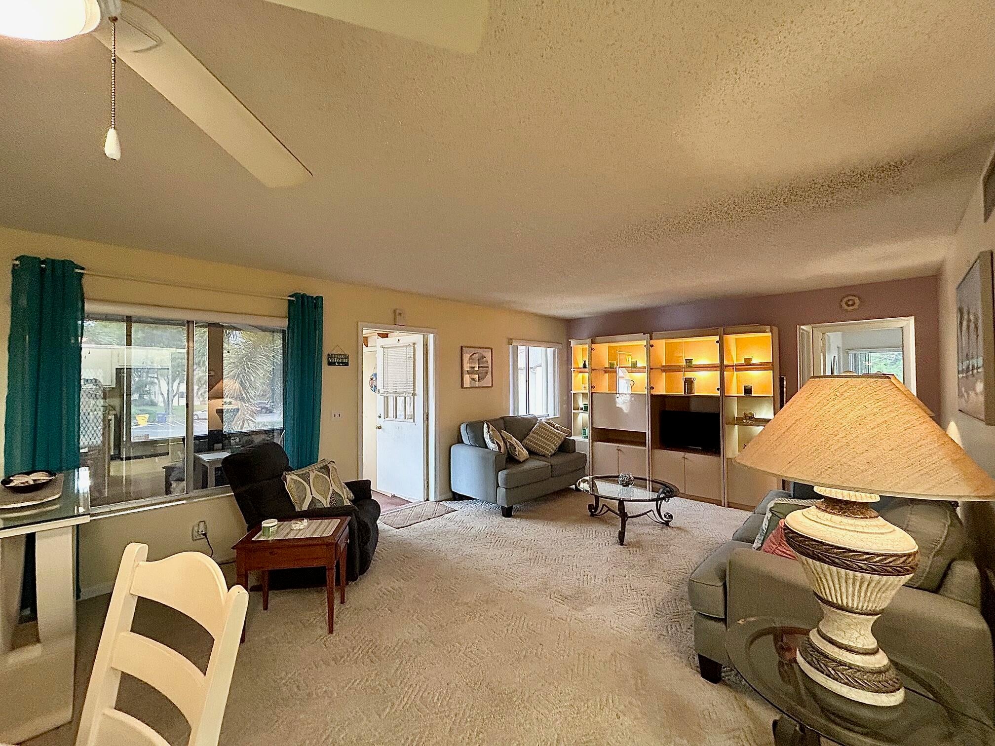 Property is move in ready! Enclosed front porch with full glass view to enjoy the Florida sunshine and storage closet. Accordion Hurricane/Impact shutters on all the windows. 2 bedroom 2 full bath 2nd floor corner condo provides lots of light. Master bedroom suite features ensuite bathroom with walk in shower. Both bedrooms have walk in closets. Full Pantry/utility room for storage and washer and dryer. Can come fully furnished with everything including dishes and linens or empty. Walking distance to the clubhouse and amenities. Community offers heated swimming pool, walking paths around the lakes, clubhouse, shuffleboard, planned activities, parties and more. Come join the fun!!! Close to shopping, medical, I95 and BEACHES.