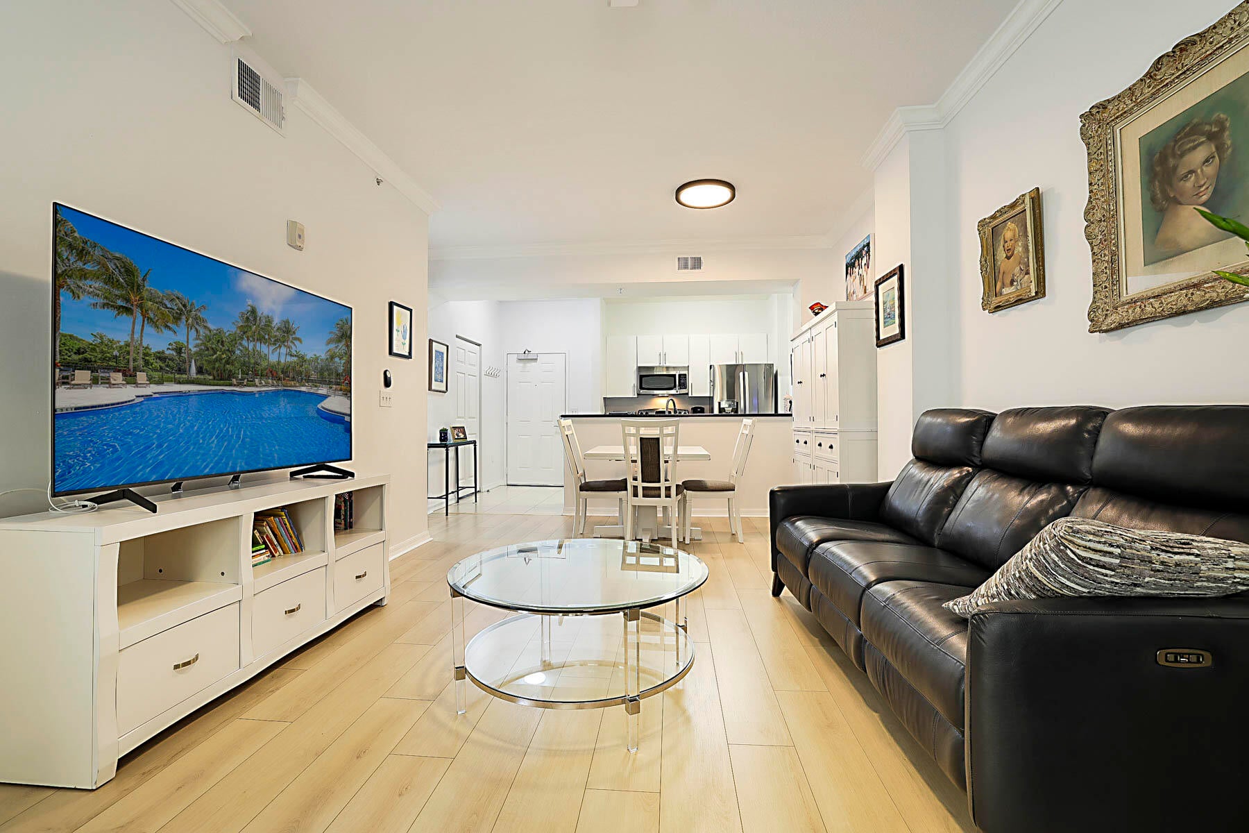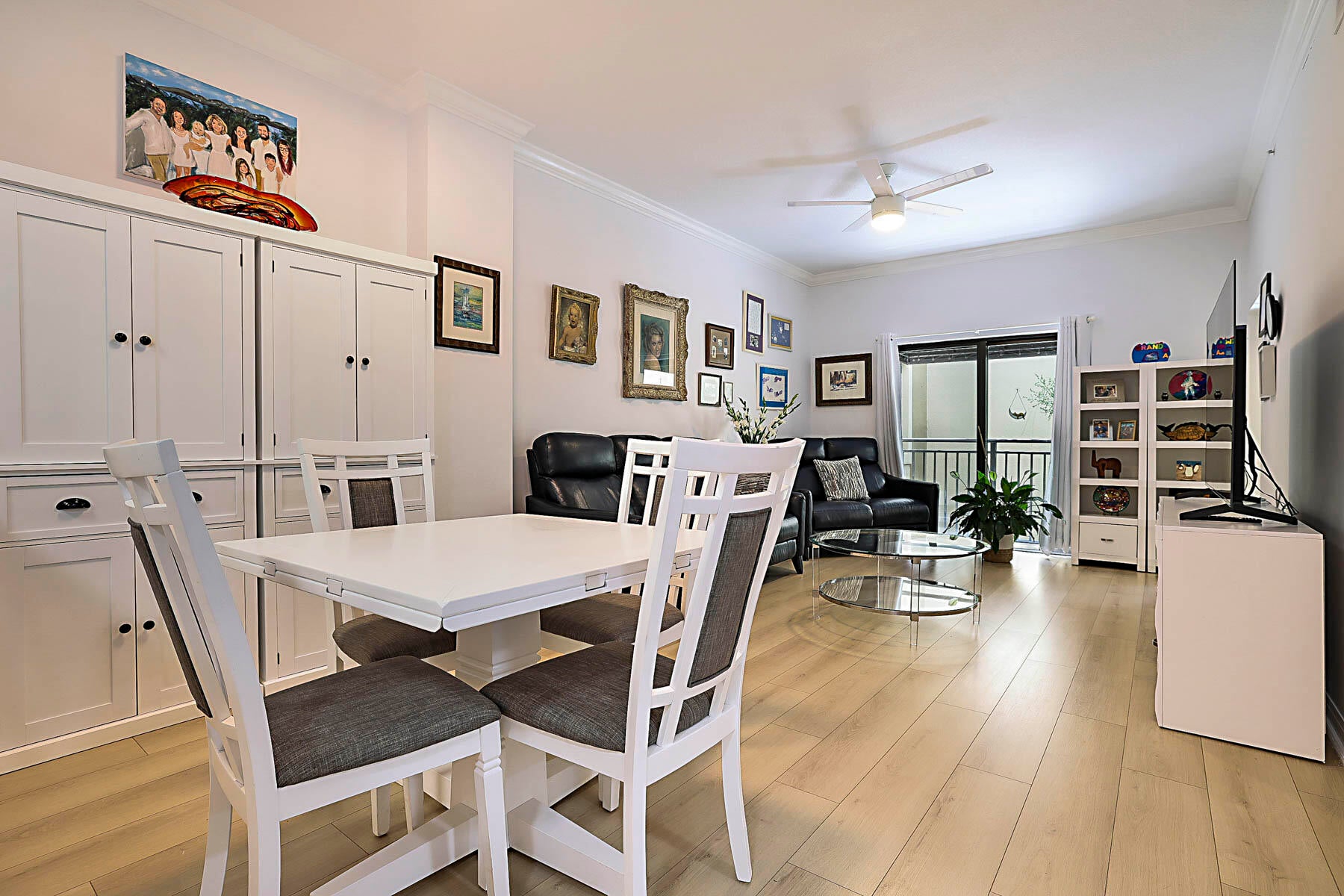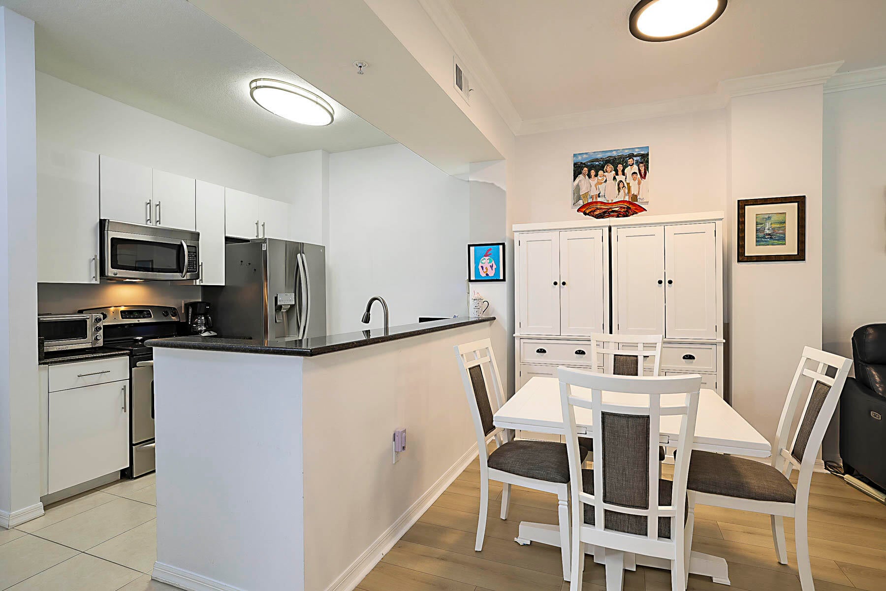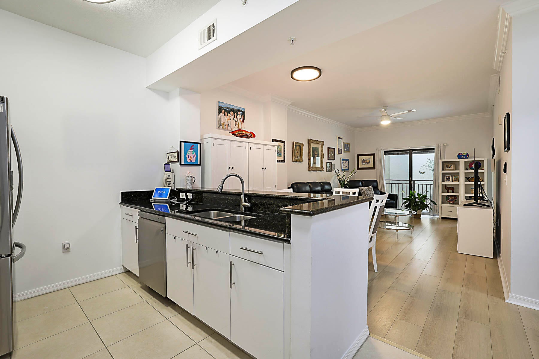 UPDATED AND 100% MOVE-IN READY WITH 1 CAR GARAGE!!! This 2 bedroom, 2 bath condo is Meticulous with the beautiful white kitchen cabinets, stainless appliances, and granite countertops. The kitchen is wide open to the living room with a snack bar, dining area, crown moldings, all tile and gorgeous blonde laminate flooring throughout, NO CARPET! The master suite offers a spacious bedroom & bathroom with dual vanity sink, walk-in shower, separate tub, linen closet, walk in closet, and gorgeous views of the courtyard. The guest bedroom has a private door out to the balcony, perfect for a quiet morning coffee. This unit also comes with a 1 CAR GARAGE! AC 2022, kitchen update 2023, HWH 2023, Fridge and Dishwasher 2021, Impact windows, .....laundry room has great amount of shelving for storage. Community offers a full gym, library, community room, resort style pool, hot tub, tennis, and pickle ball. Walk out to shops and a multitude of restaurants. This is a prime location.