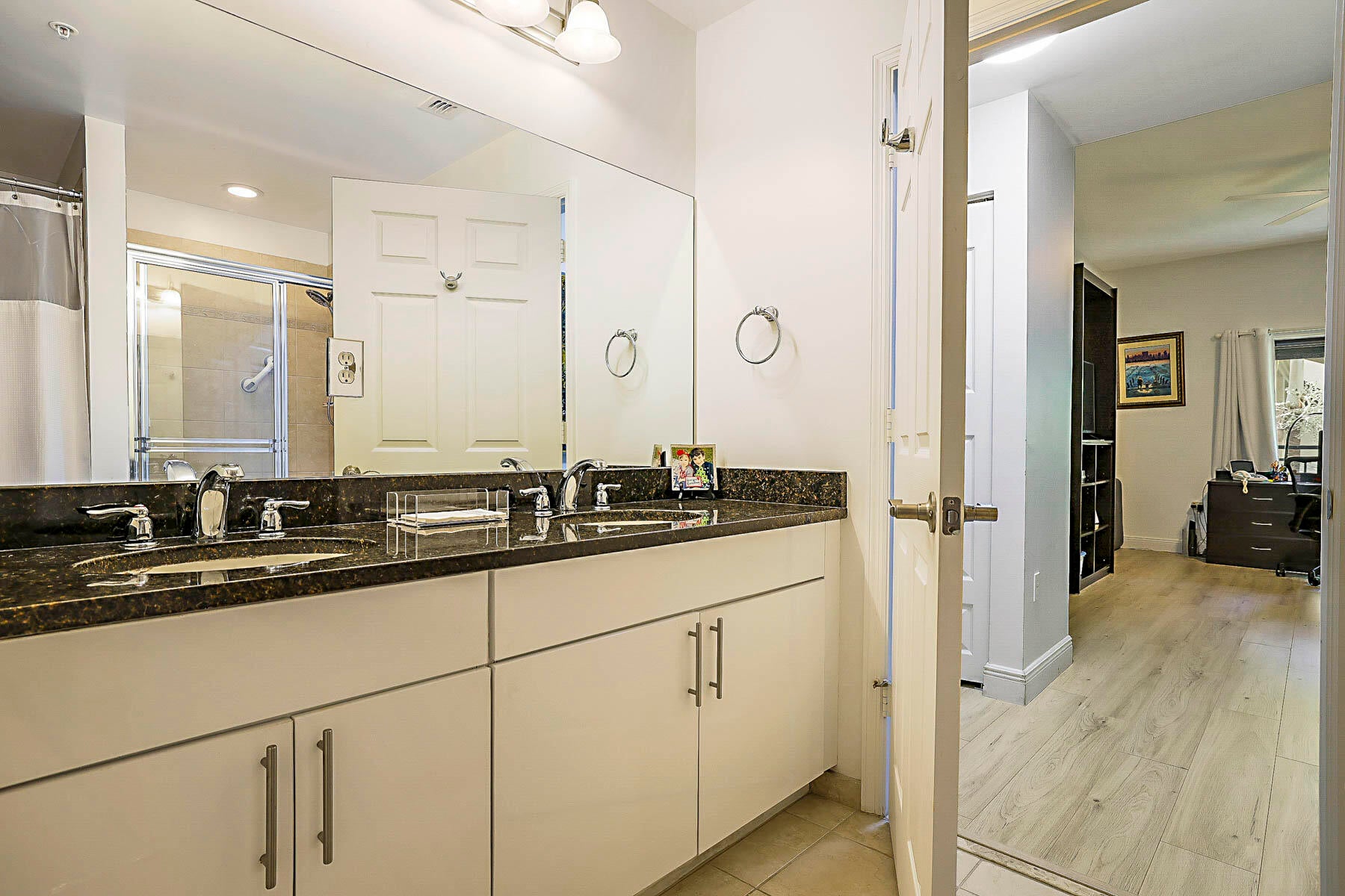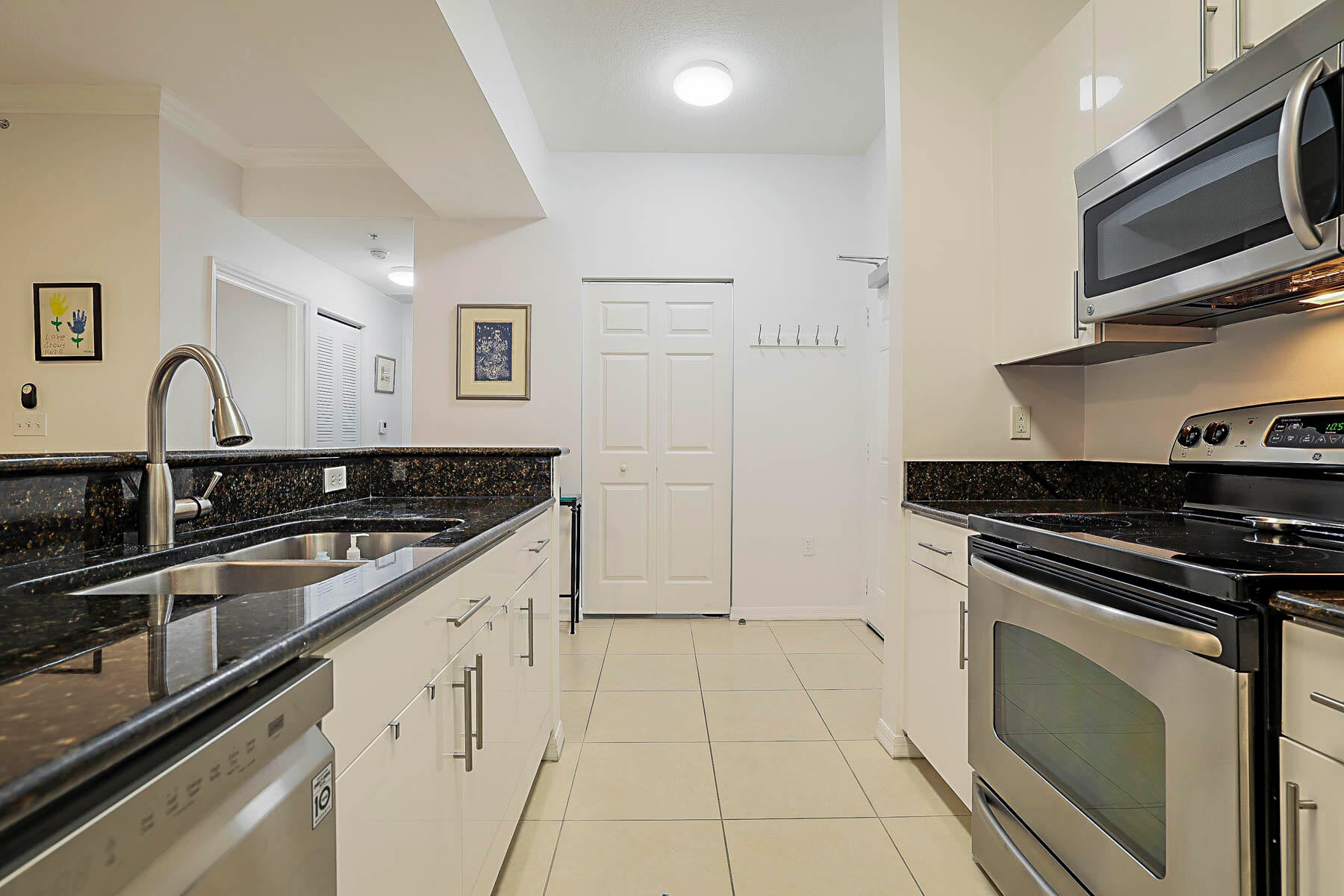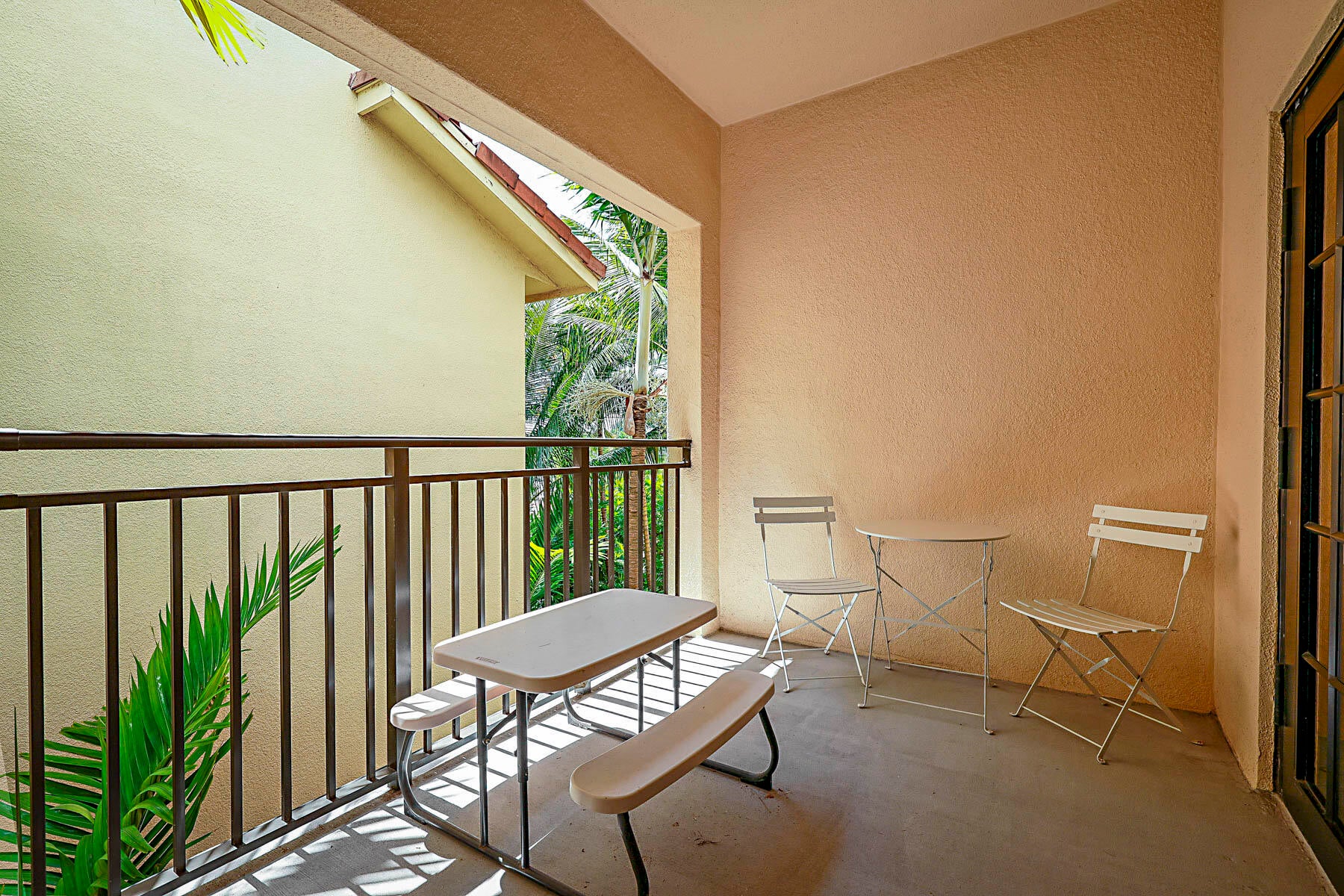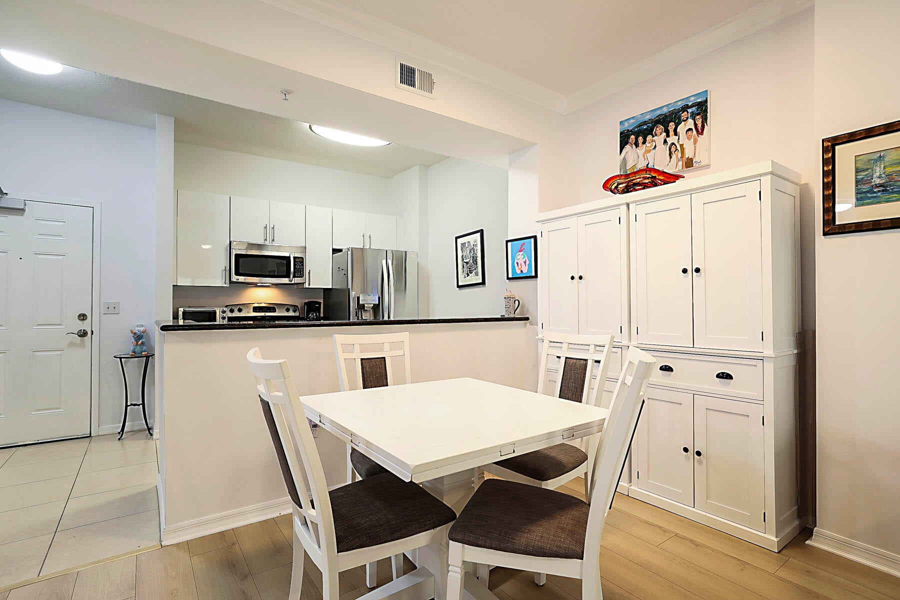 UPDATED AND 100% MOVE-IN READY WITH 1 CAR GARAGE!!! This 2 bedroom, 2 bath condo is Meticulous with the beautiful white kitchen cabinets, stainless appliances, and granite countertops. The kitchen is wide open to the living room with a snack bar, dining area, crown moldings, all tile and gorgeous blonde laminate flooring throughout, NO CARPET! The master suite offers a spacious bedroom & bathroom with dual vanity sink, walk-in shower, separate tub, linen closet, walk in closet, and gorgeous views of the courtyard. The guest bedroom has a private door out to the balcony, perfect for a quiet morning coffee. This unit also comes with a 1 CAR GARAGE! AC 2022, kitchen update 2023, HWH 2023, Fridge and Dishwasher 2021, Impact windows, .....laundry room has great amount of shelving for storage. Community offers a full gym, library, community room, resort style pool, hot tub, tennis, and pickle ball. Walk out to shops and a multitude of restaurants. This is a prime location.
