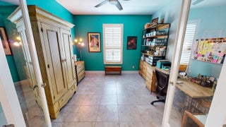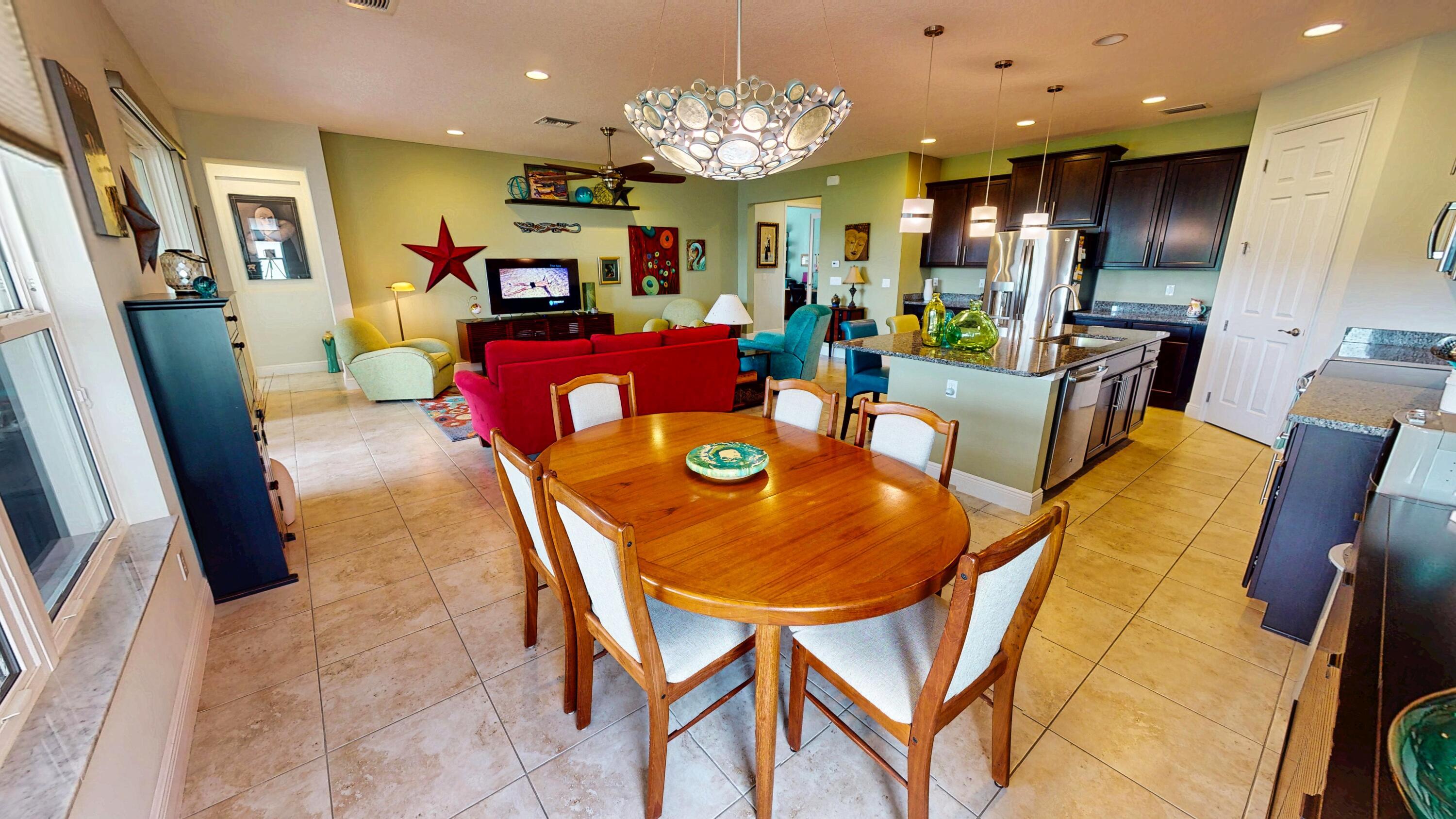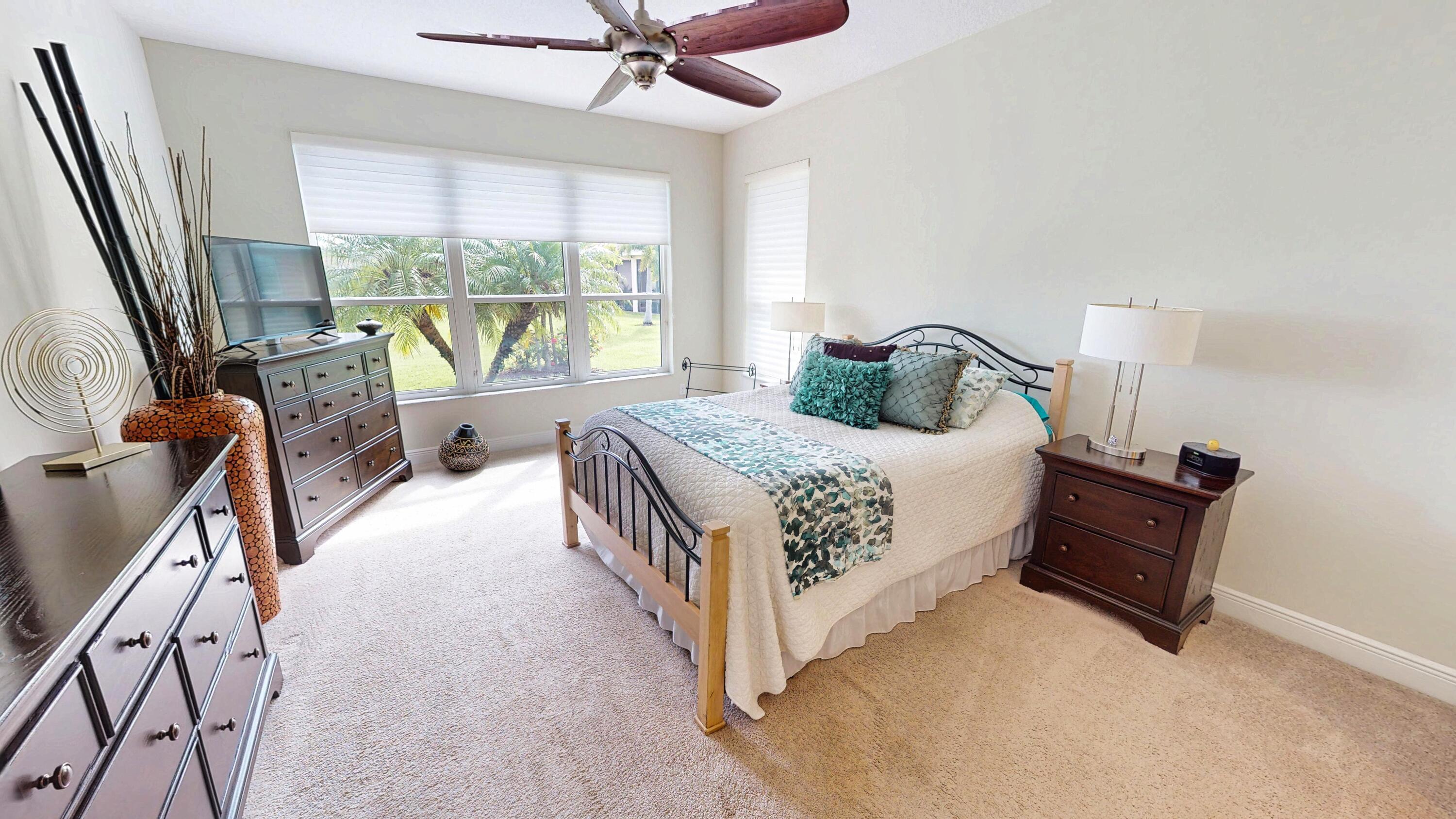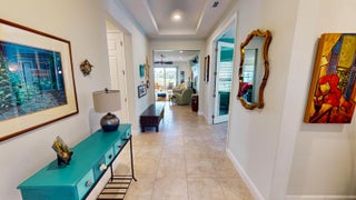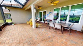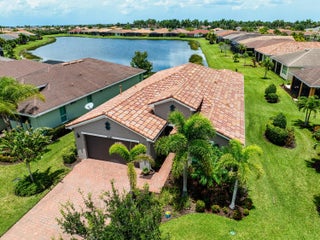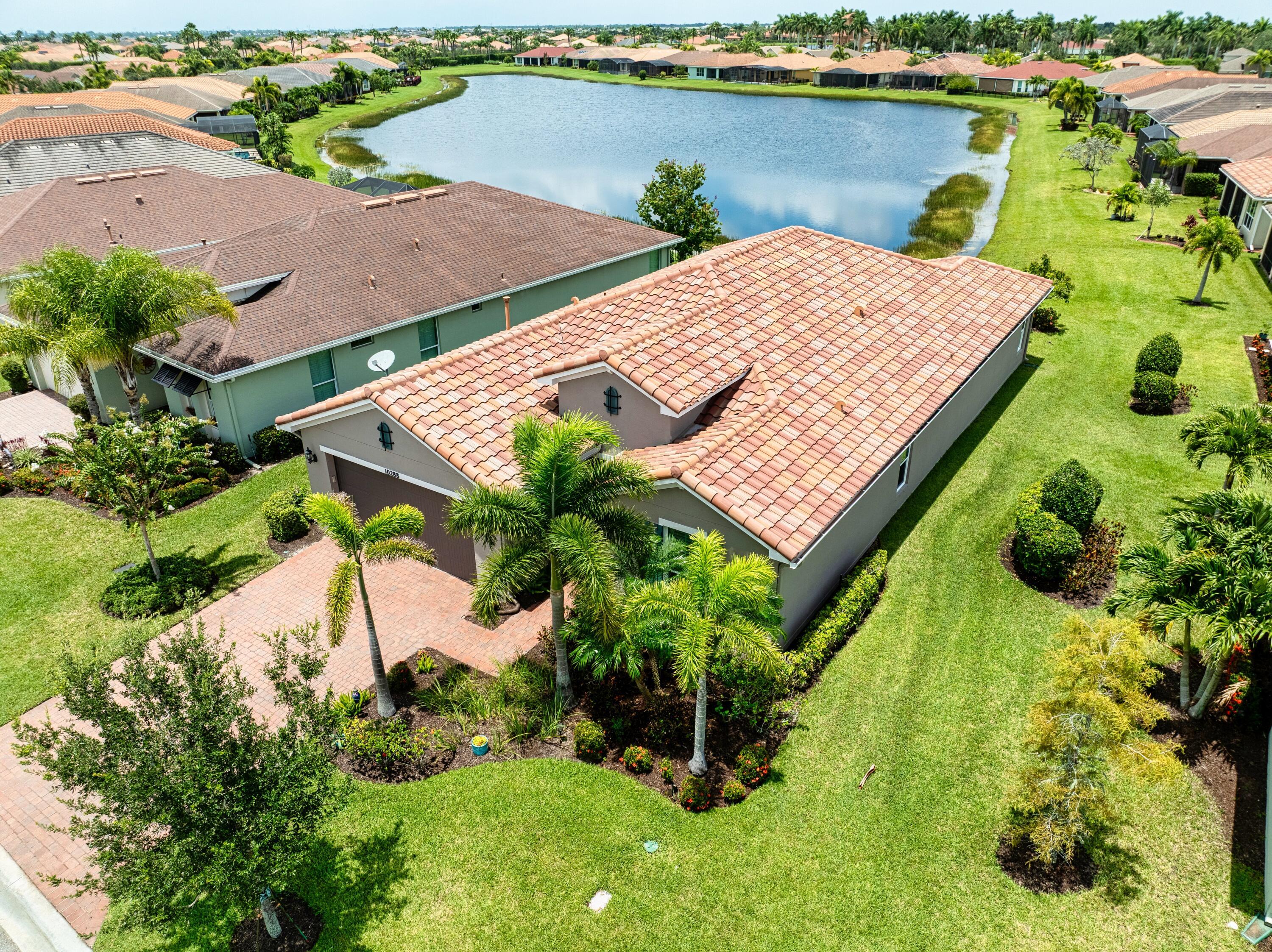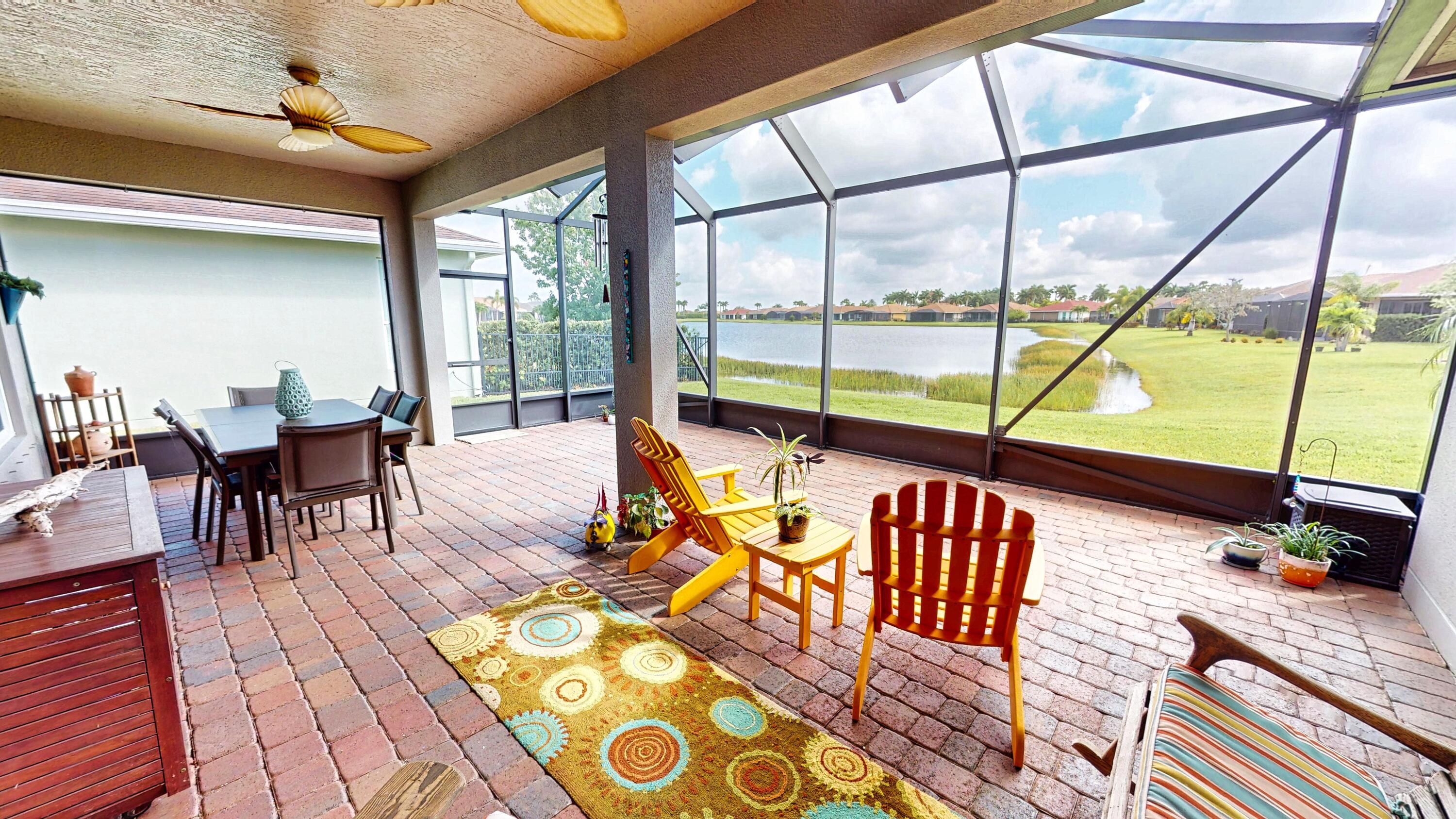 This beautifully maintained 2 bedroom, 2 bathroom home with a versatile den offers over 2,000 square feet of comfortable living space and thoughtful upgrades throughout. Built for efficiency and durability, the home features aftermarket impact windows (installed in 2018), core fill block insulation, blown attic insulation, and custom Hunter Douglas window treatments paired with elegant plantation shutters. The spacious open floor plan includes a bright family room that flows seamlessly into the dining area and a gourmet kitchen complete with 42-inch cabinets, granite countertops, and a direct view of the living space--perfect for entertaining. Step outside to an oversized covered, extended lanai with ''tiny mesh'' extra tight screening that showcases a stunning lake view,ideal for relaxing or hosting guests. The master suite is a true retreat with a large walk-in closet, dual sinks, and a walk-in shower. The guest bedroom features built-in closets, while the versatile den offers flexibility as a home office or additional guest space. A 4-foot garage extension includes wall mounted shelving designed for heavy weight capacity. The upgraded epoxy-coated flooring in the garage completes this impressive home. This corner lake view offers a wonderful opportunity for bird watching.