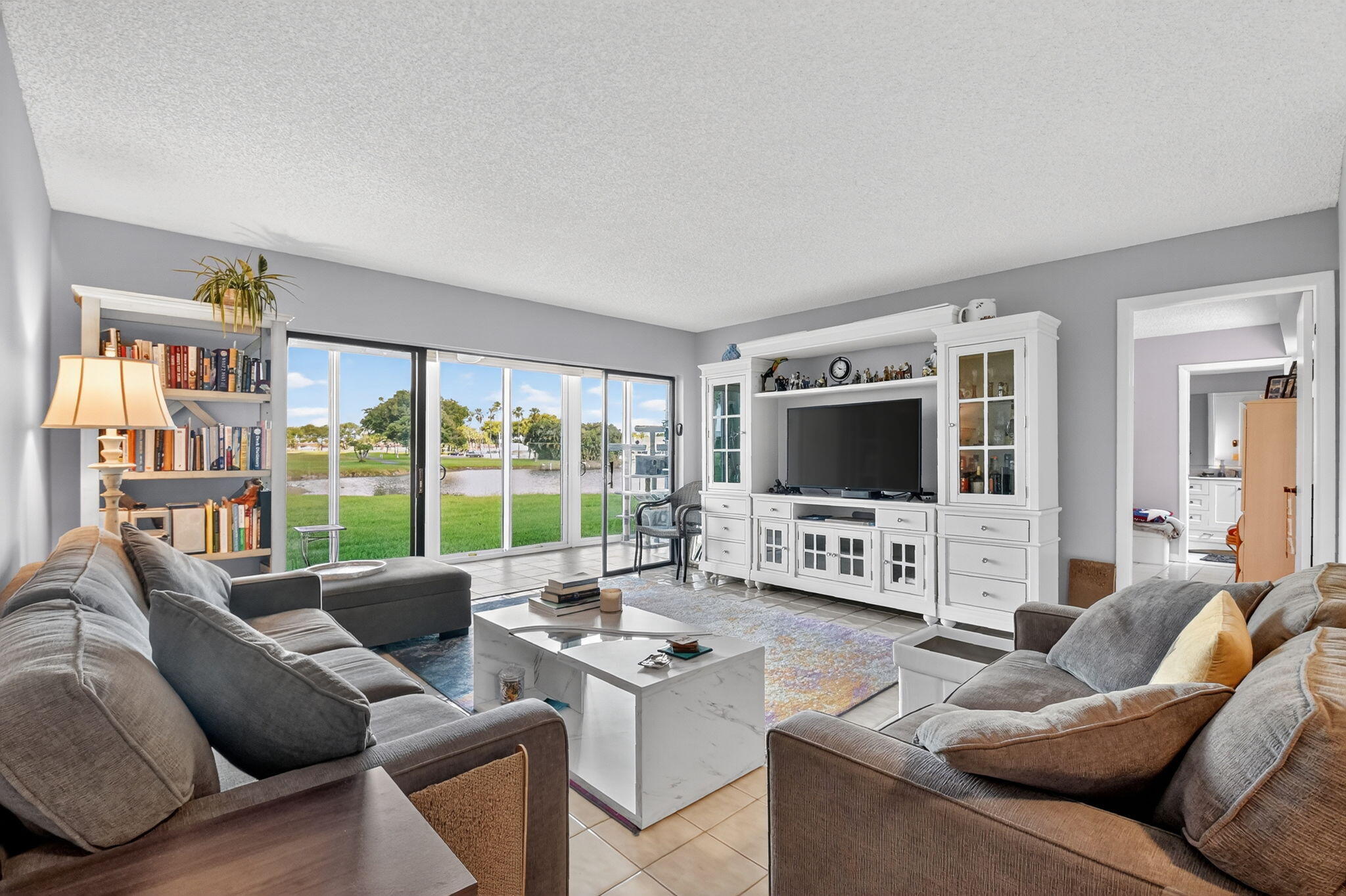 Lake and golf view from your livingroom and patio! LOCATION! LOCATION! LOCATION! - KITCHEN RECESSED LIGHTING AND STAINLESS STEEL APPLIANCES INSTALLED NOVEMBER 2025! This is Kings Point's largest model! Floor to ceiling impact glass sliding doors! Kings Point luxury model - our largest in the community! Building is concrete block construction and very well maintained. First floor, tile floors throughout, impeccably maintained.HW installed 2020 or 2021, AC is 2017. Kings Point offers activities year round! clubs, movies, seasonal live shows, 2 restuarants, free community transportation and more! 2 golf courses, 3 clubhouses, and multiple pools. This 55+ community has it all
