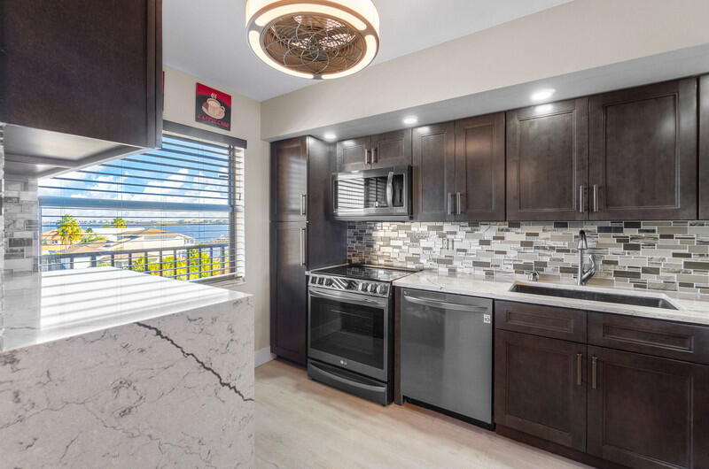:Motivated seller. Beautifully remodeled 2/2 condo with a top floor location in this quiet, gated, waterfront community by the intracoastal. Enjoy the water views in front and back from your private balcony. This home has remodeled kitchen and baths, all hurricane impact windows, a new washer and dryer, A/C 2024, custom closets with built-ins, a storage unit and more. An added bonus is the Loggerhead Marina right next door, great for boating enthusiasts. Leasing is OK without wait. See it today!