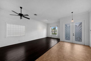 Welcome to this beautifully maintained home in a gated community just off 441--where convenience meets comfort! Step into a spacious living and dining area that flows seamlessly into the kitchen, featuring white cabinetry, a double farmhouse sink, and a custom range hood. The adjacent family room offers a cozy gathering space, accented by ceiling fans throughout the home for year-round comfort.The home includes a dedicated laundry room and a 2-car garage, plus a newer washer and dryer for added convenience. The guest bathroom is absolutely gorgeous, boasting a tub/shower combo with stylish finishes.The primary suite is a true retreat, offering tray ceilings, dual walk-in closets, a soaking tub, and a separate shower.Outdoors, relax or entertain in your private backyardoasis complete with a sparkling pool, hot tub, new pool heater, and a covered lanai with a cooling fan and a nesting 3-panel sliding glass door. The property also features a canal view, a newer roof, and a whole-house generator for peace of mind. Natural gas is available, too! Enjoy being just minutes from Southern Blvd and all the shopping and dining you could needless than 5 minutes away!