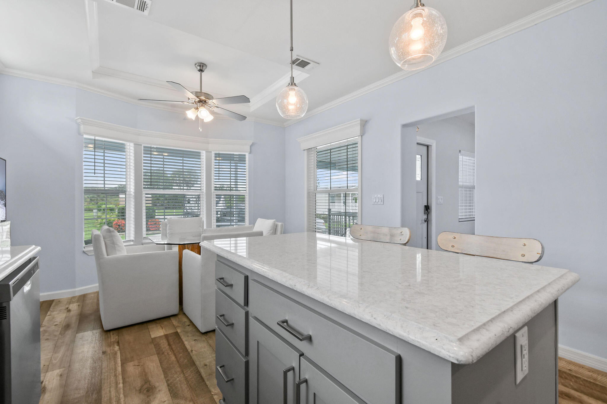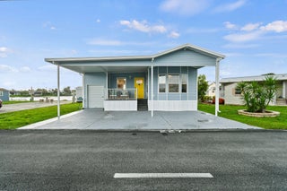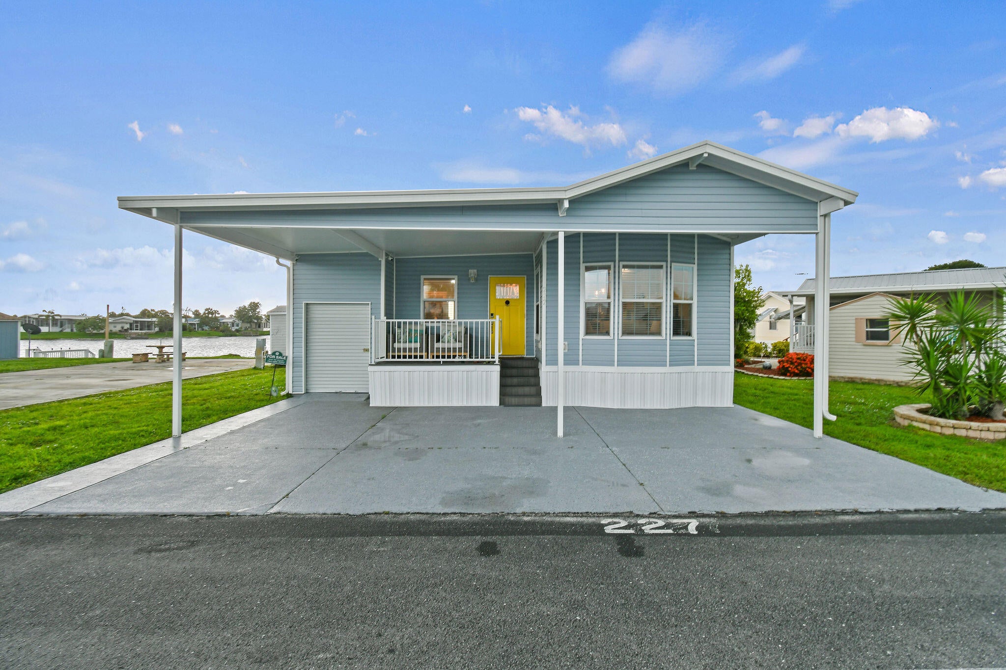 Discover resort-style living on the scenic shores of Lake Okeechobee at Blue Cypress Golf & RV Resort! Nestled on the lake's northeast side, this 55+ community features 248 residences including both homes and RV lots. It's designed for active enjoyment with a 9-hole golf course, vibrant clubhouse, sparkling pool (heated in the winter and cooled in the summer). pickleball & shuffleboard - and multiple serene lakes ideal for fishing.Park your boat at the community marina (free) and certain size boats can navigate out to Lake Okeechobee...where largemouth bass and speckled perch are a favorite to catch! This fully furnished Skyline Palm Bay Park model home, built in 2022, offers 3000+ sq ft of total space, including 1,100 sq ft of living area. Step inside to find a well-appointed kitchen with SS appliances, granite countertops, and a center island-plus a brand-new Brio water machine. The spacious living room, overlooking a peaceful lake leads onto a 13' x 12' screened patio, complete with a hot tub and impact-resistant double doors. Inside, the floor plan includes 2 bedrooms and 1.5 bathrooms. The primary suite features a luxurious king-size Temper-Pedic adjustable mattress (an $8,000 investment) and ample built-in storage. Water softener installed in 2024 has a 10-year warranty. The entire home is freshly painted, has vinyl flooring, crown molding and comes with its own washer & Dryer! An attached garage offers convenient storage space for golf cart or bikes. At Blue Cypress, you can embrace an energetic, activity-filled lifestyle or simply relax by the lake - the choice is yours!