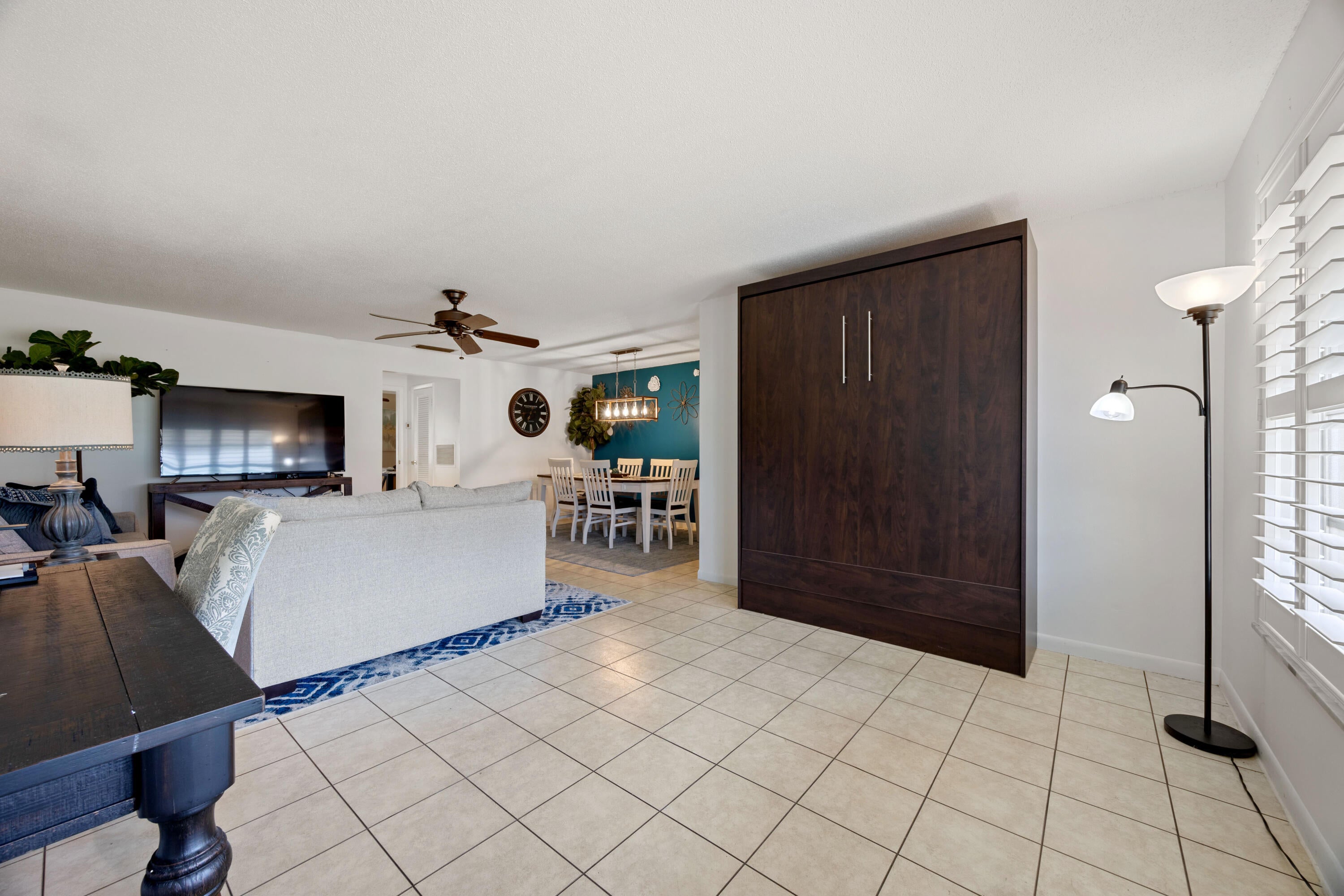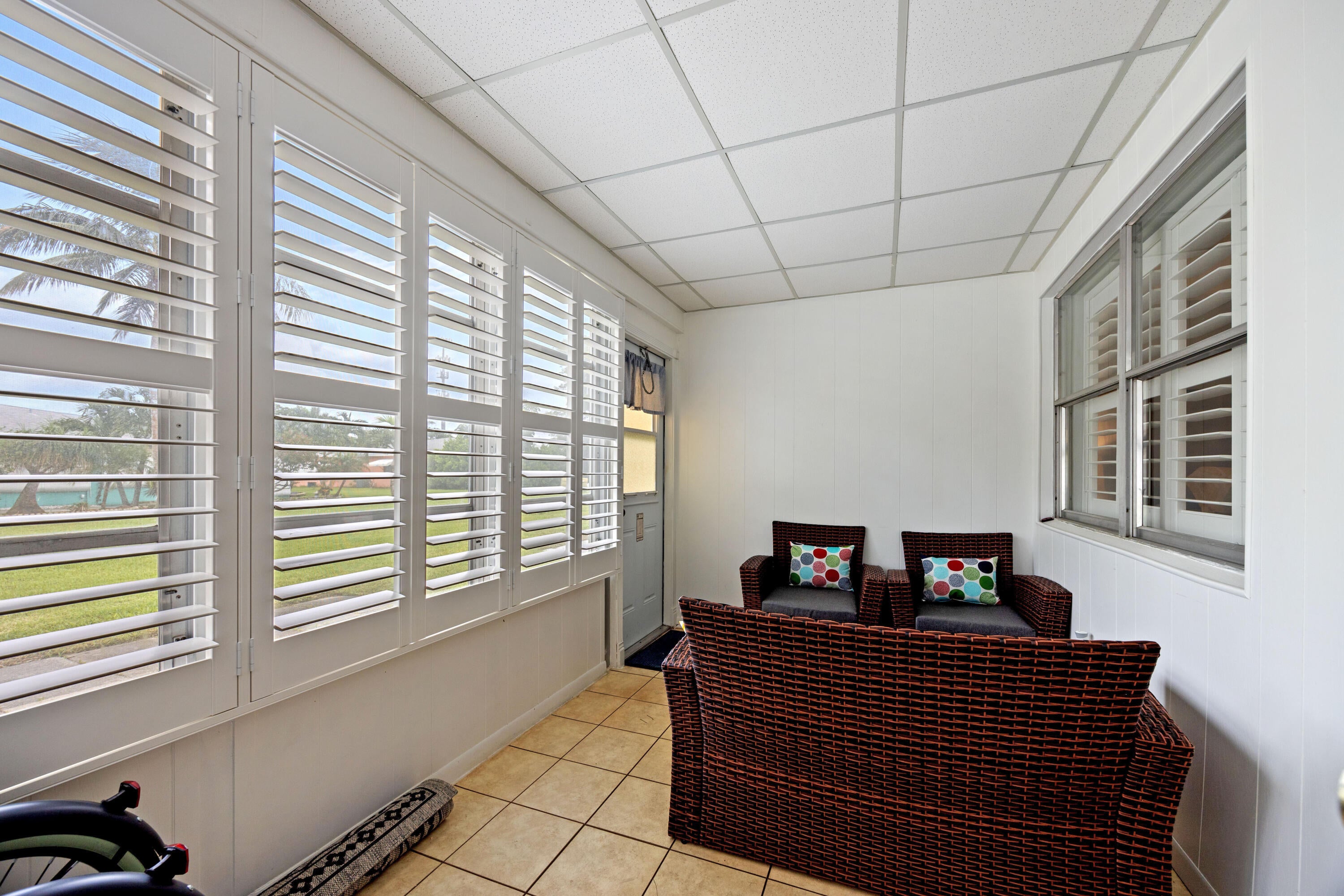 Neat & Clean villa style condo being offered furnished turnkey w/exclusions. Tile flooring throughout, large open living & dining area. Built in murphy bed perfect for guest. All windows offer plantation shutters. Primary bedroom w/ 2 walk in closets & ensuite w/ vanity area & combo tub/shower. Unit offers an additional Florida room great for an at home office. Galley style kitchen w/glass tile backsplash. Large open green space with patio & accordion shutters for rear windows. Updated Square D Electrical Panel. High Point Section 3 is centrally located in Boynton Beach minutes from the beach, fabulous restaurants & so much more!