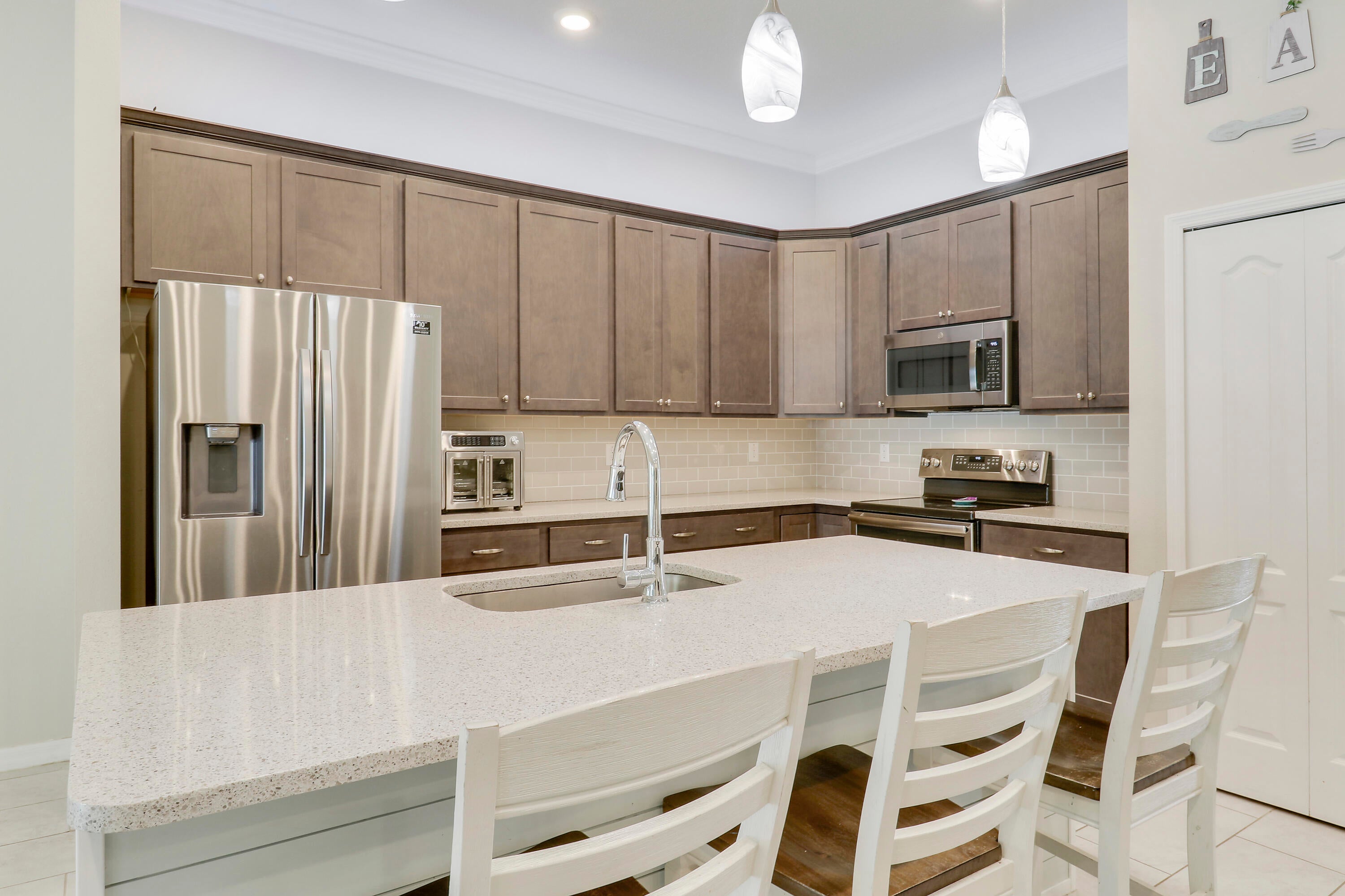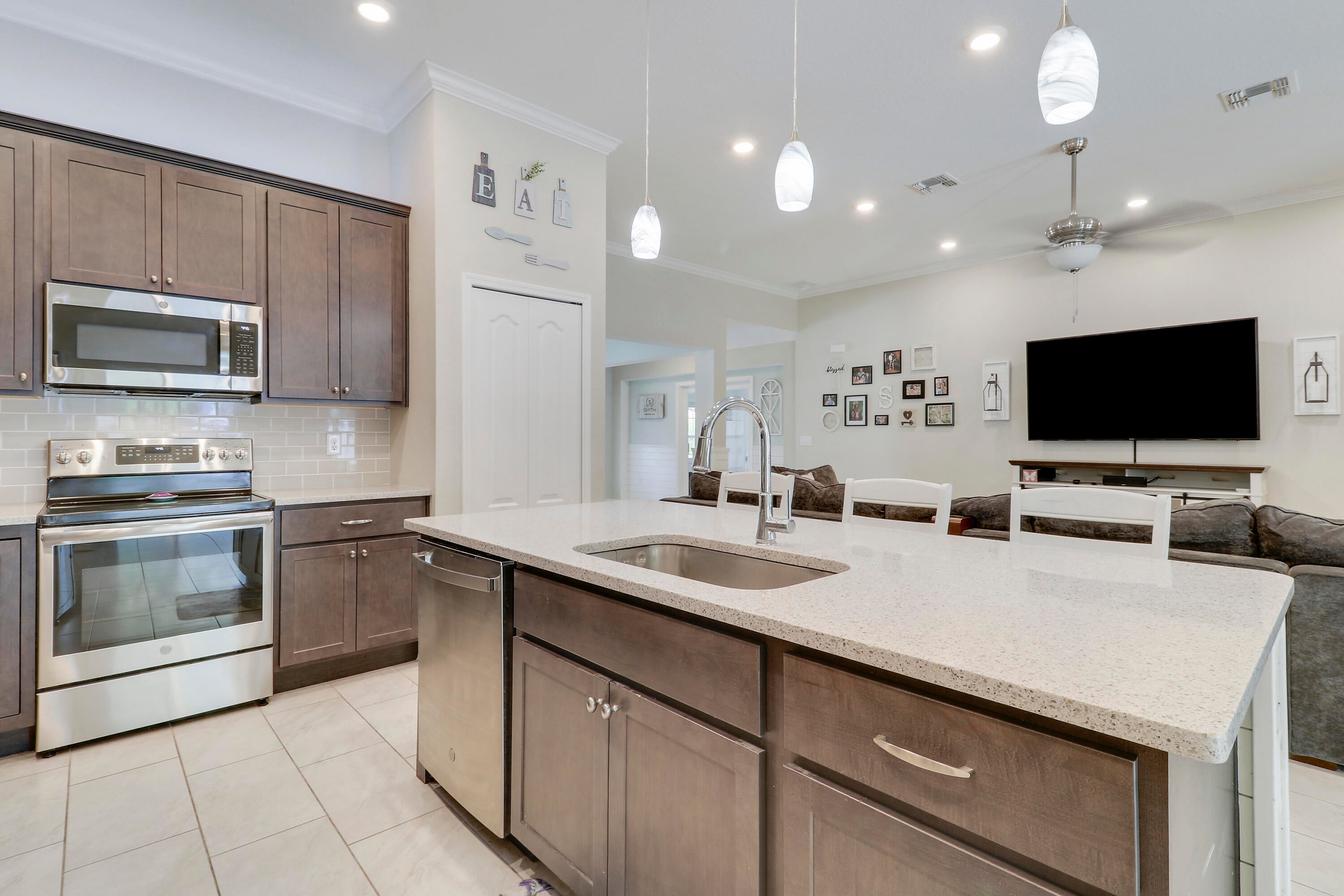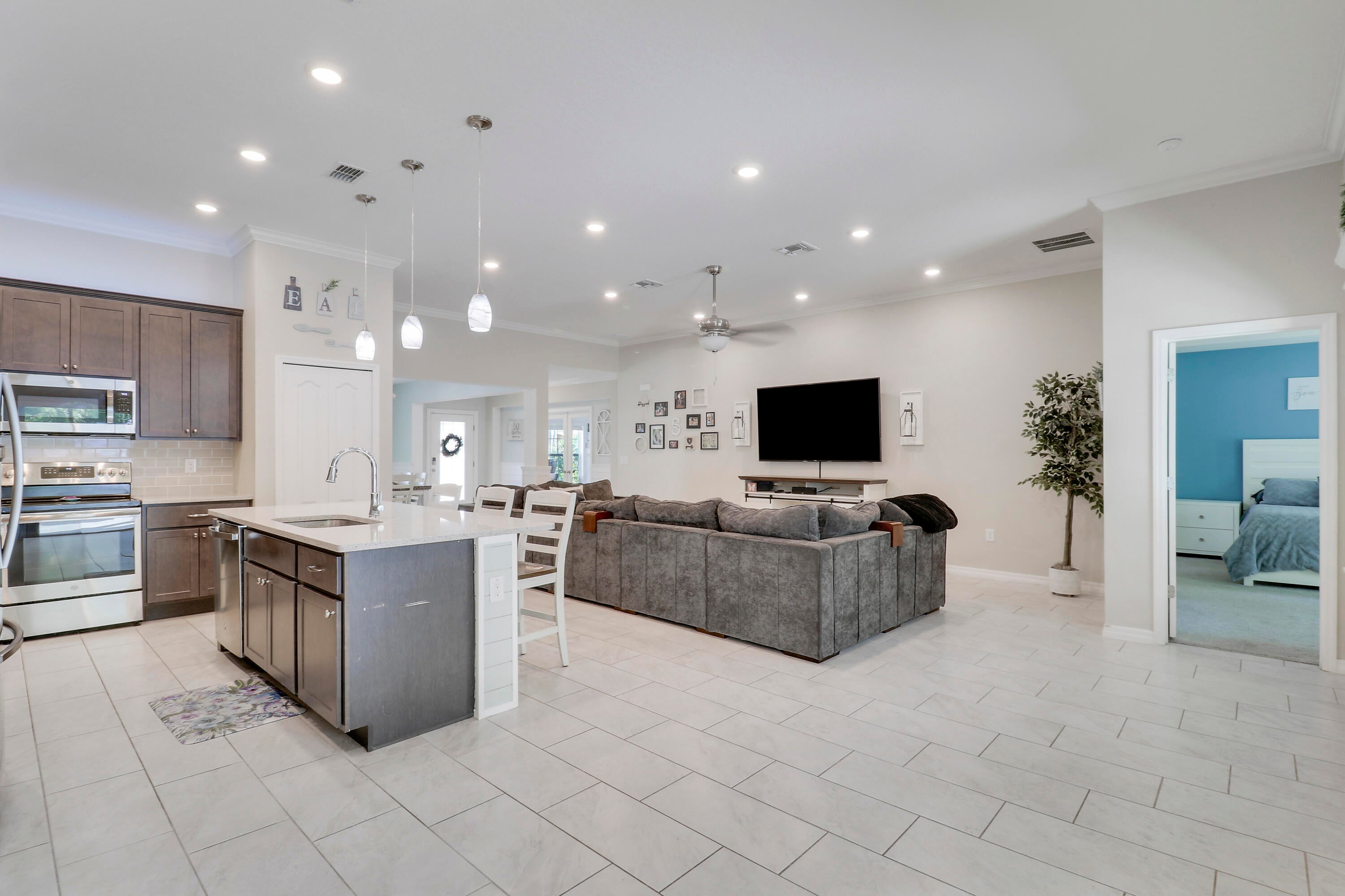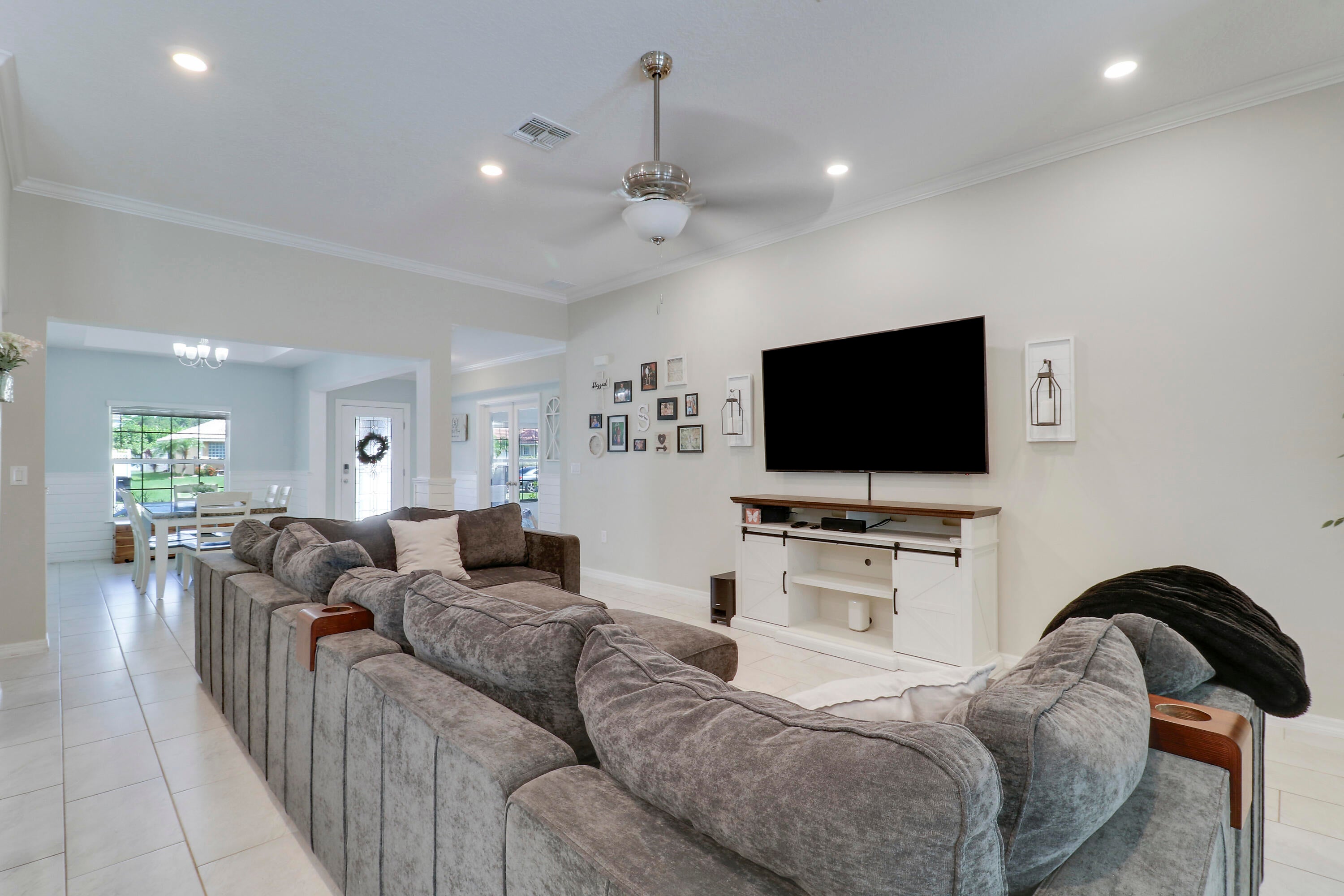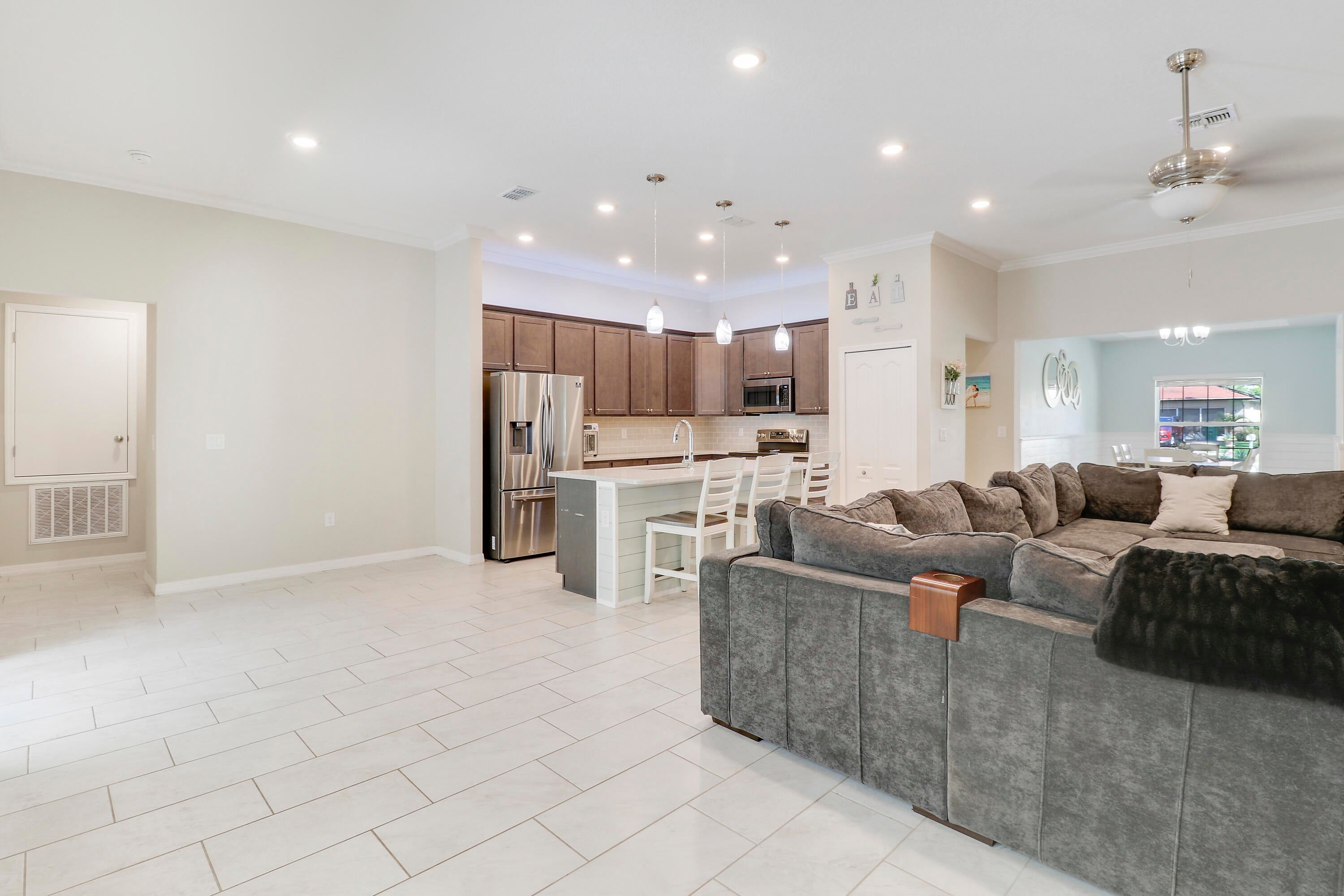 Welcome to this stunning 2020-built home offering the perfect blend of style, space, and functionality. Featuring 4 spacious bedrooms plus a versatile den, this home is designed to fit every lifestyle. Home is equipped with state of the art solar panels for low energy bills.Enjoy Florida living at its best with a beautiful sun deck and sparkling pool, all within a fully fenced backyard--ideal for entertaining or relaxing in privacy. Inside, you'll love the custom touches like shiplap detailing in the foyer and dining room, adding warmth and coastal charm. The open-concept layout flows seamlessly with high ceilings, abundant natural light, and modern finishes throughout. Stunning gourmet kitchen with quartz and expansive living space makes it perfect for gatherings.Additional highlights include 3-car garage with durable epoxy-coated floors. Private Guest Suite for visitors or multigenerational living. Located in a desirable, well-maintained neighborhood with no HOA. Move-in ready and built to impress don't miss this incredible opportunity!