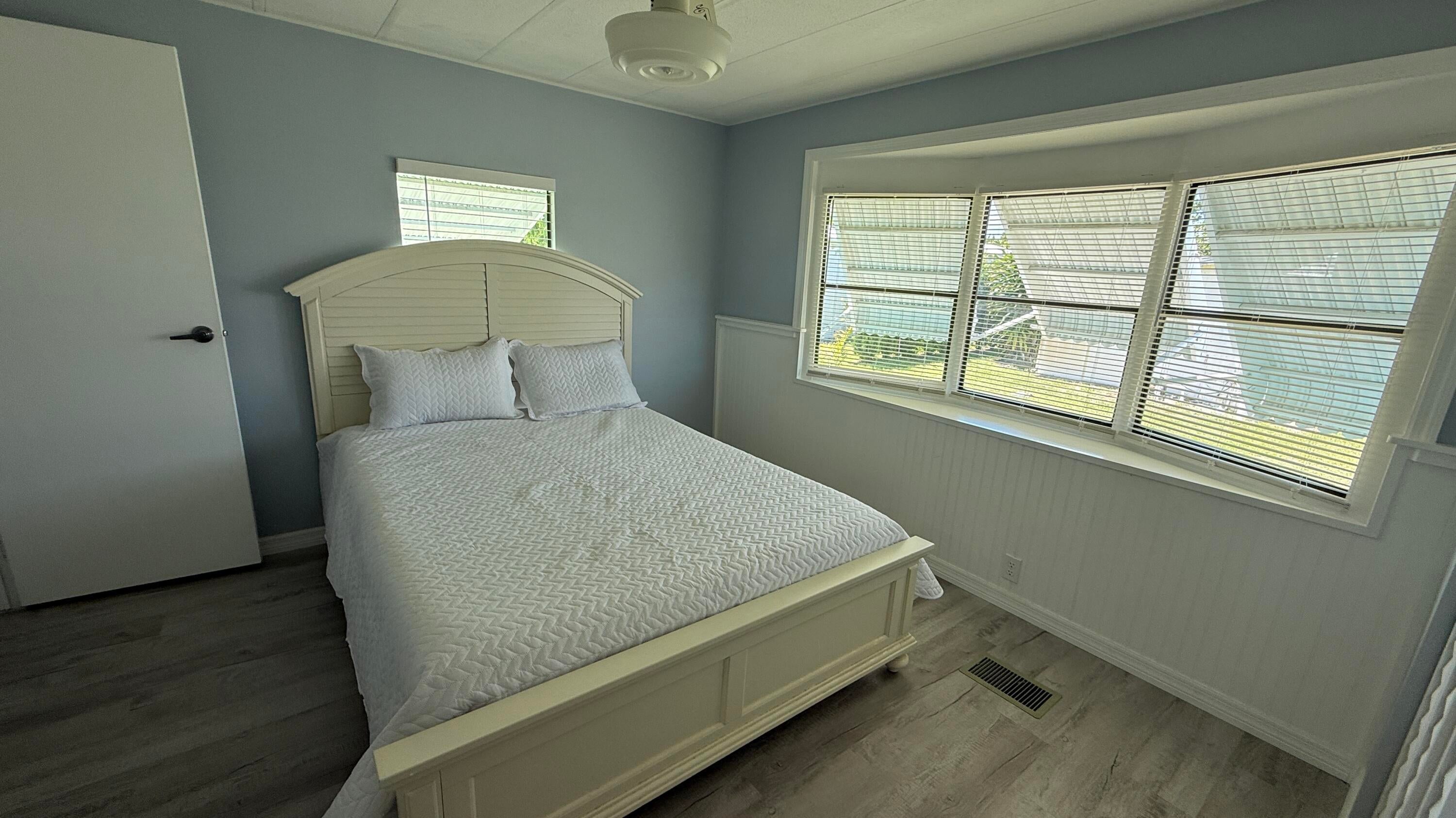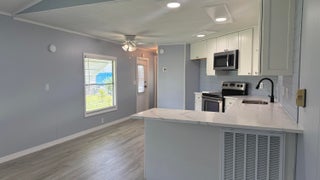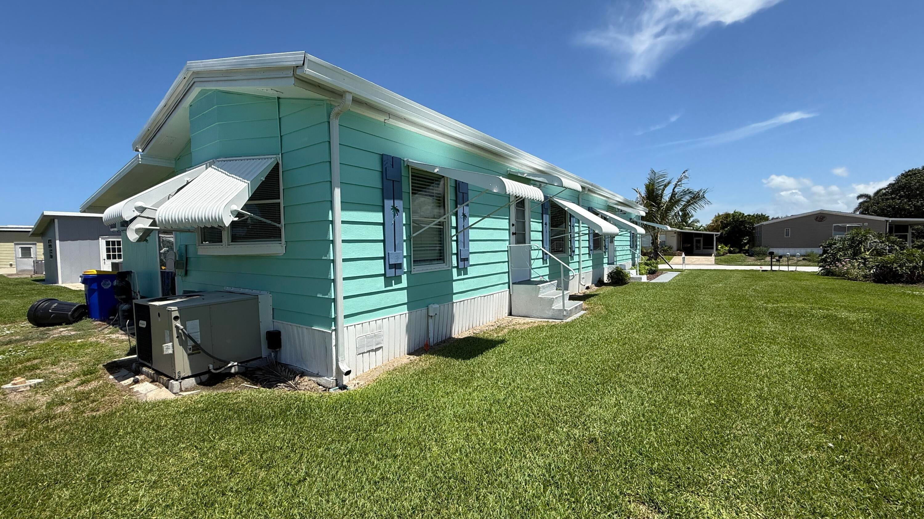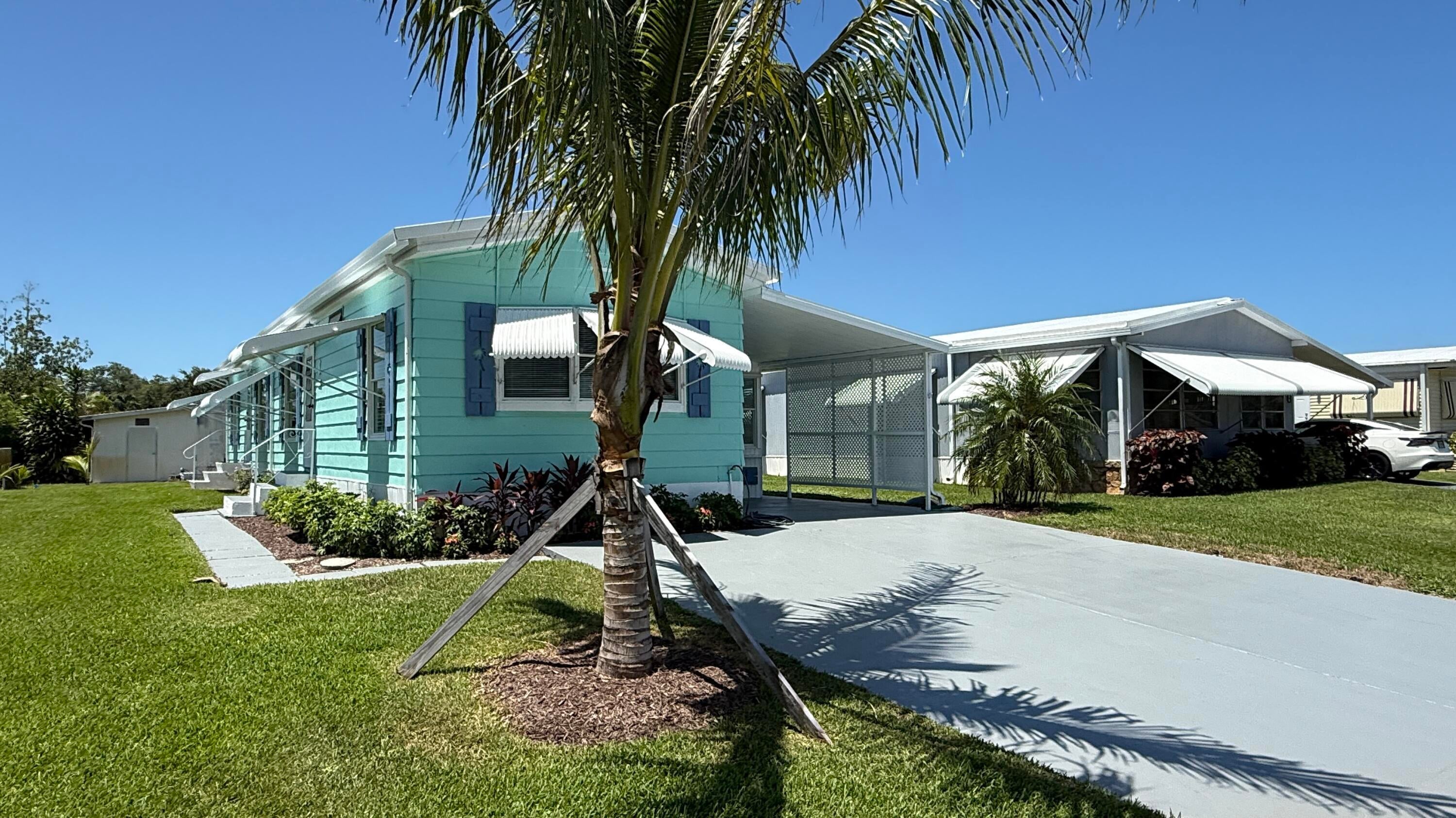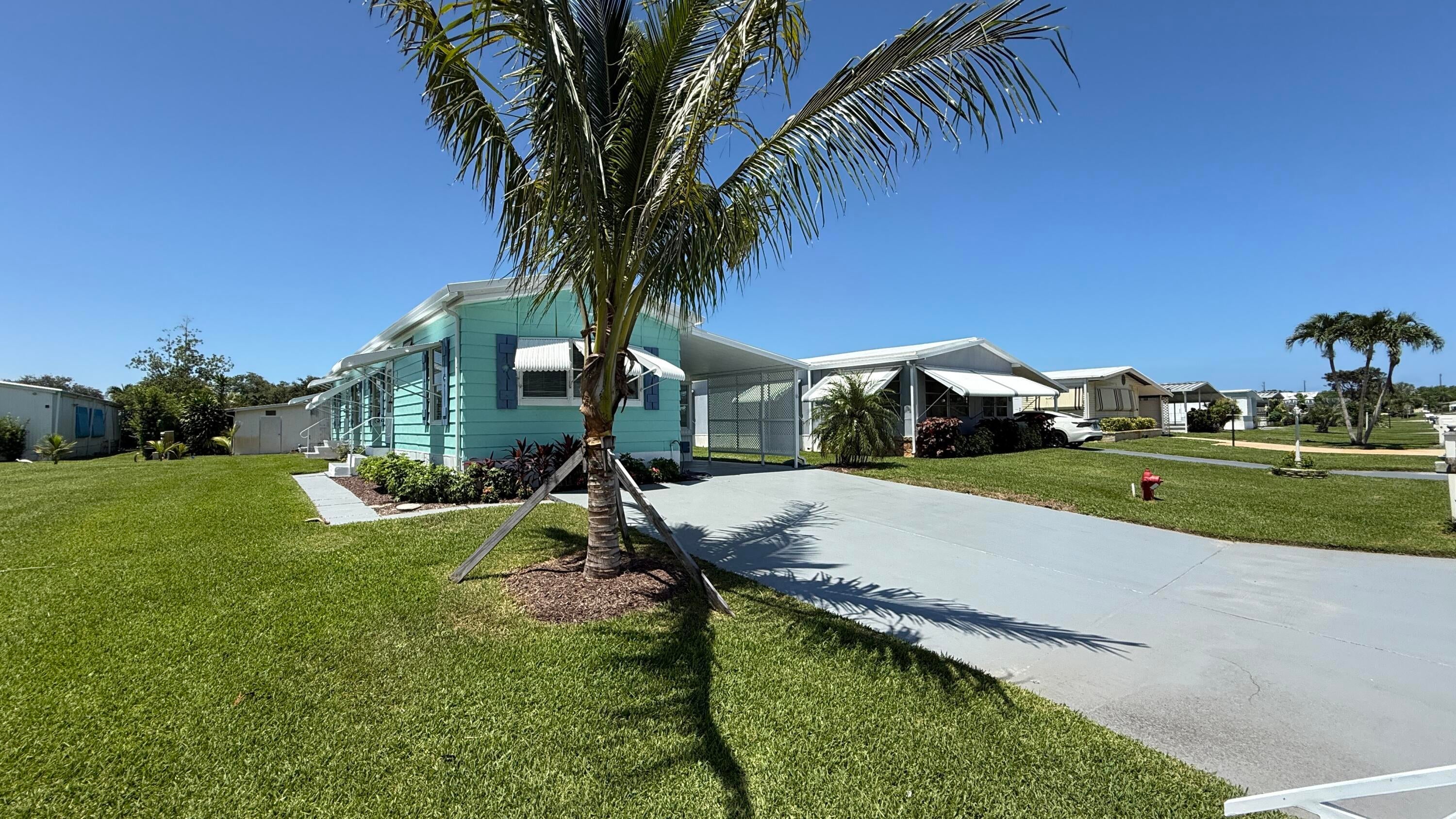 EXTREME MAKEOVER!!! Gorgeous 2 Bedrm/2 Bath Manuf home in Cambridge 55+ community in Hobe Sound. BRING YOUR BOAT/RV. All new vinyl plank flooring thruout over 3/4 inch Ply-wood subfloors. 2X4 16'' on center construction w custom tie downs. New Aluminum roof-over 2012. Electric zoned, well fed, sprinkler system, 2021 A/C. New Shaker Style bright white OPEN kitchen w quartz counters, LED lighting & stainless range, microwave & dishwasher. SPLIT Bedroom Plan. Both Bedrms have ensuite baths. You enter the home into a FL room w custom staircase to Great Room. The 10X32 Bonus/Rec room is on the same level w a pegboard wall, washer/dryer, slop sink & beer frig. Great Curb Appeal!! Cambridge is mins to Ocean Beaches, ICW Boat Ramp & shopping.. YOW OWN THE LAND - ALL PETS WELCOME. Low HOA.