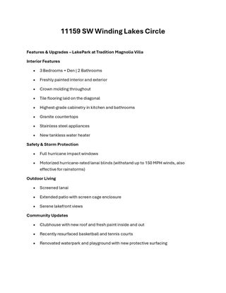 Welcome to LakePark at Tradition. This 3-bedroom villa with a den and 2 bathrooms has been thoughtfully maintained and recently updated. Freshly painted exterior! Inside you'll find crown molding and tile flooring set on the diagonal, which give the home a bright, cohesive, and elevated feel. The kitchen and bathrooms are finished with the highest-grade cabinetry available, granite countertops, and stainless steel appliances, combining durability with style. A new tankless water heater adds efficiency, while hurricane impact windows throughout the home provide year-round peace of mind. The lanai is equipped with motorized hurricane-rated blinds, built to withstand winds up to 150 MPH and equally practical for heavy rainstorms.The floor plan offers a comfortable flow between living, dining, and kitchen spaces, while the den creates flexibility for a home office, reading space, or hobby room. Outdoors, a screened lanai and extended patio within a screen enclosure offer multiple areas to enjoy the lakefront settingperfect for morning coffee, evening dinners, or quiet relaxation. LakePark at Tradition continues to invest in its amenities. The clubhouse has a new roof and has been freshly painted inside and out. Both the basketball and tennis courts were resurfaced, and the waterpark and playground have been upgraded with new protective surfacingenhancing the community spaces for all ages. The LakePark HOA Fee Includes: cable TV, high-speed internet, alarm monitoring, landline phone lawn care, security, and resort-style amenities. Just minutes from Tradition's shopping, dining, and recreational offerings, as well as the Cleveland Clinic, this villa provides the ultimate in luxury living!