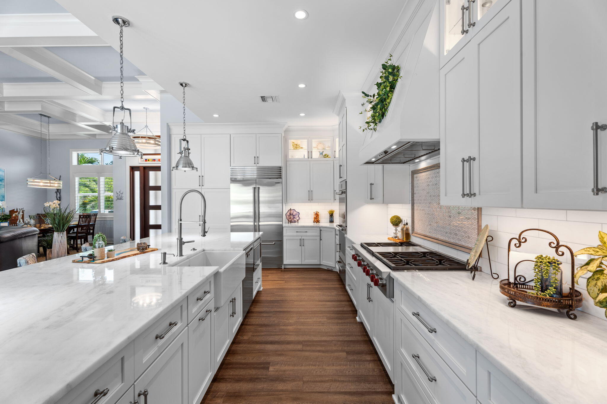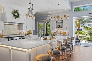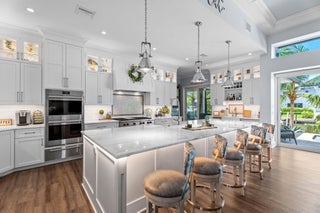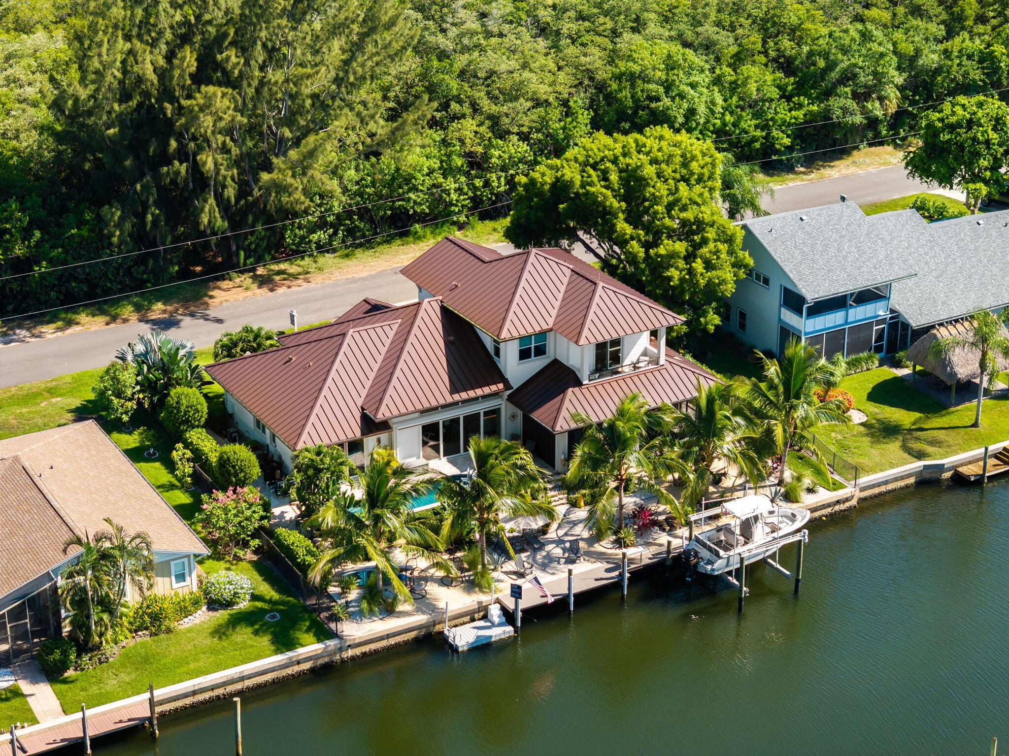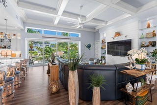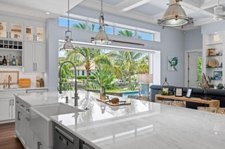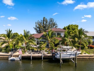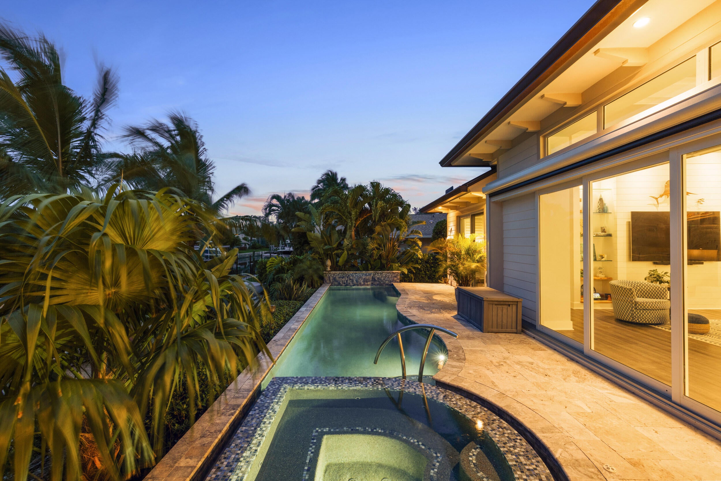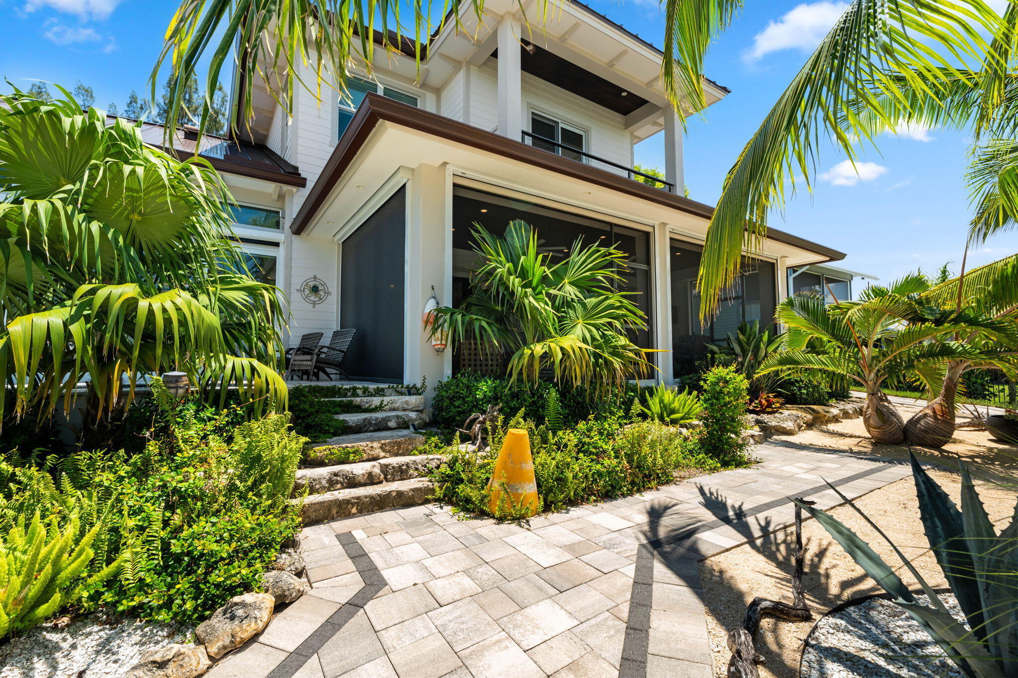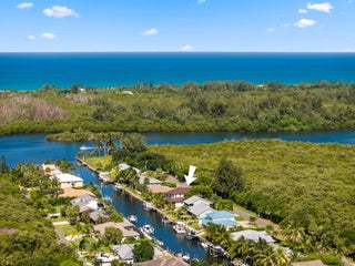 Stunning 2022 custom-built waterfront estate with 100' of frontage in Hobe Sound, just minutes from Jupiter Island. Designed by Kelly & Kelly and built on 45 concrete pilings, this Miami-Dade hurricane-compliant home offers PGT impact windows, lightning protection, roll-down lanai shutters, and a full-house Generac generator tied to a 1,000-gal propane tank. Interior finishes include a custom mahogany front door, rosewood kitchen cabinetry, Dolomite counters in the kitchen and laundry, California faucets, Shaw porcelain farm sink, and distressed hickory vanities with quartzite tops. Solid wood interior doors, African mahogany staircase with tile risers, cypress-lined outdoor ceilings, A/C garage, and A/C storage. Custom Almar Jackson pool/spa and Lynx outdoor kitchen. City water/sewer.