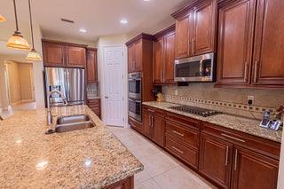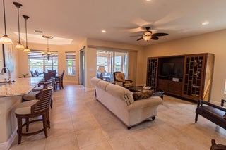 Live like a VIP in Vitalia! This show-stopping 2/2/2 + den home stuns with wide lake views and top-tier upgrades. Tray ceilings, French doors, custom shades, and tile floors bring the glam. The chef's kitchen wows with granite, 42'' wood cabinets with pullouts, double oven, cooktop, and sleek stainless appliances. Open layout, front-load washer/dryer, and high-impact glass throughout for style and peace of mind. Step out to your huge covered, screened lanai and soak in the view. Vitalia delivers with resort-style amenities--sparkling pool, pickleball, fitness center, endless clubs, and more. Gated, active 55+ community and absolutely fabulous!