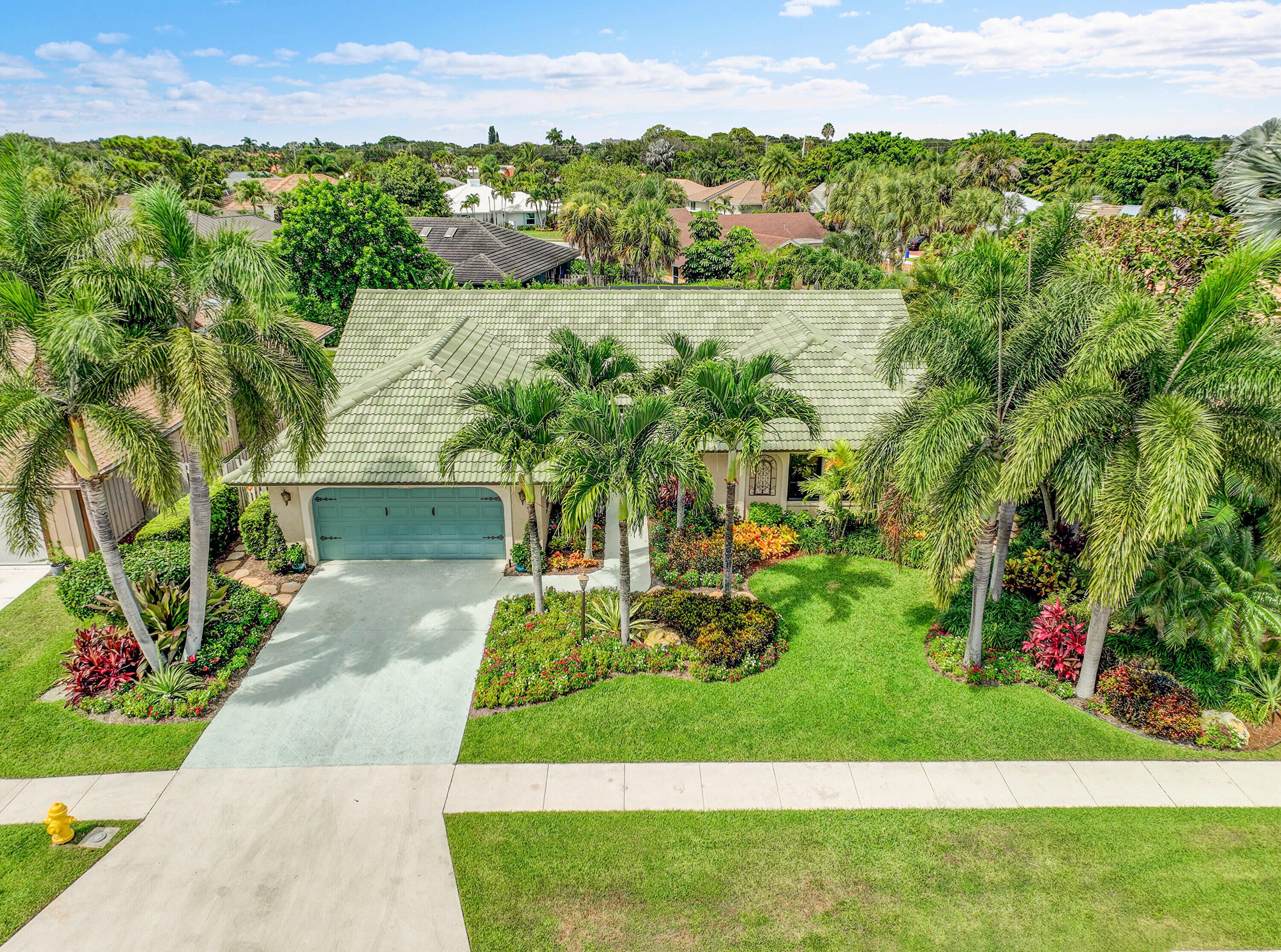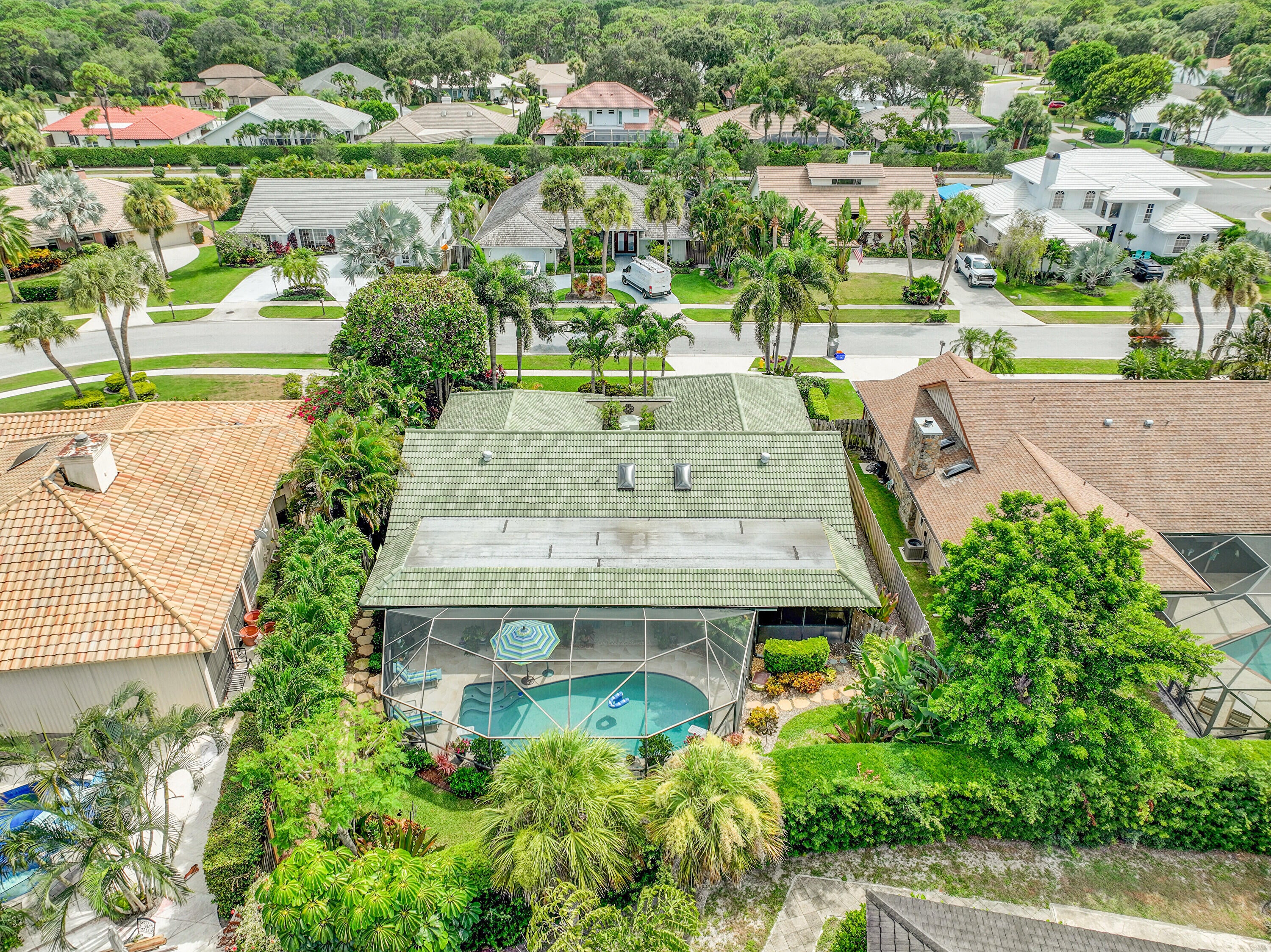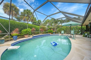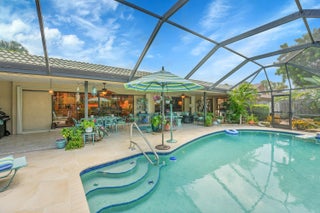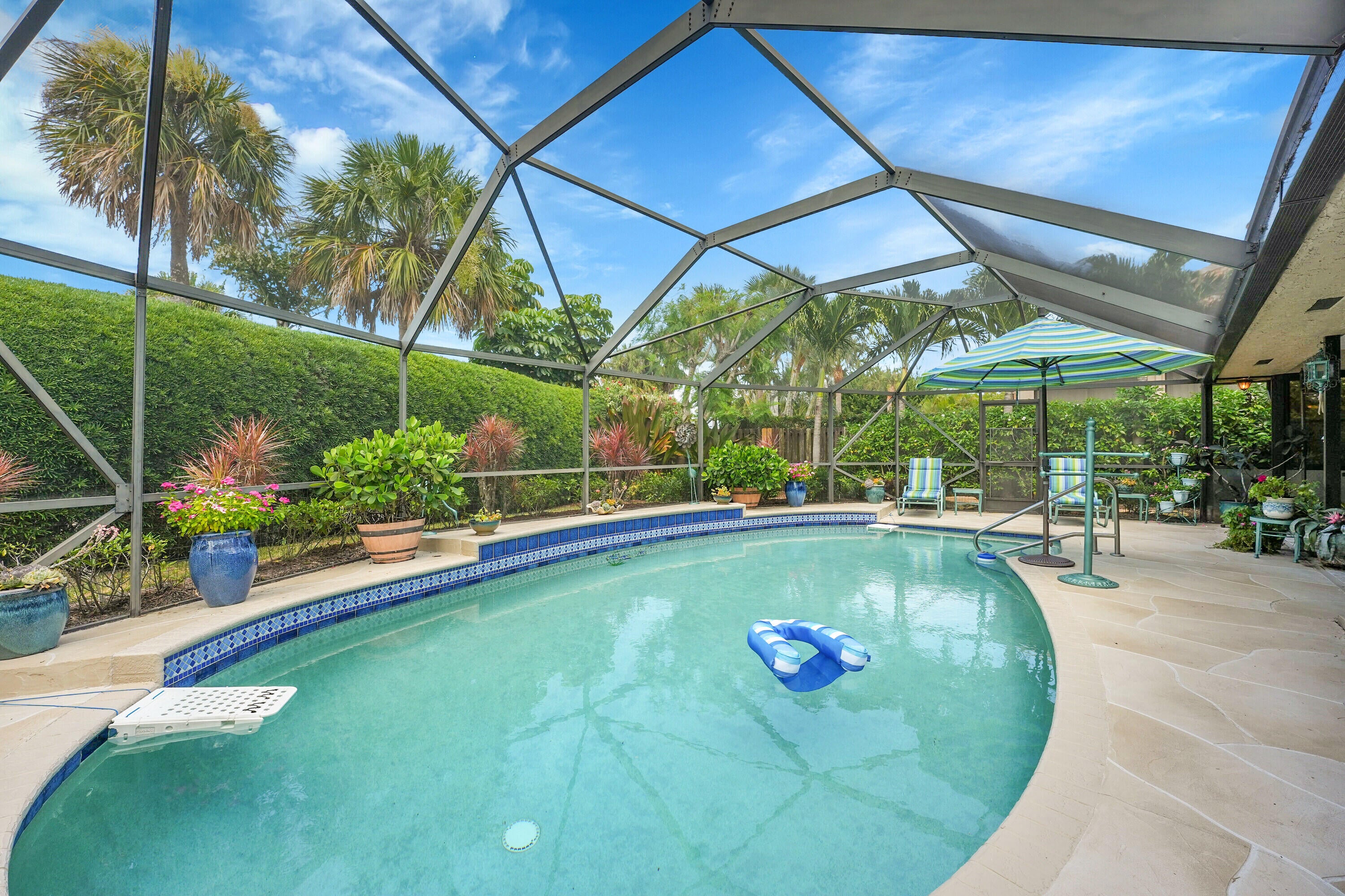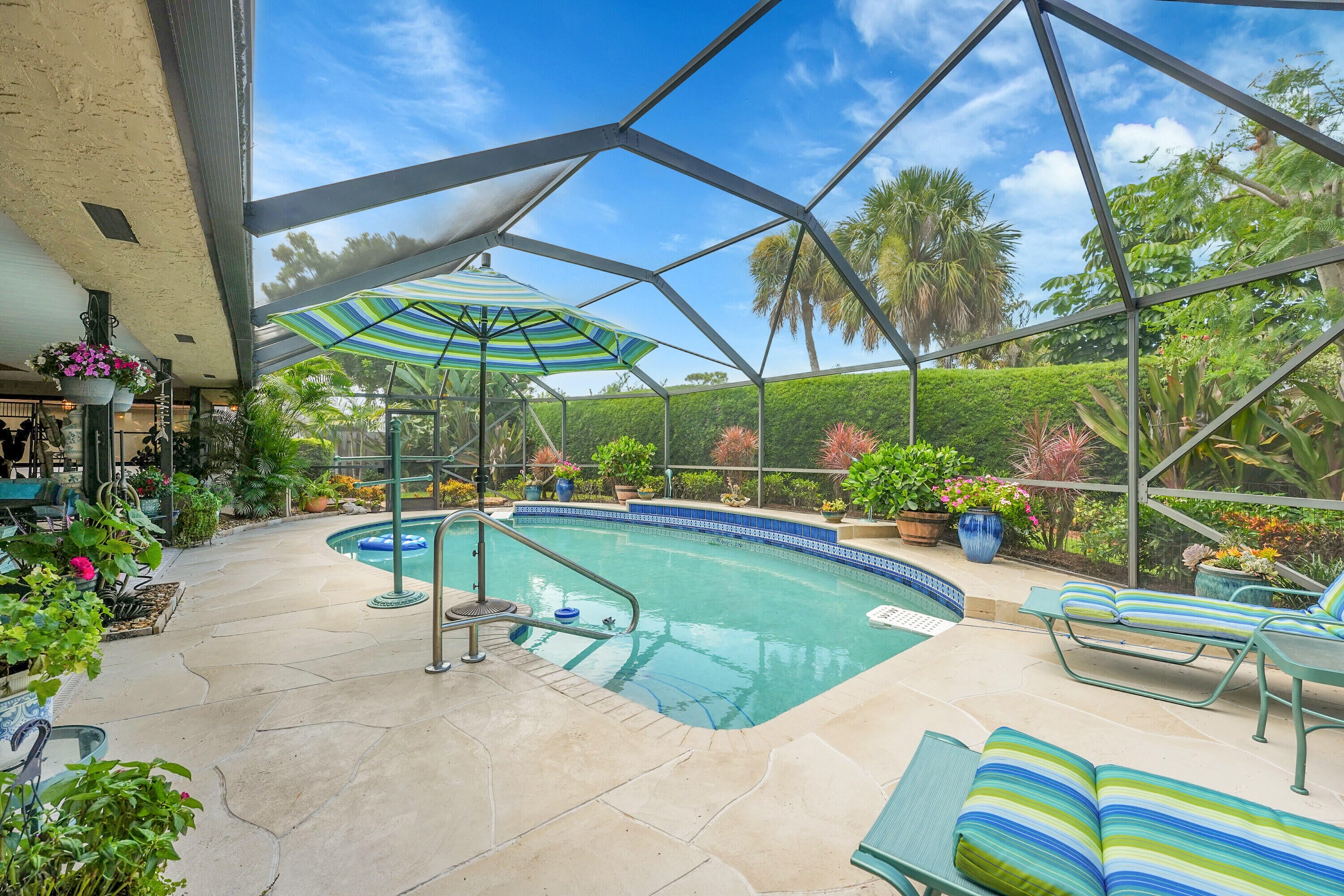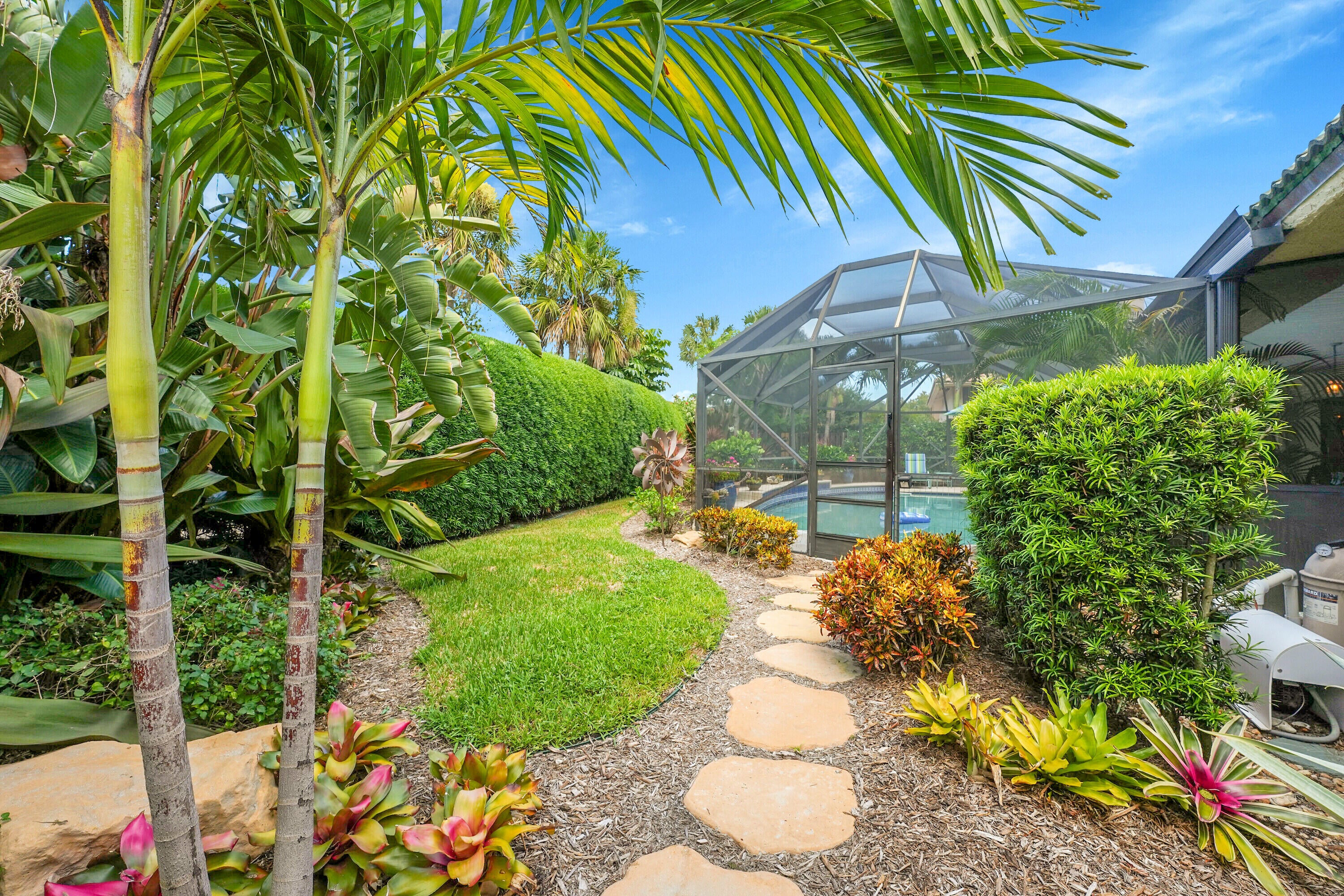 TROPICAL OASIS! Lush Landscaping welcomes you to this beautiful One Story, CBS, 4 Bedroom 2 Full Bathroom sitting on a .23-acre lot. The home offers a serene interior location, spectacular garden and screened in pool w(pool heater/chiller 2024). The home features a split floor plan w/dual AC's (2024, 2018) On one side you have the Owners' suite has two large walk-in closets w/built-in shelving. Owners Bath has a sunken shower w/ two Shower heads. The other side features 3 bedrooms each w/ample closet space and a full bathroom. The gourmet kitchen features generous cabinet storage space, wet bar with pass through to the living room, SS appliances and 42'' custom cabinets. Plank Tile or vinyl flooring throughout. Barreled tile roof w/impact skylights (2019). The living room has vaultedceilings. Large bedrooms with ample closet space. Inside Laundry room with newer Washer (2021) and Dryer(2020). Full hurricane protection w/impact windows and accordion shutters. Hot Water Heater is 2024, Flat roof is 2019. A highlight of this home is the covered entrance way with custom leaded glass doors Rear covered porch runs the entire length of the home, and provides a covered exterior living and dining area. The lot is one of the larger ones in the community and also has an exterior shaded seating area in the front yard. Two car Garage has built-in locked closets and ample shelf space and work bench, as well as a utility sink. Garage door (2011) is impact rated and has an automatic Genie garage door opener that is integrated with the home security system. The home has a smart home security system by Guardian Security that includes burglar and fire alarm, interior and doorbell cameras, and remote access for the front door key pad and garage door that can be accessed from owner's smart phone. Frenchmen's Landing is a gated community with an unmanned gate, and access by remote opener or smart phone app. The community pond is stocked and fishing is allowed from the dock and gazebo. The neighborhood park hosts various social events throughout the year and has two tennis courts, a basketball court and a children's playground. Frenchmen's Landing is a highly desirable location and is just minutes from the public beaches on Singer Island or Juno Beach, the John D. MacArthur State Park on Singer Island and some of the best scuba diving and golf courses in the country. There is shopping and restaurants galore within minutes of the community, and the community is close to I-95, the Turnpike, PBI International Airport, the Port of West Palm Beach and the Brightline train.