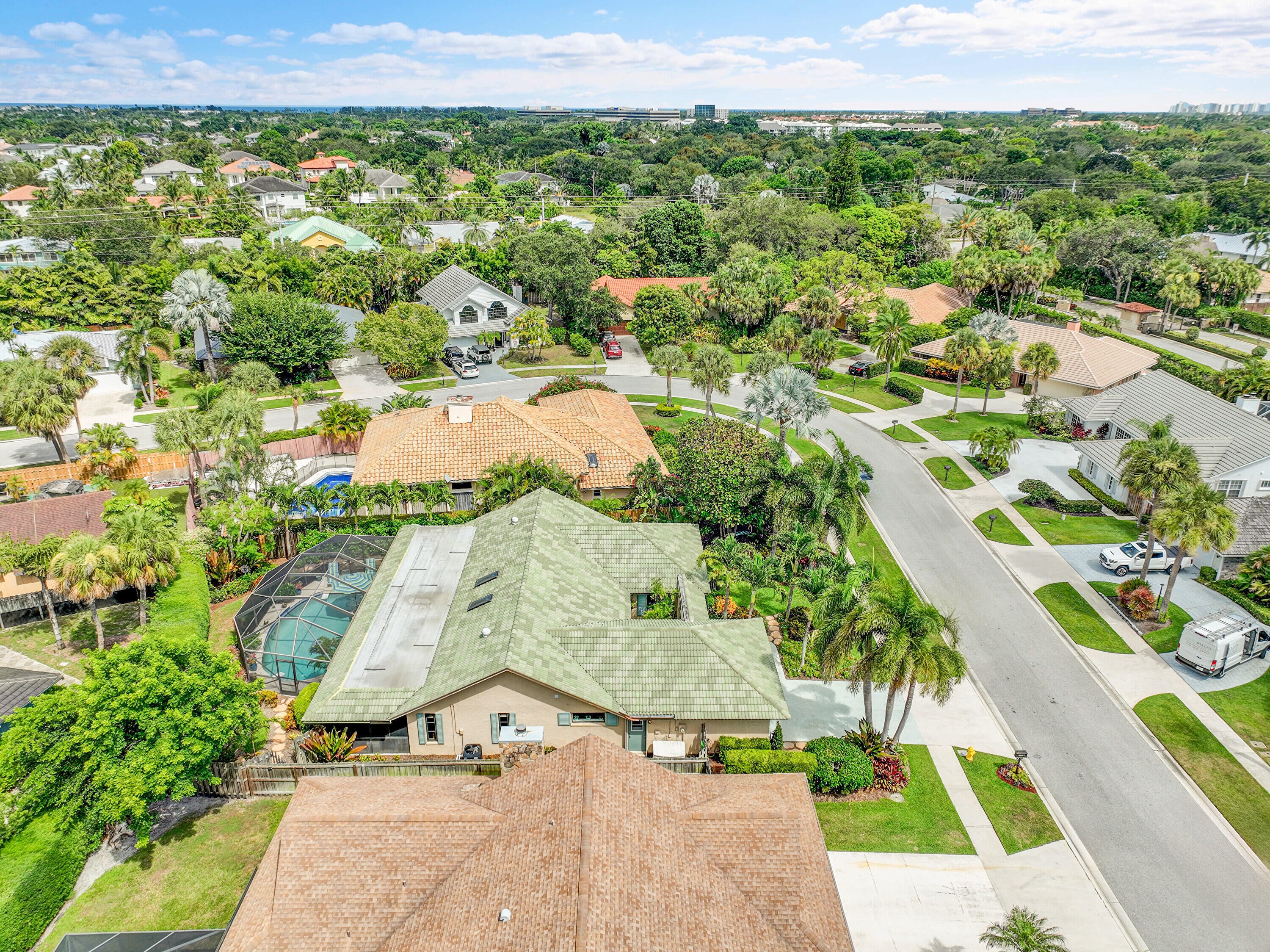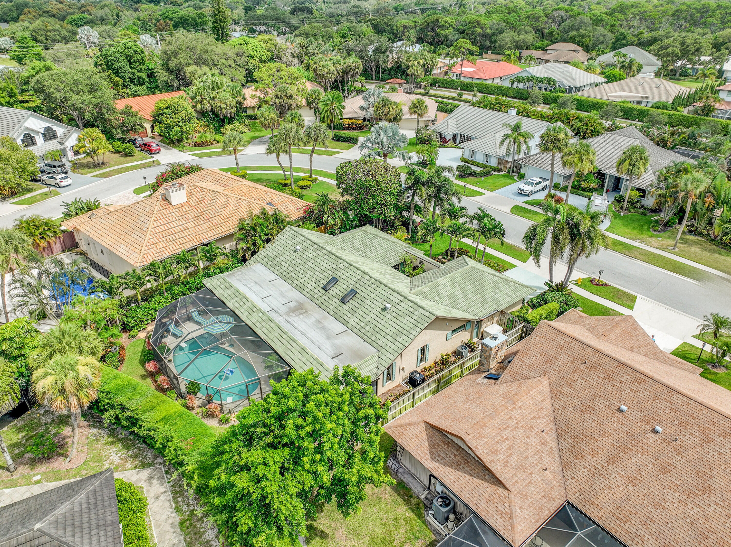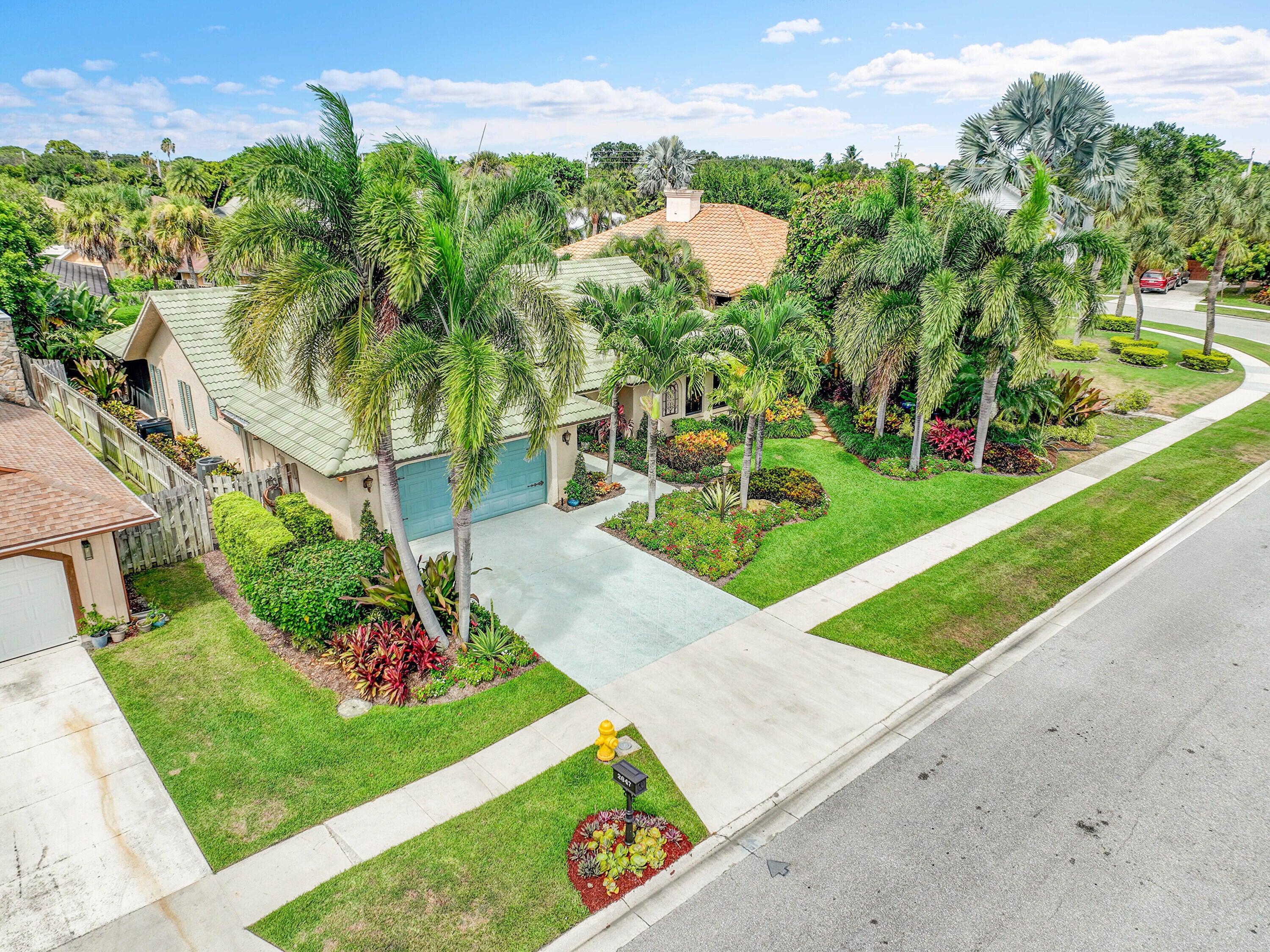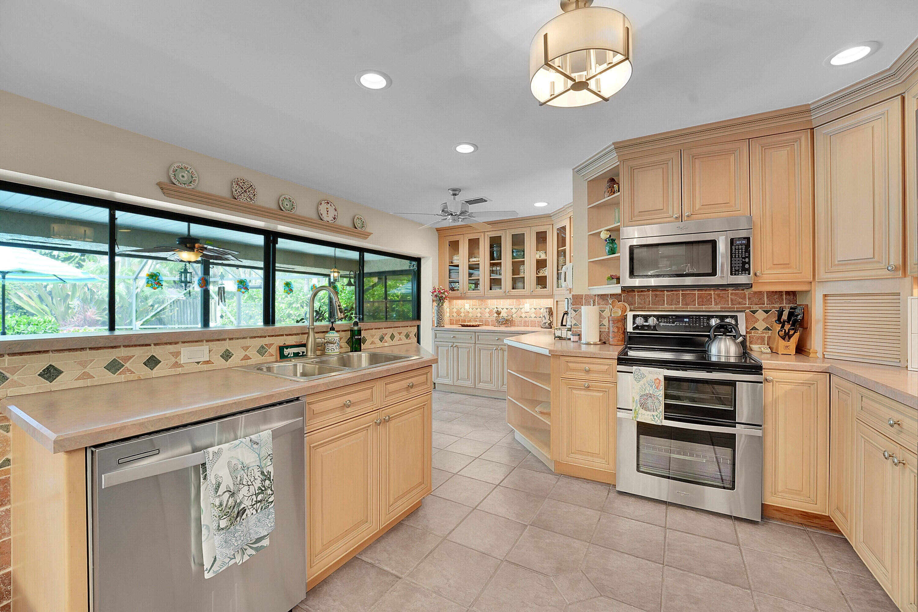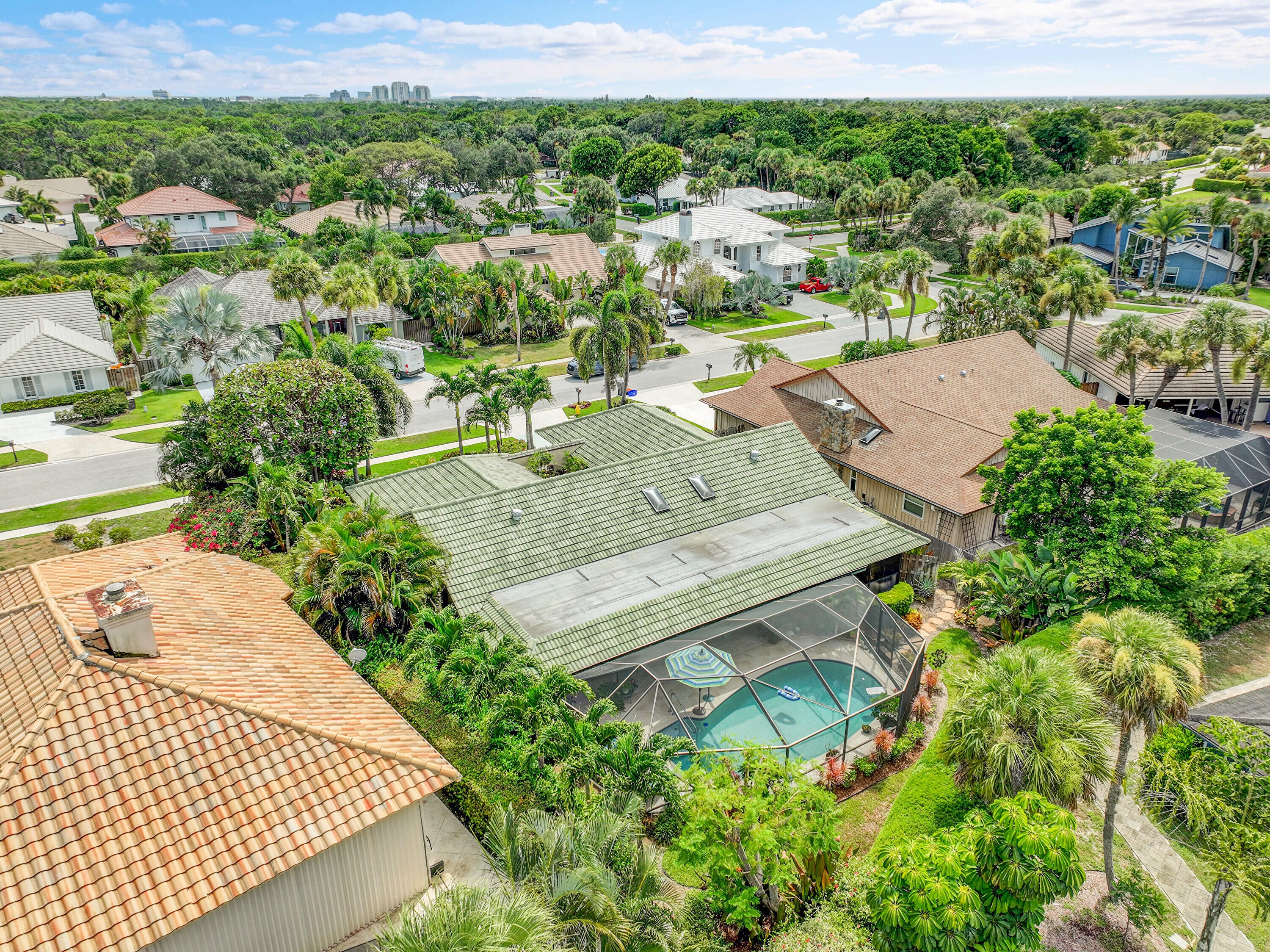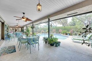 TROPICAL OASIS! Lush Landscaping welcomes you to this beautiful One Story, CBS, 4 Bedroom 2 Full Bathroom sitting on a .23-acre lot. The home offers a serene interior location, spectacular garden and screened in pool w(pool heater/chiller 2024). The home features a split floor plan w/dual AC's (2024, 2018) On one side you have the Owners' suite has two large walk-in closets w/built-in shelving. Owners Bath has a sunken shower w/ two Shower heads. The other side features 3 bedrooms each w/ample closet space and a full bathroom. The gourmet kitchen features generous cabinet storage space, wet bar with pass through to the living room, SS appliances and 42'' custom cabinets. Plank Tile or vinyl flooring throughout. Barreled tile roof w/impact skylights (2019). The living room has vaultedceilings. Large bedrooms with ample closet space. Inside Laundry room with newer Washer (2021) and Dryer(2020). Full hurricane protection w/impact windows and accordion shutters. Hot Water Heater is 2024, Flat roof is 2019. A highlight of this home is the covered entrance way with custom leaded glass doors Rear covered porch runs the entire length of the home, and provides a covered exterior living and dining area. The lot is one of the larger ones in the community and also has an exterior shaded seating area in the front yard. Two car Garage has built-in locked closets and ample shelf space and work bench, as well as a utility sink. Garage door (2011) is impact rated and has an automatic Genie garage door opener that is integrated with the home security system. The home has a smart home security system by Guardian Security that includes burglar and fire alarm, interior and doorbell cameras, and remote access for the front door key pad and garage door that can be accessed from owner's smart phone. Frenchmen's Landing is a gated community with an unmanned gate, and access by remote opener or smart phone app. The community pond is stocked and fishing is allowed from the dock and gazebo. The neighborhood park hosts various social events throughout the year and has two tennis courts, a basketball court and a children's playground. Frenchmen's Landing is a highly desirable location and is just minutes from the public beaches on Singer Island or Juno Beach, the John D. MacArthur State Park on Singer Island and some of the best scuba diving and golf courses in the country. There is shopping and restaurants galore within minutes of the community, and the community is close to I-95, the Turnpike, PBI International Airport, the Port of West Palm Beach and the Brightline train.
