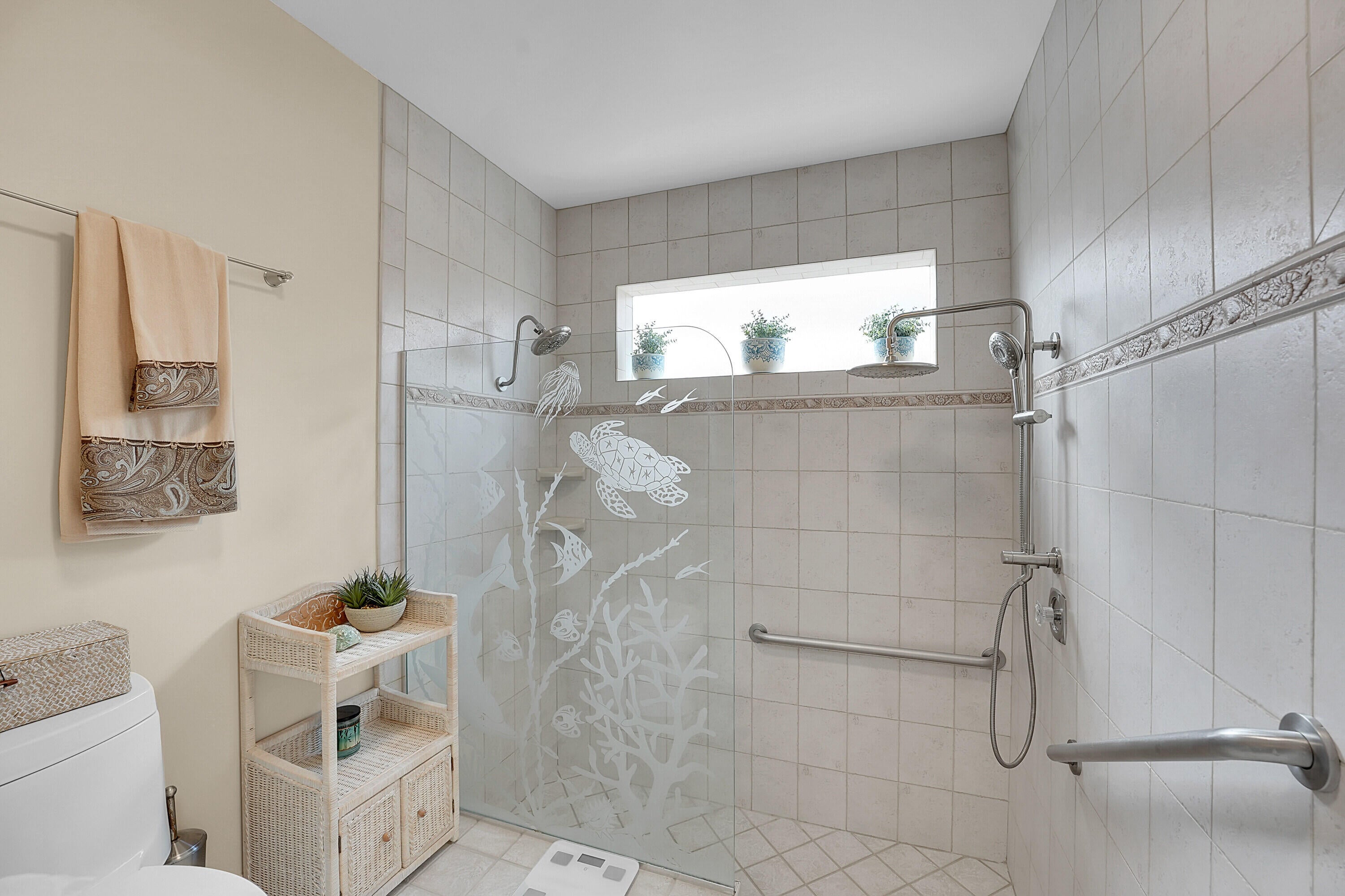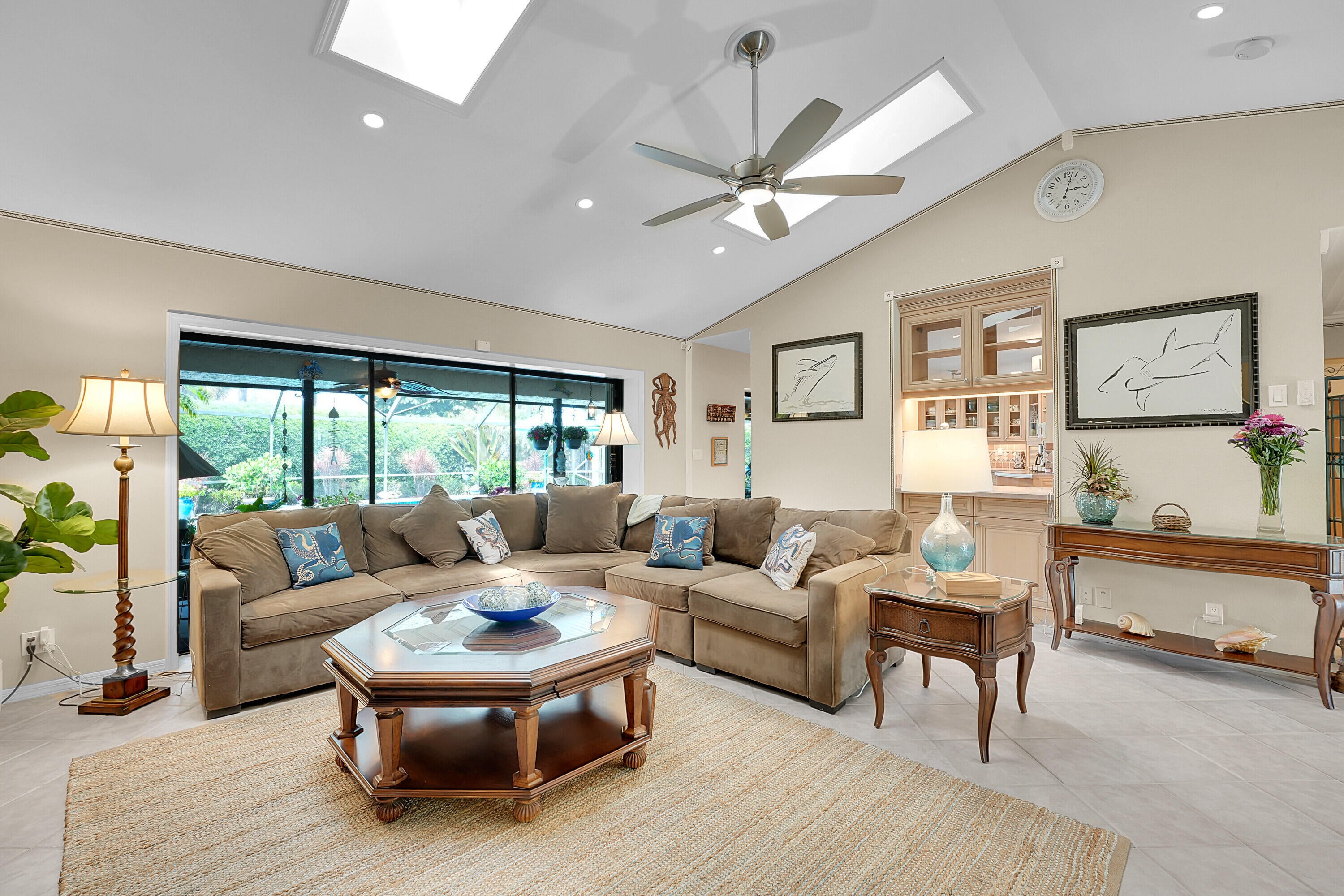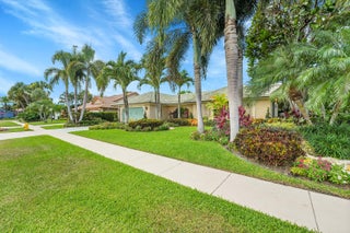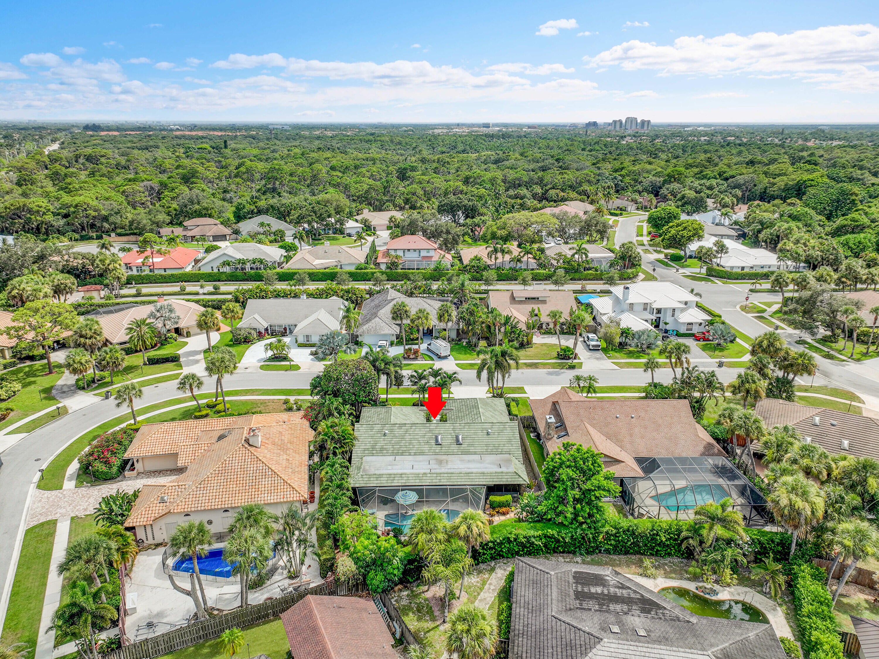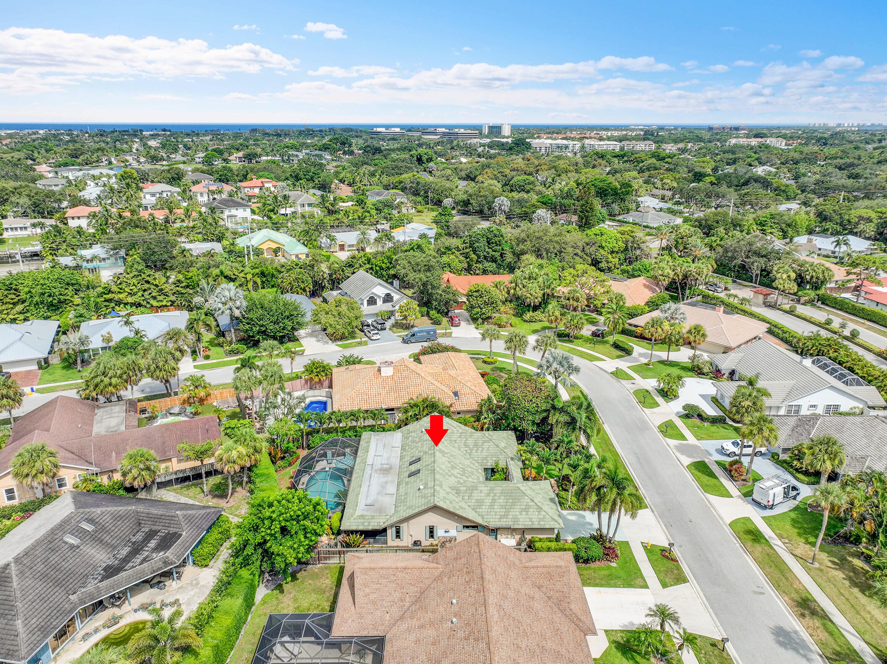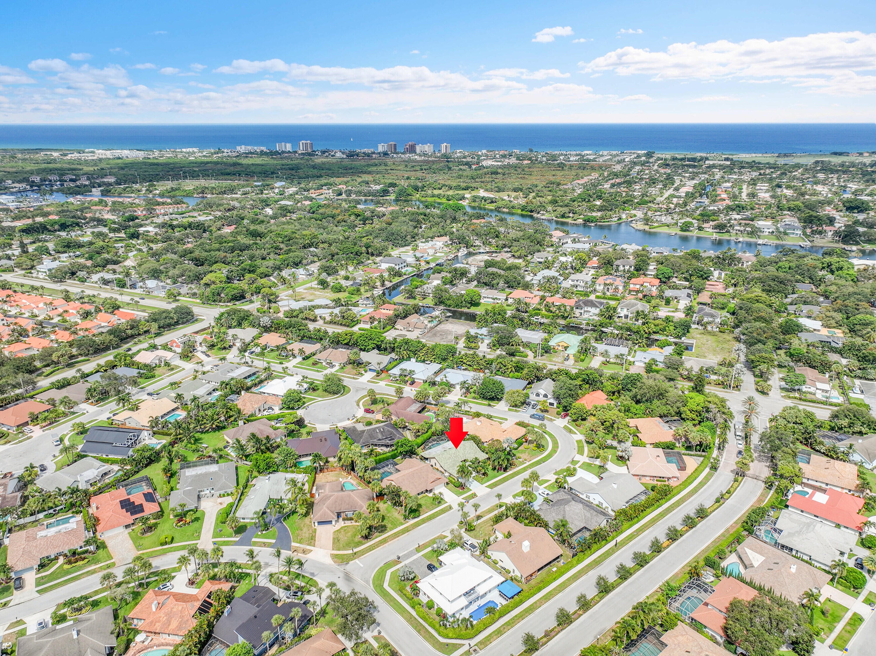 TROPICAL OASIS! Lush Landscaping welcomes you to this beautiful One Story, CBS, 4 Bedroom 2 Full Bathroom sitting on a .23-acre lot. The home offers a serene interior location, spectacular garden and screened in pool w(pool heater/chiller 2024). The home features a split floor plan w/dual AC's (2024, 2018) On one side you have the Owners' suite has two large walk-in closets w/built-in shelving. Owners Bath has a sunken shower w/ two Shower heads. The other side features 3 bedrooms each w/ample closet space and a full bathroom. The gourmet kitchen features generous cabinet storage space, wet bar with pass through to the living room, SS appliances and 42'' custom cabinets. Plank Tile or vinyl flooring throughout. Barreled tile roof w/impact skylights (2019). The living room has vaultedceilings. Large bedrooms with ample closet space. Inside Laundry room with newer Washer (2021) and Dryer(2020). Full hurricane protection w/impact windows and accordion shutters. Hot Water Heater is 2024, Flat roof is 2019. A highlight of this home is the covered entrance way with custom leaded glass doors Rear covered porch runs the entire length of the home, and provides a covered exterior living and dining area. The lot is one of the larger ones in the community and also has an exterior shaded seating area in the front yard. Two car Garage has built-in locked closets and ample shelf space and work bench, as well as a utility sink. Garage door (2011) is impact rated and has an automatic Genie garage door opener that is integrated with the home security system. The home has a smart home security system by Guardian Security that includes burglar and fire alarm, interior and doorbell cameras, and remote access for the front door key pad and garage door that can be accessed from owner's smart phone. Frenchmen's Landing is a gated community with an unmanned gate, and access by remote opener or smart phone app. The community pond is stocked and fishing is allowed from the dock and gazebo. The neighborhood park hosts various social events throughout the year and has two tennis courts, a basketball court and a children's playground. Frenchmen's Landing is a highly desirable location and is just minutes from the public beaches on Singer Island or Juno Beach, the John D. MacArthur State Park on Singer Island and some of the best scuba diving and golf courses in the country. There is shopping and restaurants galore within minutes of the community, and the community is close to I-95, the Turnpike, PBI International Airport, the Port of West Palm Beach and the Brightline train.
