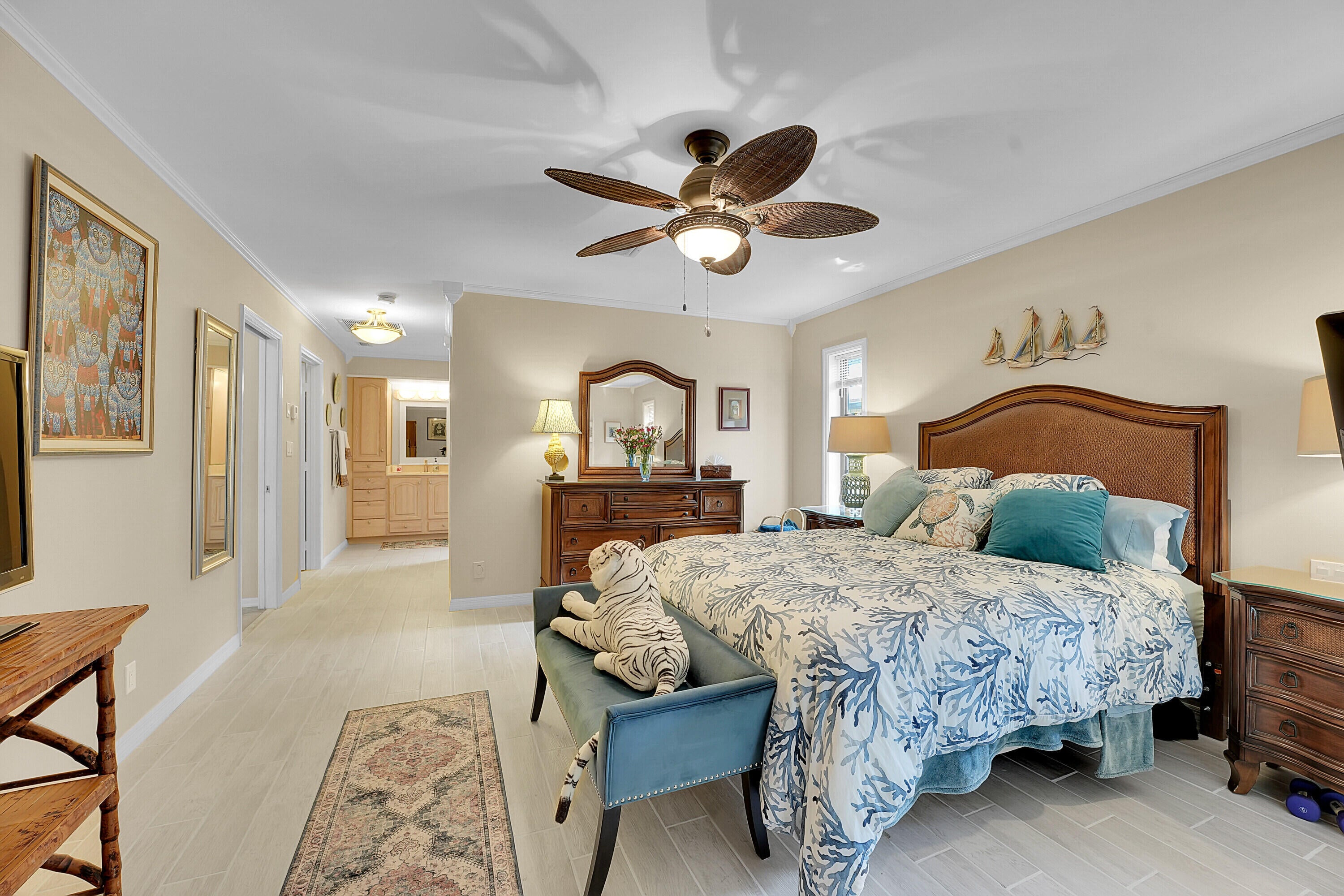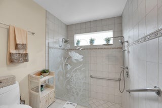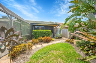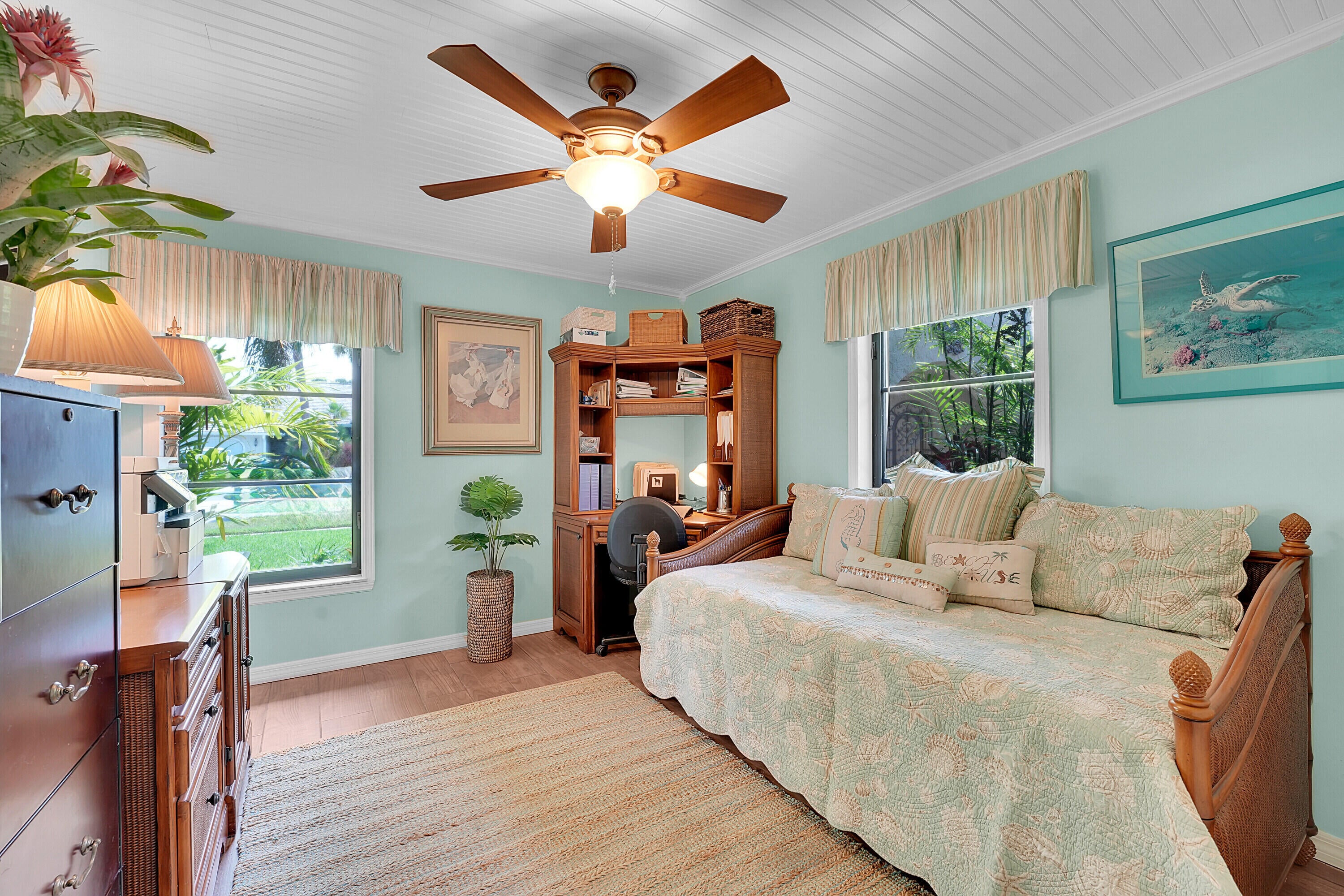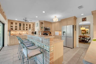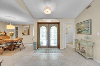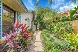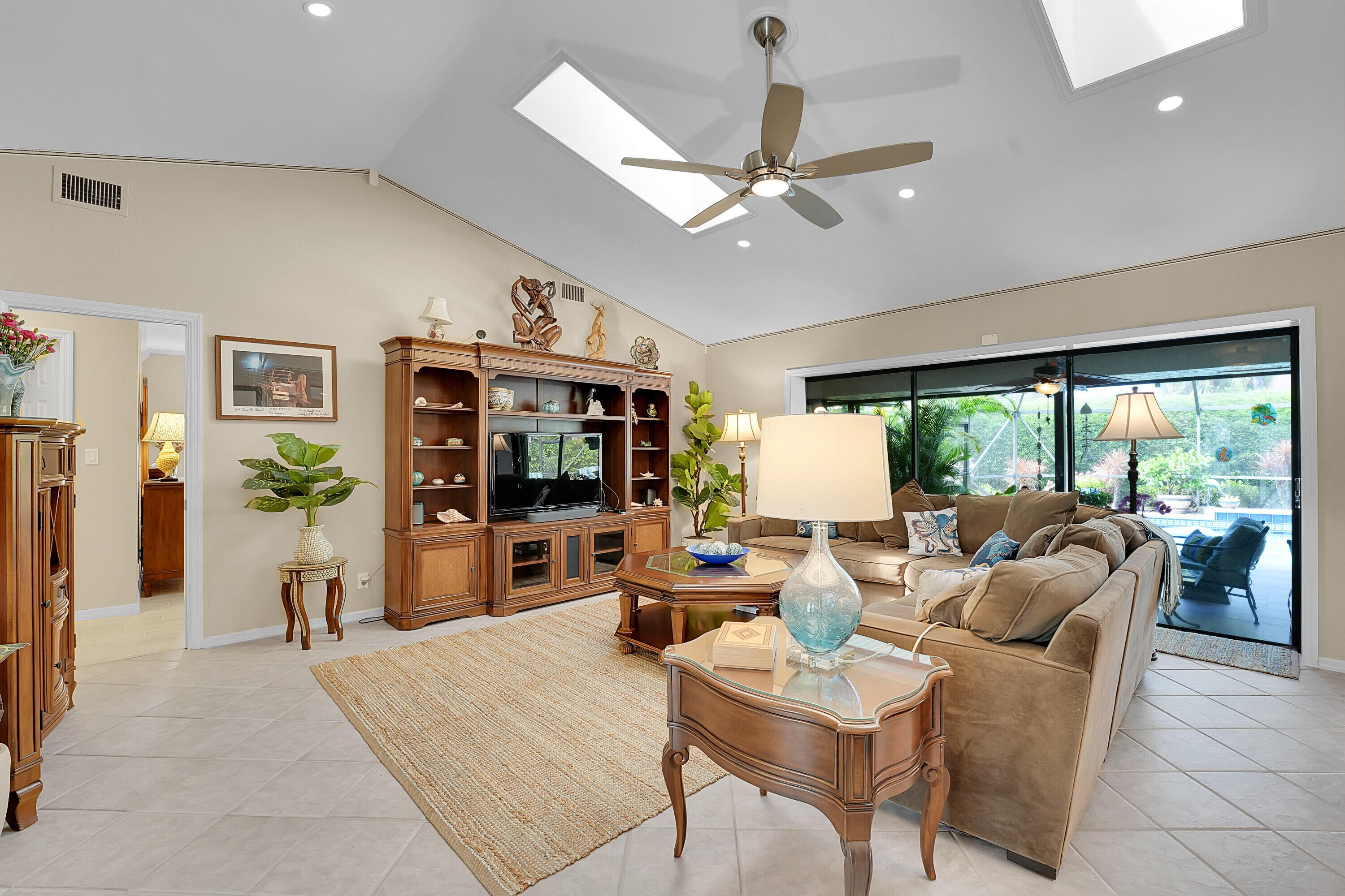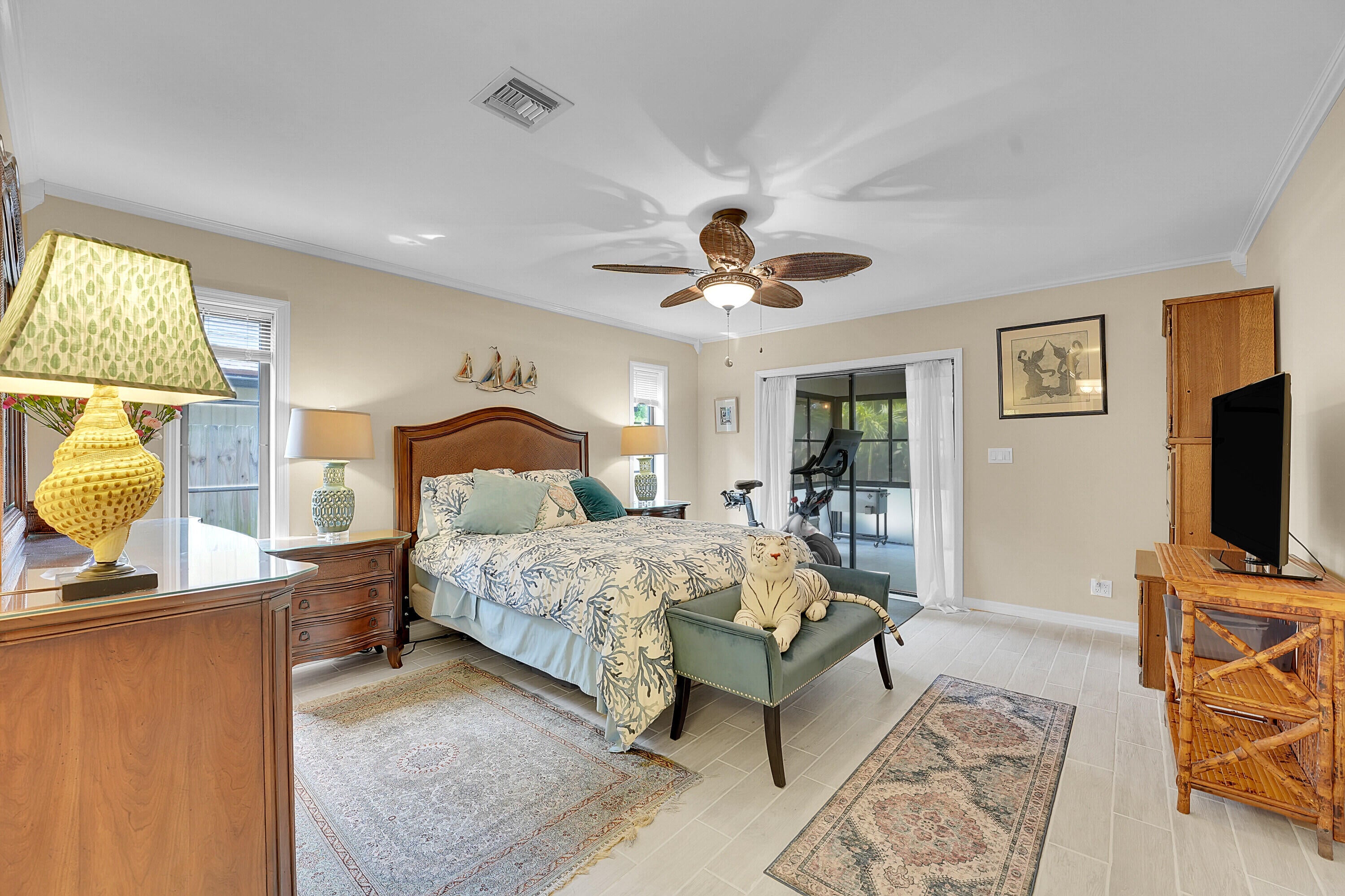 TROPICAL OASIS! Lush Landscaping welcomes you to this beautiful One Story, CBS, 4 Bedroom 2 Full Bathroom sitting on a .23-acre lot. The home offers a serene interior location, spectacular garden and screened in pool w(pool heater/chiller 2024). The home features a split floor plan w/dual AC's (2024, 2018) On one side you have the Owners' suite has two large walk-in closets w/built-in shelving. Owners Bath has a sunken shower w/ two Shower heads. The other side features 3 bedrooms each w/ample closet space and a full bathroom. The gourmet kitchen features generous cabinet storage space, wet bar with pass through to the living room, SS appliances and 42'' custom cabinets. Plank Tile or vinyl flooring throughout. Barreled tile roof w/impact skylights (2019). The living room has vaultedceilings. Large bedrooms with ample closet space. Inside Laundry room with newer Washer (2021) and Dryer(2020). Full hurricane protection w/impact windows and accordion shutters. Hot Water Heater is 2024, Flat roof is 2019. A highlight of this home is the covered entrance way with custom leaded glass doors Rear covered porch runs the entire length of the home, and provides a covered exterior living and dining area. The lot is one of the larger ones in the community and also has an exterior shaded seating area in the front yard. Two car Garage has built-in locked closets and ample shelf space and work bench, as well as a utility sink. Garage door (2011) is impact rated and has an automatic Genie garage door opener that is integrated with the home security system. The home has a smart home security system by Guardian Security that includes burglar and fire alarm, interior and doorbell cameras, and remote access for the front door key pad and garage door that can be accessed from owner's smart phone. Frenchmen's Landing is a gated community with an unmanned gate, and access by remote opener or smart phone app. The community pond is stocked and fishing is allowed from the dock and gazebo. The neighborhood park hosts various social events throughout the year and has two tennis courts, a basketball court and a children's playground. Frenchmen's Landing is a highly desirable location and is just minutes from the public beaches on Singer Island or Juno Beach, the John D. MacArthur State Park on Singer Island and some of the best scuba diving and golf courses in the country. There is shopping and restaurants galore within minutes of the community, and the community is close to I-95, the Turnpike, PBI International Airport, the Port of West Palm Beach and the Brightline train.