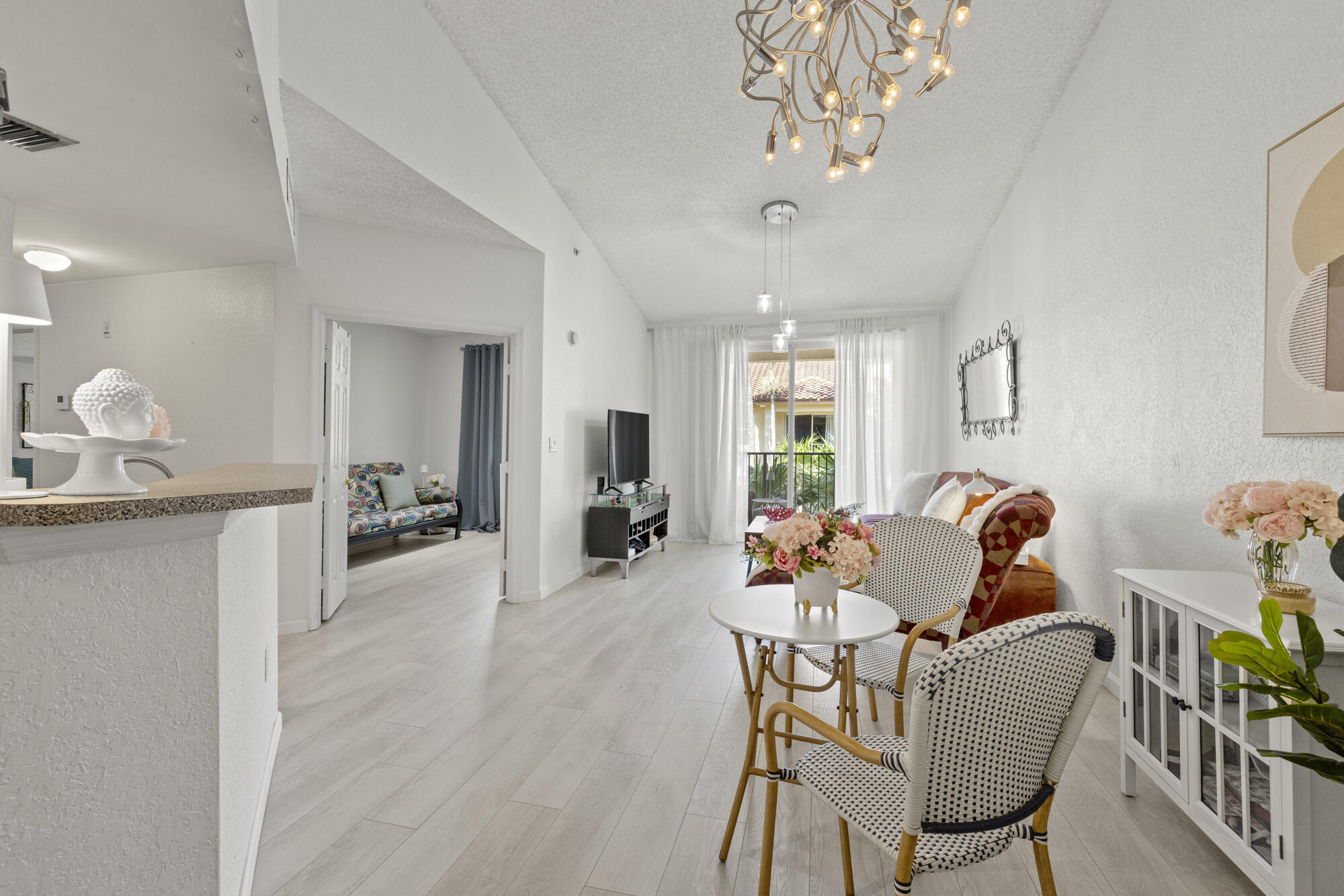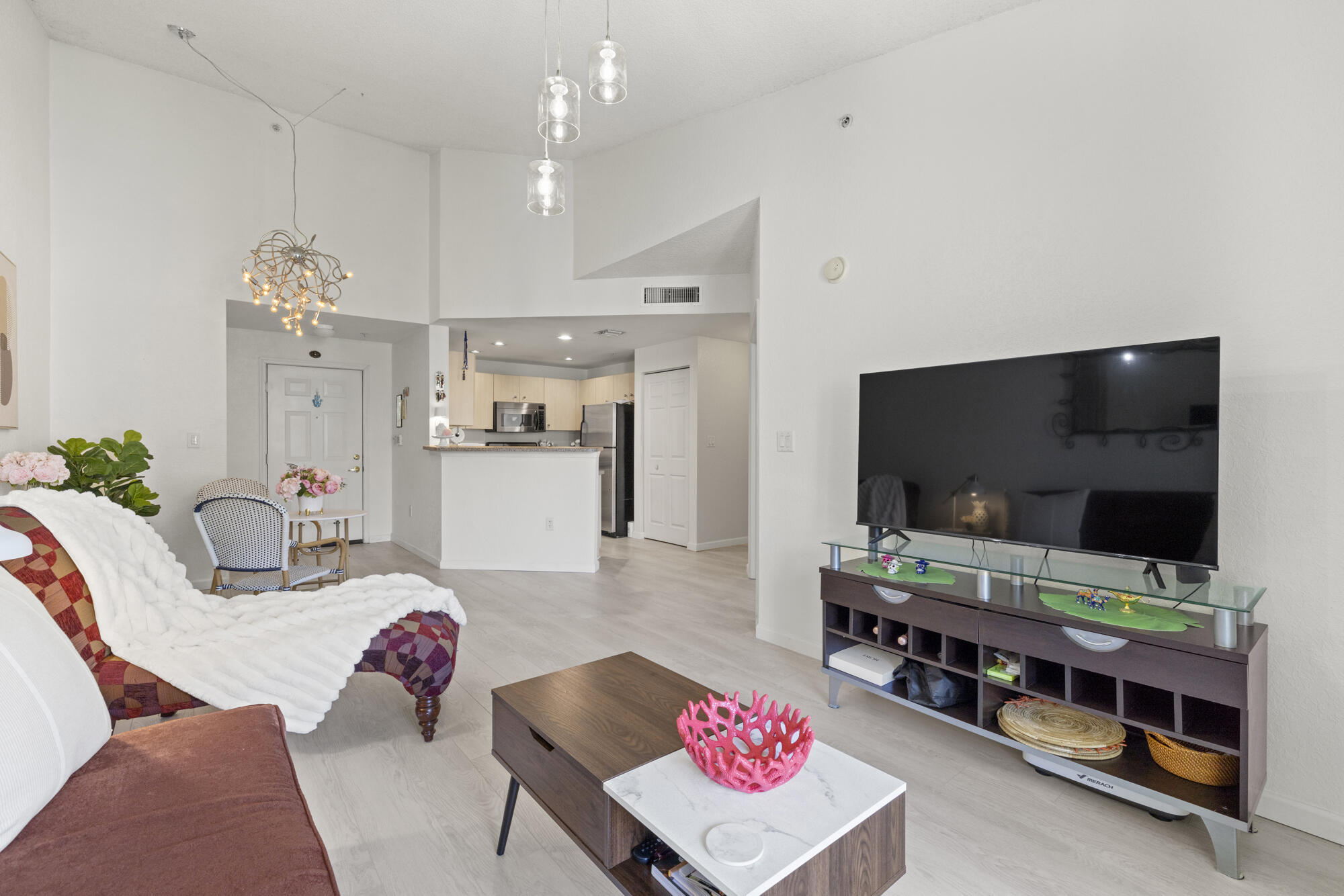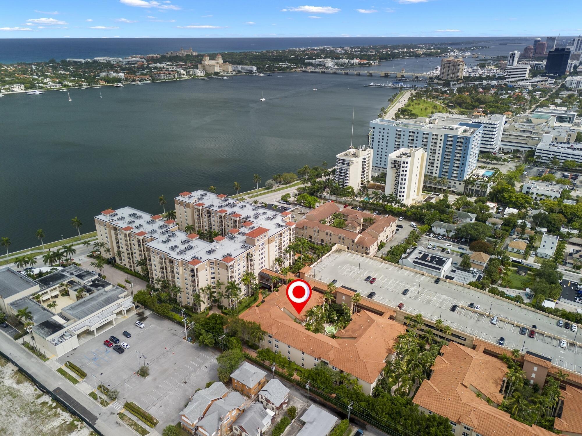 Rarely available -gorgeous top floor corner unit with volume ceilings & located in the quiet & .cozy garden building of Flagler Pointe. Offered furnished if desired. Owner has recently installed wood laminate flooring, newer Central Air, new interior paint & impact windows/doors. Features include prime parking spot, spacious laundry room w/extra storage, breakfast bar, and cozy balcony overlooking tranquil garden. This is a gated community with 24/7 full service concierge desk, in house management company, resort style pool, spa,sauna, gym and club lounge. Live the life of luxury with the newest Ritz Carlton Residence being built right next to Flagler Pointe. Great location right across the street from the intracoastal waterway. Close to downtown within biking and walking distance.