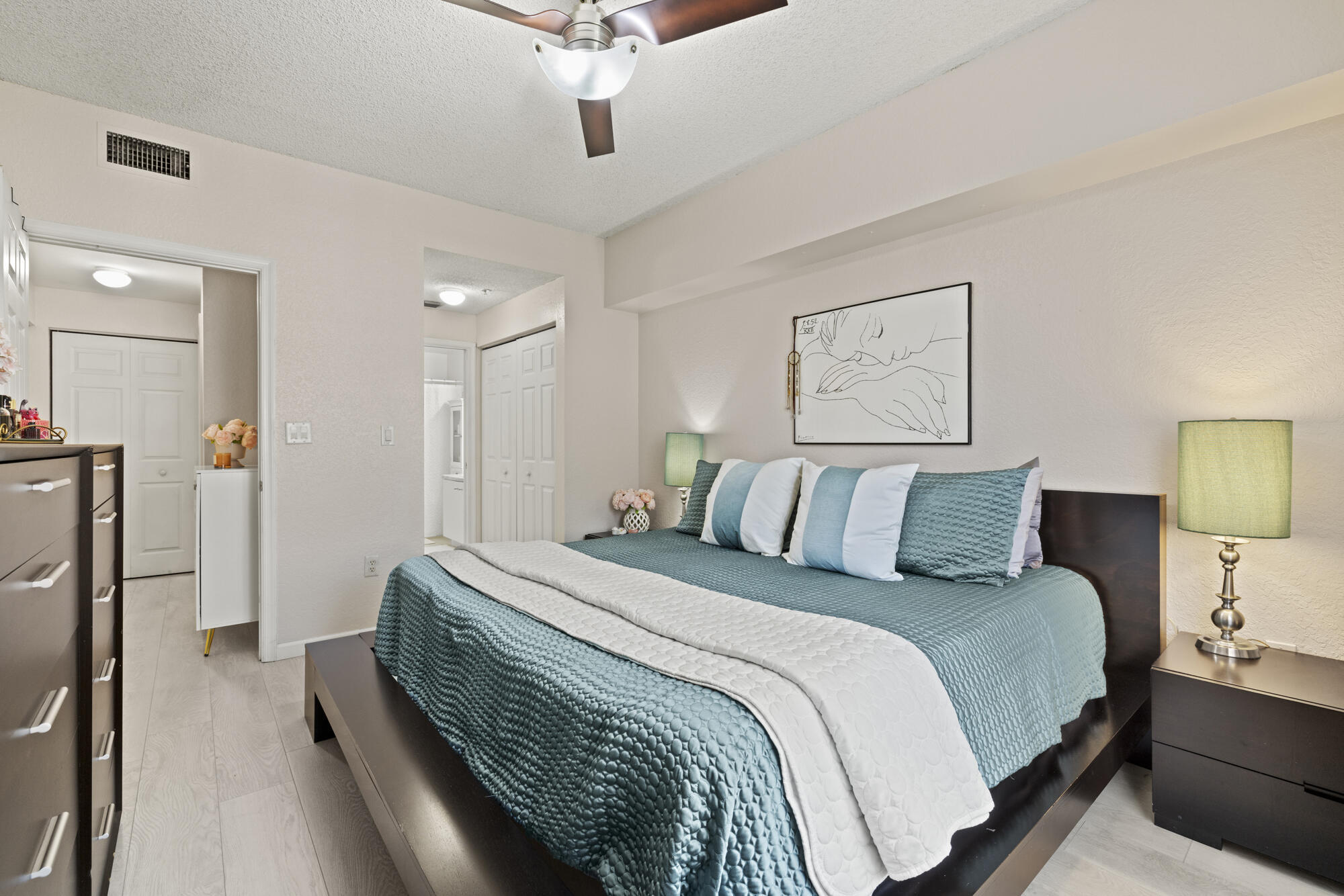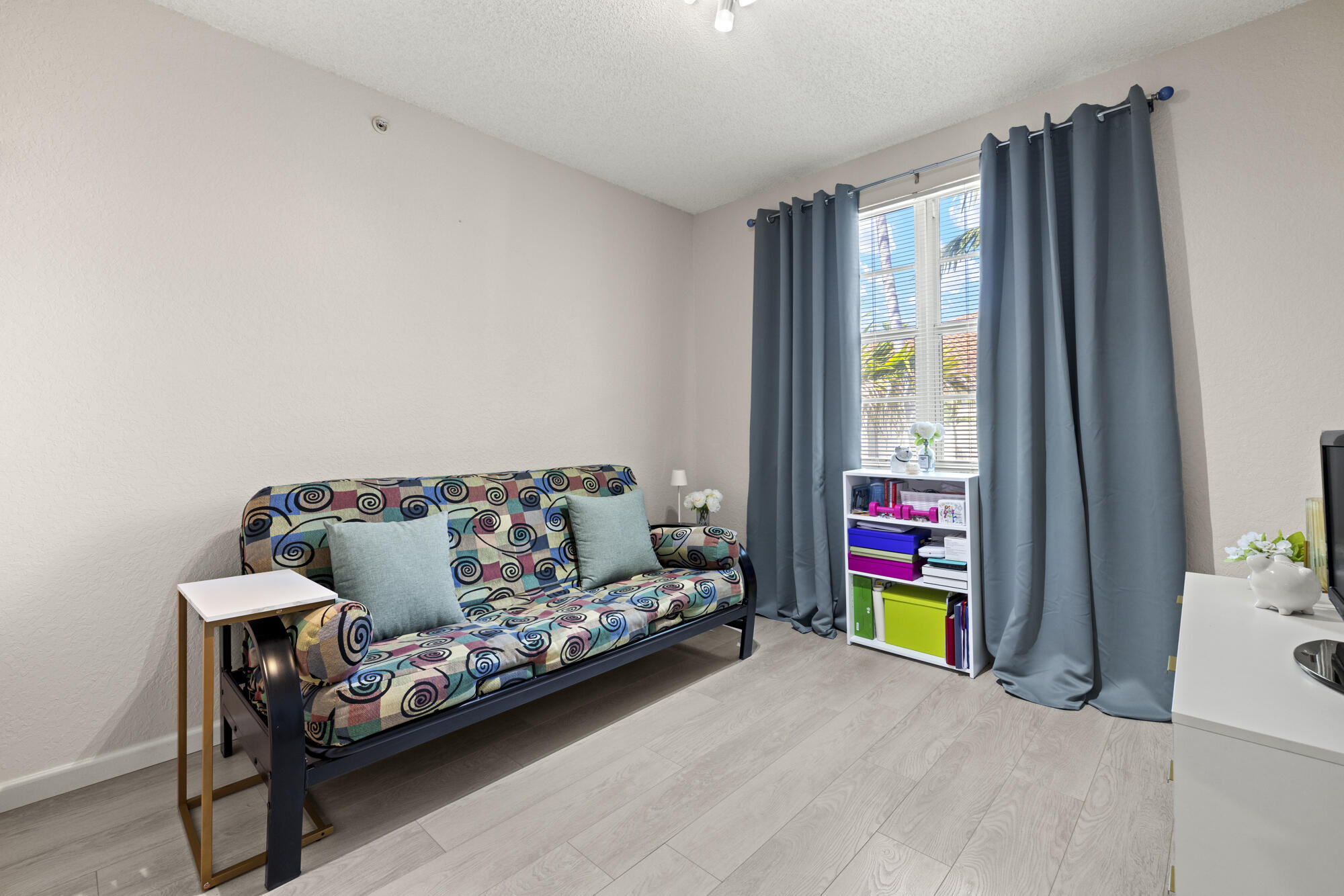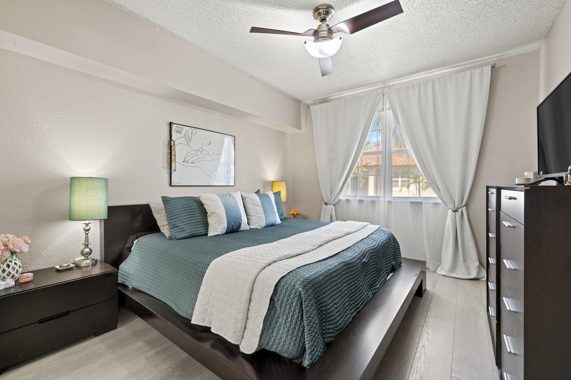 Rarely available -gorgeous top floor corner unit with volume ceilings & located in the quiet & .cozy garden building of Flagler Pointe. Offered furnished if desired. Owner has recently installed wood laminate flooring, newer Central Air, new interior paint & impact windows/doors. Features include prime parking spot, spacious laundry room w/extra storage, breakfast bar, and cozy balcony overlooking tranquil garden. This is a gated community with 24/7 full service concierge desk, in house management company, resort style pool, spa,sauna, gym and club lounge. Live the life of luxury with the newest Ritz Carlton Residence being built right next to Flagler Pointe. Great location right across the street from the intracoastal waterway. Close to downtown within biking and walking distance.