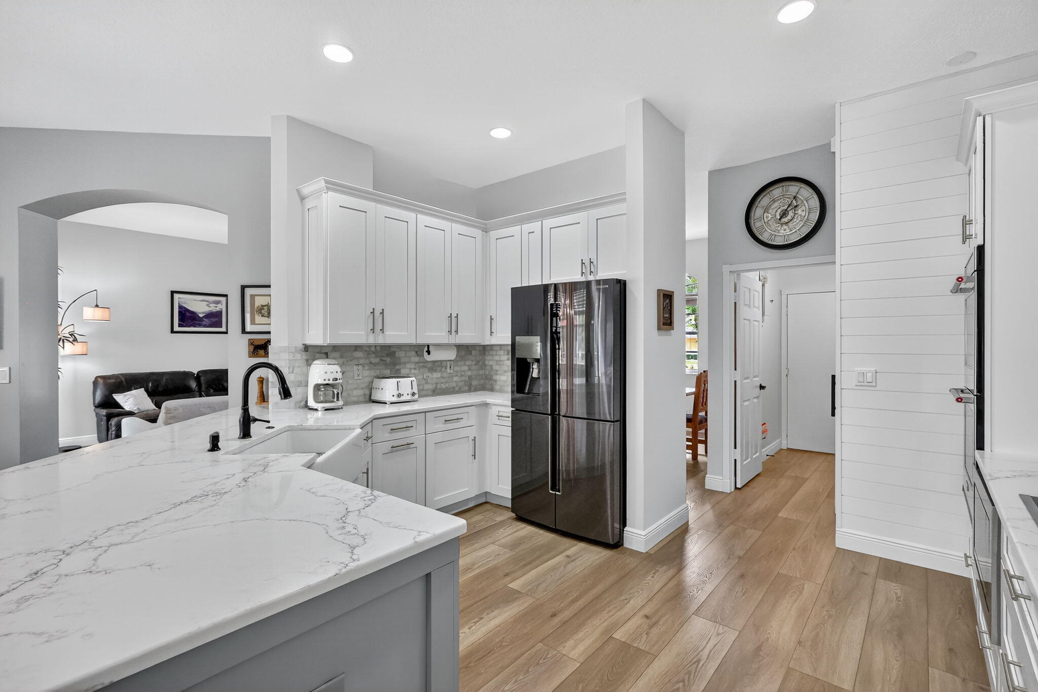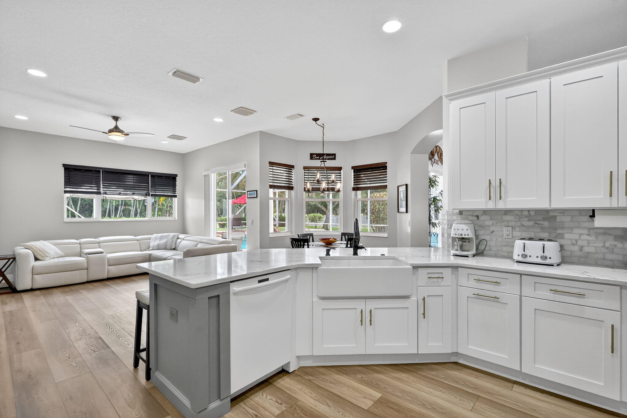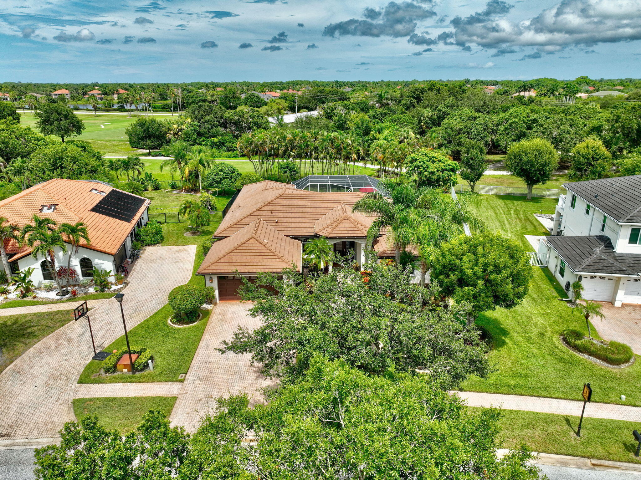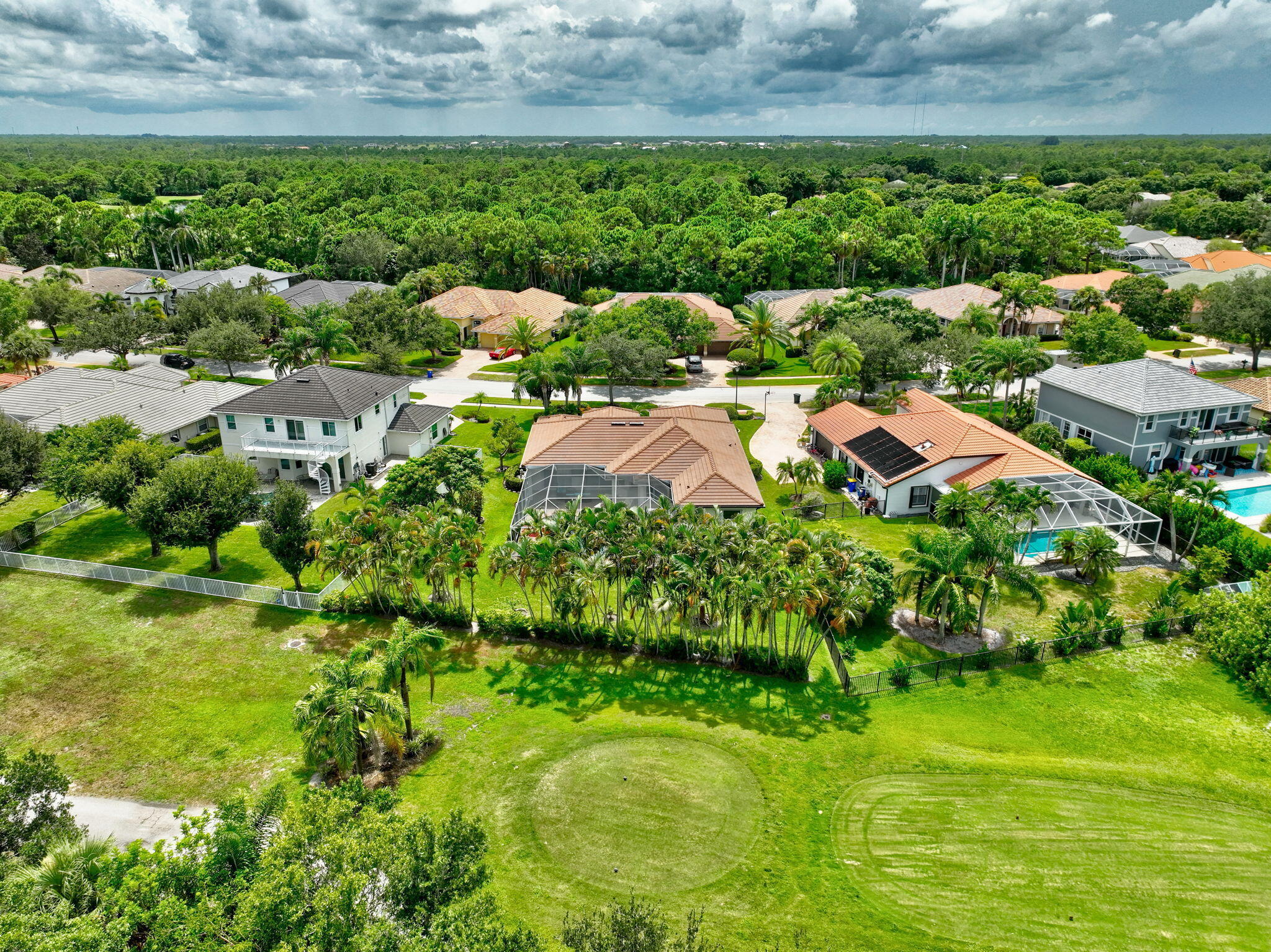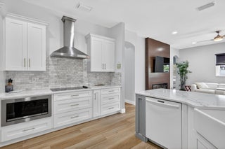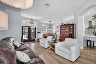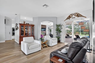 This is the ONE! Elegant and spacious, this 4 bedroom, 3 full bathroom, one story pool home sits on an oversized 1/3 + acre lot with a sparkling salt water pool and spa, large screened in patio that backs to the 18th fairway of Hammock Creek Golf course. It features a newer roof (2020), accordion shutters, exquisitely renovated open kitchen (2024) complete with double oven. The family room showcases a custom wall with mounted electric fireplace and TV. Luxury vinyl plank flooring throughout the main areas and bedrooms, plenty of natural light, with high end finishes. Split floorplan affords privacy, large primary bedroom and bathroom and a cabana bath. No Carpet! The Sanctuary has a private gate. Hammock Creek has no mandatory membership! Jack Nicklaus legacy design 18 hole course.