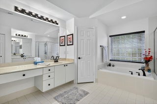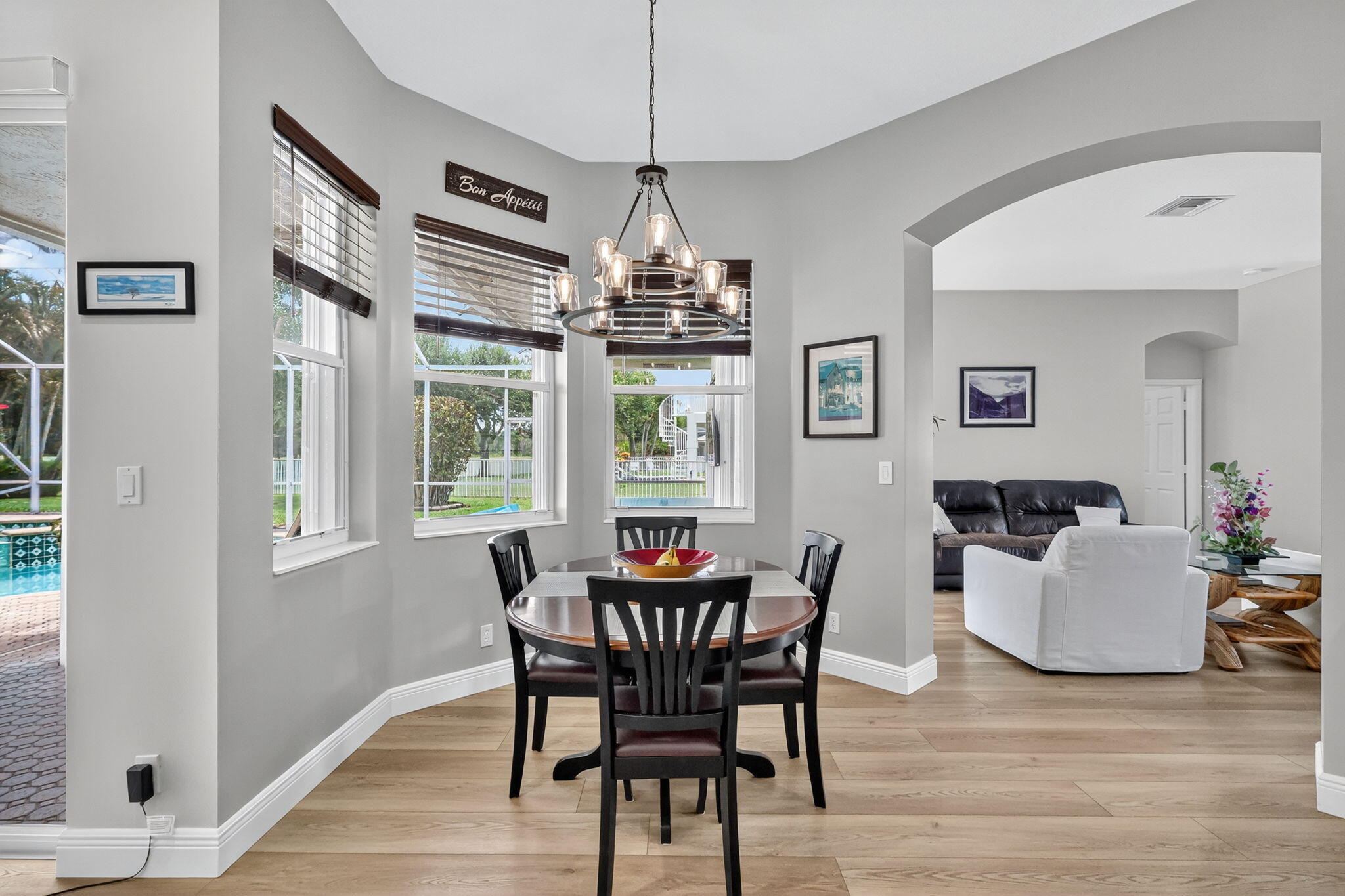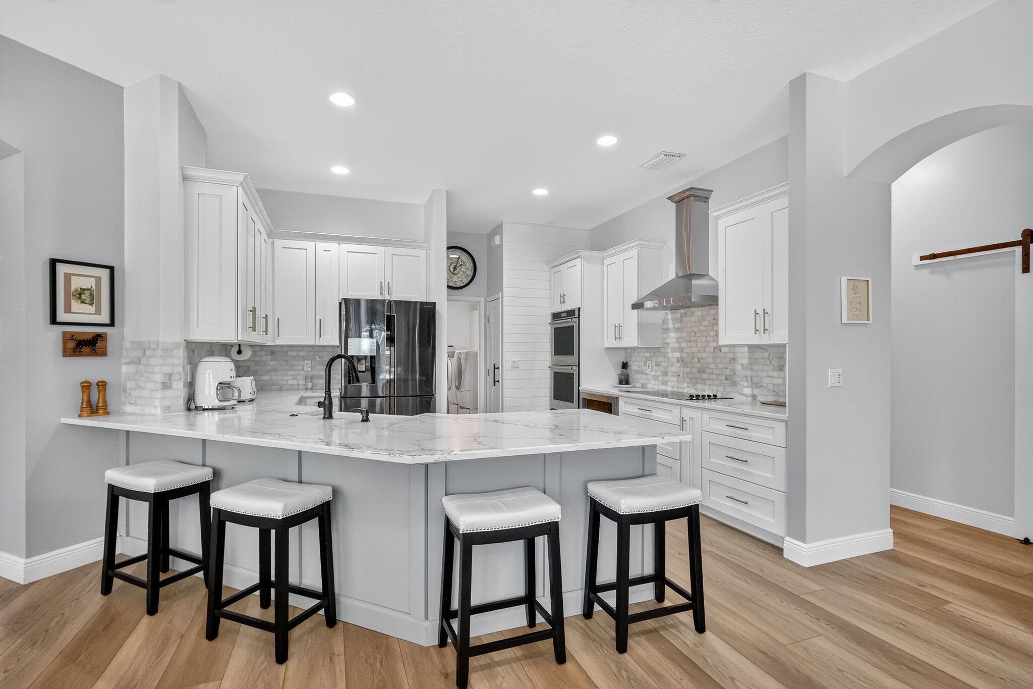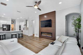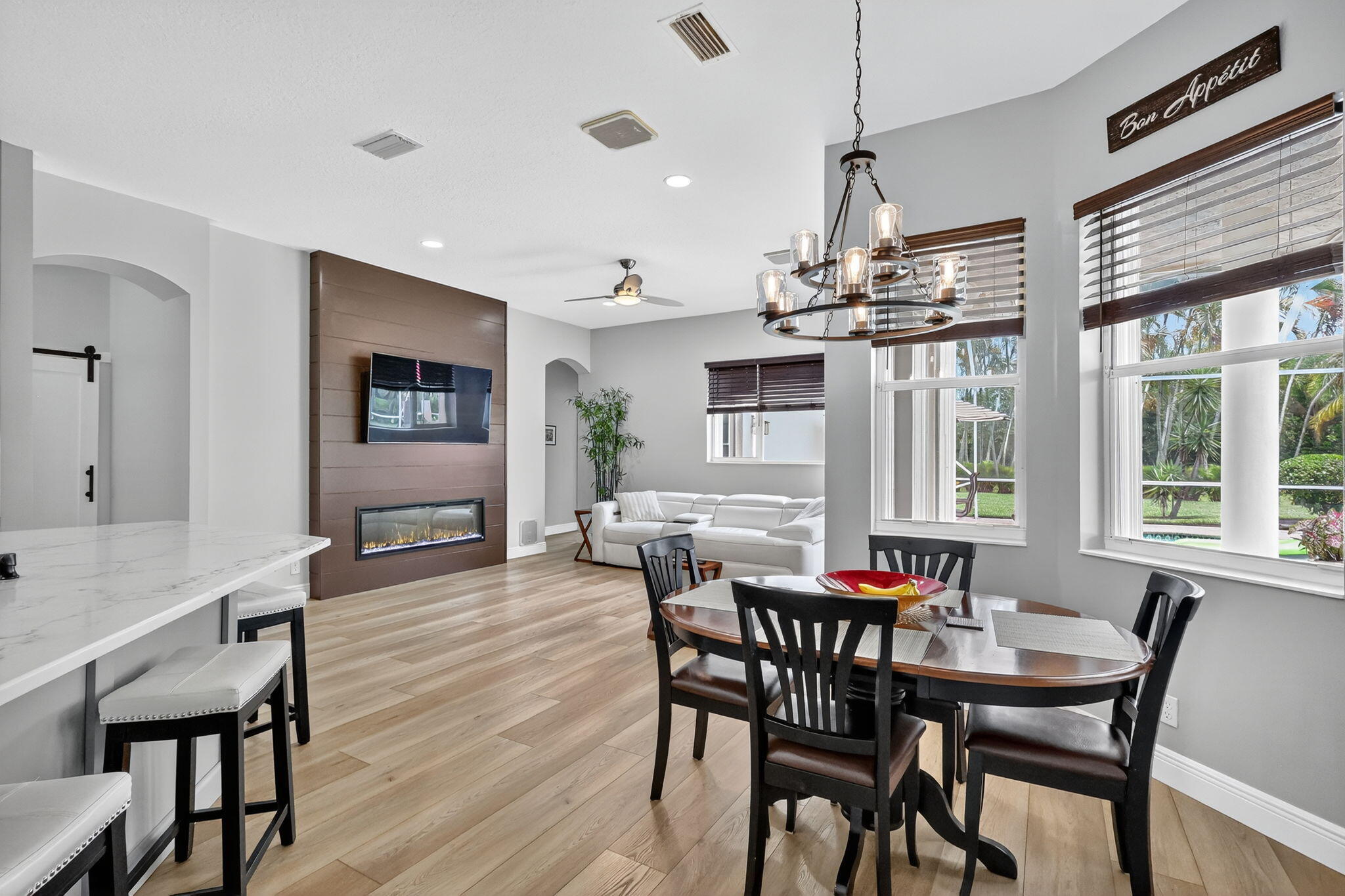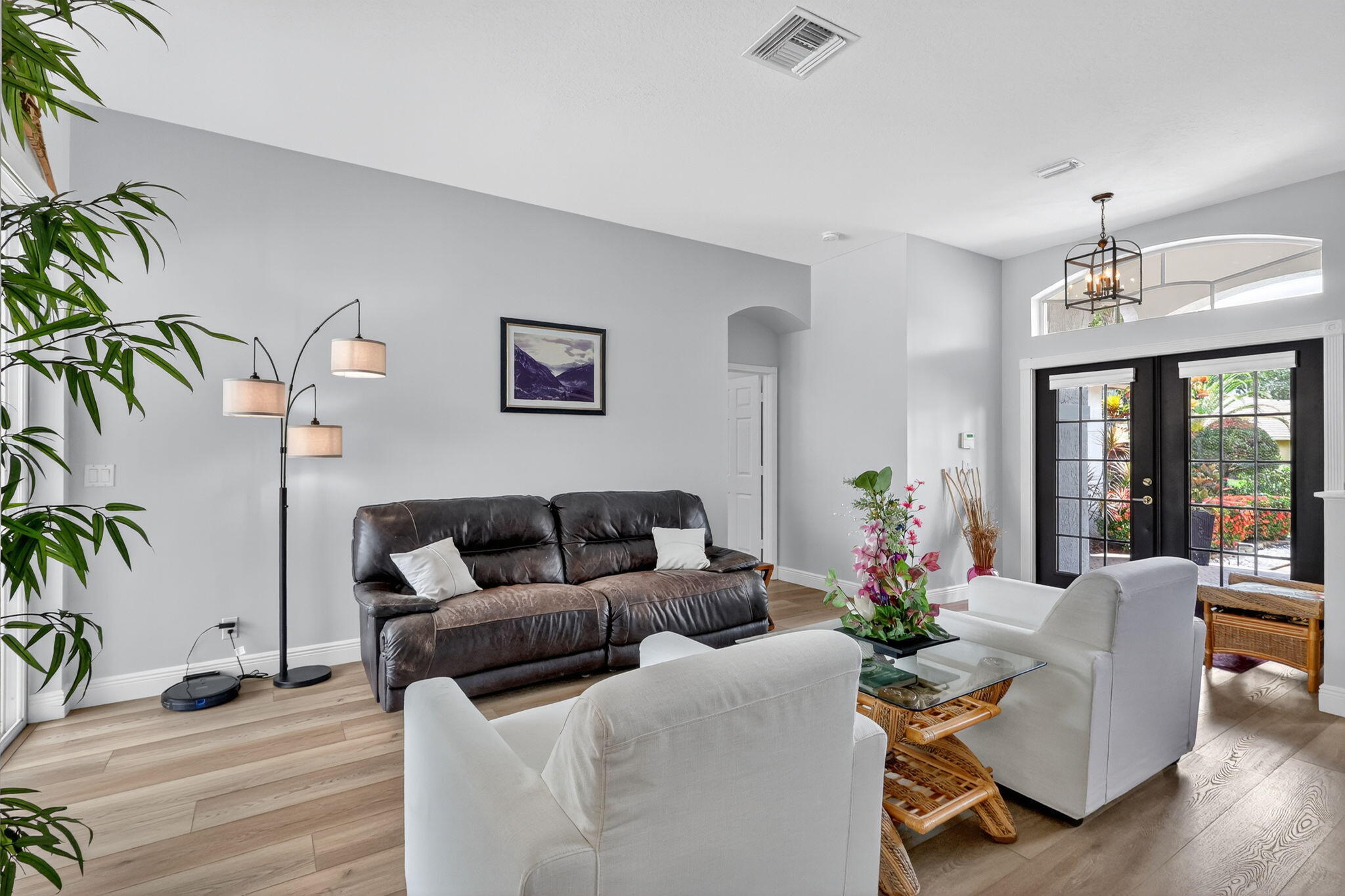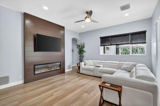 This is the ONE! Elegant and spacious, this 4 bedroom, 3 full bathroom, one story pool home sits on an oversized 1/3 + acre lot with a sparkling salt water pool and spa, large screened in patio that backs to the 18th fairway of Hammock Creek Golf course. It features a newer roof (2020), accordion shutters, exquisitely renovated open kitchen (2024) complete with double oven. The family room showcases a custom wall with mounted electric fireplace and TV. Luxury vinyl plank flooring throughout the main areas and bedrooms, plenty of natural light, with high end finishes. Split floorplan affords privacy, large primary bedroom and bathroom and a cabana bath. No Carpet! The Sanctuary has a private gate. Hammock Creek has no mandatory membership! Jack Nicklaus legacy design 18 hole course.