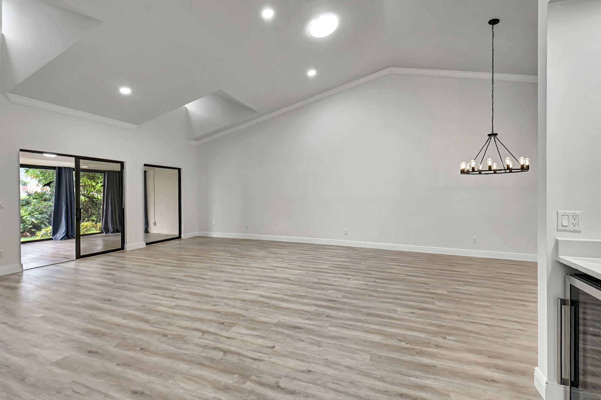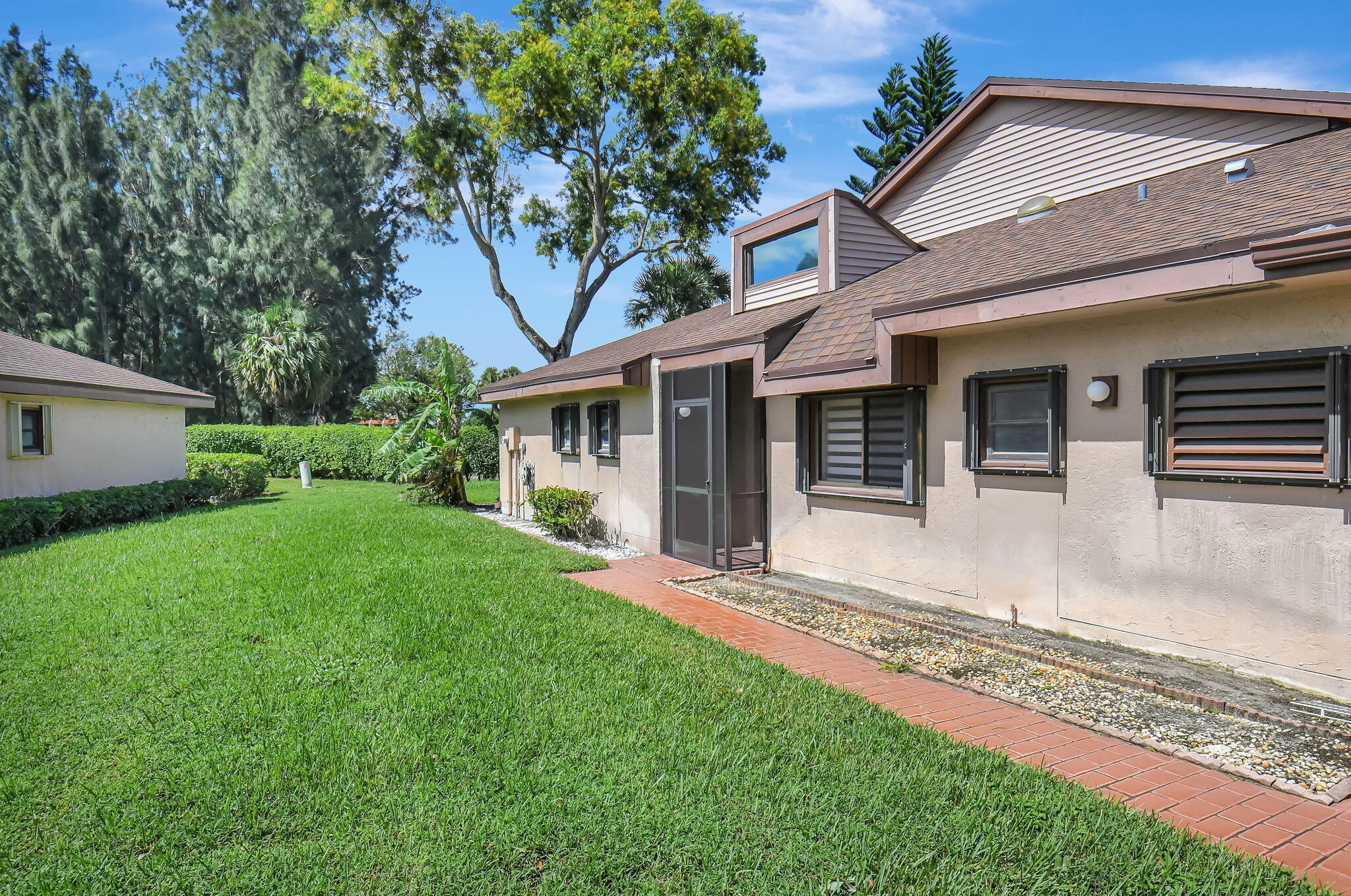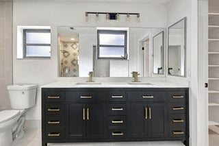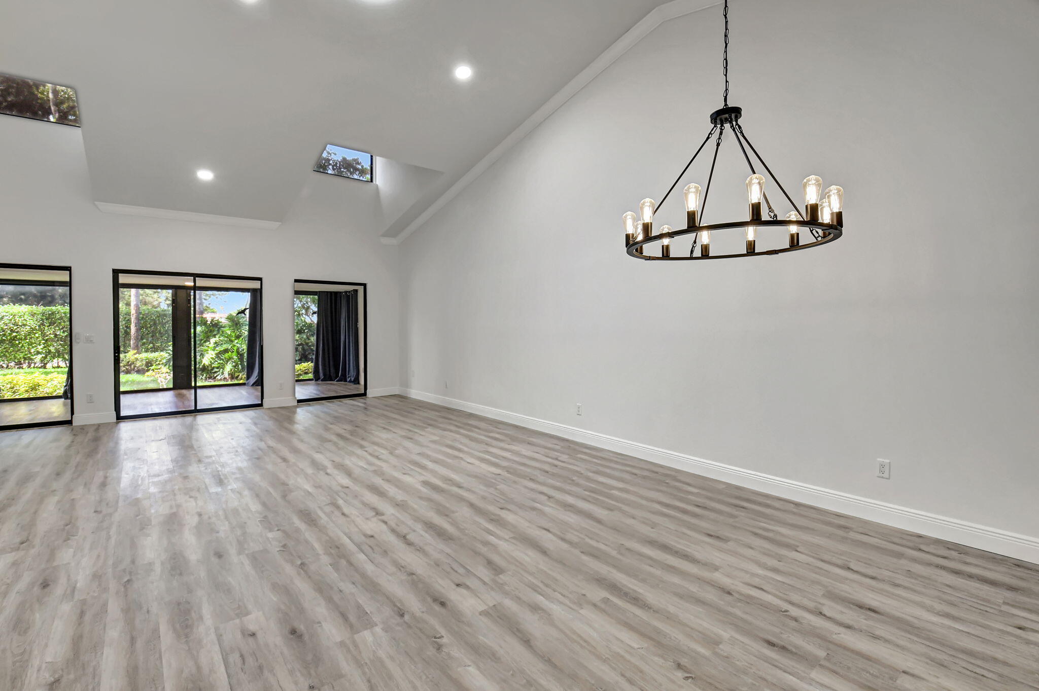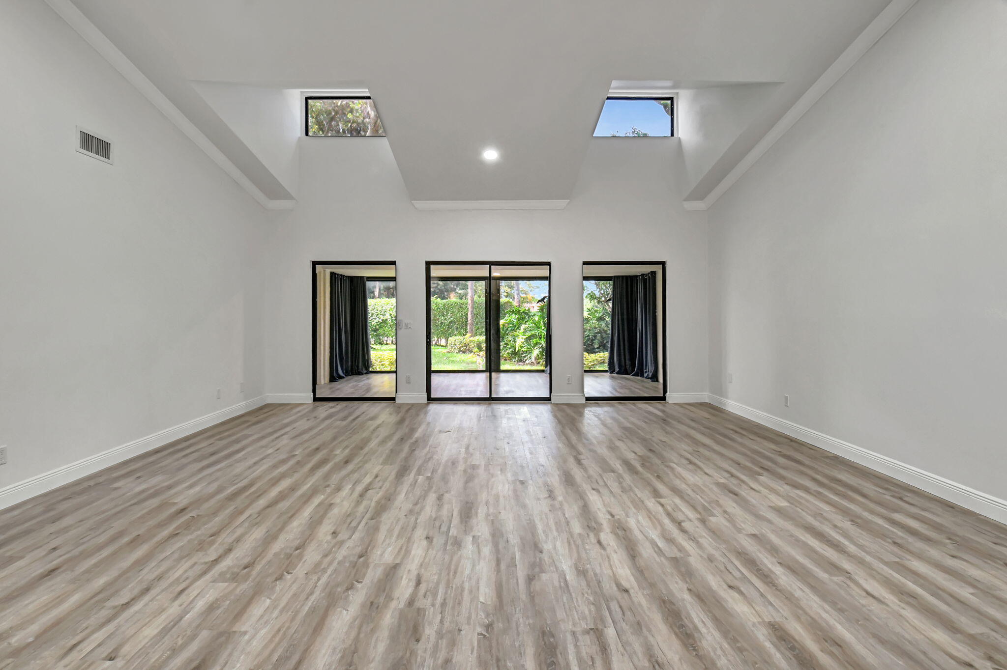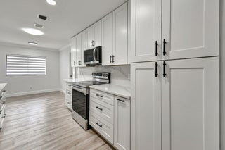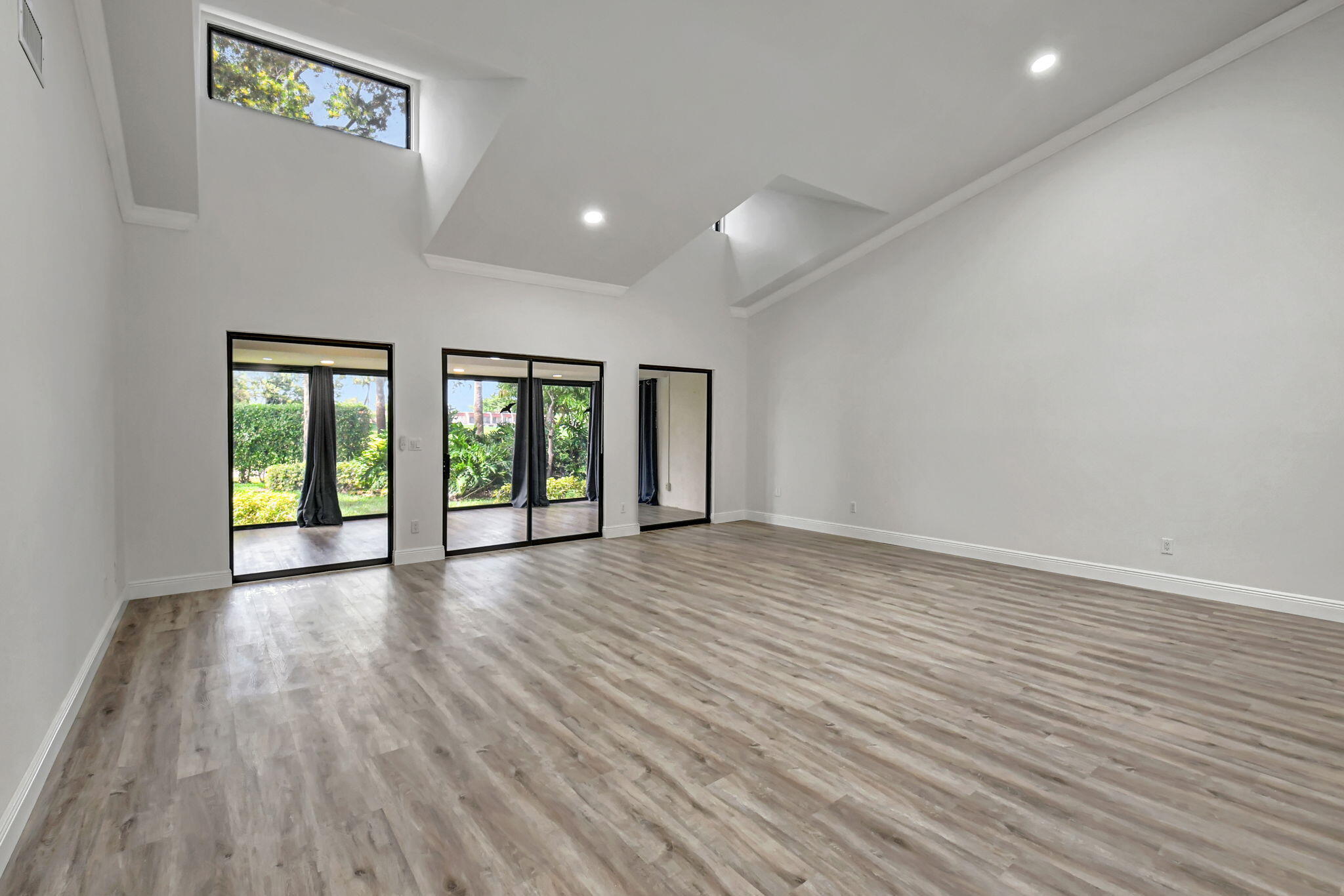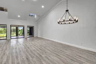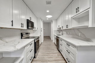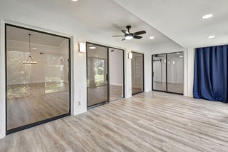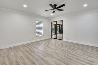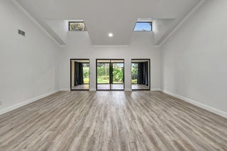Tastefully remodeled 3BR/2.5BA villa in The Fountains of Palm Beach, Versailles Court section. Bright, spacious layout with vaulted ceilings, skylights, and modern finishes. Updated kitchen with white wood cabinets, quartz counters, and new stainless steel appliances. Primary bath features freestanding tub filler and frameless glass shower. Laminate flooring throughout. Backyard overlooks golf course. Community offers 3 pools. All ages welcome. Move-in requires first month, last month, and security deposit. Easy to show--schedule via ShowingTime.