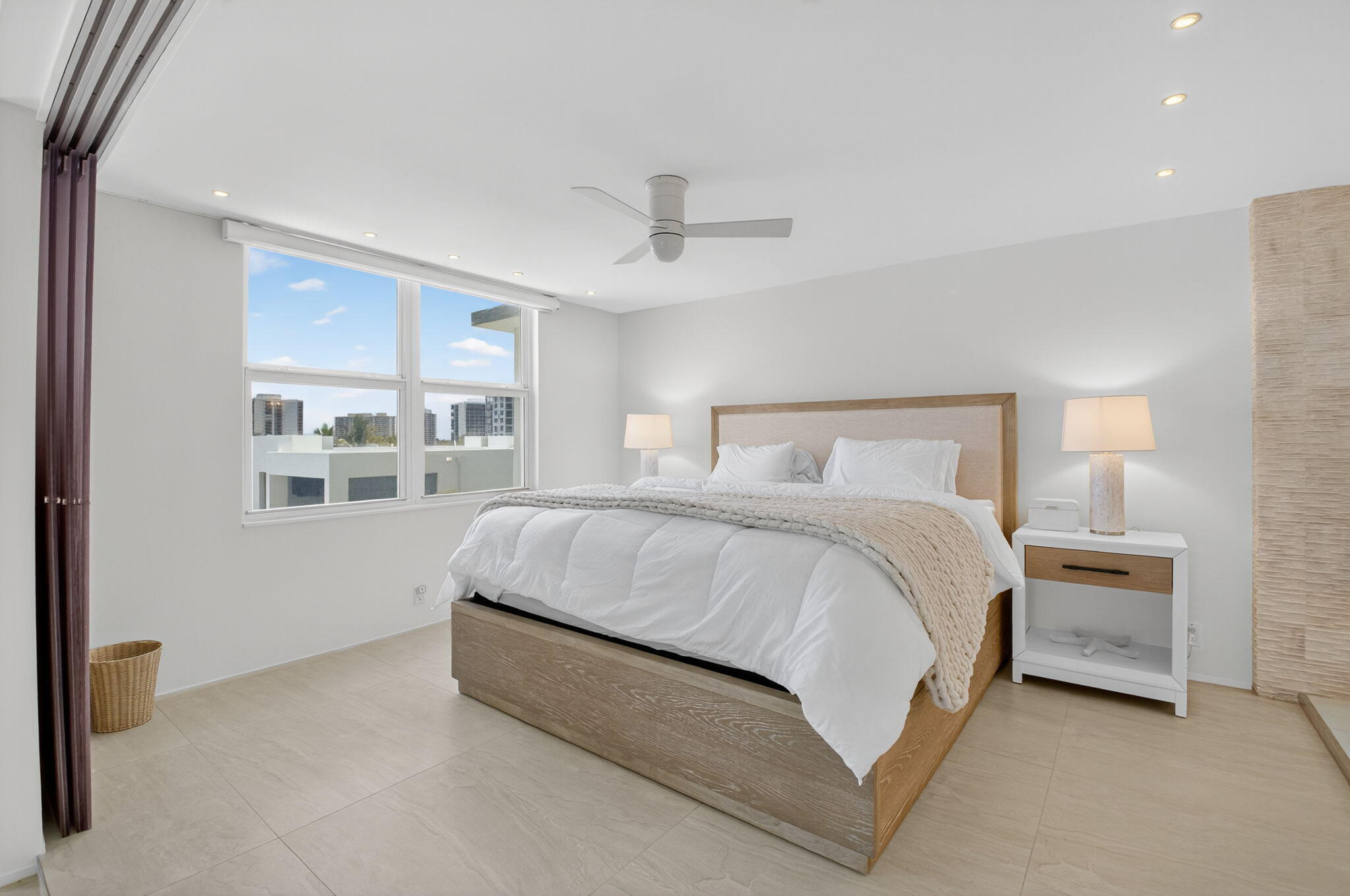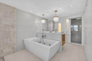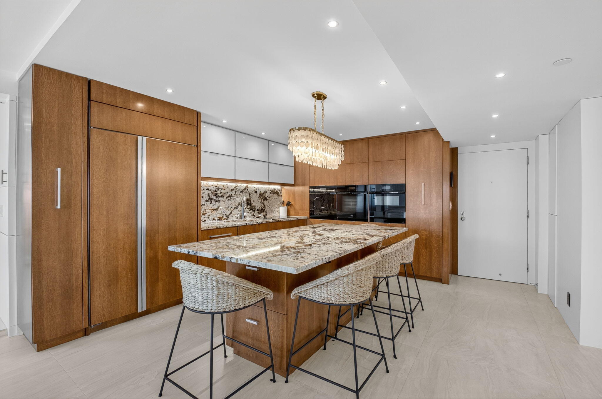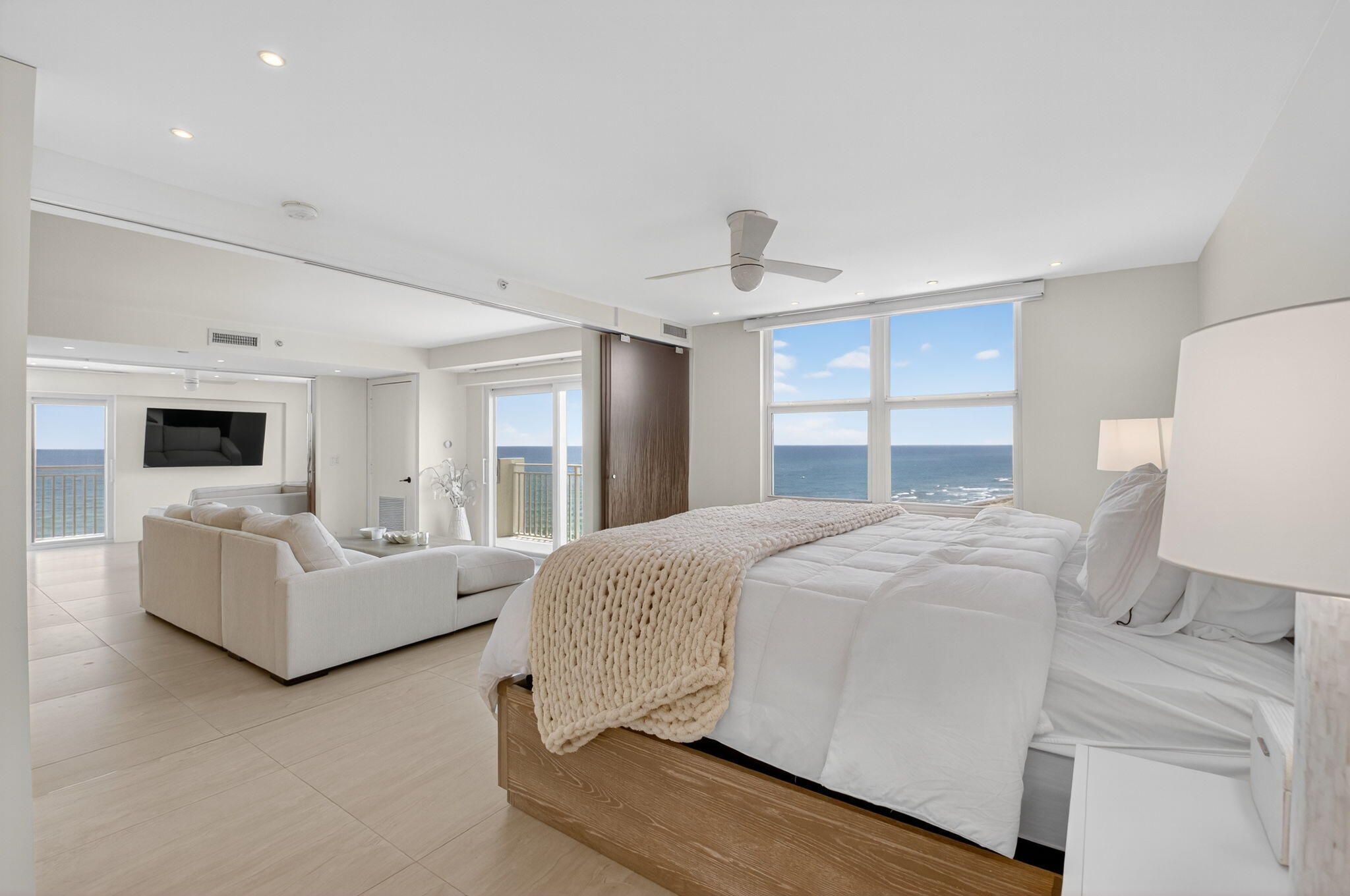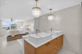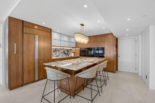 Coastal Luxury Living Redefined. Situated directly on the oceanfront, Residence 507 offers sophisticated living with uninterrupted ocean views from every room, including the primary bath. This fully integrated smart home captures the essence of coastal elegance, with two private balconies perfectly positioned for sunrise and sunset.The custom kitchen is the true centerpiece, designed for both function and entertaining, and appointed with Miele, Bosch, and Sub-Zero appliances, bespoke wood cabinetry, and an oversized island with seating for ten. Floor-to-ceiling glass doors frame the living space, creating a seamless connection between polished interiors and the breathtaking beauty of the ocean.