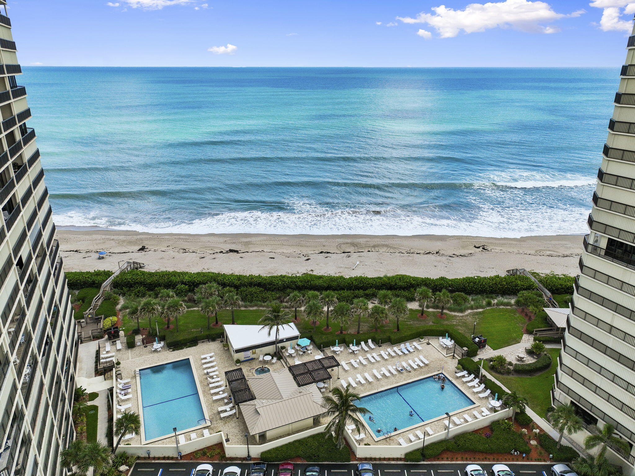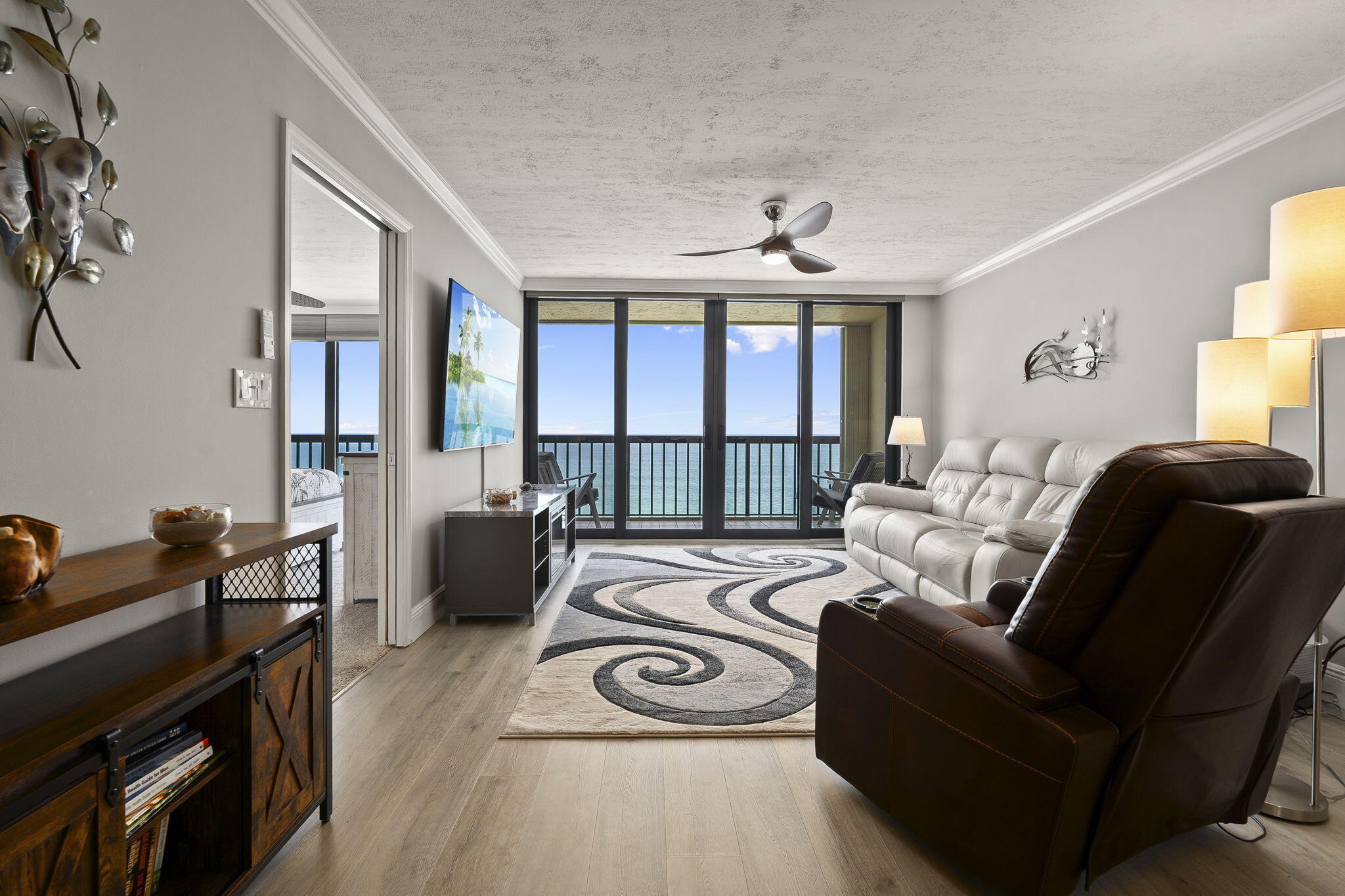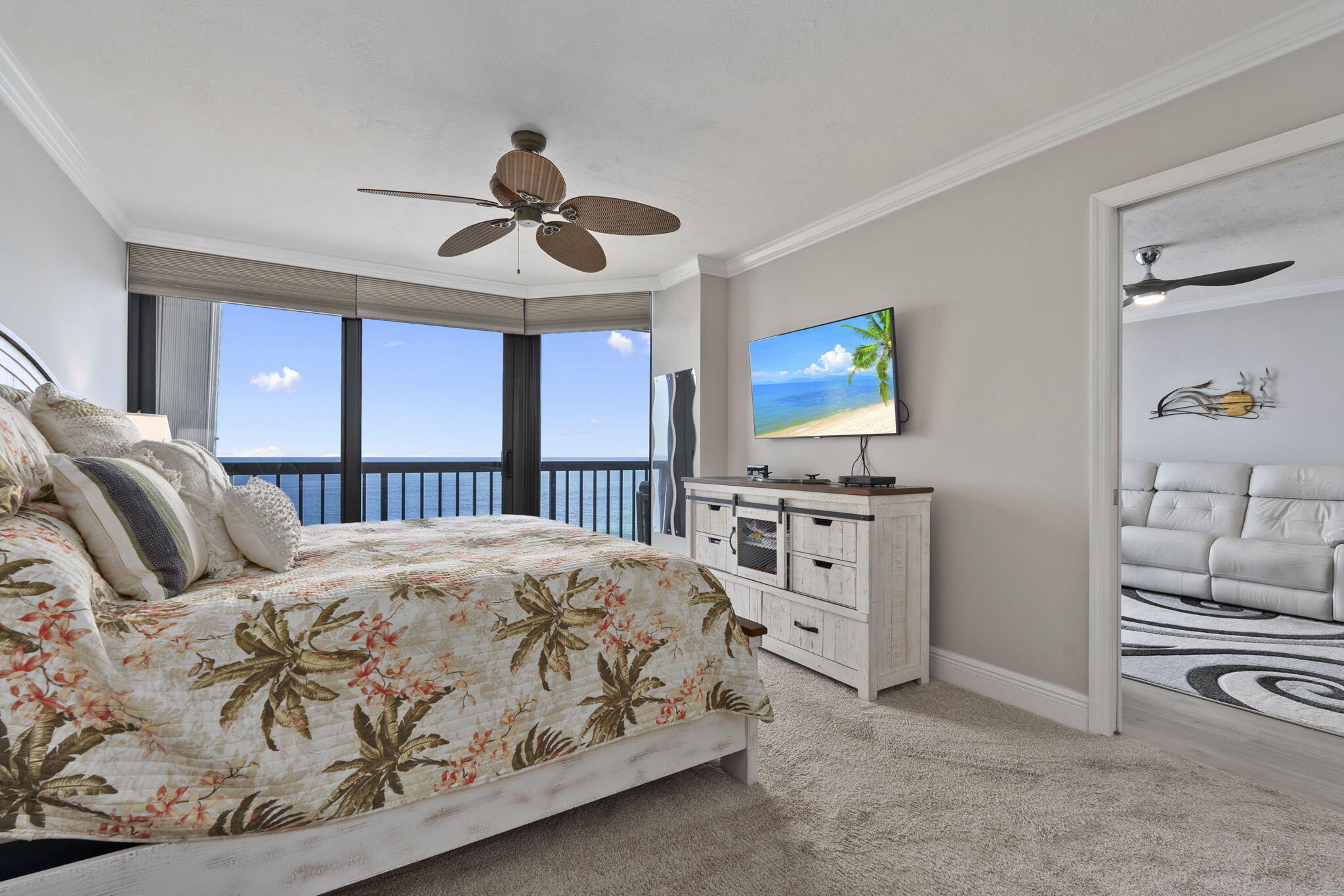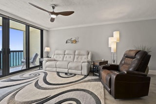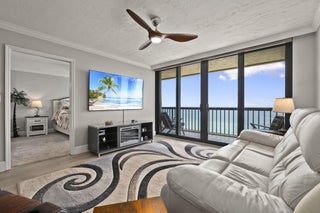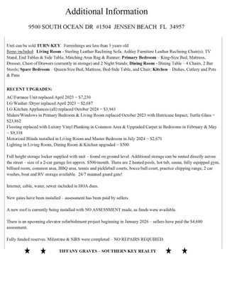 Priced below market value with $50k in recent upgrades & priced $20k below what sellers paid! This unit IS priced to sell! It is immaculate, truly move-in ready, and can be sold TURN-KEY (Fully furnished with linens, towels, dishes, cutlery, & pots/pans.) You can walk in & start living! Improvements within last 2 yrs include: Impact turtle glass sliders-primary bedroom/living room; NEW: AC/furnace; all LG stainless-steel kitchen appliances & full-size LG washer/dryer; upgraded flooring; remote-controlled motorized blinds & updated lighting. Solid wood cabinetry with roll-out drawers, granite countertops, full-size walk-in closet in primary bedroom, dual sinks in primary bath. Guest bedroom converts to en-suite with pull-out door for guest privacy.Spacious roomsizes/office area.15 th floor ocean view, direct ocean/beach access. Required building inspections done - no repairs required. Amenities galore. See feature sheet for more information.