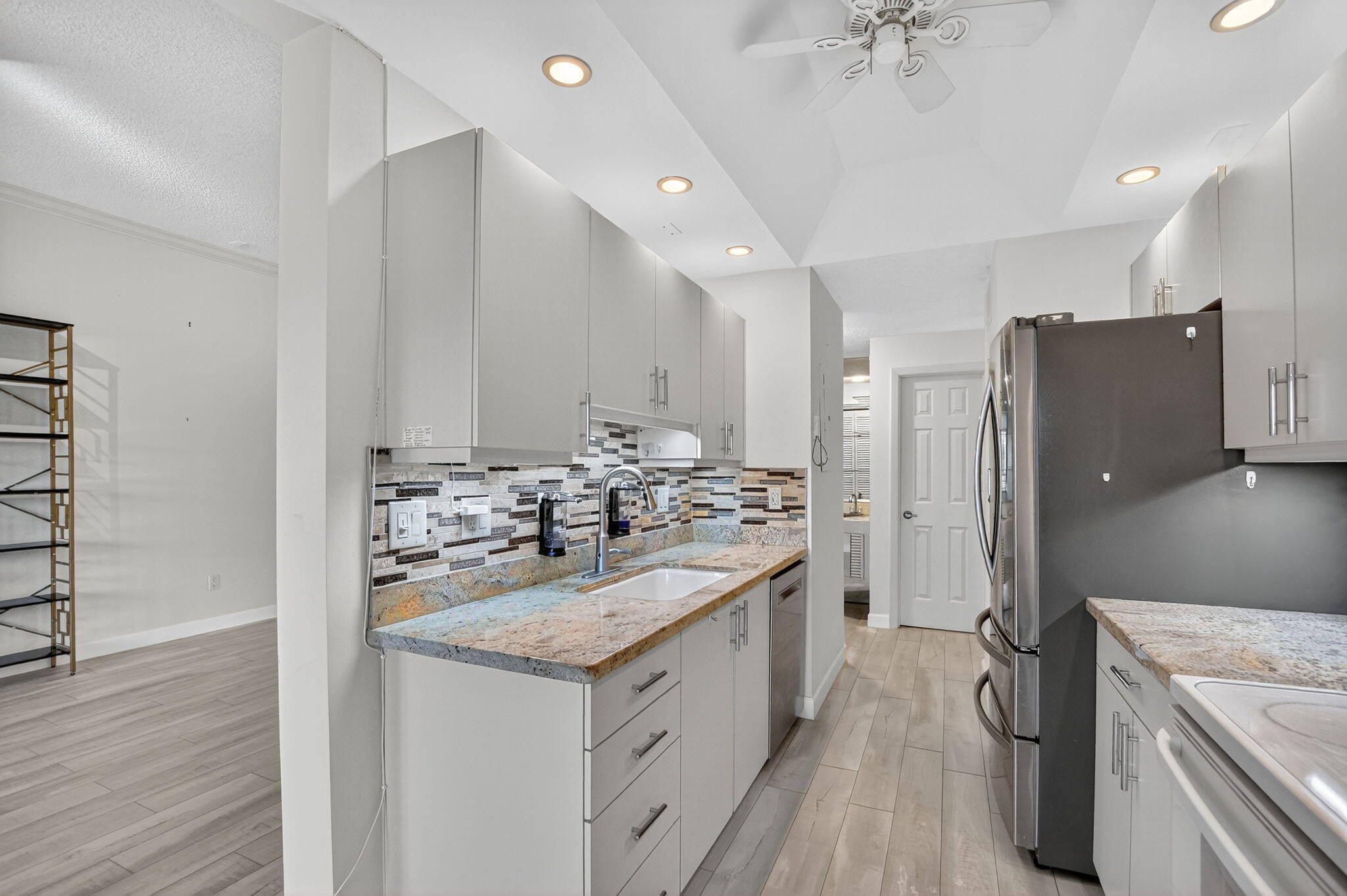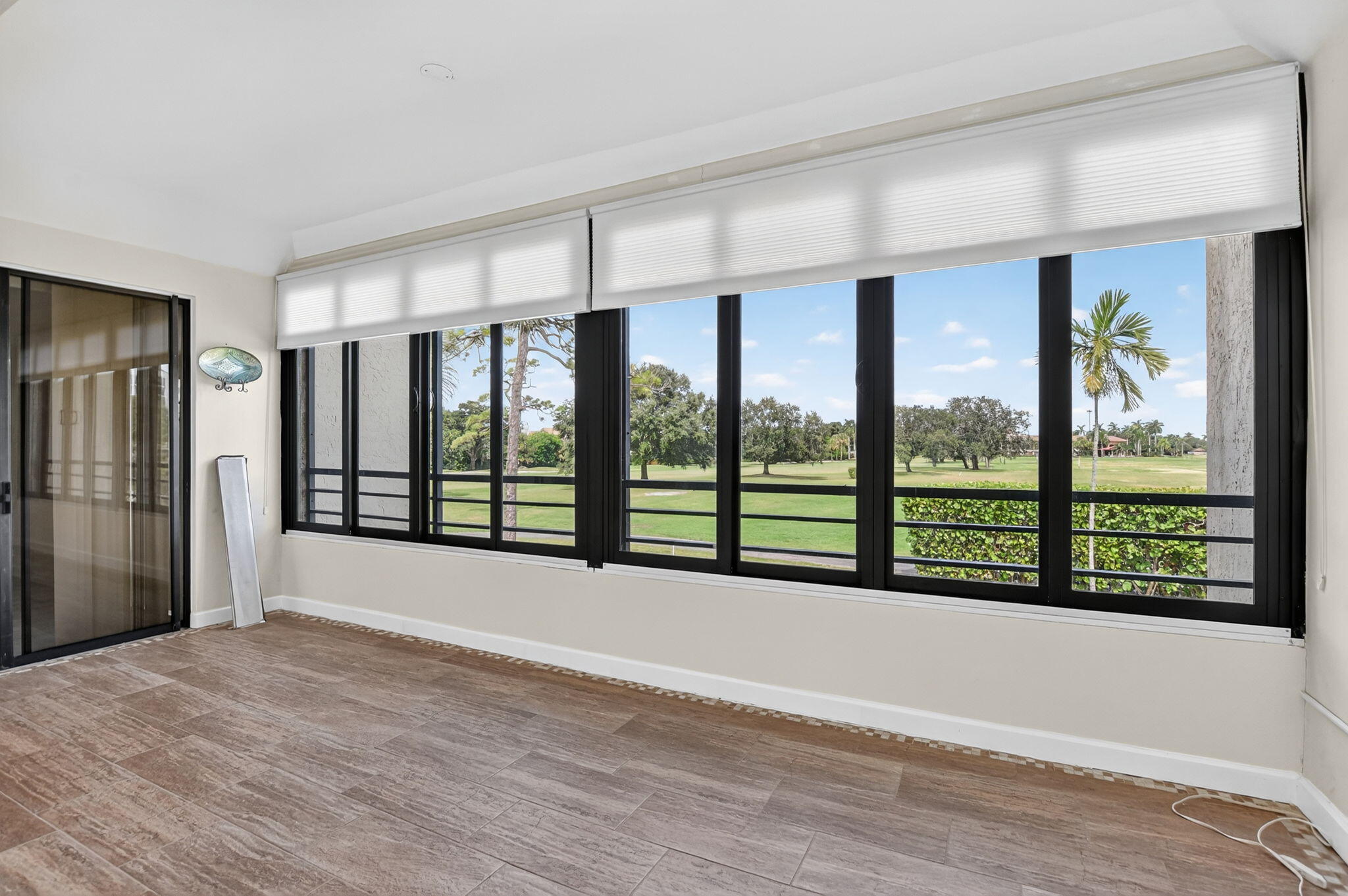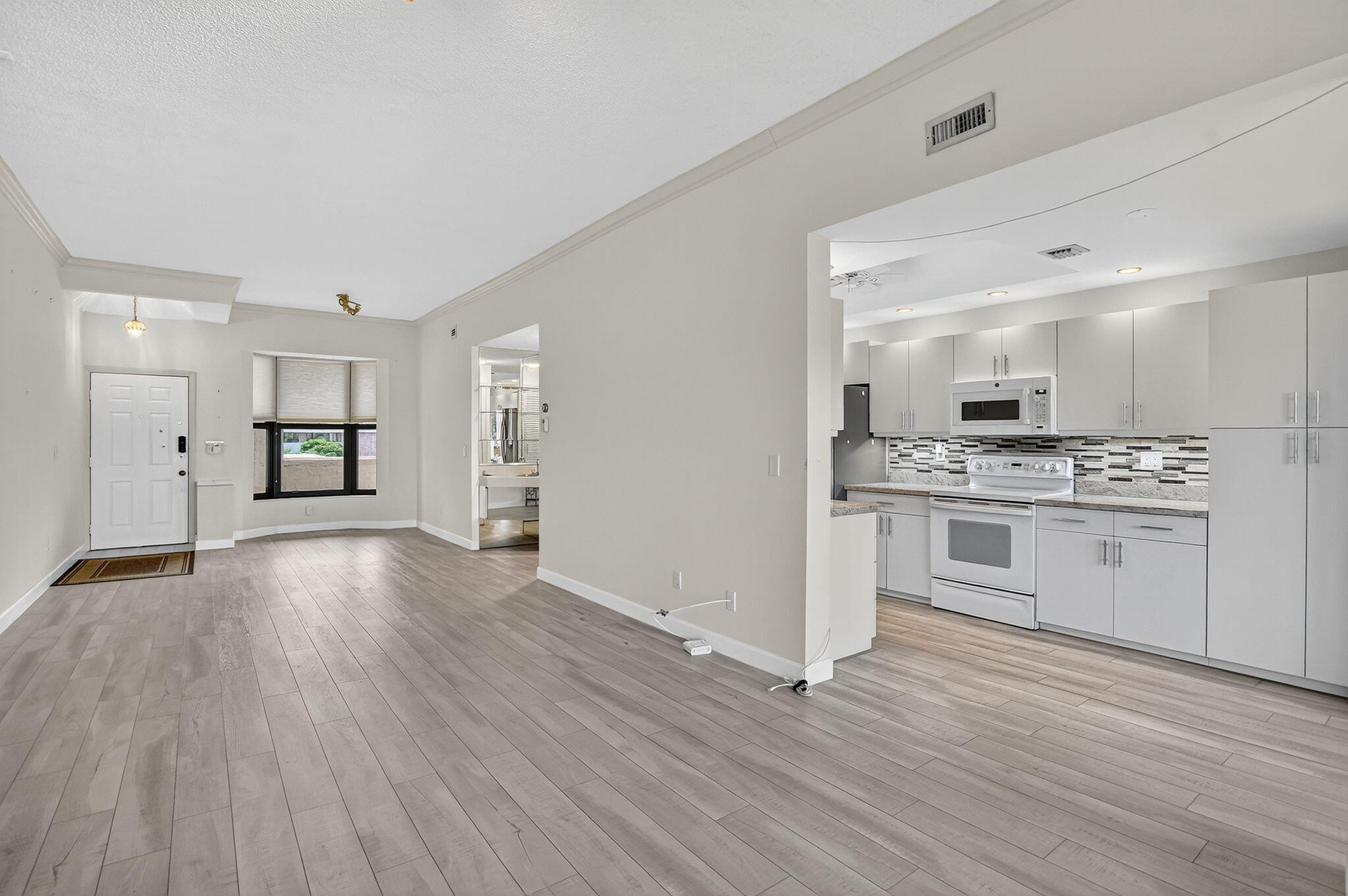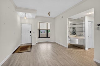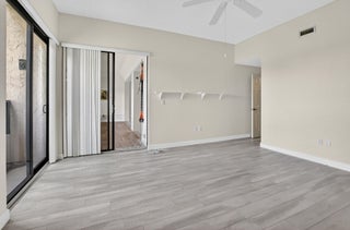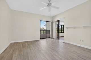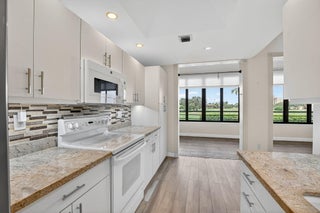 Spacious and fully expanded 2/2 condo in desirable La Paz at Boca Pointe, offering beautiful golf course views and ideal eastern exposure. All windows are protected with impact glass, and all plumbing pipes have been replaced. Interior features laminate flooring throughout and an updated kitchen with granite countertops, modern cabinetry, and stainless steel appliances. Master suite includes a large walk-in closet with custom built-ins and a renovated bathroom with white subway tile, separate tub, and shower. 2nd bedroom offers a custom closet with built-in shelving and convenient access to the updated guest bathroom with walk-in shower. Newer front-loading washer and dryer. La Paz offers two tennis courts, two swimming pools, and a charming clubhouse for residents to enjoy.
