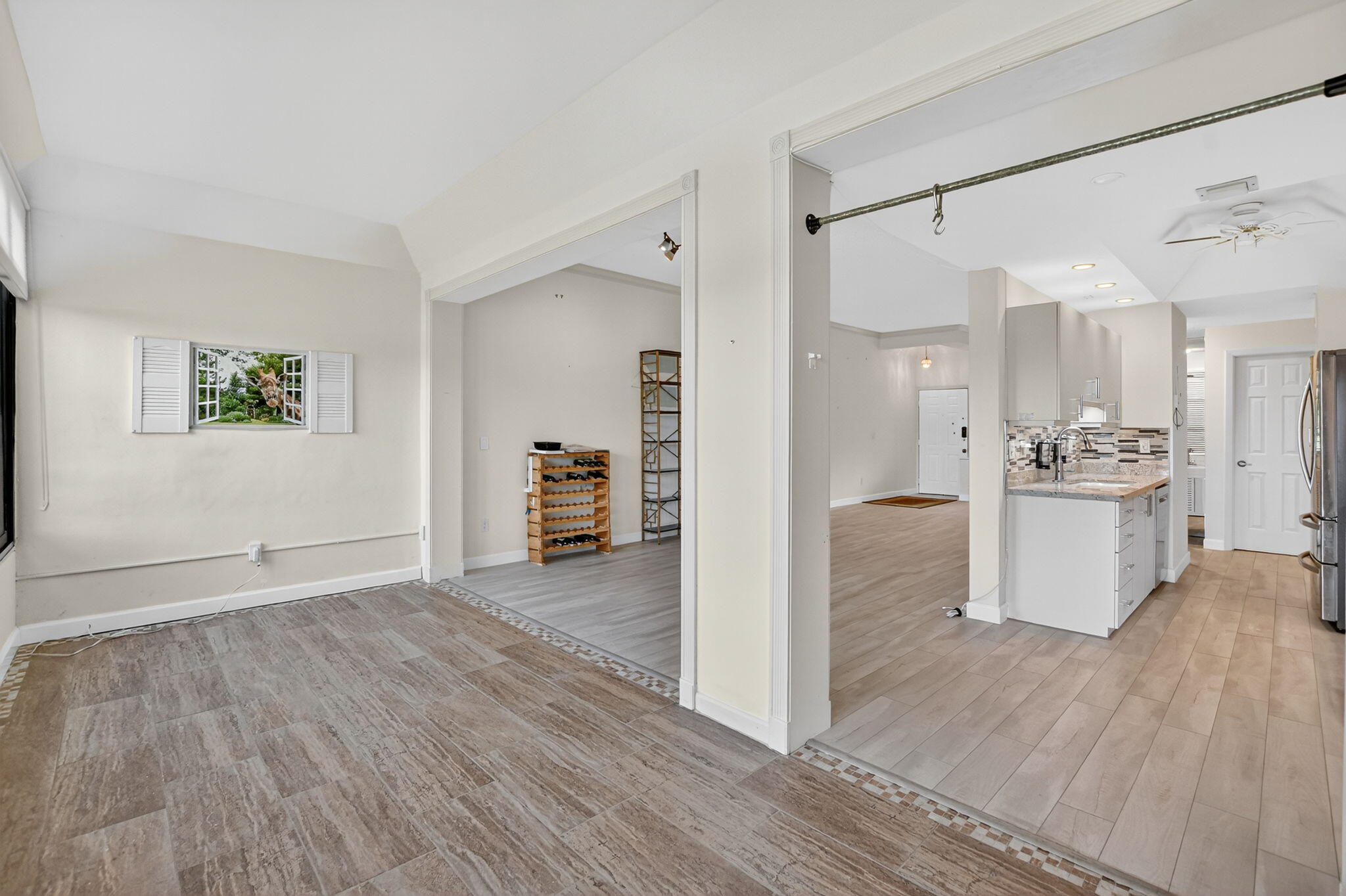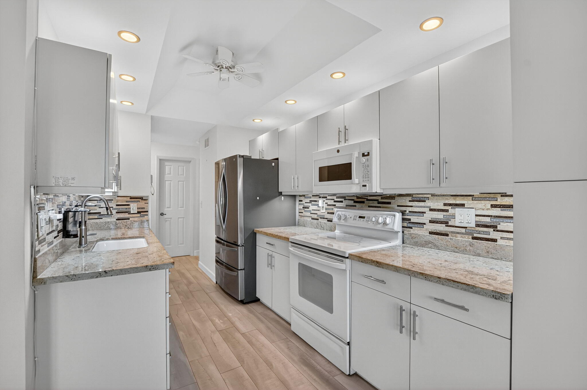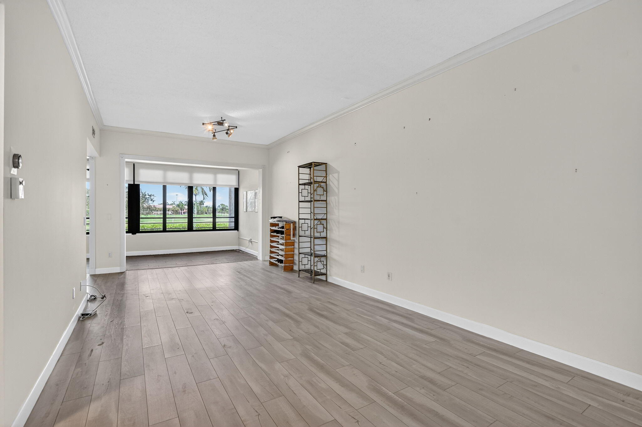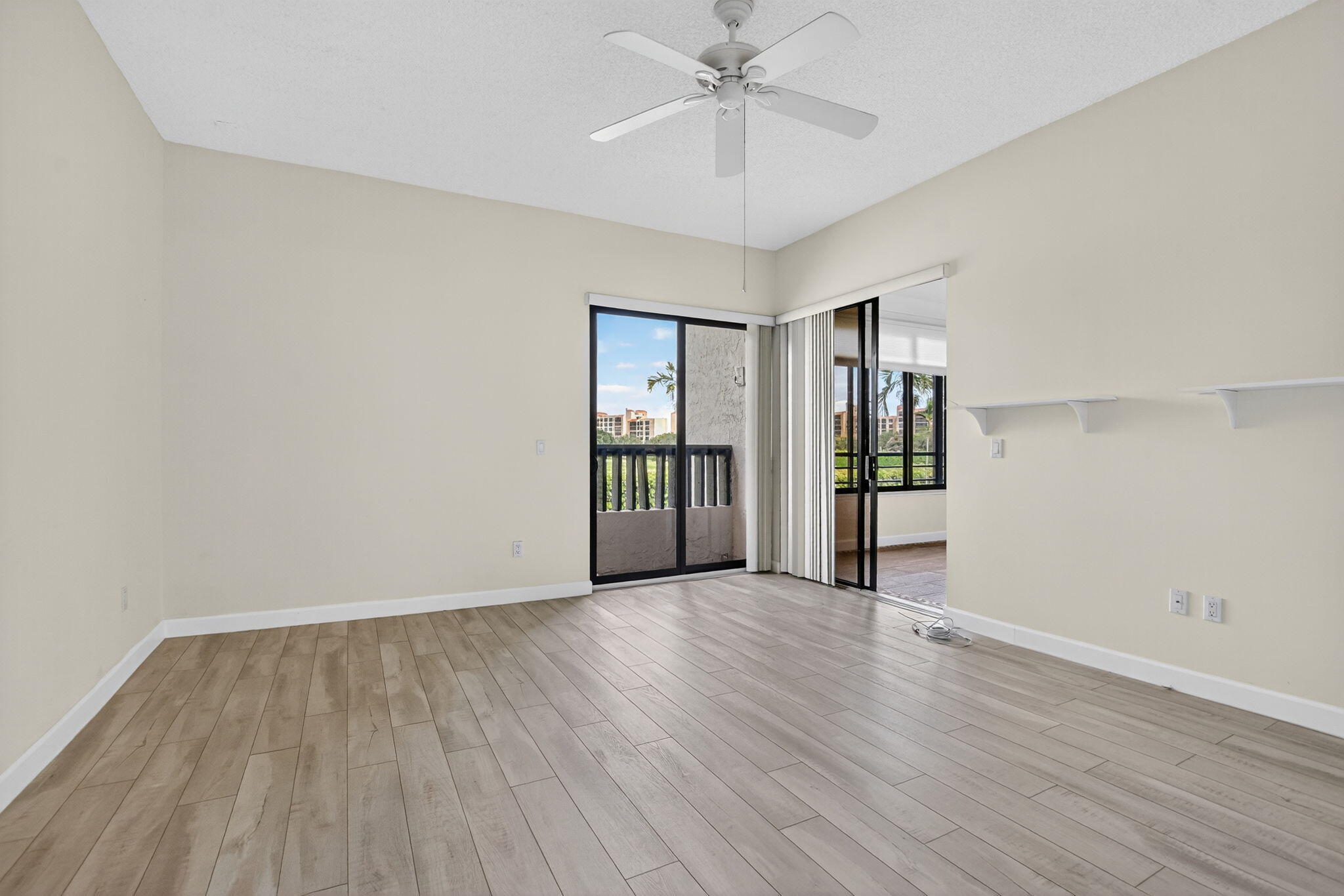 Spacious and fully expanded 2/2 condo in desirable La Paz at Boca Pointe, offering beautiful golf course views and ideal eastern exposure. All windows are protected with impact glass, and all plumbing pipes have been replaced. Interior features laminate flooring throughout and an updated kitchen with granite countertops, modern cabinetry, and stainless steel appliances. Master suite includes a large walk-in closet with custom built-ins and a renovated bathroom with white subway tile, separate tub, and shower. 2nd bedroom offers a custom closet with built-in shelving and convenient access to the updated guest bathroom with walk-in shower. Newer front-loading washer and dryer. La Paz offers two tennis courts, two swimming pools, and a charming clubhouse for residents to enjoy.