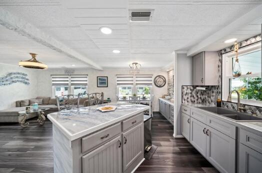 FULLY REMODELED & MINI GREEN for PETS at this 2 bed/2 bathroom beauty where SAFETY FEATURES merge w/ SOPHISTICATION. Don't miss this home which outshines the rest! BUILT FOR STRENGTH &SOPHISTICATION. LIST OF NEW Items includes but not limited to:DOUBLE HUNG, IMPACT WINDOWS w/ CUSTOM SHADES, SUBFLOORING w/ LUXURY VINYL PLANK FLOORS, DRYWALL, ENTIRE KITCHEN, APPLIANCES, ENTIRE MASTERBATH, Pantry w/ PULL-OUT drawers, CUSTOM DOORS, HAND CRAFTED STONE MIRROR. Fully enclosed Florida Rm doubles as den/extra bedroom/home office. AC 2020. ROOF Painted & SEALED 2024. Fireplace & 60''TV STAY. Stone Patio perfect for lounging/hosting & Grass area perfect for PUPS! Active 55 + community - Lot Lease of 765 incl trash, Clubhouse, fitness, game room, pool, hot tub, library, billiards & more!