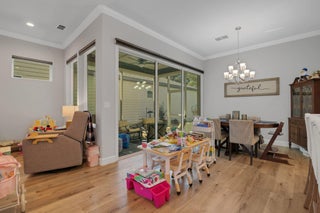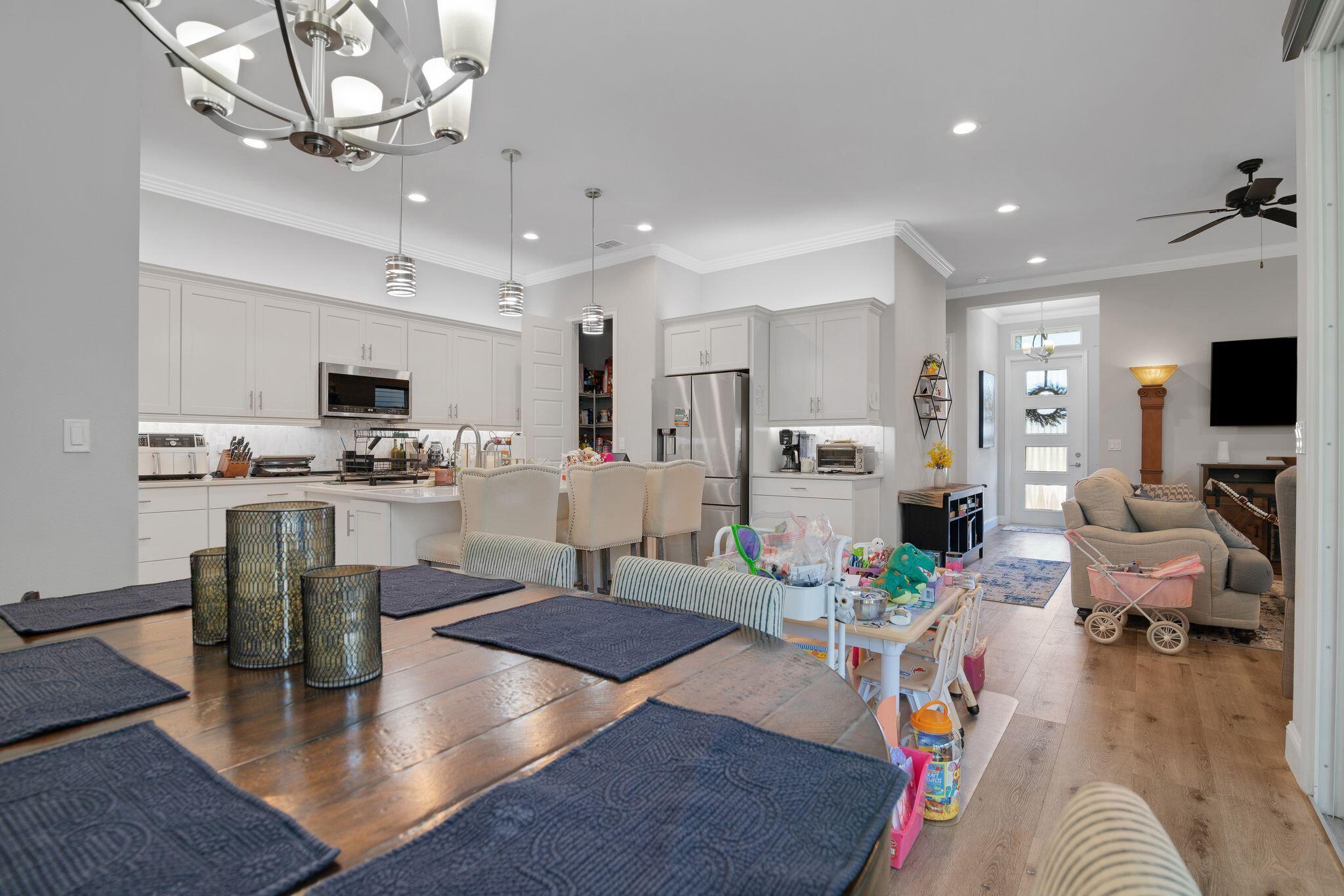 Step into this stunning 2020-built home in the highly desirable Grand Preserve of Kanapaha. Modern 2-story with 4 beds, 3 baths, and 2-car garage. Features luxury vinyl plank flooring throughout, crown molding, high-volume and tray ceilings, and innovative collapsing wall slider leading to a screened patio. The main level boasts a flowing open floor plan with a bedroom and full bath, while the upper level showcases versatile loft, primary en-suite with two walk-in closets, double vanity, and glass frameless shower. The chef's kitchen is a highlight, with quartz countertops, tiled backsplash, under-counter lighting, pantry, and spacious island with storage and seating. HOA includes cable, internet, front yard landscaping, pool, clubhouse, billiards. A must see!