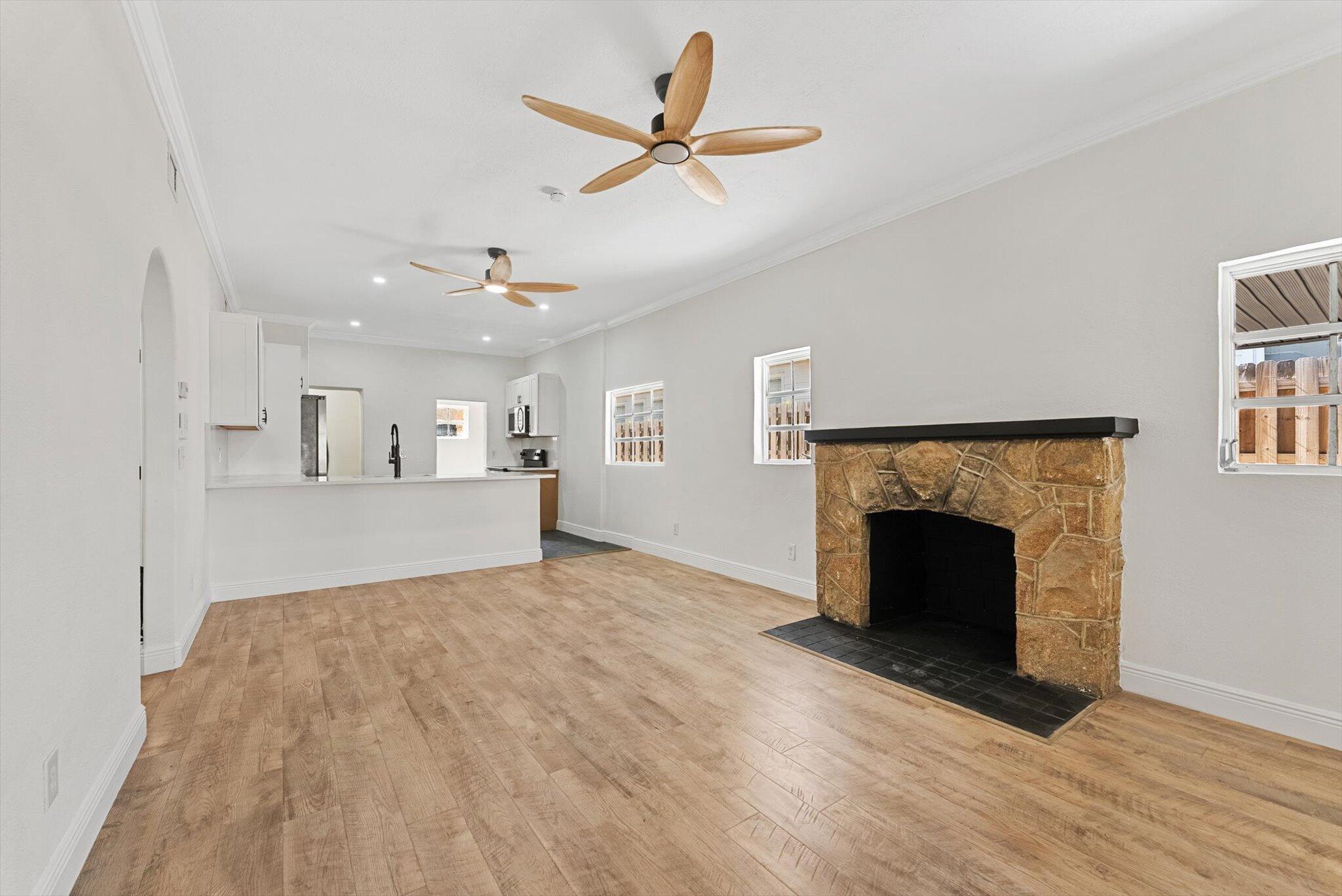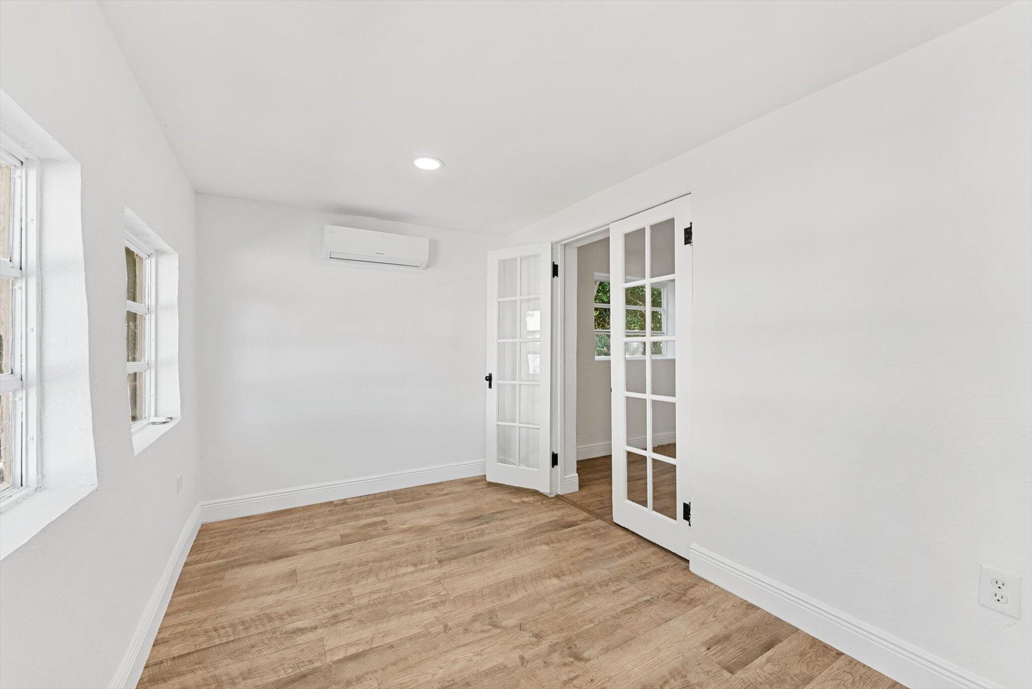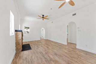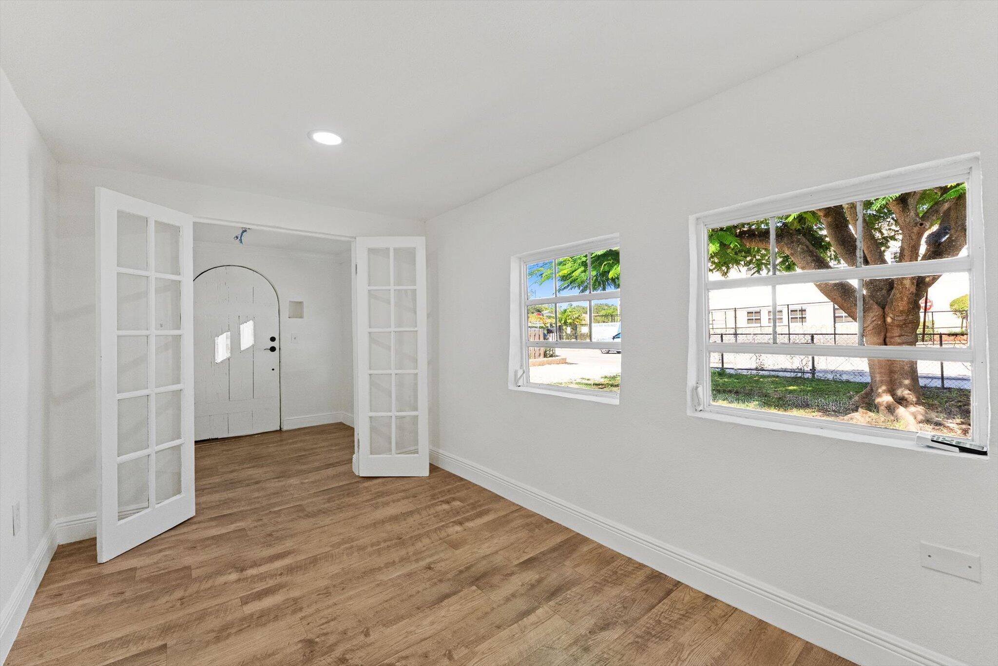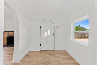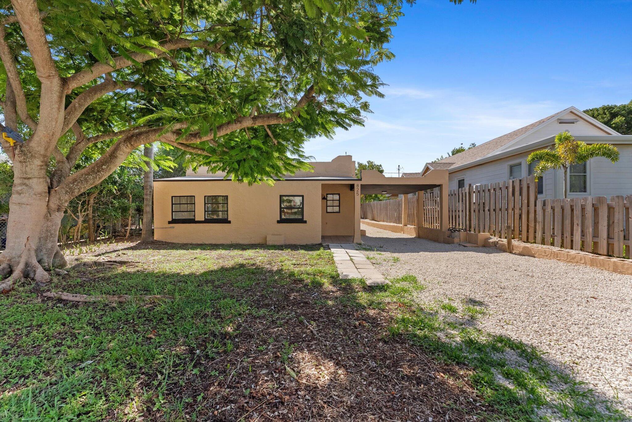 This beautifully renovated Spanish-style home in Lake Worth Beach features three bedrooms and one bathroom. The residence seamlessly blends original charm with modern upgrades, including an arched solid wood front door and a French door leading to the versatile third bedroom or office. The kitchen is equipped with elegant white upper cabinets, wood lower cabinetry, and stunning quartz countertops. A fireplace enhances the living room, while the spacious bedrooms offer ample comfort; the third bedroom is ideal for use as an office. Additional highlights include a large backyard and a detached garage with original barn doors. the Property has Been updated with a new roof and air conditioning system.