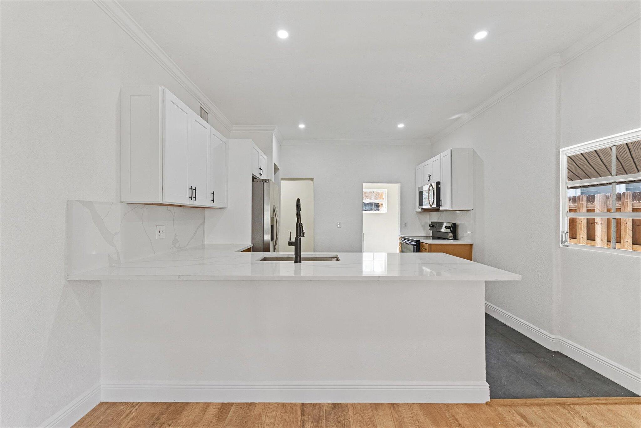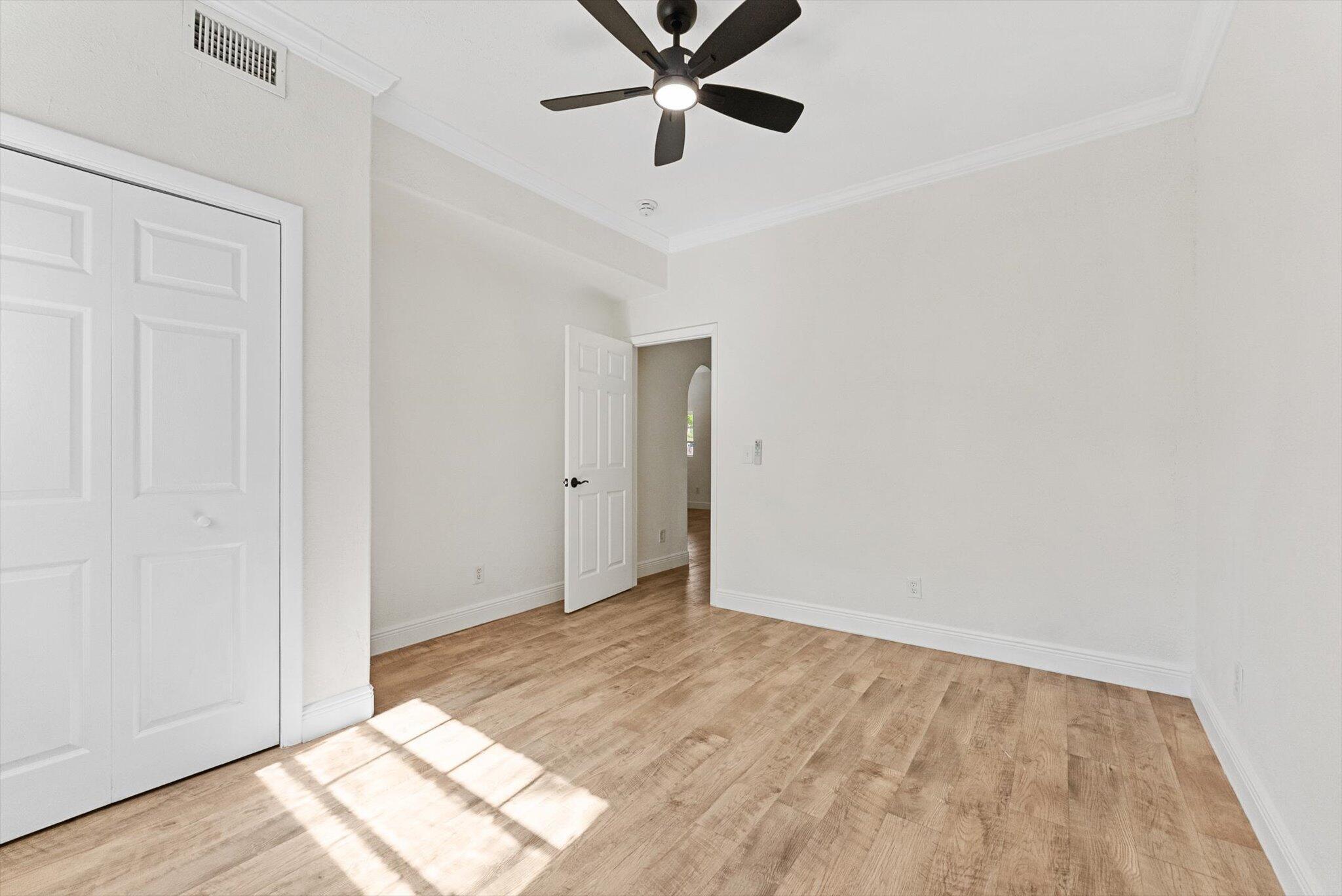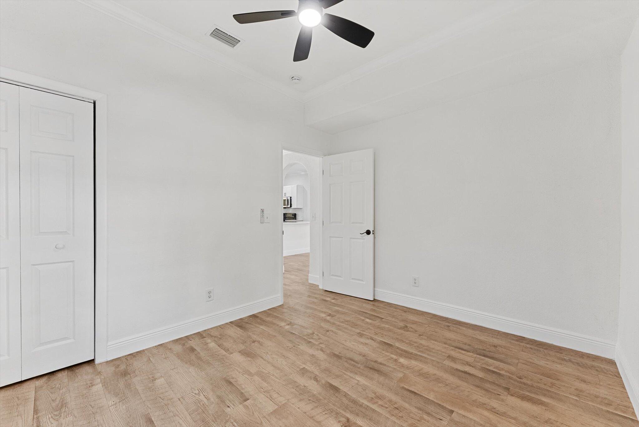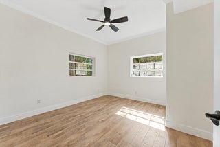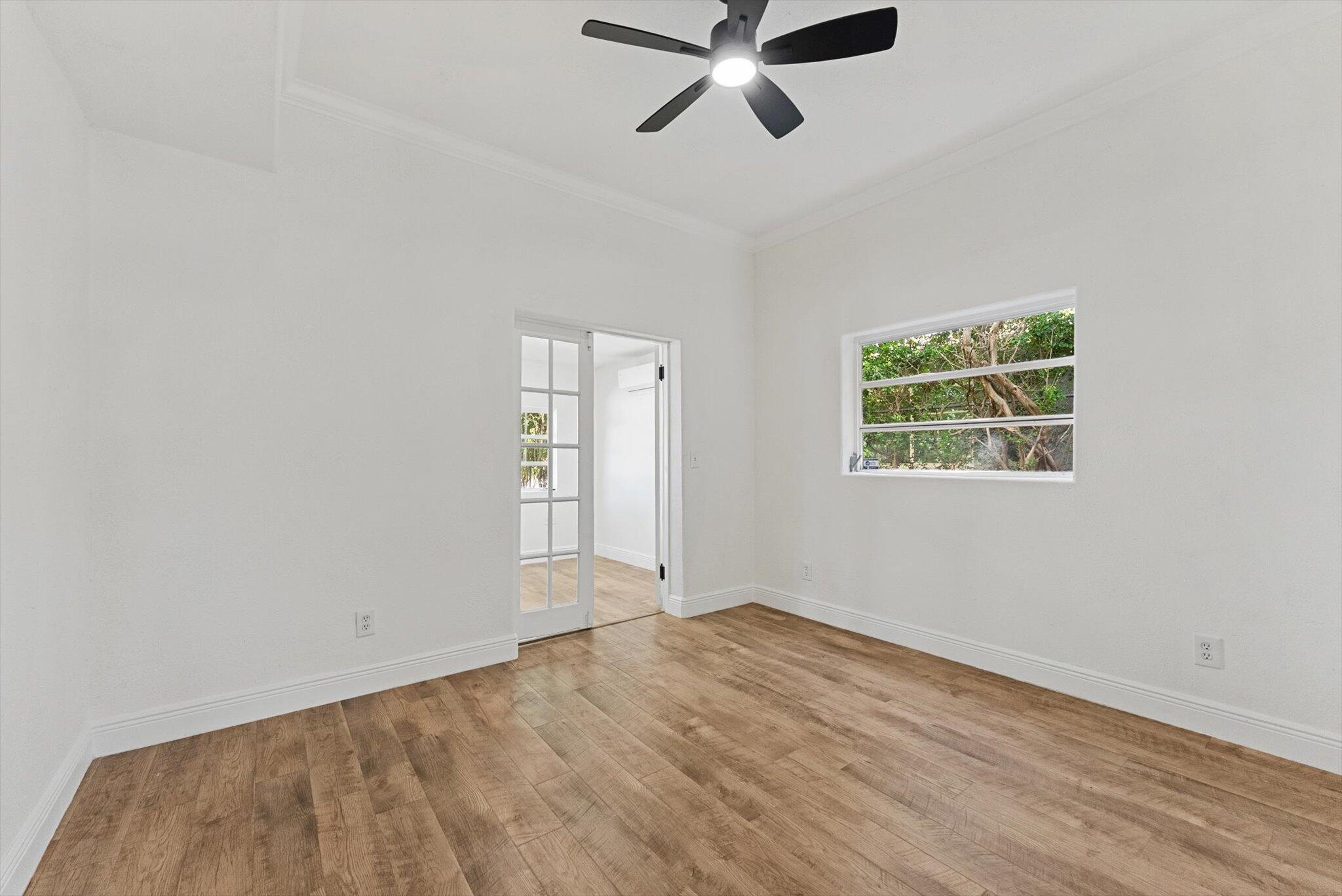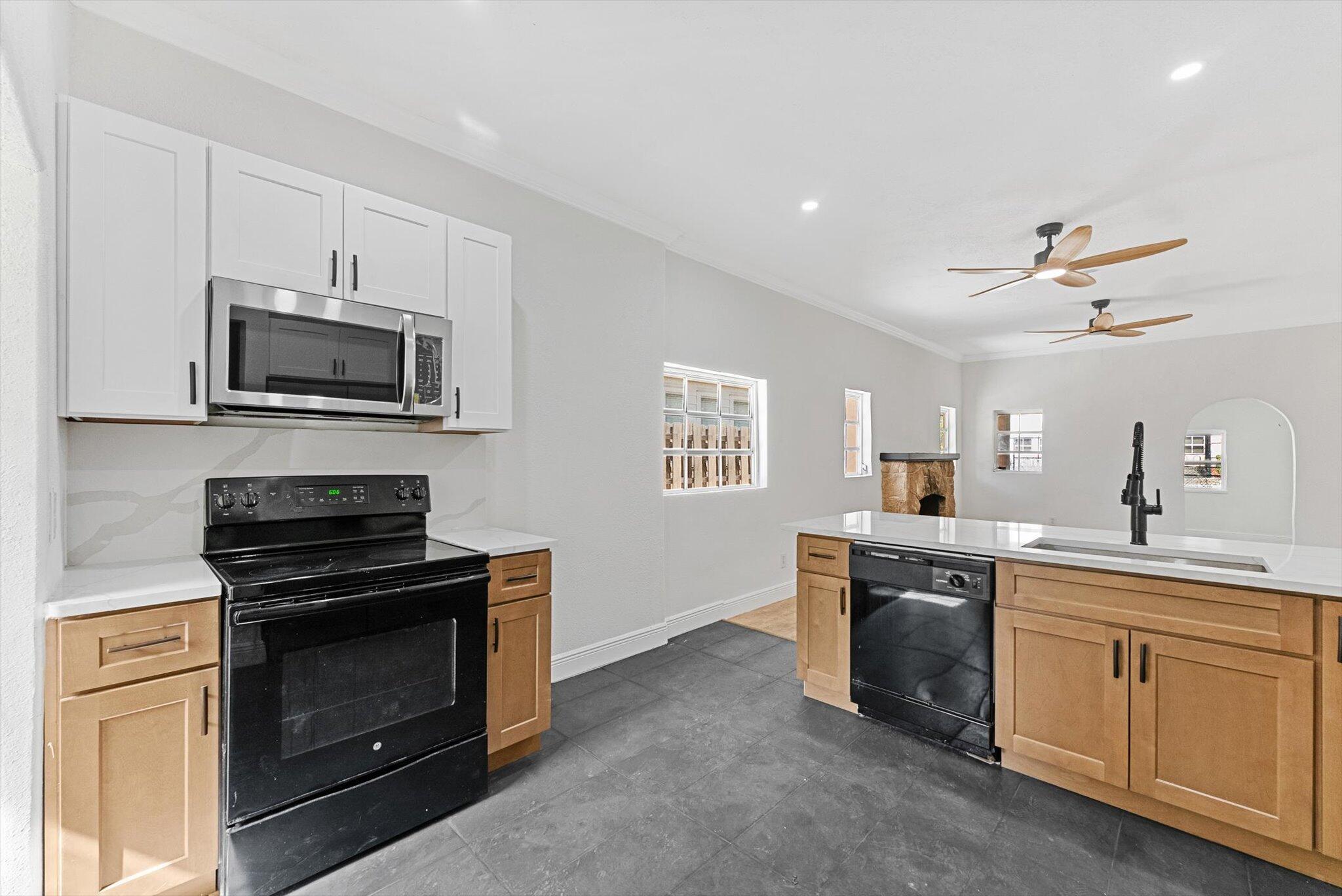 This beautifully renovated Spanish-style home in Lake Worth Beach features three bedrooms and one bathroom. The residence seamlessly blends original charm with modern upgrades, including an arched solid wood front door and a French door leading to the versatile third bedroom or office. The kitchen is equipped with elegant white upper cabinets, wood lower cabinetry, and stunning quartz countertops. A fireplace enhances the living room, while the spacious bedrooms offer ample comfort; the third bedroom is ideal for use as an office. Additional highlights include a large backyard and a detached garage with original barn doors. the Property has Been updated with a new roof and air conditioning system.