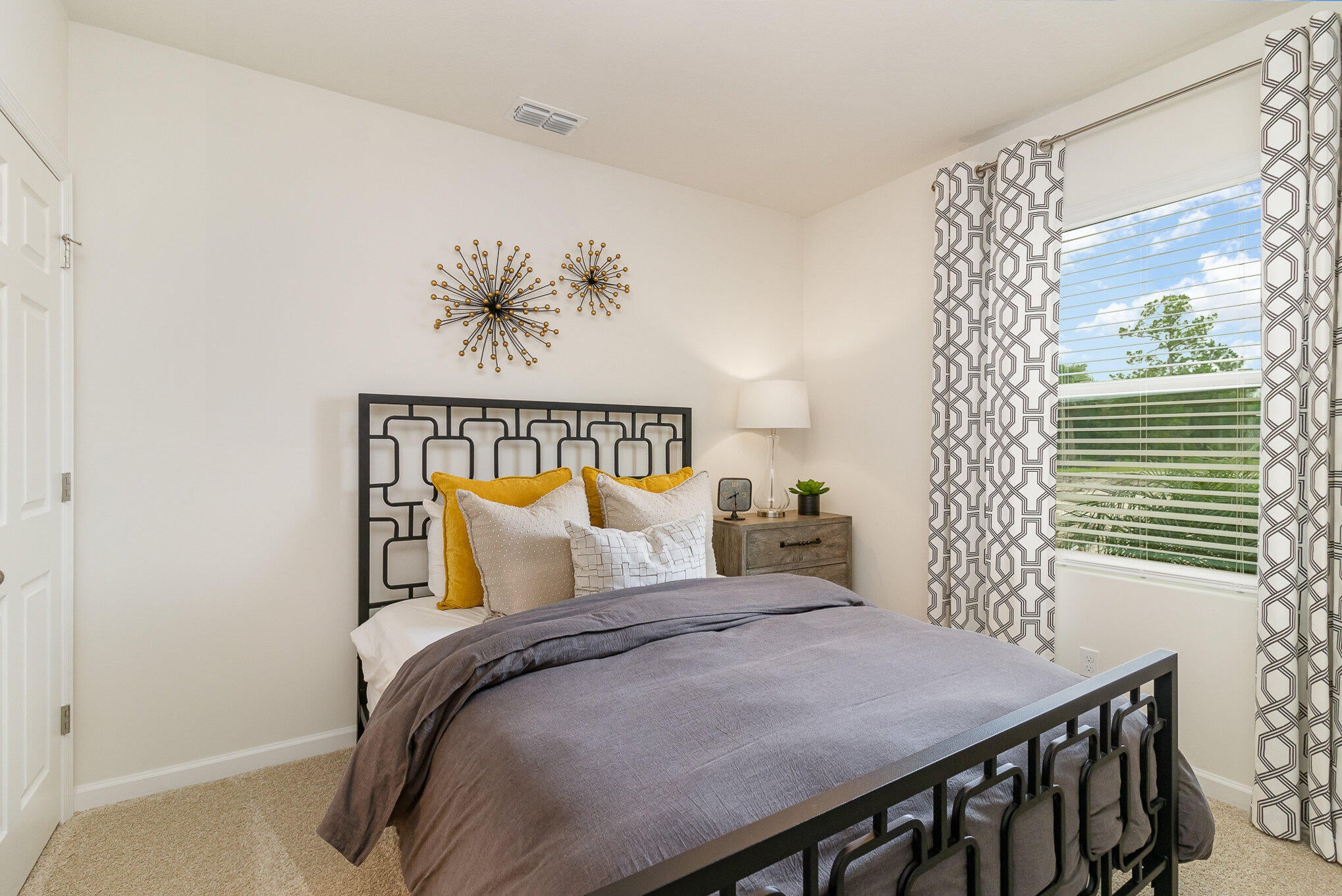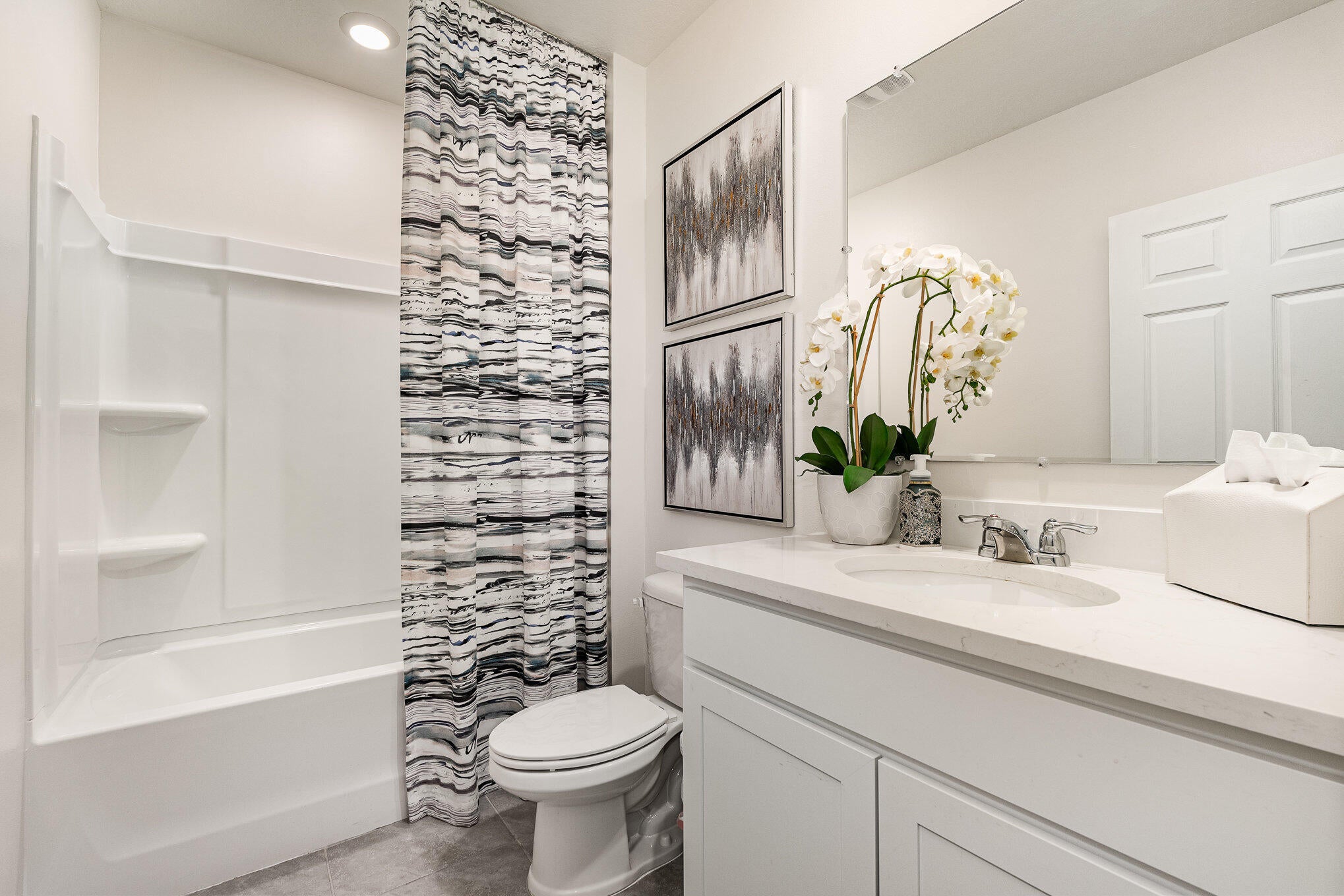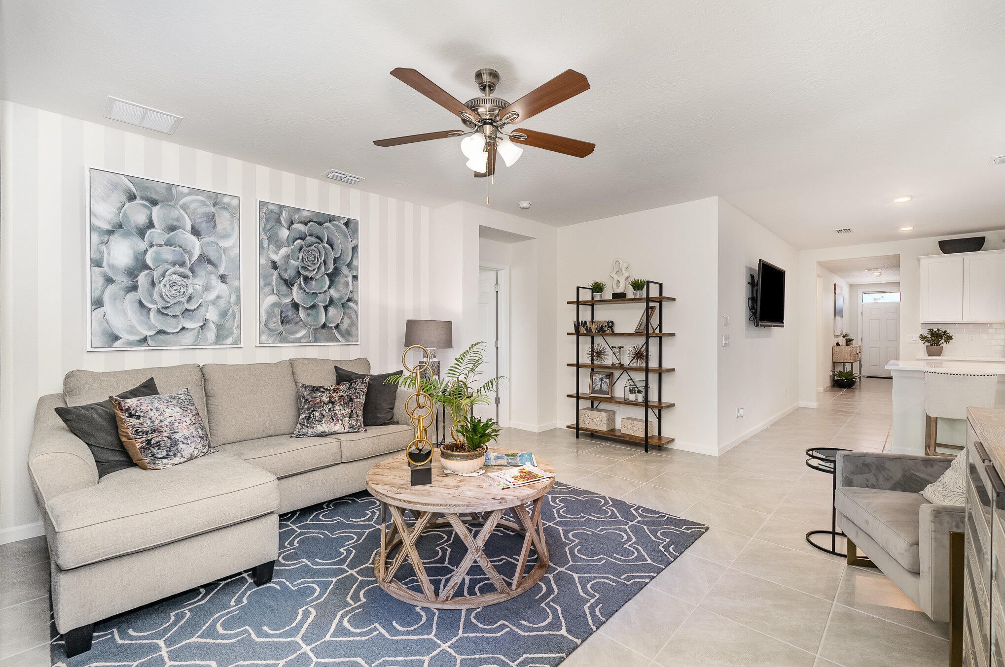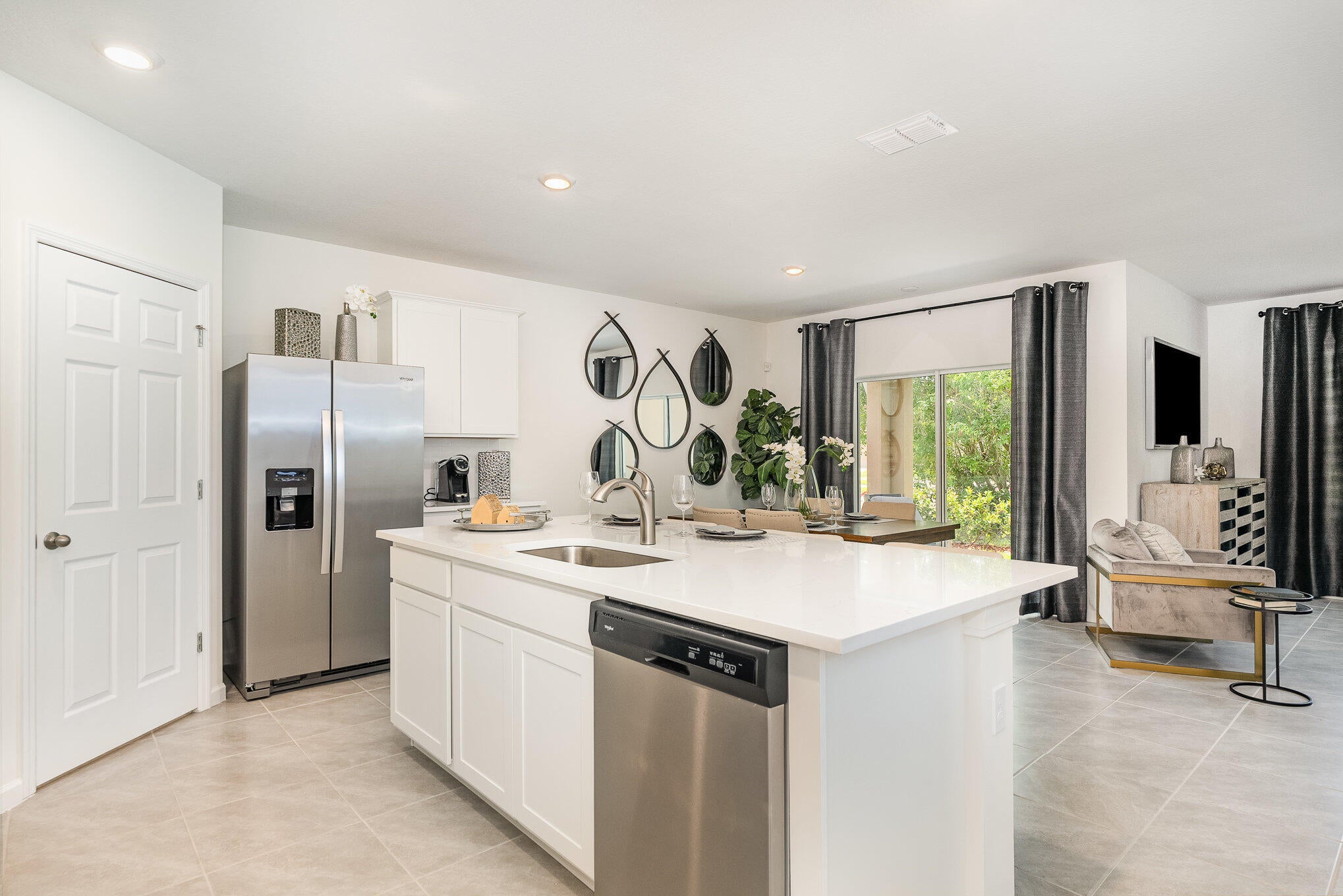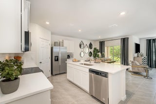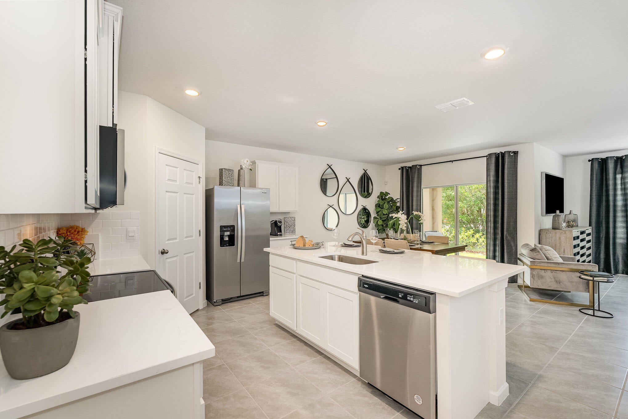 The Cali floorplan at Morningside in Fort Pierce offers 1,828 sq. ft. of elegant living space. This 4-bedroom, 2-bathroom home features gorgeous quartz countertops, oversized tile flooring, and sleek finishes. The open-concept design connects the living, dining, and kitchen areas, ideal for entertaining. The kitchen includes an oversized single-bowl undermount sink, stainless steel appliances, and a large island. The primary suite features an ensuite bath with dual sinks and a walk-in closet. Equipped with smart home technology for convenience.