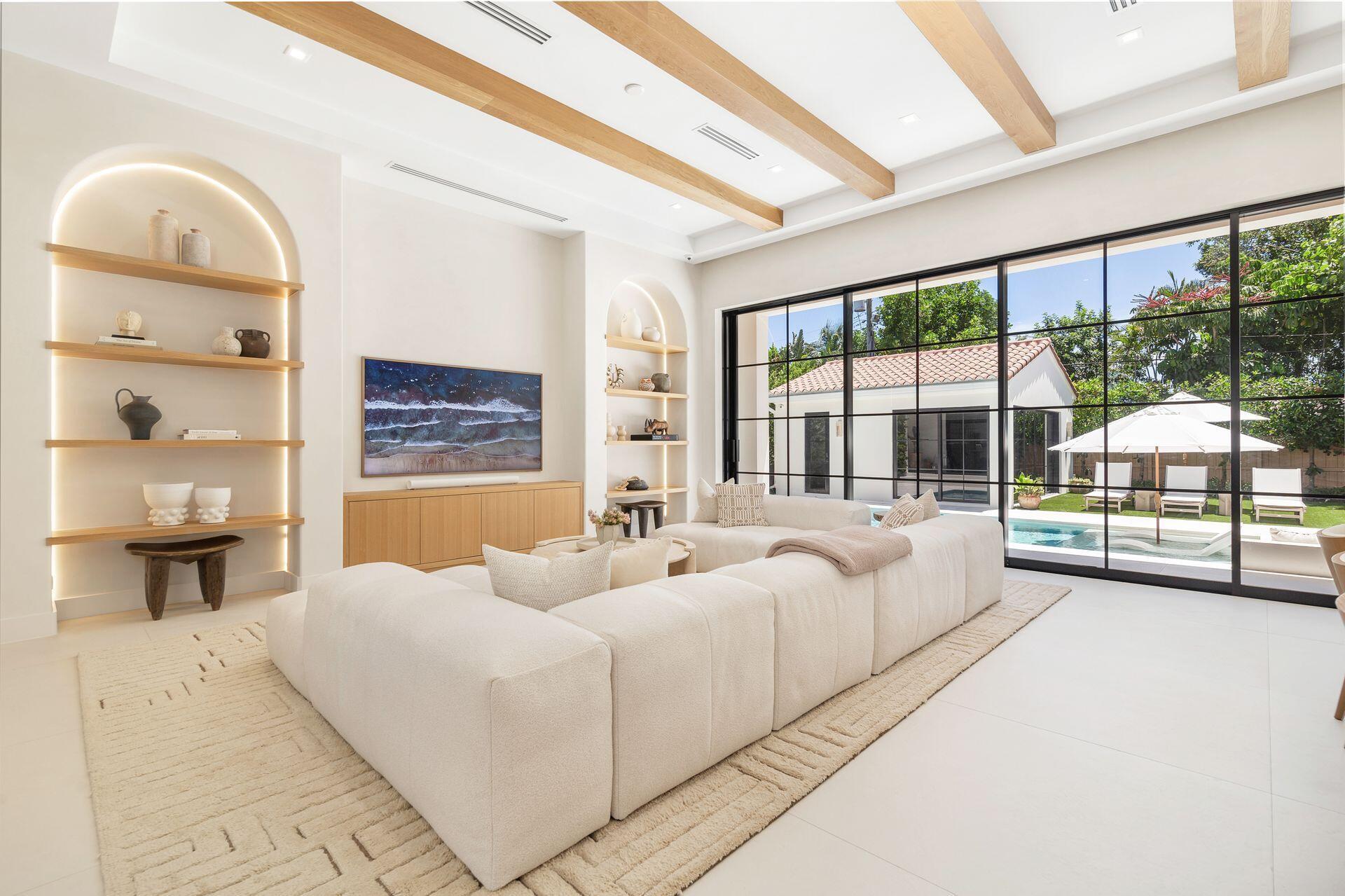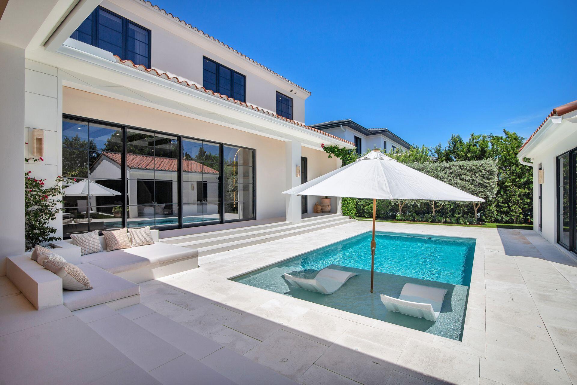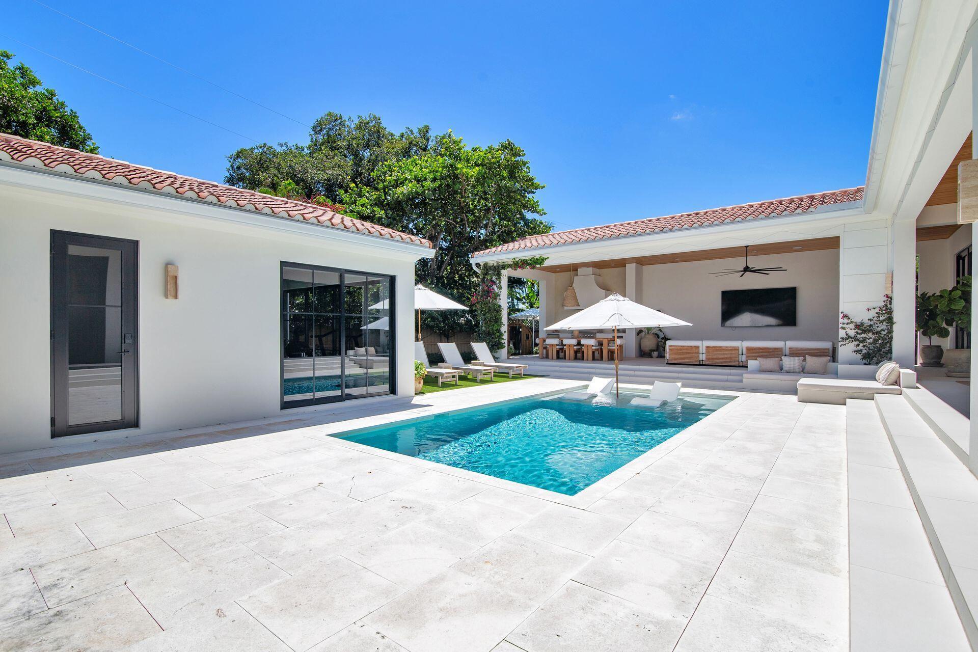 Uber-chic and effortlessly cool, this modern Mediterranean residence combines refined design with a warm, livable feel. Built in 2024 and offered fully furnished, the home features 4 bedrooms, 3 full baths, and 2 powder rooms--completely turnkey and ready to enjoy.With 12' ceilings on the main level and a dramatic wall of 10' sliding glass doors, the interiors are open, airy, and designed for both everyday living and entertaining. The view from the custom front door carries straight through to the south-facing pool, where a Badu swim jet, covered loggia, summer kitchen, and gym/guest cabana create a true private retreat.Every element of the chef's kitchen has been thoughtfully considered, from the travertine countertops and backsplash to the custom pulls - this kitchen is dreamy!Located near the Flagler Drive bike trail, Worth Avenue, fine dining, and much more.